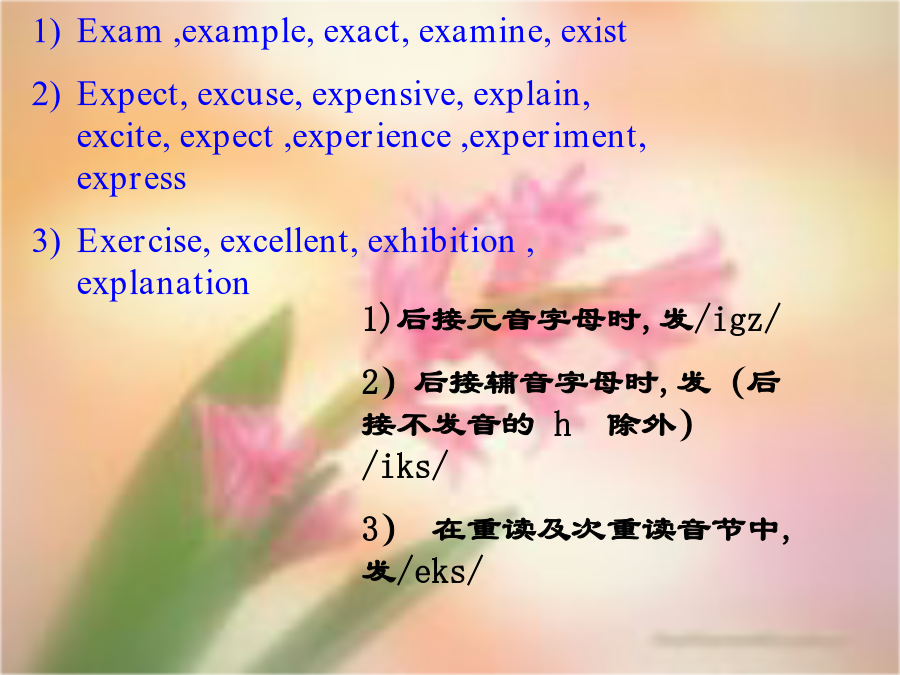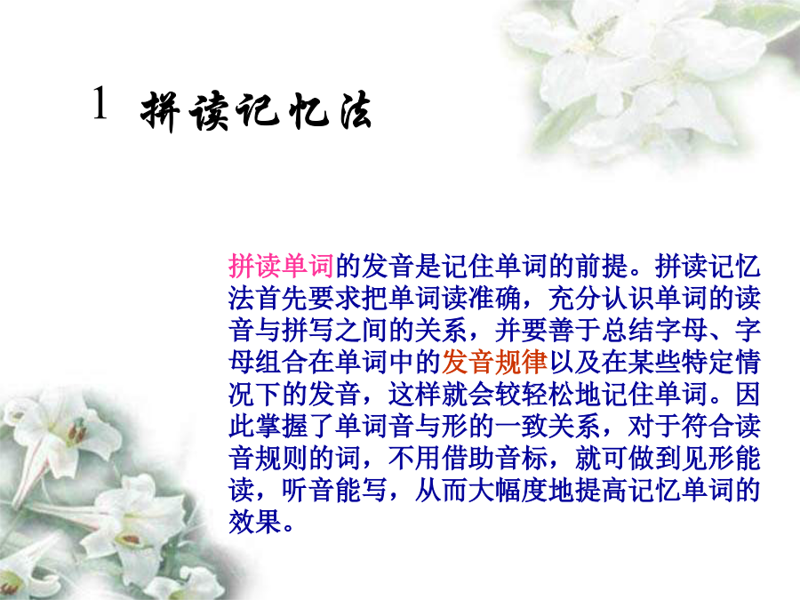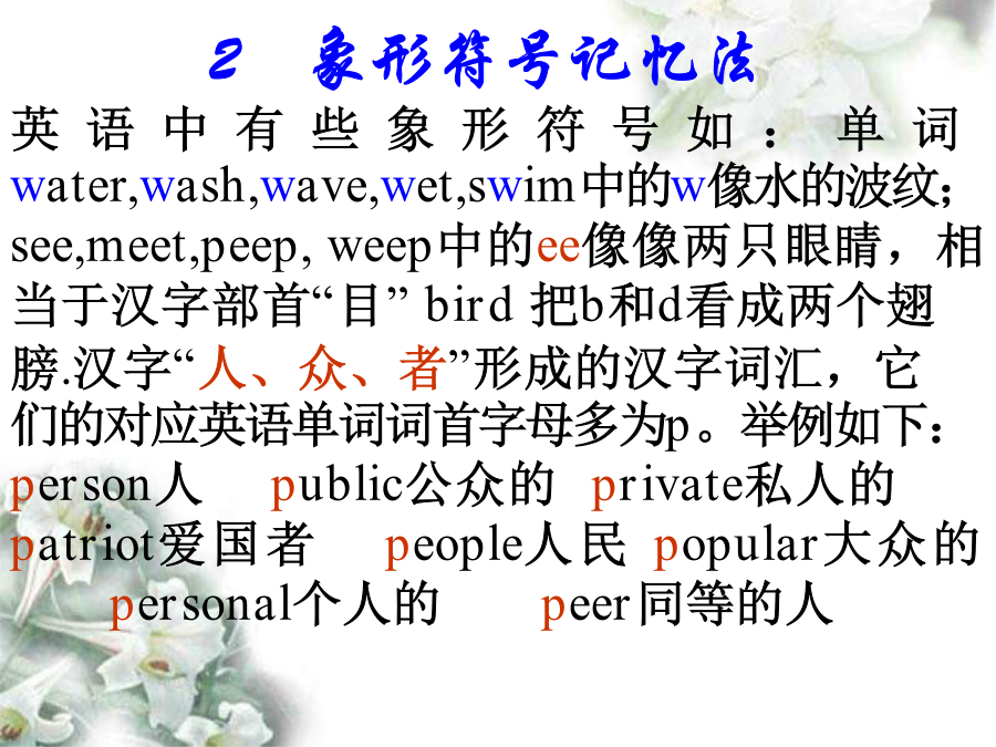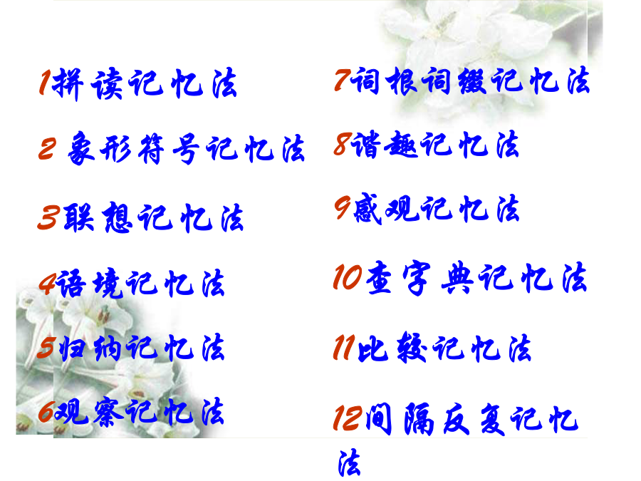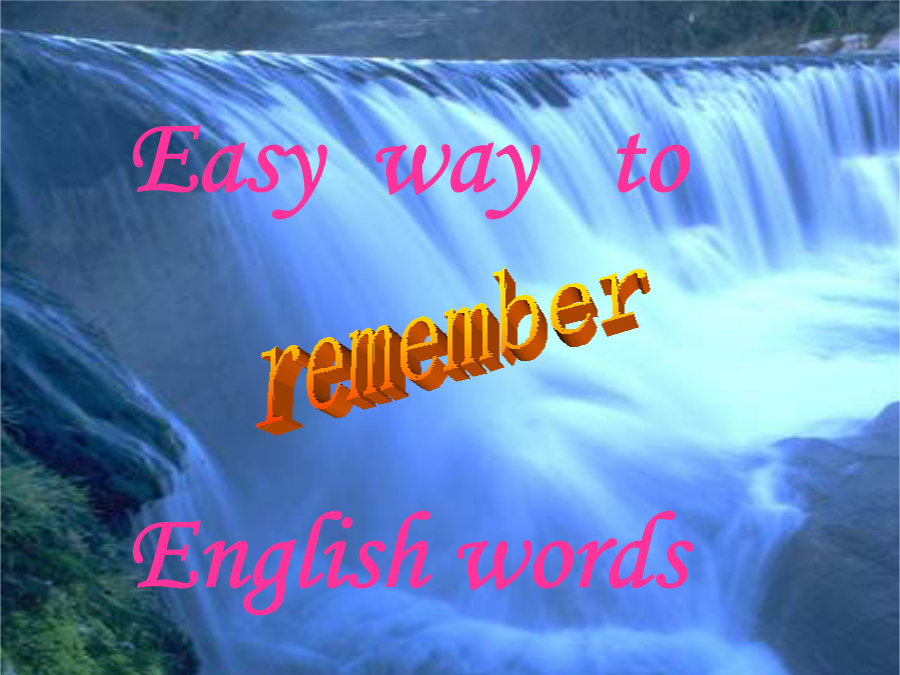 1拼读记忆法Exam,example,exact,examine,existExpect,excuse,expensive,explain,excite,expect,experience,experiment,expressExercise,excellent,exhibition,explanation联想意指我们在记忆英语单词时不要孤立的记忆,要发挥思维潜能,一并记忆与之相关的词汇,联想可以是由部分联想到整体,以及其它事物,也可以是由某一特征联想到一类事物,还可以是读音、词形、词义方面的扩充联想等等。该记忆法是根据记忆心理学相关知识并结合英语单词记忆自身特点而总结出来的。端详一下它的外貌。然后看看它的内涵和发音。最后就应该是联想,再联想.....联想它和其他背过的词有没有外表类似的?读音类似的?意思类似或相反的?如果有,就赶紧记在旁边,在另外那些词旁边也把这个词加上。这样,以后看见其他词,也会联想起这个词,等于又增加了一次见面机会如result,insult等,这样就会记忆一个单词的同时又复习了其它的单词,而且不致于混淆。再如,学习fetch的时候,就应该想到它和take,bring,carry等单词在用法上的区别。当然,很简单的单词(已经掌握的)就不必如此,因人而异。bye,buy,by;be,bee;cent,sent;tail,tale;steal,steel…近音:bed,bad;good,god…一个单词脱离了实际使用的语境,想记牢会用是难以做到的。将词汇置身于语境之中,通过反复阅读,提高认知能力,最后可以达到记忆的目的。语境记忆是国内外语言教学专家和心理学家较为推崇的词汇记忆策略。“每天都有做题目,一天做一篇阅读理解,还有30个单项选择,这样做下来,我把不会的单词用一张纸记下来,一天大概可以记一张纸的单词,在纸上写上日期,贴在墙上,有时间就背!一天也能完成30几个的单词记忆.然后一天一天的记新单词,再复习以前记过的,当然不是记下所有的而是记出现频率比较高的单词词.三个月的积累,我记了不少的单词,阅读记忆法也就是把词汇的记忆融入阅读之中,在看一篇文章的时候,遇到不认识的单词先做记号,并猜测它们的含义,等到把全文看完后再从字典上把它们的意思找出来。就自我感觉来说,这种方法不枯燥,记得比较牢.“5分类记忆法Love爱⑵有时在连接处词尾字母略有变化,例如:many+fold=manifold多样的pedal+cab=pedicab人力三轮车holy+day=holiday假日■另一种意义的观察是多注意与英语相关的事物,如:商品外包装上的英语,广告牌上的英语,衣物、饰品上的英语等,勤于积累、回顾,自然可以轻松记忆。观察原则是化繁为简,创新记忆的法宝。PrefixesCo—withtogether:coexist,cooperationEx—former:ex-wife,ex-presidentMini—small:miniskirt,minibusUn–—notopposite:uncertain,unsure,undressUni—one:uniformSuffixes-age-----tomakenouns:shortage,storage-al------tomakeadjectives:experimental,accidental,environmental-ation-----tomakenouns,apersonwhodoessth.:rider,painterbakerbuilderteacher-ify-----tomakeverbs:beautifysimplify-less----tomakeadjectivesnothavesth:hopeless,friendless-ness---tomakenounsastateorqualitysadnesshappinessweakness-ment-ship-or-ful根义记忆法。词根有两种,一种是可以引申出许多同根词的词根,同时它也是一个独立的单词,例如ease作为独立单词,它又是easy,easily,easiness的词根。利用根义代替记忆多义,可以解决“没有生词”却老读不懂的问题。比如要问immediate(ly)a)Thewomanimmediatelybehindthecar.b)Sheismyimmediateneighbour.c)theimmediatecause若没有读懂,那么就请看immediaie(ly)根义中间没有间隔(地)1)(时间)立刻;2)(空间)紧挨,通接,紧跟,3)(关系)直接8谐趣记忆法谐趣记忆法是根据读音、词形、词义的关系,利用诙谐、荒诞的曲解来记忆词汇。如:morose(忧伤的,郁闷的)=mo(方言,没有)