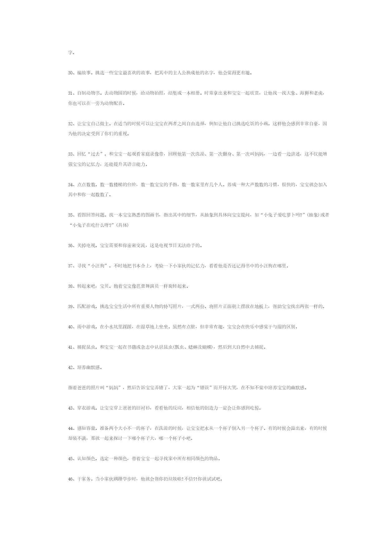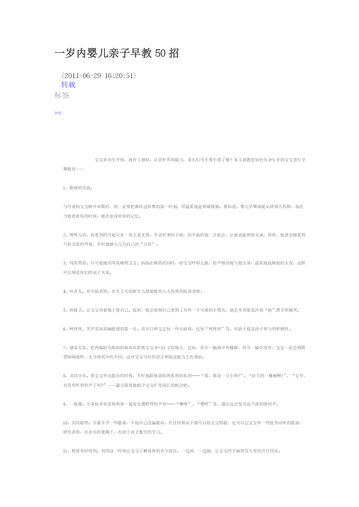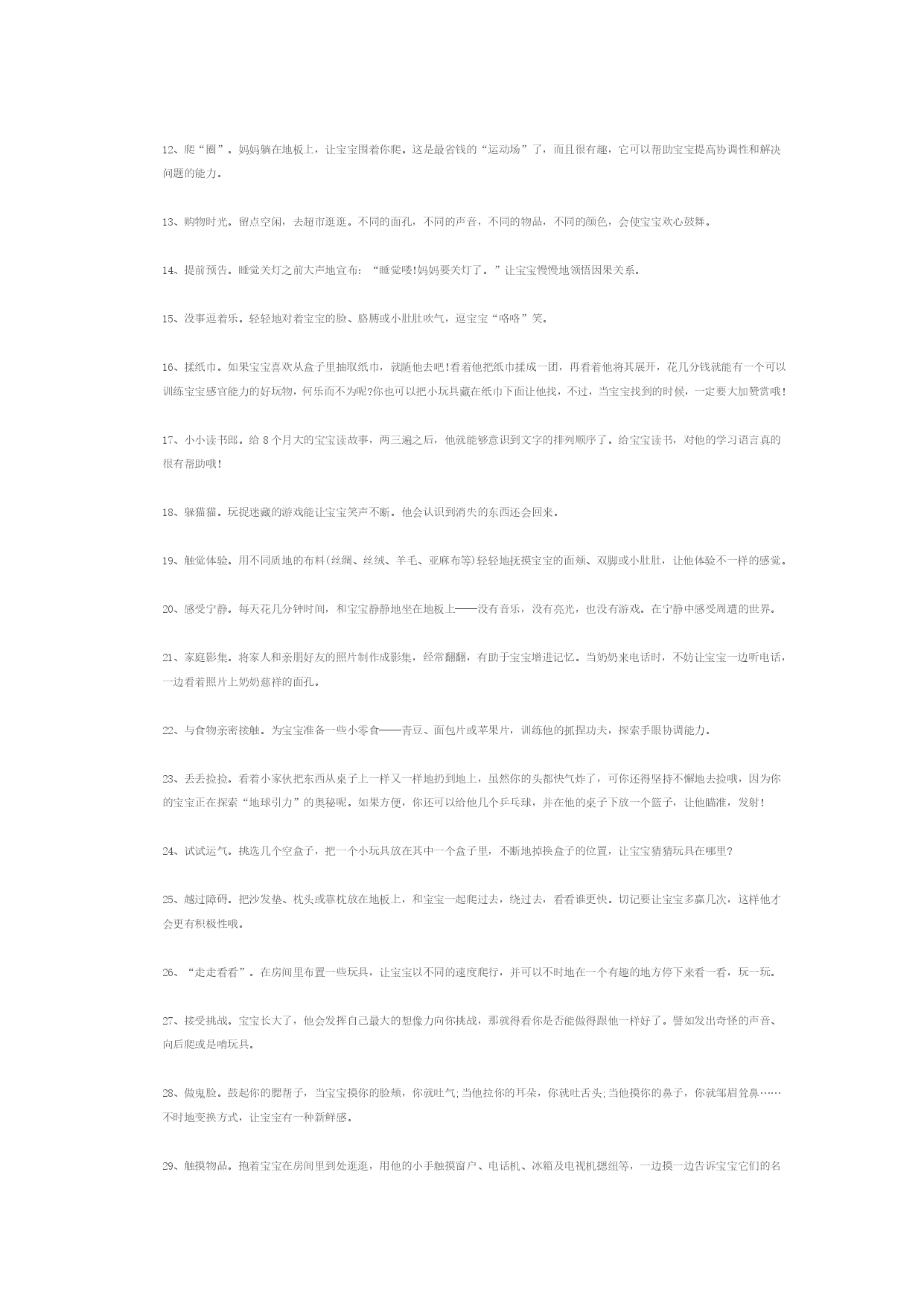 一岁内婴儿亲子早教50招(2011-06-2916:20:51)HYPERLINK"javascript:;"转载标签:HYPERLINK"http://uni.sina.com.cn/c.php?t=blog&k=%D4%D3%CC%B8&ts=bpost&stype=tag"\t"_blank"杂谈宝宝从出生开始,就有了感知、认识世界的能力,家长们可不要小看了哦!本文就教您如何为0-1岁的宝宝进行早期教育……1、眼神的交流。当可爱的宝宝睁开双眼时,你一定要把握住这短暂的第一时刻,用温柔地延伸凝视她。要知道,婴儿早期就能认清别人的脸,每次当他看着你的时候,都在加深对你的记忆。2、呀呀儿语。你看到的可能只是一张天真无邪,不谙世事的小脸,但不妨给他一点机会,让他也能和你交谈。很快,他就会捕捉到与你交流的节奏,不时地插入几句自己的“言语”。3、母乳喂养。尽可能地用母乳哺喂宝宝。妈妈在哺乳的同时,给宝宝哼唱儿歌,轻声细语地与他交谈,温柔地抚摸他的头发,这样可以增进你们的亲子关系。4、吐舌头。有实验表明,出生2天的新生儿就能模仿大人简单的面部表情。5、照镜子。让宝宝对着镜子看自己。起初,他会觉得自己看到了另外一个可爱的小朋友,他会非常愿意冲着“他”摆手和微笑。6、呵痒痒。笑声是培养幽默感的第一步。你可以和宝宝玩一些小游戏,比如“呵痒痒”等,有助于提高孩子参与的积极性。7、感觉差异。把两幅较为相似的画放在距离宝宝8—12寸的地方,比如,其中一幅画中有棵树,而另一幅中没有,宝宝一定会两眼骨碌碌地转,去寻找其中的不同。这对宝宝今后的识字和阅读能力大有帮助。8、共同分享。带宝宝外出散步的时候,不时地跟他说你所看到的东西——“看,那是一只小狗!”、“好大的一棵树啊!”、“宝贝,有没有听到铃声了吗?”……最大限度地赋予宝宝扩充词汇的机会吧。9、一起傻。小家伙非常喜欢和你一起发出傻呼呼的声音——“噢咯”、“嗯哼”等,偶尔还会发出高八度的怪叫声。10、共同歌唱。尽量多学一些歌曲,不妨自己改编歌词,在任何情况下都可以给宝宝唱歌,还可以让宝宝听一些优美动听的歌曲,研究表明,在音乐的熏陶下,有助于孩子数学的学习。11、换尿布时间到。利用这一时间让宝宝了解身体的各个部位。一边说,一边做,让宝宝的小脑袋瓜与你的言行同步。12、爬“圈”。妈妈躺在地板上,让宝宝围着你爬。这是最省钱的“运动场”了,而且很有趣,它可以帮助宝宝提高协调性和解决问题的能力。13、购物时光。留点空闲,去超市逛逛。不同的面孔,不同的声音,不同的物品,不同的颜色,会使宝宝欢心鼓舞。14、提前预告。睡觉关灯之前大声地宣布:“睡觉喽!妈妈要关灯了。”让宝宝慢慢地领悟因果关系。15、没事逗着乐。轻轻地对着宝宝的脸、胳膊或小肚肚吹气,逗宝宝“咯咯”笑。16、揉纸巾。如果宝宝喜欢从盒子里抽取纸巾,就随他去吧!看着他把纸巾揉成一团,再看着他将其展开,花几分钱就能有一个可以训练宝宝感官能力的好玩物,何乐而不为呢?你也可以把小玩具藏在纸巾下面让他找,不过,当宝宝找到的时候,一定要大加赞赏哦!17、小小读书郎。给8个月大的宝宝读故事,两三遍之后,他就能够意识到文字的排列顺序了。给宝宝读书,对他的学习语言真的很有帮助哦!18、躲猫猫。玩捉迷藏的游戏能让宝宝笑声不断。他会认识到消失的东西还会回来。19、触觉体验。用不同质地的布料(丝绸、丝绒、羊毛、亚麻布等)轻轻地抚摸宝宝的面颊、双脚或小肚肚,让他体验不一样的感觉。20、感受宁静。每天花几分钟时间,和宝宝静静地坐在地板上——没有音乐,没有亮光,也没有游戏。在宁静中感受周遭的世界。21、家庭影集。将家人和亲朋好友的照片制作成影集,经常翻翻,有助于宝宝增进记忆。当奶奶来电话时,不妨让宝宝一边听电话,一边看着照片上奶奶慈祥的面孔。22、与食物亲密接触。为宝宝准备一些小零食——青豆、面包片或苹果片,训练他的抓捏功夫,探索手眼协调能力。23、丢丢捡捡。看着小家伙把东西从桌子上一样又一样地扔到地上,虽然你的头都快气炸了,可你还得坚持不懈地去捡哦,因为你的宝宝正在探索“地球引力”的奥秘呢。如果方便,你还可以给他几个乒乓球,并在他的桌子下放一个篮子,让他瞄准,发射!24、试试运气。挑选几个空盒子,把一个小玩具放在其中一个盒子里,不断地掉换盒子的位置,让宝宝猜猜玩具在哪里?25、越过障碍。把沙发垫、枕头或靠枕放在地板上,和宝宝一起爬过去,绕过去,看看谁更快。切记要让宝宝多赢几次,这样他才会更有积极性哦。26、“走走看看”。在房间里布置一些玩具,让宝宝以不同的速度爬行,并可以不时地在一个有趣的地方停下来看一看,玩一玩。27、接受挑战。宝宝长大了,他会发挥自己最大的想像力向你挑战,那就得看你是否能做得跟他一样好了。譬如发出奇怪的声音、向后爬或是啃玩具。28、做鬼脸。鼓起你的腮