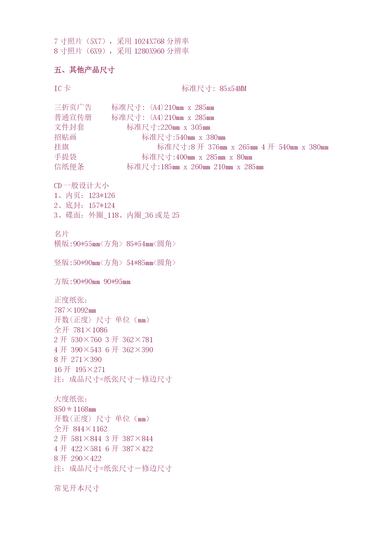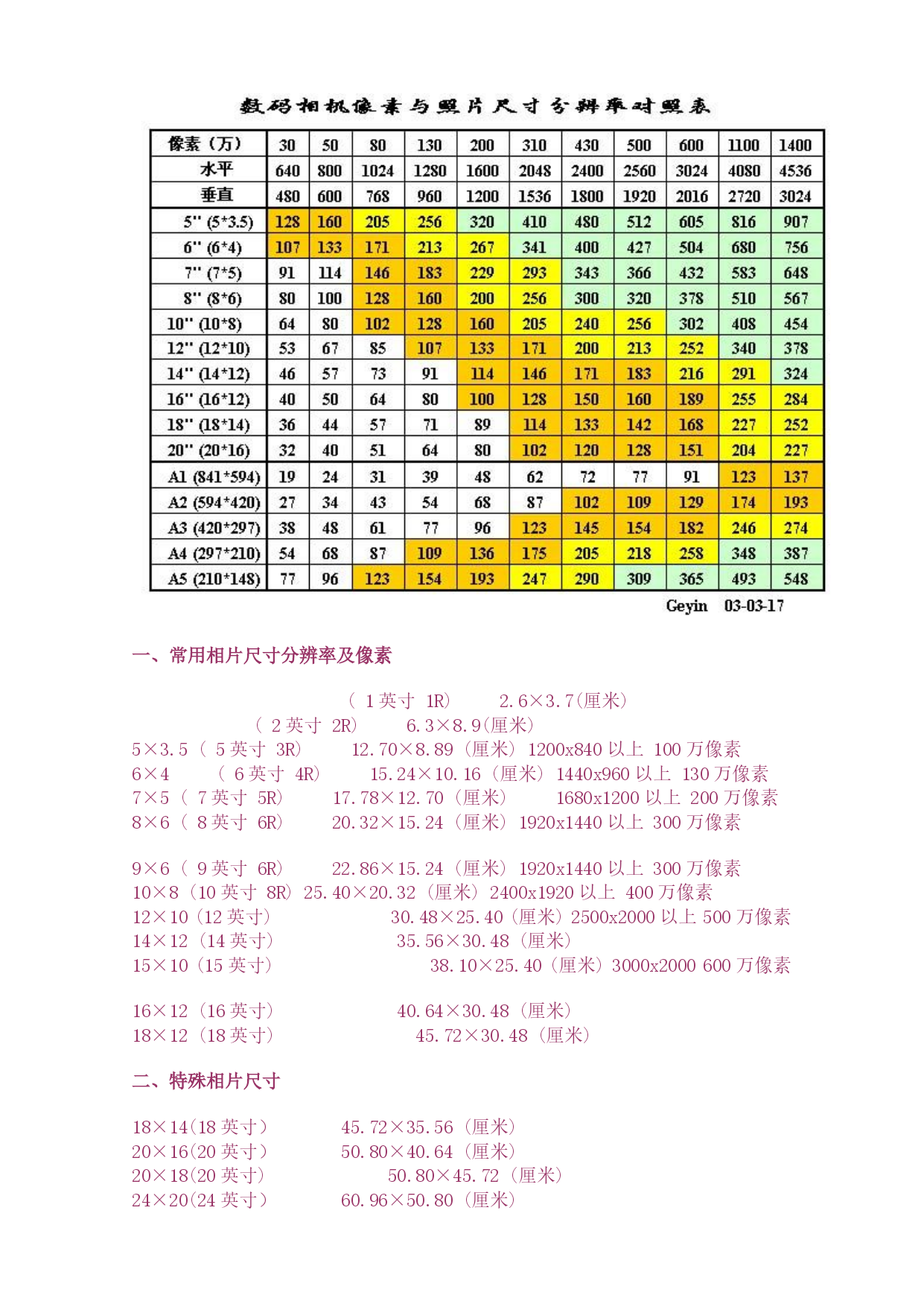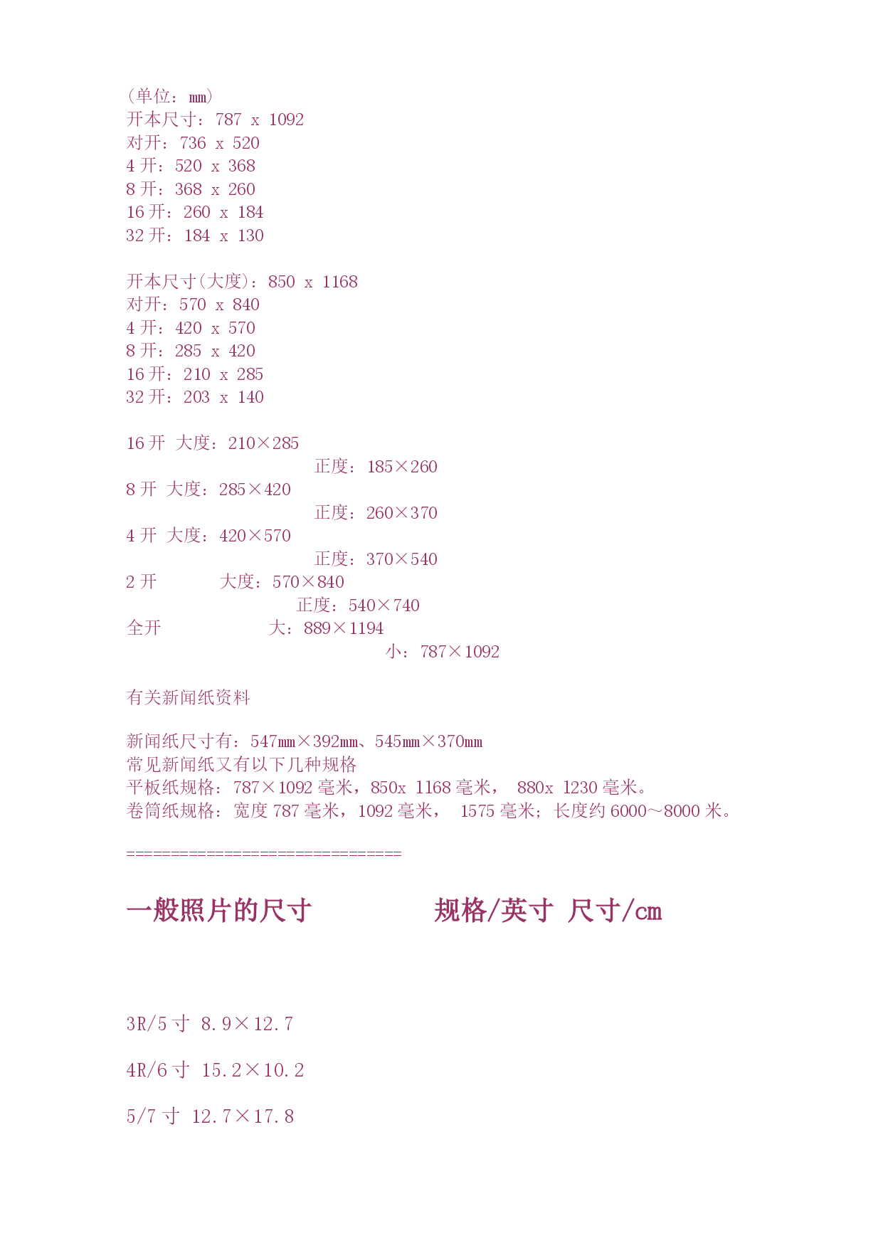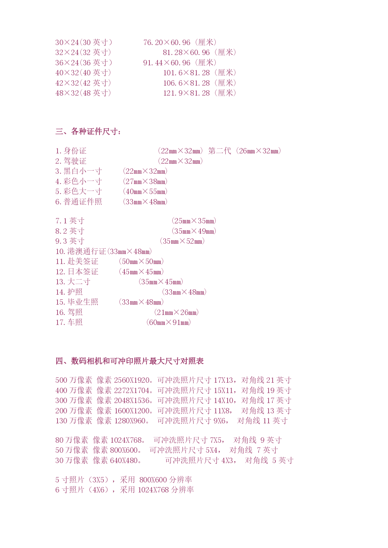 常用相片尺寸-英寸和厘米对照表首先向你说的是照片在不同的冲印店里略有差别!且有规定表中的尺寸,其它非标准尺寸,一般取最近的尺寸算是否留白边!当然现在的数码彩扩机几乎可以任意切割了!通常不同冲纸机所用的柯达皇家相纸和富士相纸的大小略有不同!但都用R来区分!R是整筒纸的已定宽度!相片是以R(宽度)不变来切割相应的长度的!1寸(是指英寸)=2.54cm我们说的x寸是指照片的长边,如5寸就是照片长2.54x5=12.7cm12寸就是2.54x12=30.5cm,8x12就是长边2.54x12=30.5cm,短边2.54x8=20.3cm3R指纸,3R为89MM,5R为127MM通常3R指3*5就是5寸5R指5*7就是7寸R的意思是长方型(英文是Rectangle),都以最短边来算.按照目前通行标准照片尺寸大小是有较严格规定的1英寸证明照的尺寸应为3.6厘米×2.7厘米;2英寸证明照的尺寸应是3.5厘米×5.3厘米;5英寸(最常见的照片大小)照片的尺寸应为12.7厘米×8.9厘米;6英寸(国际上比较通用的照片大小)照片的尺寸是15.2厘米×10.2厘米;7英寸(放大)照片的尺寸是17.8厘米×12.7厘米;12英寸照片的尺寸是30.5厘米×25.4厘米。正常的误差应该在1~2毫米左右,如果“差距”过大,那就说明洗印店有问题了。一、常用相片尺寸分辨率及像素(1英寸1R)2.6×3.7(厘米)(2英寸2R)6.3×8.9(厘米)5×3.5(5英寸3R)12.70×8.89(厘米)1200x840以上100万像素6×4(6英寸4R)15.24×10.16(厘米)1440x960以上130万像素7×5(7英寸5R)17.78×12.70(厘米)1680x1200以上200万像素8×6(8英寸6R)20.32×15.24(厘米)1920x1440以上300万像素9×6(9英寸6R)22.86×15.24(厘米)1920x1440以上300万像素10×8(10英寸8R)25.40×20.32(厘米)2400x1920以上400万像素12×10(12英寸)30.48×25.40(厘米)2500x2000以上500万像素14×12(14英寸)35.56×30.48(厘米)15×10(15英寸)38.10×25.40(厘米)3000x2000600万像素16×12(16英寸)40.64×30.48(厘米)18×12(18英寸)45.72×30.48(厘米)二、特殊相片尺寸18×14(18英寸)45.72×35.56(厘米)20×16(20英寸)50.80×40.64(厘米)20×18(20英寸)50.80×45.72(厘米)24×20(24英寸)60.96×50.80(厘米)30×24(30英寸)76.20×60.96(厘米)32×24(32英寸)81.28×60.96(厘米)36×24(36英寸)91.44×60.96(厘米)40×32(40英寸)101.6×81.28(厘米)42×32(42英寸)106.6×81.28(厘米)48×32(48英寸)121.9×81.28(厘米)三、各种证件尺寸:1.身份证(22mm×32mm)第二代(26mm×32mm)2.驾驶证(22mm×32mm)3.黑白小一寸(22mm×32mm)4.彩色小一寸(27mm×38mm)5.彩色大一寸(40mm×55mm)6.普通证件照(33mm×48mm)7.1英寸(25mm×35mm)8.2英寸(35mm×49mm)9.3英寸(35mm×52mm)10.港澳通行证(33mm×48mm)11.赴美签证(50mm×50mm)12.日本签证(45mm×45mm)13.大二寸(35mm×45mm)14.护照(33mm×48mm)15.毕业生照(33mm×48mm)16.驾照(21mm×26mm)17.车照(60mm×91mm)四、数码相机和可冲印照片最大尺寸对照表500万像素像素2560X1920。可冲洗照片尺寸17X13,对角线21英寸400万像素像素2272X1704。可冲洗照片尺寸15X11,对角线19英寸300万像素像素2048X1536。可冲洗照片尺寸14X10,对角线17英寸200万像素像素1600X1200。可冲洗照片尺寸11X8,对角线13英寸130万像素像素1280X960。可冲洗照片尺寸9X6,对角线11英寸80万像素像素1024X768。可冲洗照片尺寸7X5,对角线9英寸50万像素像素800X600。可冲洗照片尺寸5X4,对角线7英寸30万像素像素640X480。可冲洗照片尺寸4X3,对角线5英寸5寸照片(3X5),采用800X600分辨率6寸照片(4X6),采用1024X768分辨率7寸照片(5X7),采用1024X768分辨率8寸照片(6X9),采用1280X