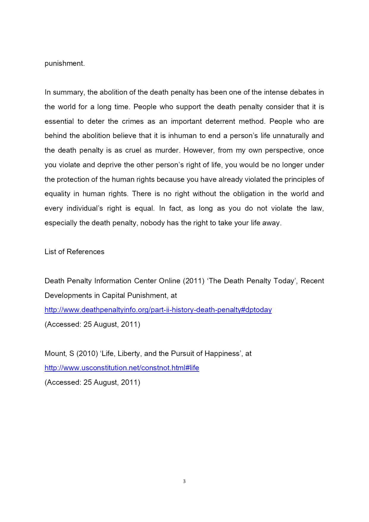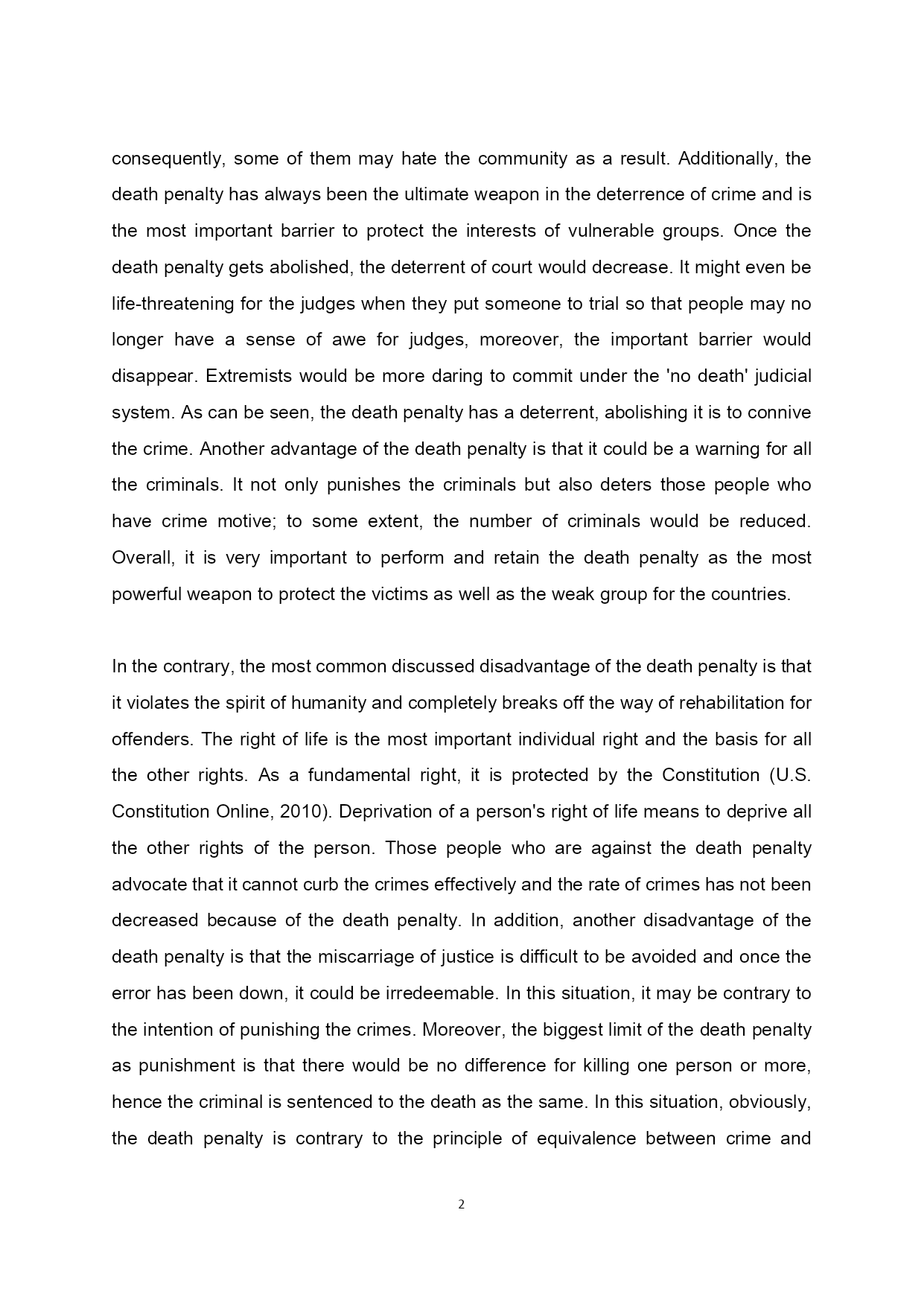 PAGE\*MERGEFORMAT3ConsidertheargumentsforandagainstthedeathpenaltyinamodernsocietyDeathpenaltyisalsoknownascapitalpunishmentandexecutions,whichisoneoftheworld'soldestpenalties.Aprisonerwhowasdeprivedoflifebythispenaltyusuallycommittedseriouscrimeinthelocalcountry.Althoughthedefinitionof‘seriouscrime’isoftendisputed,ingeneral,‘pre-meditatedmurder’mustbeoneoftheimportantreasonsfortheprisonerstobesentencedtodeathinthosecountrieswhichstillretainthedeathpenalty.Infact,70%ofcountriesintheworldhavealreadyabolisheditandtherearemorethan50countriesstillretainit.Currently,amongtheinfluentialcountriesintheworld,theUnitedStates,China,JapanandIndiastillretainedthedeathpenalty(DeathPenaltyInformationCenter,2011).Itplaysaspecialandimportantroleinpunishingthecriminalsanddeterringthosewhohavecriminalintent,aswellasprotectingtherightsandinterestsoflegalresidentsandkeepingthesocialstabilityandorder.Incontrast,thebiggestproblemcausedbythedeathpenaltyisthatitwouldbecompletelyunabletoremedythejudicialerrors.Furthermore,humanrightsactivistsagainstthedeathpenaltyandcallitas‘cruel,inhuman,anddegradingpunishment’.TherehasbeenatrendofabolishingthedeathpenaltysinceWorldWarII.Thisessayisgoingtodiscusstheadvantagesanddisadvantagesofthedeathpenaltyinthemodernsocietiesandshowmyownopinionofthedeathpenalty.Tobeginwith,themostsignificantadvantageofthedeathpenaltyisthatitplaysanimportantroleinourlivesandisaveryimportantmethodtokeepthesocialstabilityandorder.Acriminalhasnochanceofre-offendingafterbeingsentencedtodeath.Infact,ifthecriminaljustbesentintotheprisonaftercommittedaseriouscase,thefamiliesofvictimsmayfeelthatitisunfairandthiscouldhurttheiremotionsalot;consequently,someofthemmayhatethecommunityasaresult.Additionally,thedeathpenaltyhasalwaysbeentheultimateweaponinthedeterrenceofcrimeandisthemostimportantbarriertoprotecttheinterestsofvulnerablegroups.Oncethedeathpenaltygetsabolished,thedeterrentofcourtwoulddecrease.Itmightevenbelife-threateningforthejudgeswhentheyputsomeonetotrialsothatpeoplema