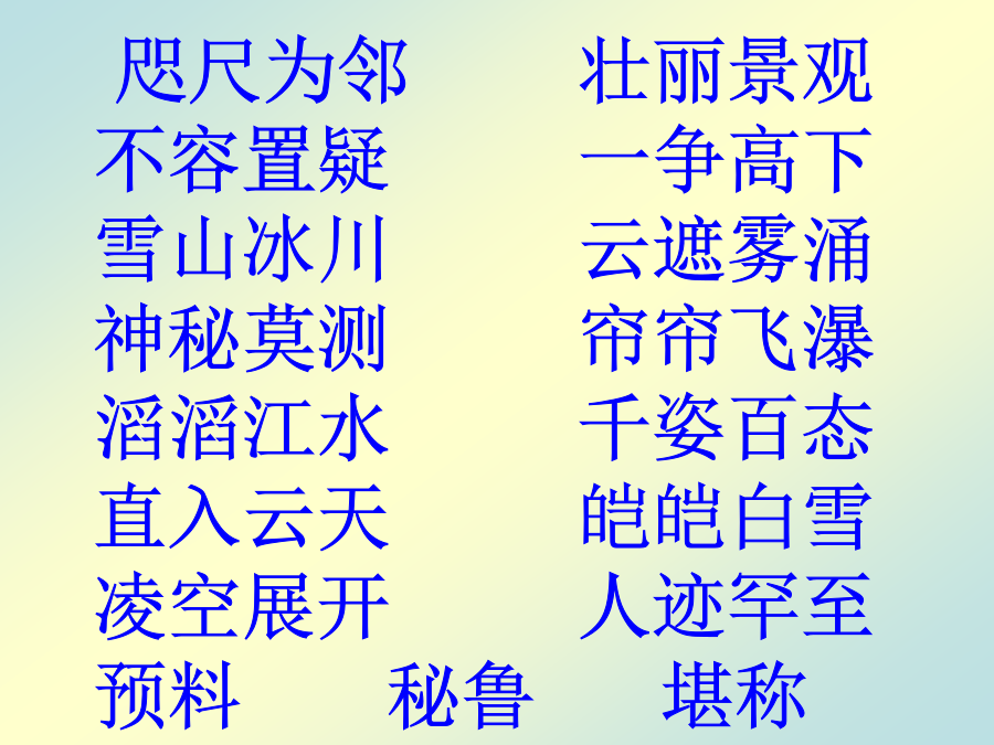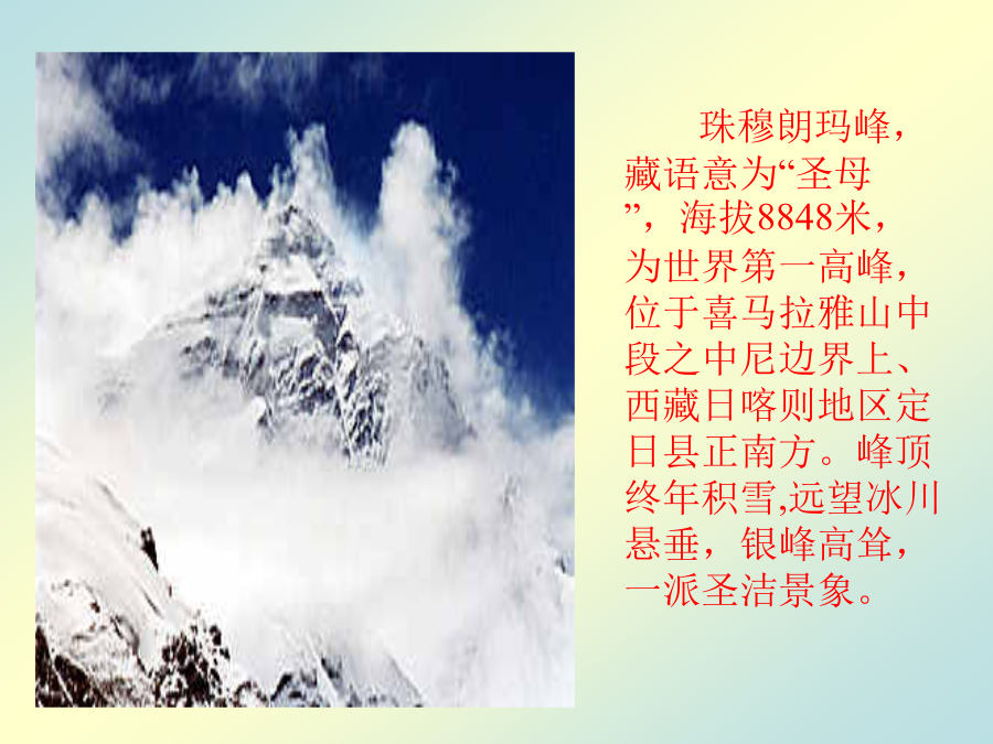 咫尺为邻壮丽景观不容置疑一争高下雪山冰川云遮雾涌神秘莫测帘帘飞瀑滔滔江水千姿百态直入云天皑皑白雪凌空展开人迹罕至预料秘鲁堪称珠穆朗玛峰,藏语意为“圣母”,海拔8848米,为世界第一高峰,位于喜马拉雅山中段之中尼边界上、西藏日喀则地区定日县正南方。峰顶终年积雪,远望冰川悬垂,银峰高耸,一派圣洁景象。