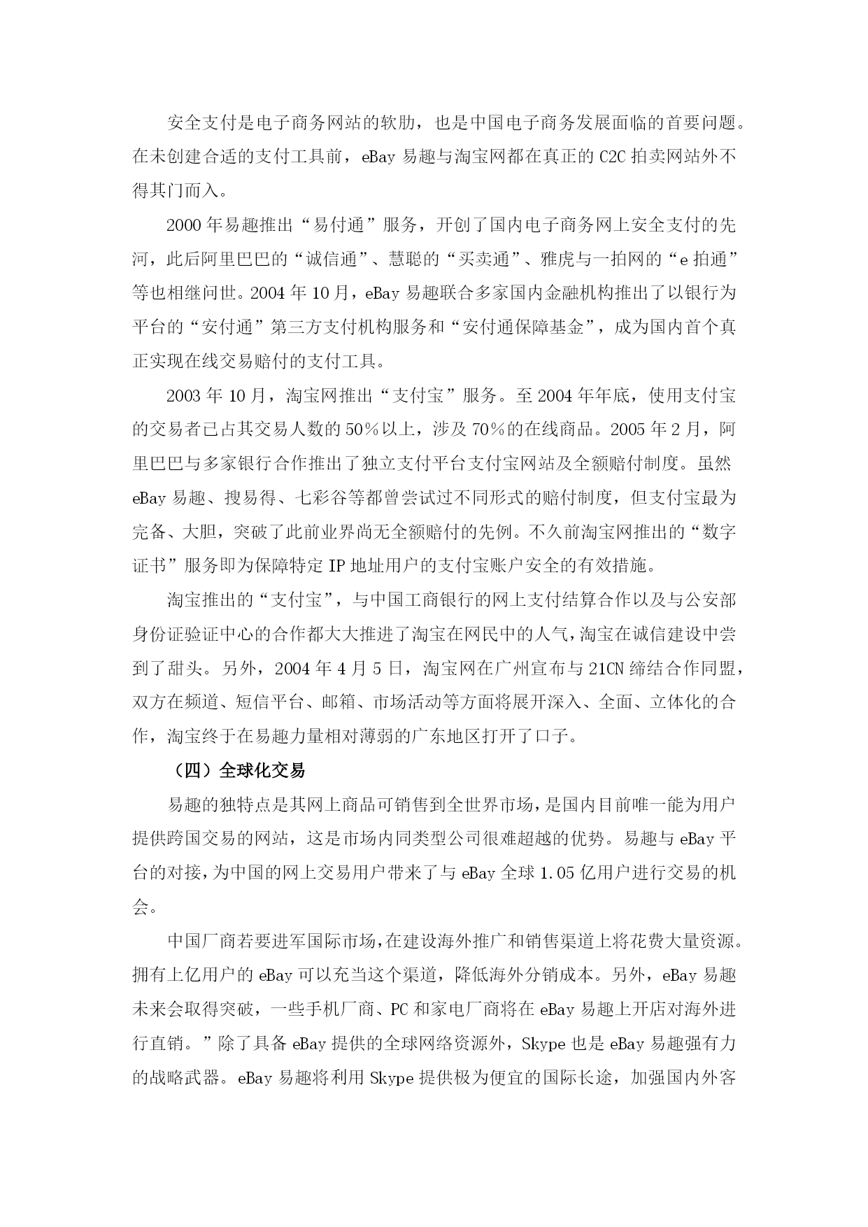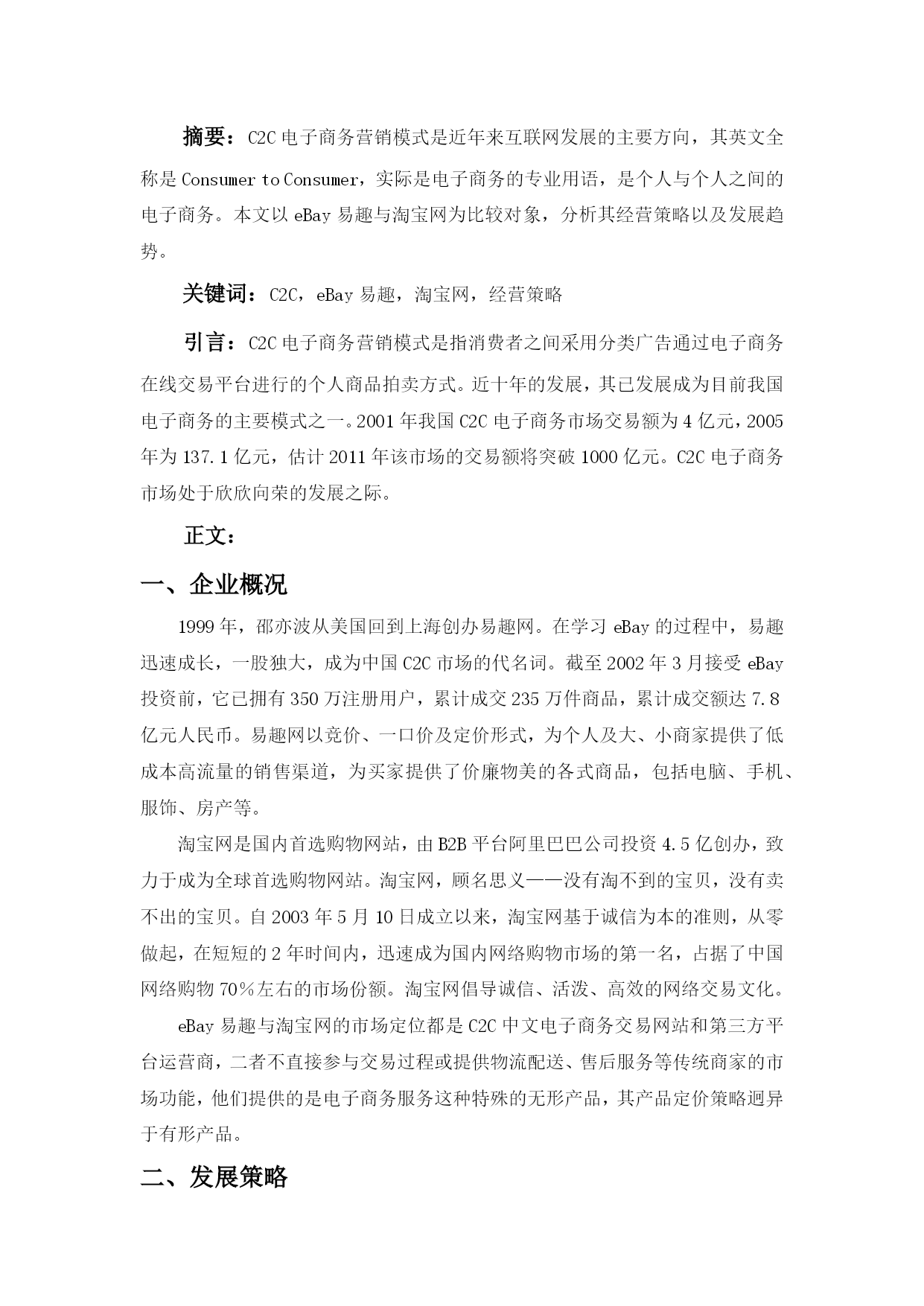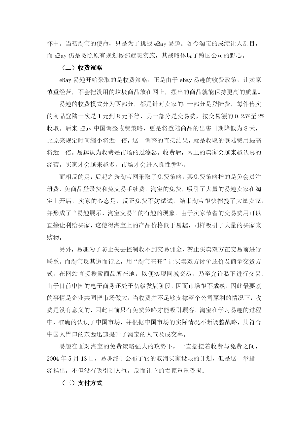 [键入公司名称]淘宝与易趣的比较研究分析[键入文档副标题]2011年6月6日摘要:C2C电子商务营销模式是近年来互联网发展的主要方向,其英文全称是ConsumertoConsumer,实际是电子商务的专业用语,是个人与个人之间的电子商务。本文以eBay易趣与淘宝网为比较对象,分析其经营策略以及发展趋势。关键词:C2C,eBay易趣,淘宝网,经营策略引言:C2C电子商务营销模式是指消费者之间采用分类广告通过电子商务在线交易平台进行的个人商品拍卖方式。近十年的发展,其已发展成为目前我国电子商务的主要模式之一。2001年我国C2C电子商务市场交易额为4亿元,2005年为137.1亿元,估计2011年该市场的交易额将突破1000亿元。C2C电子商务市场处于欣欣向荣的发展之际。正文:一、企业概况1999年,邵亦波从美国回到上海创办易趣网。在学习eBay的过程中,易趣迅速成长,一股独大,成为中国C2C市场的代名词。截至2002年3月接受eBay投资前,它已拥有350万注册用户,累计成交235万件商品,累计成交额达7.8亿元人民币。易趣网以竞价、一口价及定价形式,为个人及大、小商家提供了低成本高流量的销售渠道,为买家提供了价廉物美的各式商品,包括电脑、手机、服饰、房产等。淘宝网是国内首选购物网站,由B2B平台阿里巴巴公司投资4.5亿创办,致力于成为全球首选购物网站。淘宝网,顾名思义——没有淘不到的宝贝,没有卖不出的宝贝。自2003年5月10日成立以来,淘宝网基于诚信为本的准则,从零做起,在短短的2年时间内,迅速成为国内网络购物市场的第一名,占据了中国网络购物70%左右的市场份额。淘宝网倡导诚信、活泼、高效的网络交易文化。eBay易趣与淘宝网的市场定位都是C2C中文电子商务交易网站和第三方平台运营商,二者不直接参与交易过程或提供物流配送、售后服务等传统商家的市场功能,他们提供的是电子商务服务这种特殊的无形产品,其产品定价策略迥异于有形产品。二、发展策略2002年3月18日,易趣网络信息服务(上海)有限公司与美国eBay公司联合宣布,双方达成合作协议,eBay投资3000万美元现金,获得易趣33%的股份。至此,eBay通过美国易趣全资控股易趣。在国内市场上,后起之秀——淘宝网与eBay易趣之间展开了激烈的竞争。而eBay易趣与淘宝之间的战役,其实是背后eBay与阿里巴巴的战争。双方在发展过程中不断获得背后公司的资金支持,在强大靠山的倚靠下,二者的竞争更为激烈。易趣于1999年8月创立时的注册资金为2900万美元,之后获得eBay历次注资:2002年3月3000万美元,2003年6月1.5亿美元,2005年1亿美元。2006年12月,eBay与Tom在线达成组建合资公司的协议,并决定将eBay易趣的全部业务转入其2007年即将建立的在线交易平台达3000万美元,2003年6月共计1.5亿美元,2005年注资1亿美元。2005年一亿的注资数额接近阿里巴巴投入淘宝所有资金的两倍,可见eBay对易趣的大力支持。而淘宝网也在阿里巴巴的力挺下茁壮成长,成为eBay易趣的最大威胁。2004年7月19日,阿里巴巴宣布向旗下淘宝网追加3.5亿元投资,该投资将用于淘宝网进一步打造更为完善的安全体系、支付体系、服务体系以及技术平台,加大对市场推广力度。2004年7月7日,淘宝网借一周年庆典之际,即宣布自己成为国内C2C市场的领军企业,将之前坐了几年宝座的易趣拉到马下;另外宣布将免费继续进行下去,断了eBay中国坚持收费的后路。2004年9月,单个用户在淘宝的成交额约上易趣的3倍,可见双方的竞争越来越激烈。三、商业模式(一)战略定位eBay易趣的战略定位是提供一个既本土又全球,既地方又世界的网上交易平台,从这一点上说eBay易趣基本上是把在美国的成功模式复制了下来,eBay易趣的会员不仅可以把商品在国内销售,而且通过简单的处理就可以在eBay的国内网站销售。当淘宝破茧而出时最初面对的不是祝福,而是诅咒。当时C2C市场已是易趣一家独大,淘宝网更被预言会在18个月内夭折。但18个月内它已在中国C2C市场上杀出重围。2005年,淘宝更是将排名国内C2C市场第三位的一拍网拉入其怀中。当初淘宝的使命,只是为了挑战eBay易趣。如今淘宝的成绩让人刮目,而eBay仍是按照原有规划按部就班实施,其战略体现了跨国公司的野心。(二)收费策略eBay易趣开始采取的是收费策略,正是由于eBay易趣的收费政策,让卖家慎重经营,不会把没用的垃圾商品放在网上,摆出的商品就能保持更高的质量。易趣的收费模式分为两部分,都是针对卖家的:一部分是登陆费,每件售卖的商品登陆一次是1元到8元不等,另一部分是交易费,按交易额的0.25%至2%收取。后来eBay中国调整收费策略,更是将登陆商品的出售日期降低为8天