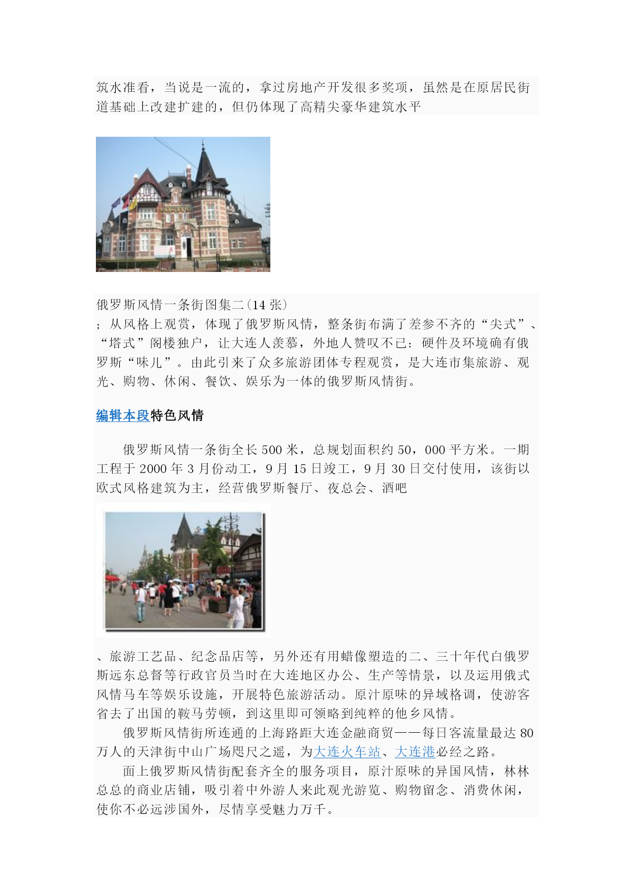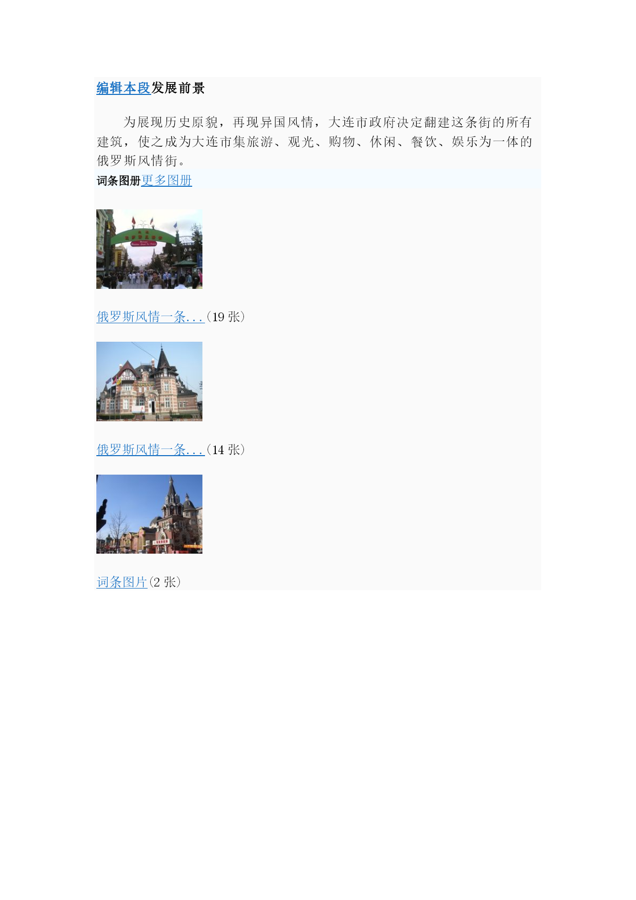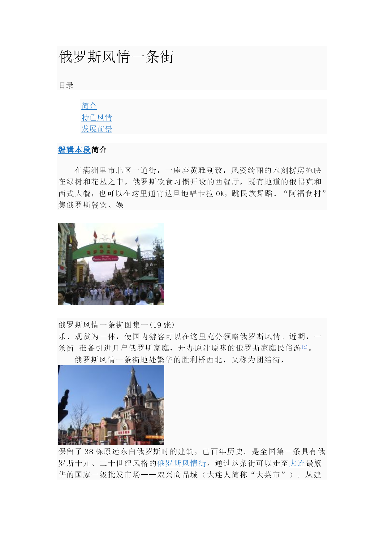 俄罗斯风情一条街目录HYPERLINK"http://baike.baidu.com/view/81173.htm"\l"1#1"简介HYPERLINK"http://baike.baidu.com/view/81173.htm"\l"2#2"特色风情HYPERLINK"http://baike.baidu.com/view/81173.htm"\l"3#3"发展前景HYPERLINK"http://baike.baidu.com/view/81173.htm"编辑本段简介在满洲里市北区一道街,一座座黄雅别致,风姿绮丽的木刻楞房掩映在绿树和花丛之中。俄罗斯饮食习惯开设的西餐厅,既有地道的俄得克和西式大餐,也可以在这里通宵达旦地唱卡拉OK,跳民族舞蹈。“阿福食村”集俄罗斯餐饮、娱俄罗斯风情一条街图集一(19张)乐、观赏为一体,使国内游客可以在这里充分领略俄罗斯风情。近期,一条街准备引进几户俄罗斯家庭,开办原汁原味的俄罗斯家庭民俗游[1]。俄罗斯风情一条街地处繁华的胜利桥西北,又称为团结街,HYPERLINK"http://baike.baidu.com/albums/888658/888658/0/0.html"\l"0$808a27db48ff9a52d0164e1c"\o"查看图片"\t"_blank"保留了38栋原远东白俄罗斯时的建筑,已百年历史。是全国第一条具有俄罗斯十九、二十世纪风格的HYPERLINK"http://baike.baidu.com/view/81173.htm"\t"_blank"俄罗斯风情街。通过这条街可以走至HYPERLINK"http://baike.baidu.com/view/4055.htm"\t"_blank"大连最繁华的国家一级批发市场——双兴商品城(大连人简称“大菜市”)。从建筑水准看,当说是一流的,拿过房地产开发很多奖项,虽然是在原居民街道基础上改建扩建的,但仍体现了高精尖豪华建筑水平俄罗斯风情一条街图集二(14张);从风格上观赏,体现了俄罗斯风情,整条街布满了差参不齐的“尖式”、“塔式”阁楼独户,让大连人羡慕,外地人赞叹不已:硬件及环境确有俄罗斯“味儿”。由此引来了众多旅游团体专程观赏,是大连市集旅游、观光、购物、休闲、餐饮、娱乐为一体的俄罗斯风情街。HYPERLINK"http://baike.baidu.com/view/81173.htm"编辑本段特色风情俄罗斯风情一条街全长500米,总规划面积约50,000平方米。一期工程于2000年3月份动工,9月15日竣工,9月30日交付使用,该街以欧式风格建筑为主,经营俄罗斯餐厅、夜总会、酒吧HYPERLINK"http://baike.baidu.com/albums/888658/888658/0/0.html"\l"0$dc15484e555c193db3de051e"\o"查看图片"\t"_blank"、旅游工艺品、纪念品店等,另外还有用蜡像塑造的二、三十年代白俄罗斯远东总督等行政官员当时在大连地区办公、生产等情景,以及运用俄式风情马车等娱乐设施,开展特色旅游活动。原汁原味的异域格调,使游客省去了出国的鞍马劳顿,到这里即可领略到纯粹的他乡风情。俄罗斯风情街所连通的上海路距大连金融商贸——每日客流量最达80万人的天津街中山广场咫尺之遥,为HYPERLINK"http://baike.baidu.com/view/430274.htm"\t"_blank"大连火车站、HYPERLINK"http://baike.baidu.com/view/136949.htm"\t"_blank"大连港必经之路。面上俄罗斯风情街配套齐全的服务项目,原汁原味的异国风情,林林总总的商业店铺,吸引着中外游人来此观光游览、购物留念、消费休闲,使你不必远涉国外,尽情享受魅力万千。HYPERLINK"http://baike.baidu.com/view/81173.htm"编辑本段发展前景为展现历史原貌,再现异国风情,大连市政府决定翻建这条街的所有建筑,使之成为大连市集旅游、观光、购物、休闲、餐饮、娱乐为一体的俄罗斯风情街。词条图册HYPERLINK"http://baike.baidu.com/albums/888658/888658/0/0.html"\t"_blank"更多图册HYPERLINK"javascript:void(0);"HYPERLINK"http://baike.baidu.com/albums/888658/888658/1/30906.html"\l"30906$"\o"俄罗斯风情一条街图集一"\t"_blank"俄罗斯风情一条...(