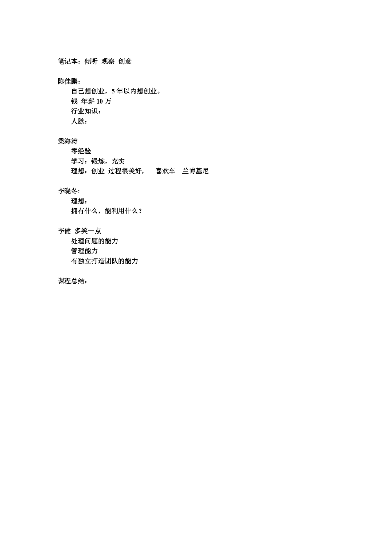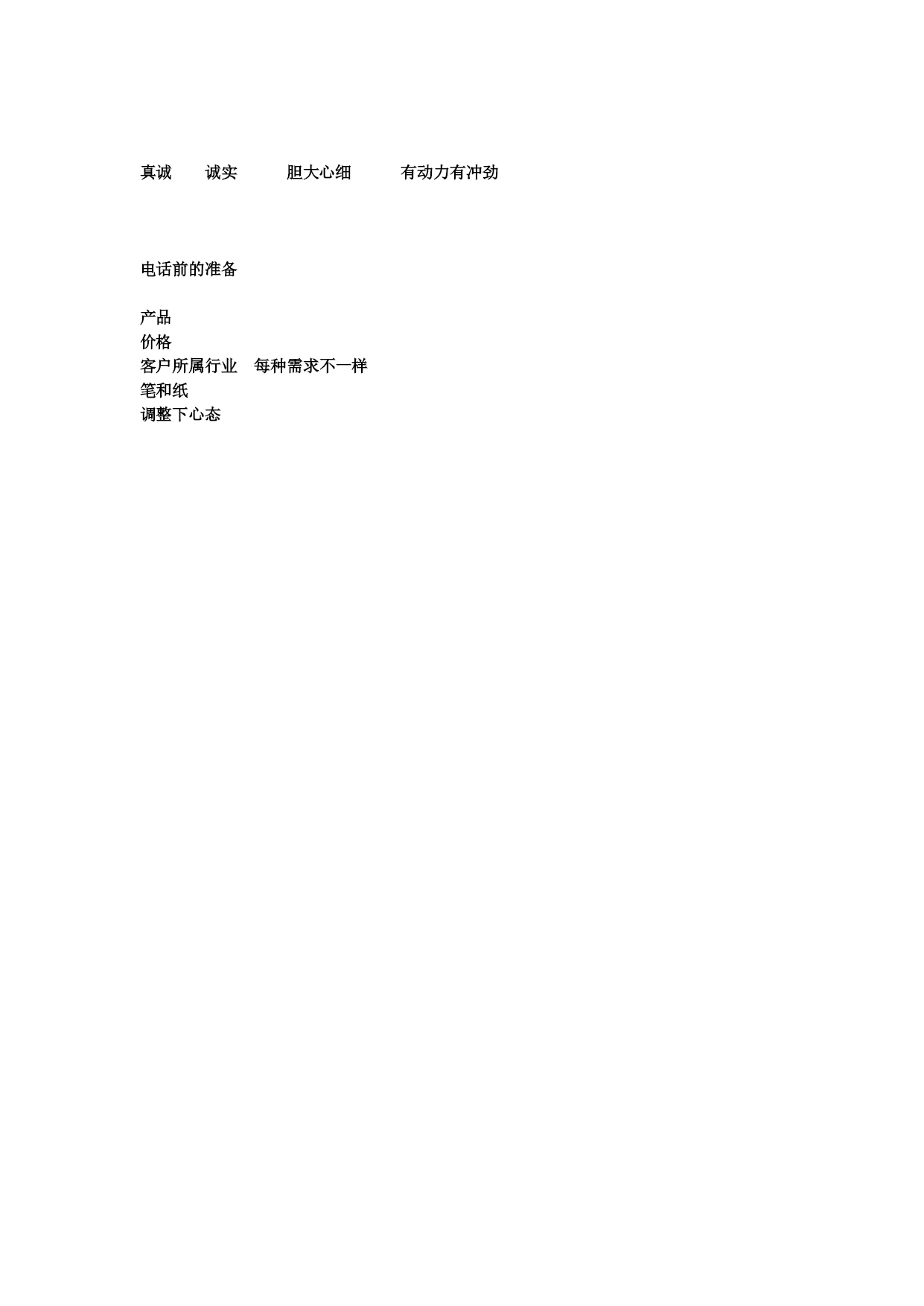 统一思想心态理论陈安之的培训成功学,知识加人脉的解释。推销法则决定人一生的21个信念信念与人生的关系陈安之的培训如何学习理论与实践销售技巧业绩的突破在精英,稳定发展在中流。如何做?123321试用期通过较短的试用期设置,来激发每个人转正的热情。已安排相应的文件。通过对过程的严格考核,来养成销售人员的工作习惯。对过程的严格考核,还需要对指标这块的加强。譬如有效电话。统计的力量要加强,对这块的奖励也可以适当加强。通过大量的竞争,来提高整个团队的工作氛围。对第一个通过转正的成员来进行奖励。按实际回款金额。个人pk赛团队pk赛羽毛球赛乒乓球赛通过鼓励大家大量预约客户,来提高成交量。将预约客户纳入过程考核指标。对于每个成交客户,要求销售撰写案例文案,并进行案例分析和汇总。评选出最精彩案例。锻炼大家的文案写作能力。加强期强化销售人员对如何成功道路的认识。明确每个人努力的方向。分阶段成功,如何将现在做好。成功=每天目标100%的完成。决定人一生的21个新年陈安之的超级成功学安排大家去看看楼盘,明确自己的奋斗目标。对销售恐惧心理的进一步排除。尚致胜的《致胜行销学》练习明确加强期的目标从业绩目标到过程目标做更进一步和更深一步的细化管理。学习pdca学习5w2h加强团队建设,进一步加强团队的概念,加强团队间的竞争,提高团队归属感。团队游戏知人善用,对部分表现良好的销售可以给予做师傅的培训。老师带徒弟的培训内容和标准老师带徒弟的奖励老师带徒弟的竞争。在陌拜方面加强培训,对可能遇到的困难和问题做专项训练,找到工作中的乐趣。产品卖点分析(行业分析,客户行业分析)的功夫在于水磨。一点一点的去做。笔记本:倾听观察创意陈佳鹏:自己想创业,5年以内想创业。钱年薪10万行业知识:人脉:梁海涛零经验学习:锻炼,充实理想:创业过程很美好,喜欢车兰博基尼李晓冬:理想:拥有什么,能利用什么?李健多笑一点处理问题的能力管理能力有独立打造团队的能力课程总结:真诚诚实胆大心细有动力有冲劲电话前的准备产品价格客户所属行业每种需求不一样笔和纸调整下心态