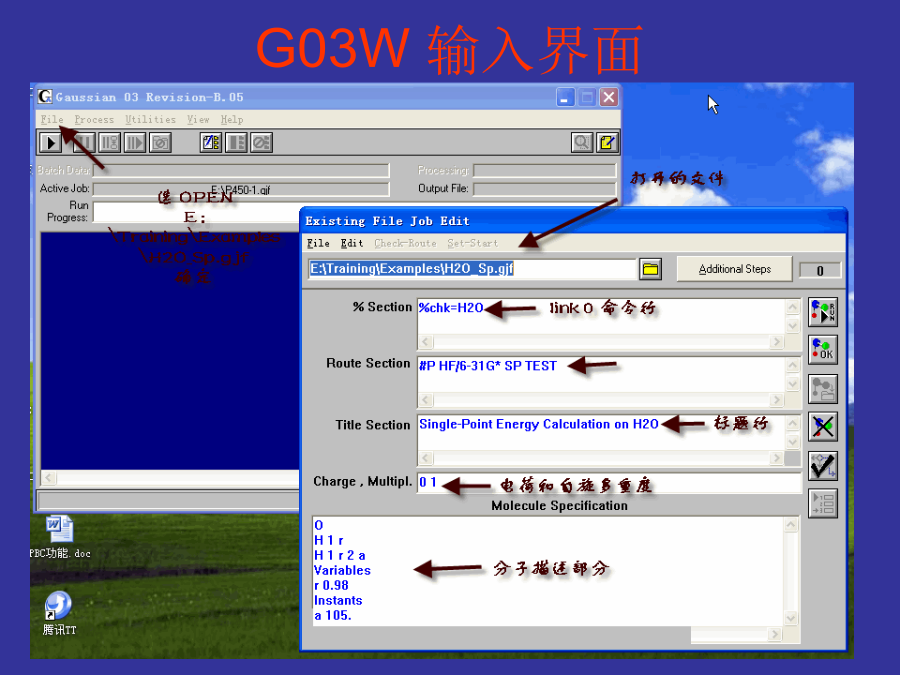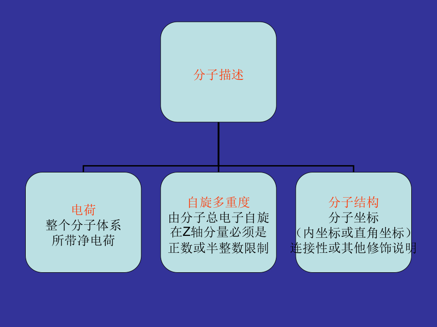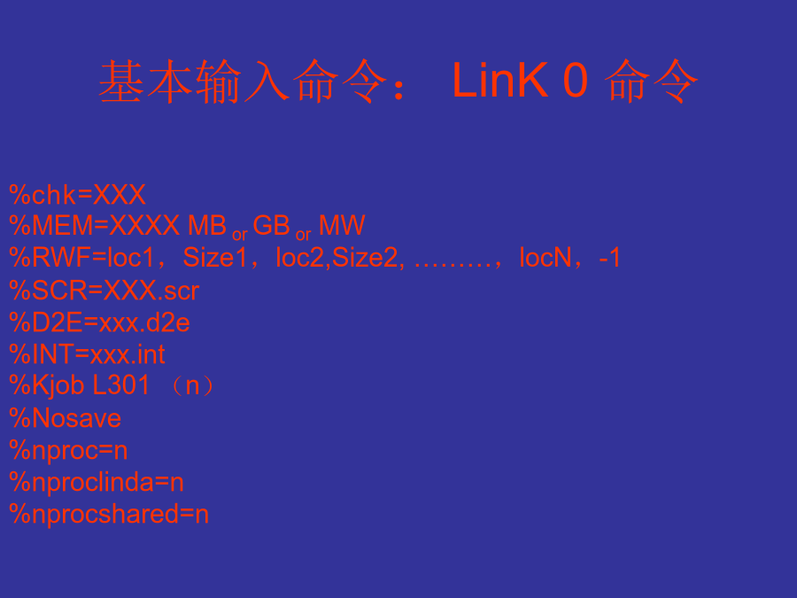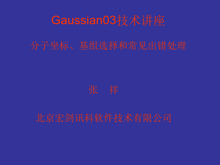 Gaussian03技术讲座分子坐标、基组选择和常见出错处理G03W输入界面基本输入命令:LinK0命令如何确定分子的自旋多重度1个和2个单电子时自旋多重度的确定几个自旋多重度判断的例子基本输入命令:Job_CommandLine输入分子结构坐标的来源手写内坐标的建立二面角的判断例2:NH3(考虑对称性C3v)例3:CH4分子的两种写法(Td对称性)例4:CO2的内坐标混合坐标写法从:优化的1,3-丁二烯标准方向坐标开始优化的1,3-丁二烯标准方向坐标:CenterAtomicAtomicCoordinates(Angstroms)NumberNumberTypeXYZ---------------------------------------------------------------------160-0.3258690.6517360.0000002600.325869-0.6517360.0000003600.3258691.8231530.000000460-0.325869-1.8231530.000000510-1.4165150.6452440.0000006101.416515-0.6452440.0000007101.4128521.8700220.000000810-1.412852-1.8700220.000000910-0.2022942.7718720.00000010100.202294-2.7718720.000000得到的前8个原子的坐标:60-0.3258690.6517360.000000600.325869-0.6517360.000000600.3258691.8231530.00000060-0.325869-1.8231530.00000010-1.4165150.6452440.000000101.416515-0.6452440.000000101.4128521.8700220.00000010-1.412852-1.8700220.000000H3r7a1b添加的第9个原子(H)H4r18a12b1添加的第9个原子(H)r=1.09添加的变量初始数值a=120.b=180.0r1=1.09a1=120.b1=180.手写坐标注意事项用GaussView3.0建立分子结构Gaussian中的基组STO双zeta、三zeta和四zetaGTOGTO拟合STO3-21G为例Gaussian03内含的劈裂基组极化函数“p”轨道加入“d”成分“s”轨道加入“p”成分常用的极化函数举例弥散函数弥散函数的表示赝势基组ECPGaussian03内含的ECP基组基组的输入自定义基组的输入19.4800000-0.470282000E-012.389000000.6248841000.7795000000.472254200P11.000.740000000E-011.00000000P11.000.220000000E-011.00000000D41.0037.08000000.329000000E-0110.10000000.1787418003.220000000.4487657000.9628000000.587636100D11.000.2262000001.00000000****FE0FE-ECP210dpotential31392.61497870-10.00000000271.17569790-63.26675180217.73202810-10.96133380s-dpotential50126.057189503.000000001138.1264251018.17291370254.20988580339.1231164029.28379660317.1068012028.62890820-207.34216490p-dpotential5083.175949005.000000001106.055993805.95359300242.82849370294.2665527028.77018050154.4244635028.03978180-95.31642490ECP基组输入注意事项基组选择中的一些问题初学Gaussian03常见出错分析初学Gaussian03常见出错分析运行出错3.无法写大的Scratch文件RWFa.劈裂RWF文件%rwf=loc1,size1,loc2,size2,……..,locN,-1b.改变计算方法MP2=Direct可以少占硬盘空间c.限制最大硬盘maxdisk=NGB4.FOPT出错原因是变量数与分子自由度数不相等。可用POPT或直接用OPT5.优化过渡态只能做一个STEP原因是负本征数目不对添加iop(1/11)=16.组态