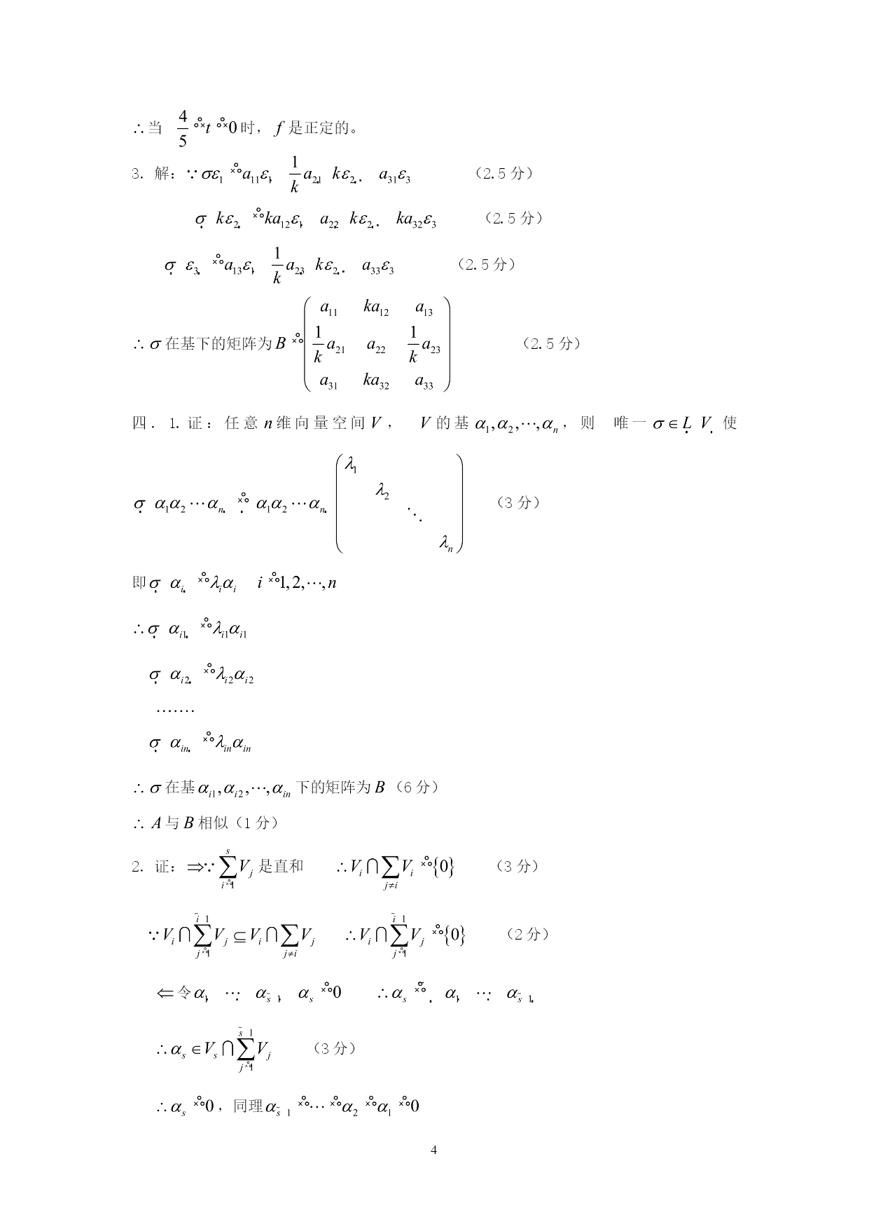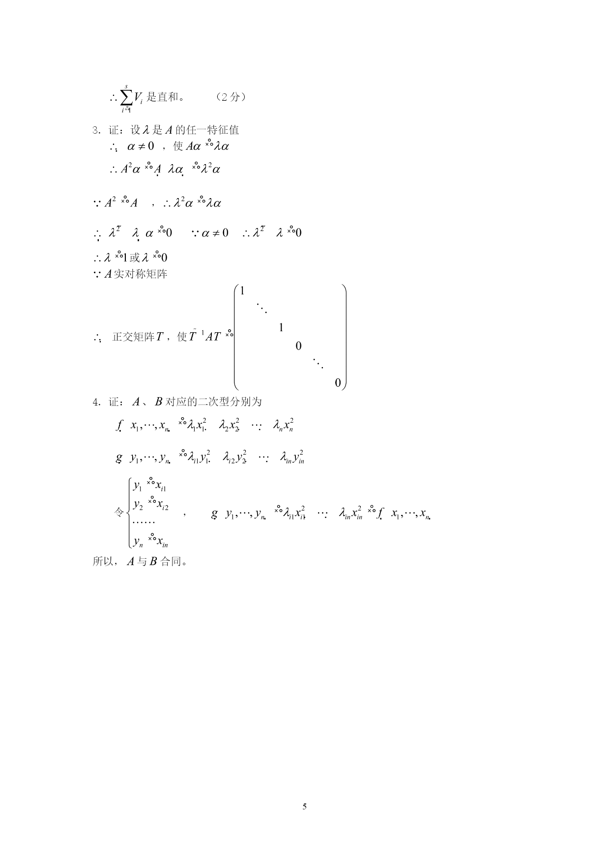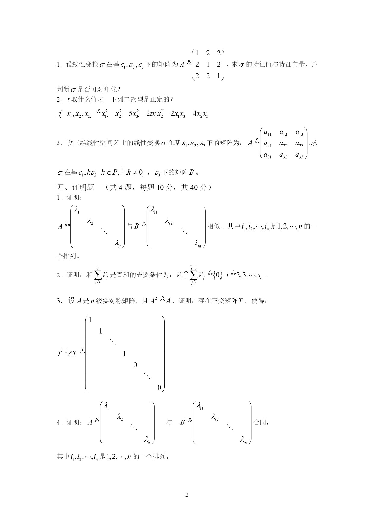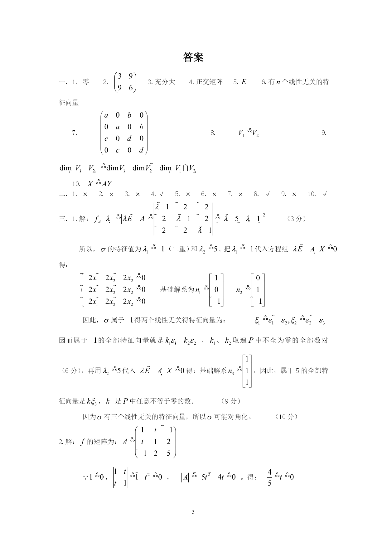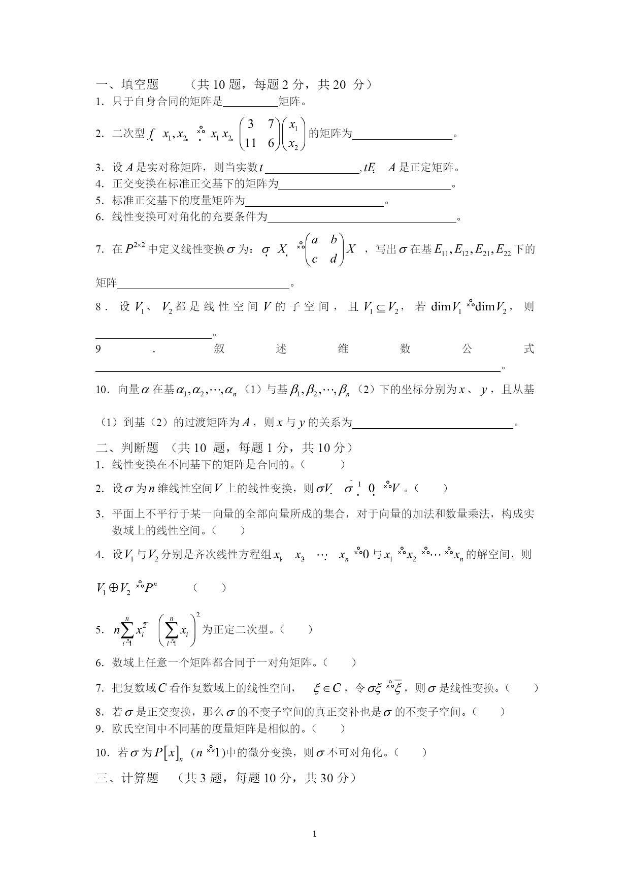 一、填空题(共10题,每题2分,共20分)1.只于自身合同的矩阵是矩阵。2.二次型的矩阵为__________________。3.设是实对称矩阵,则当实数_________________,是正定矩阵。4.正交变换在标准正交基下的矩阵为_______________________________。5.标准正交基下的度量矩阵为_________________________。6.线性变换可对角化的充要条件为__________________________________。7.在中定义线性变换为:,写出在基下的矩阵_______________________________。8.设、都是线性空间的子空间,且,若,则_____________________。9.叙述维数公式_________________________________________________________________________。10.向量在基(1)与基(2)下的坐标分别为、,且从基(1)到基(2)的过渡矩阵为,则与的关系为_____________________________。二、判断题(共10题,每题1分,共10分)1.线性变换在不同基下的矩阵是合同的。()2.设为维线性空间上的线性变换,则。()3.平面上不平行于某一向量的全部向量所成的集合,对于向量的加法和数量乘法,构成实数域上的线性空间。()4.设与分别是齐次线性方程组与的解空间,则()5.为正定二次型。()6.数域上任意一个矩阵都合同于一对角矩阵。()7.把复数域看作复数域上的线性空间,,令,则是线性变换。()8.若是正交变换,那么的不变子空间的真正交补也是的不变子空间。()9.欧氏空间中不同基的度量矩阵是相似的。()10.若为()中的微分变换,则不可对角化。()三、计算题(共3题,每题10分,共30分)1.设线性变换在基下的矩阵为,求的特征值与特征向量,并判断是否可对角化?2.取什么值时,下列二次型是正定的?3.设三维线性空间上的线性变换在基下的矩阵为:,求在基,下的矩阵。四、证明题(共4题,每题10分,共40分)1.证明:与相似,其中是的一个排列。2.证明:和是直和的充要条件为:。3.设是级实对称矩阵,且,证明:存在正交矩阵,使得:4.证明:与合同,其中是的一个排列。答案一.1.零2.3.充分大4.正交矩阵5.6.有个线性无关的特征向量7.8.9.10.二.1.2.3.4.√5.6.7.8.√9.10.√三.1.解:(3分)所以,的特征值为(二重)和。把代入方程组得:基础解系为因此,属于得两个线性无关得特征向量为:因而属于的全部特征向量就是,、取遍中不全为零的全部数对(6分),再用代入得:基础解系,因此,属于5的全部特征向量是,是中任意不等于零的数。(9分)因为有三个线性无关的特征向量,所以可能对角化。(10分)2.解:的矩阵为:,,。得:当时,是正定的。3.解:(2.5分)(2.5分)(2.5分)在基下的矩阵为(2.5分)四.1.证:任意维向量空间,的基,则唯一使(3分)即在基下的矩阵为(6分)与相似(1分)2.证:是直和(3分)(2分)令(3分),同理是直和。(2分)3.证:设是的任一特征值,使,或实对称矩阵正交矩阵,使4.证:、对应的二次型分别为令,所以,与合同。