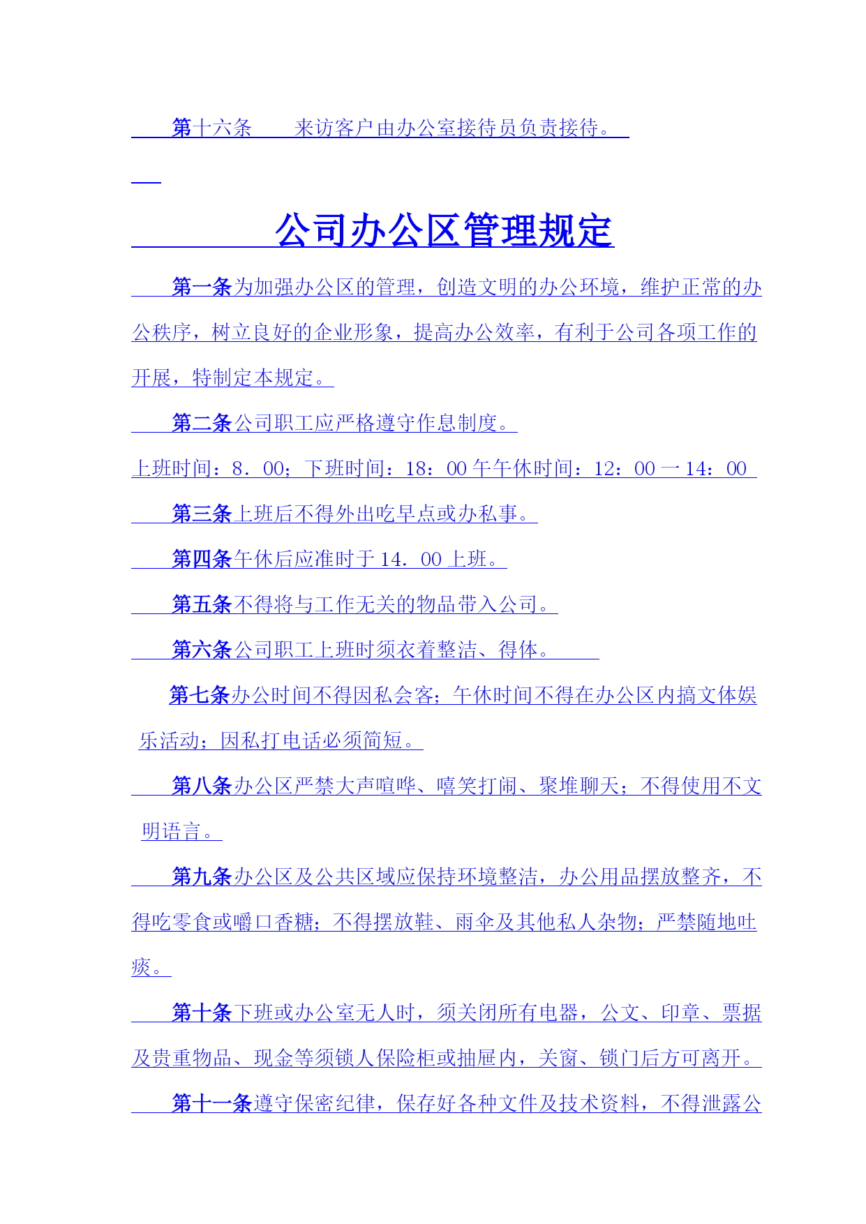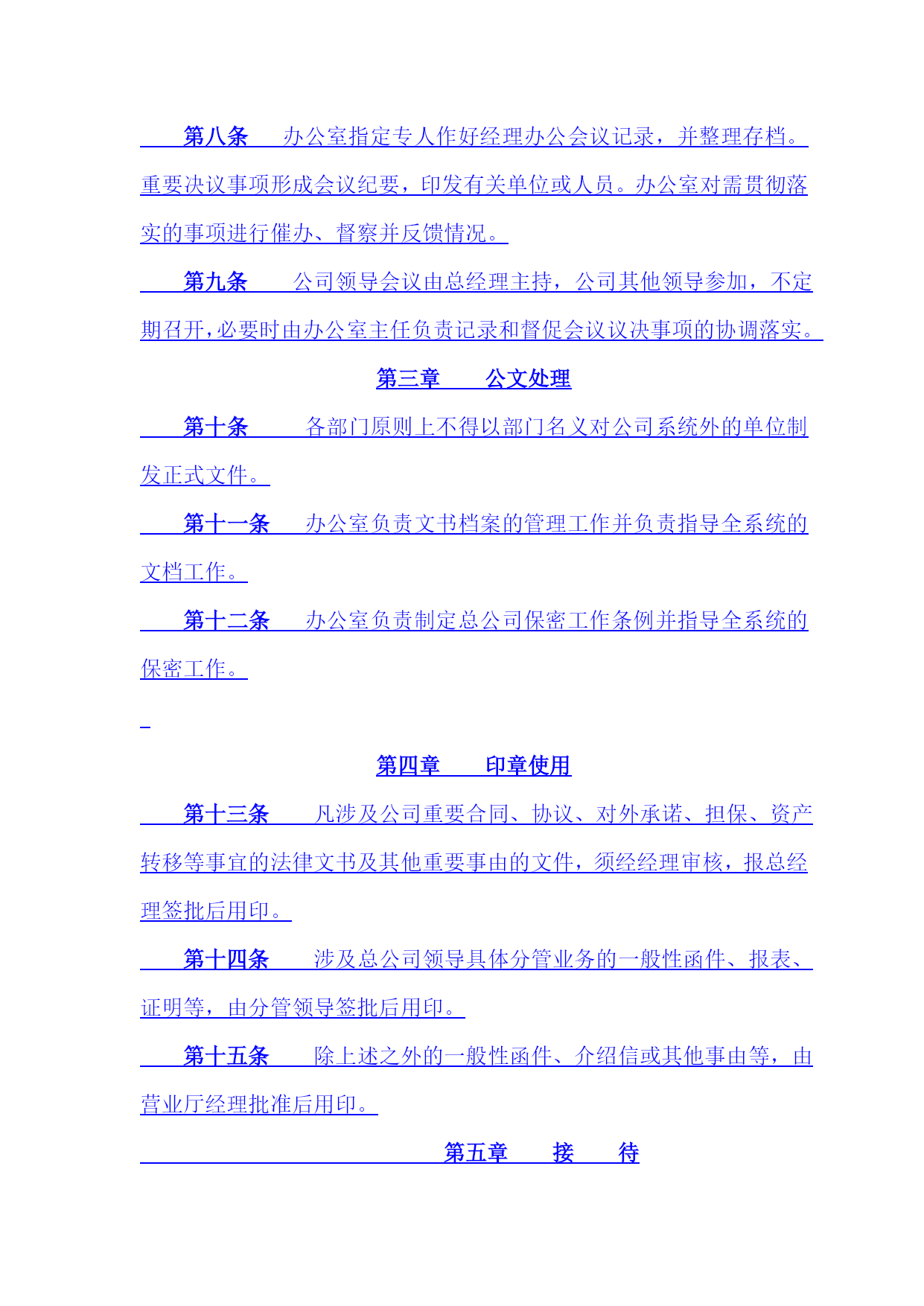 HYPERLINK"mailto:yuenanaiqing@qq.com?subject=yuenanaiqing@qq.com"行政办公室事务管理制度与规范第一章总则第一条为使公司系统的办公工作实现规范化、程序化、制度化,迸一步加强管理和协调,明确办公程序,提高办公效率,保障和促进公司战略目标的实现及各项业务的发展,制定本制度。第二条公司办公室经理负责本制度的组织实施和管理监督。第二章经理办公会议第三条公司经理办公会议分为管理工作会和业务工作汇报会。第四条每周的周一下午19:00召开管理工作会议,由经理主持,公司其他领导及各管理部门经理参加,必要时指定人员列席。主要研究公司重大事项,如经营战略、重大经营决策、重要规章制度;决定重大投资或贸易项目、重要对外关系、主要工作部署以及需要经理办公会议讨论研究的其它事项。第五条每月第三周周一上午8:40分召开业务工作汇报会,由经理主持,公司其他领导、各部门负责人参加,必要时指定人员列席。业务工作汇报内容包括:职工思想状况和具体业绩、业务发展情况等。汇报单位应于会前认真准备,届时全面汇报。第六条各部门及各专业公司需要提请经理办公会研究的事项,应在会议召开前以书面形式提出并附背景说明,报经理确定会议议题,并做好会前准备(包括会议材料等)。第七条经理办公会议对议定的事项形成相应决议或决定,总经理有最终集中决策及决定权。第八条办公室指定专人作好经理办公会议记录,并整理存档。重要决议事项形成会议纪要,印发有关单位或人员。办公室对需贯彻落实的事项进行催办、督察并反馈情况。第九条公司领导会议由总经理主持,公司其他领导参加,不定期召开,必要时由办公室主任负责记录和督促会议议决事项的协调落实。第三章公文处理第十条各部门原则上不得以部门名义对公司系统外的单位制发正式文件。第十一条办公室负责文书档案的管理工作并负责指导全系统的文档工作。第十二条办公室负责制定总公司保密工作条例并指导全系统的保密工作。第四章印章使用第十三条凡涉及公司重要合同、协议、对外承诺、担保、资产转移等事宜的法律文书及其他重要事由的文件,须经经理审核,报总经理签批后用印。第十四条涉及总公司领导具体分管业务的一般性函件、报表、证明等,由分管领导签批后用印。第十五条除上述之外的一般性函件、介绍信或其他事由等,由营业厅经理批准后用印。第五章接待第十六条来访客户由办公室接待员负责接待。公司办公区管理规定第一条为加强办公区的管理,创造文明的办公环境,维护正常的办公秩序,树立良好的企业形象,提高办公效率,有利于公司各项工作的开展,特制定本规定。第二条公司职工应严格遵守作息制度。上班时间:8.00;下班时间:18:00午午休时间:12:00一14:00第三条上班后不得外出吃早点或办私事。第四条午休后应准时于14.00上班。第五条不得将与工作无关的物品带入公司。第六条公司职工上班时须衣着整洁、得体。第七条办公时间不得因私会客;午休时间不得在办公区内搞文体娱乐活动;因私打电话必须简短。第八条办公区严禁大声喧哗、嘻笑打闹、聚堆聊天;不得使用不文明语言。第九条办公区及公共区域应保持环境整洁,办公用品摆放整齐,不得吃零食或嚼口香糖;不得摆放鞋、雨伞及其他私人杂物;严禁随地吐痰。第十条下班或办公室无人时,须关闭所有电器,公文、印章、票据及贵重物品、现金等须锁人保险柜或抽屉内,关窗、锁门后方可离开。第十一条遵守保密纪律,保存好各种文件及技术资料,不得泄露公司机密。第十二条爱护公司固定资产,发现损坏应及时报修,无法修复的应注明原因申请报废。因故意或使用不当损坏公物者,应予以相应赔偿。