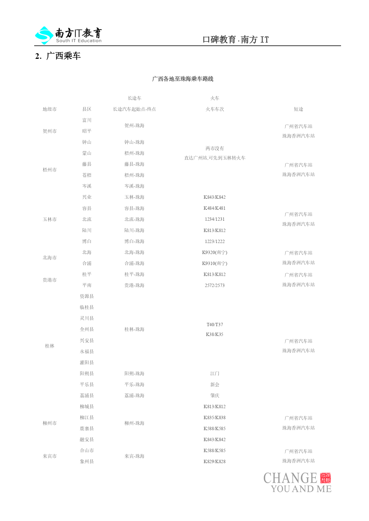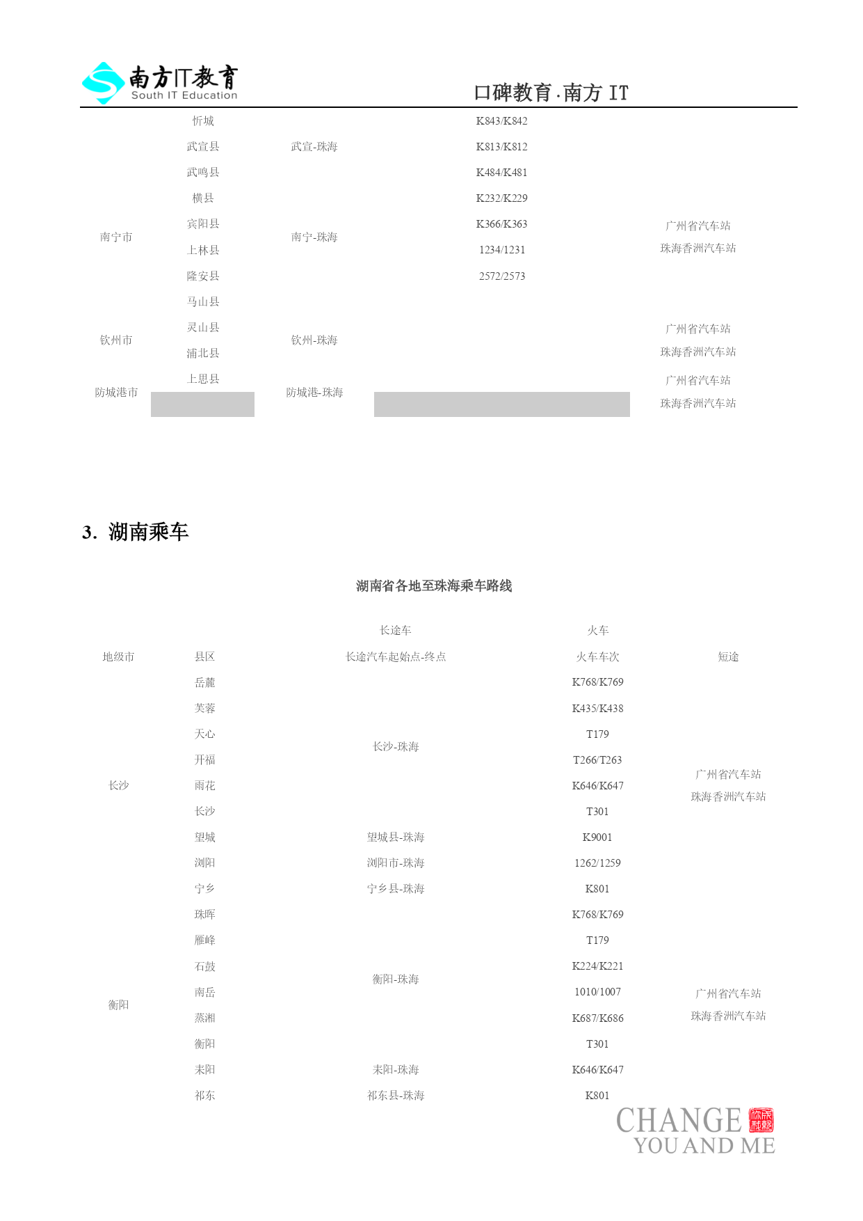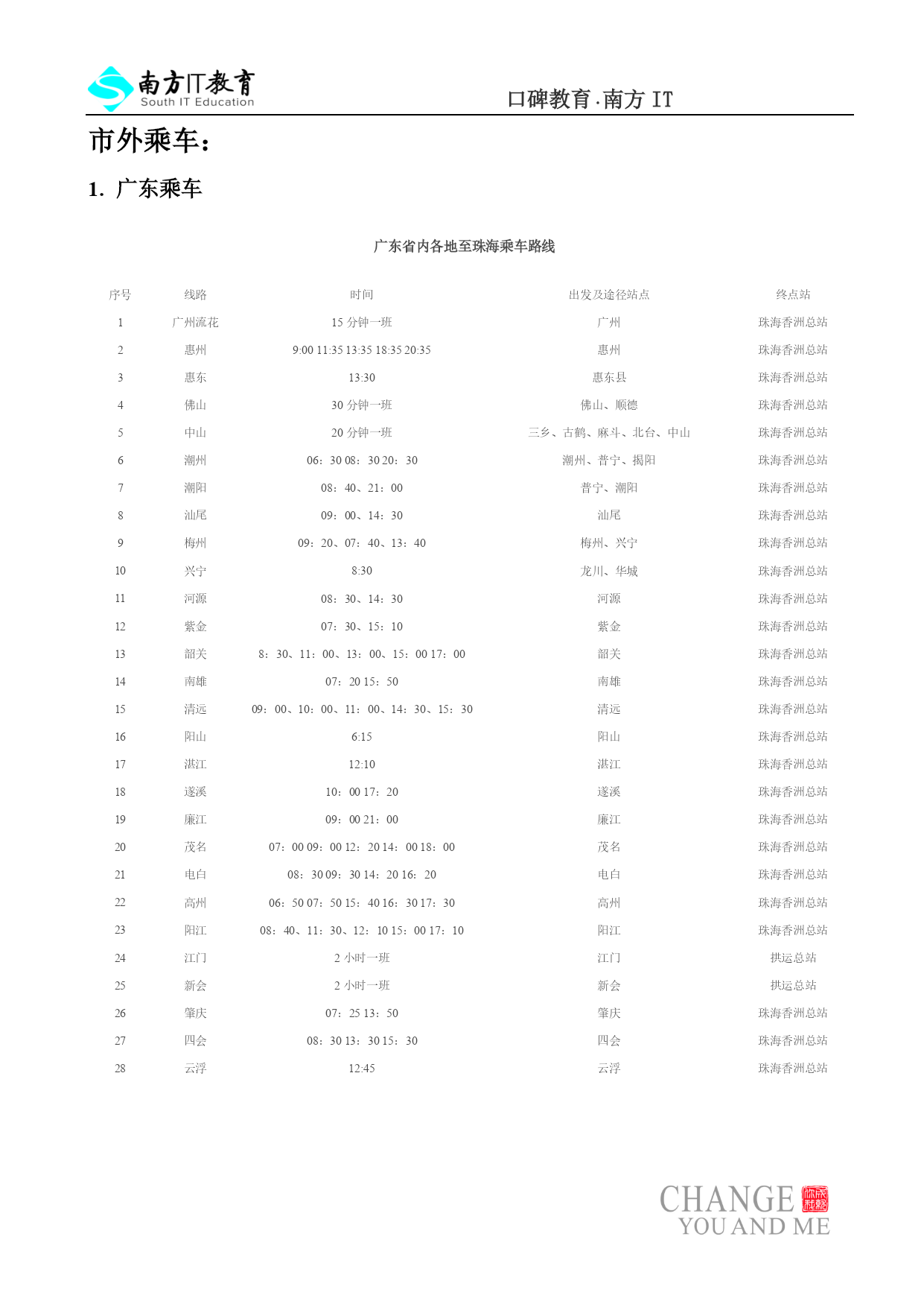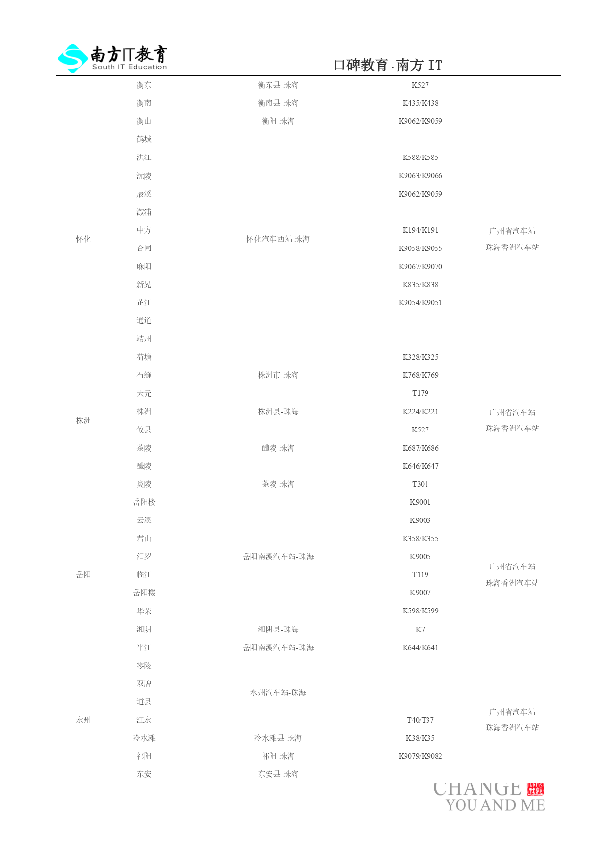 口碑教育·南方IT广东南方学院乘车市内乘车:线路一:在市内乘坐7路、11路、13路到光明街或夏美站下,夏美站南行100米即到:光明街站北行20即到。线路二:在市内可乘坐1路、4路、5路、10路、15路、32路、55路、201路、602路、609路到桃园新村或南坑站下,南坑站南行50米经桃园路即可:桃园新村下北行10米桃园路即可。市外乘车:广东乘车广东省内各地至珠海乘车路线序号线路时间出发及途径站点终点站1广州流花15分钟一班广州珠海香洲总站2惠州9:0011:3513:3518:3520:35惠州珠海香洲总站3惠东13:30惠东县珠海香洲总站4佛山30分钟一班佛山、顺德珠海香洲总站5中山20分钟一班三乡、古鹤、麻斗、北台、中山珠海香洲总站6潮州06:3008:3020:30潮州、普宁、揭阳珠海香洲总站7潮阳08:40、21:00普宁、潮阳珠海香洲总站8汕尾09:00、14:30汕尾珠海香洲总站9梅州09:20、07:40、13:40梅州、兴宁珠海香洲总站10兴宁8:30龙川、华城珠海香洲总站11河源08:30、14:30河源珠海香洲总站12紫金07:30、15:10紫金珠海香洲总站13韶关8:30、11:00、13:00、15:0017:00韶关珠海香洲总站14南雄07:2015:50南雄珠海香洲总站15清远09:00、10:00、11:00、14:30、15:30清远珠海香洲总站16阳山6:15阳山珠海香洲总站17湛江12:10湛江珠海香洲总站18遂溪10:0017:20遂溪珠海香洲总站19廉江09:0021:00廉江珠海香洲总站20茂名07:0009:0012:2014:0018:00茂名珠海香洲总站21电白08:3009:3014:2016:20电白珠海香洲总站22高州06:5007:5015:4016:3017:30高州珠海香洲总站23阳江08:40、11:30、12:1015:0017:10阳江珠海香洲总站24江门2小时一班江门拱运总站25新会2小时一班新会拱运总站26肇庆07:2513:50肇庆珠海香洲总站27四会08:3013:3015:30四会珠海香洲总站28云浮12:45云浮珠海香洲总站广西乘车广西各地至珠海乘车路线长途车火车地级市县区长途汽车起始点-终点火车车次短途贺州市富川贺州-珠海两市没有直达广州站,可先到玉林转火车广州省汽车站珠海香洲汽车站昭平钟山钟山-珠海梧州市蒙山梧州-珠海广州省汽车站珠海香洲汽车站藤县藤县-珠海苍梧梧州-珠海岑溪岑溪-珠海玉林市兴业玉林-珠海K843/K842广州省汽车站珠海香洲汽车站容县容县-珠海K484/K481北流北流-珠海1234/1231陆川陆川-珠海K813/K812博白博白-珠海1223/1222北海市北海北海-珠海K9320(南宁)广州省汽车站珠海香洲汽车站合浦合浦-珠海K9310(南宁)贵港市桂平桂平-珠海K813/K812广州省汽车站珠海香洲汽车站平南贵港-珠海2572/2573桂林资源县桂林-珠海T40/T37K38/K35广州省汽车站珠海香洲汽车站临桂县灵川县全州县兴安县永福县灌阳县阳朔县阳朔-珠海江门平乐县平乐-珠海新会荔浦县荔浦-珠海肇庆柳州市柳城县柳州-珠海K813/K812广州省汽车站珠海香洲汽车站柳江县K835/K838鹿寨县K588/K585融安县K843/K842来宾市合山市来宾-珠海K588/K585广州省汽车站珠海香洲汽车站象州县K829/K828忻城K843/K842武宣县武宣-珠海K813/K812南宁市武鸣县南宁-珠海K484/K481广州省汽车站珠海香洲汽车站横县K232/K229宾阳县K366/K363上林县1234/1231隆安县2572/2573马山县钦州市灵山县钦州-珠海广州省汽车站珠海香洲汽车站浦北县防城港市上思县防城港-珠海广州省汽车站珠海香洲汽车站湖南乘车湖南省各地至珠海乘车路线长途车火车地级市县区长途汽车起始点-终点火车车次短途长沙岳麓长沙-珠海K768/K769广州省汽车站珠海香洲汽车站芙蓉K435/K438天心T179开福T266/T263雨花K646/K647长沙T301望城望城县-珠海K9001浏阳浏阳市-珠海1262/1259宁乡宁乡县-珠海K801衡阳珠晖衡阳-珠海K768/K769广州省汽车站珠海香洲汽车站雁峰T179石鼓K224/K221南岳1010/1007蒸湘K687/K686衡阳T301耒阳耒阳-珠海K646/K647祁东祁东县-珠海K801衡东衡东县-珠海K527衡南衡南县-珠海K435/K438衡山衡阳-珠海K9062/K9059怀化鹤城怀化汽车西站-珠海广州省汽车站珠海香洲汽车站洪江K588/K585沅陵K9063/K9066辰溪K9062/K9059溆浦中方K194/K191合同K90