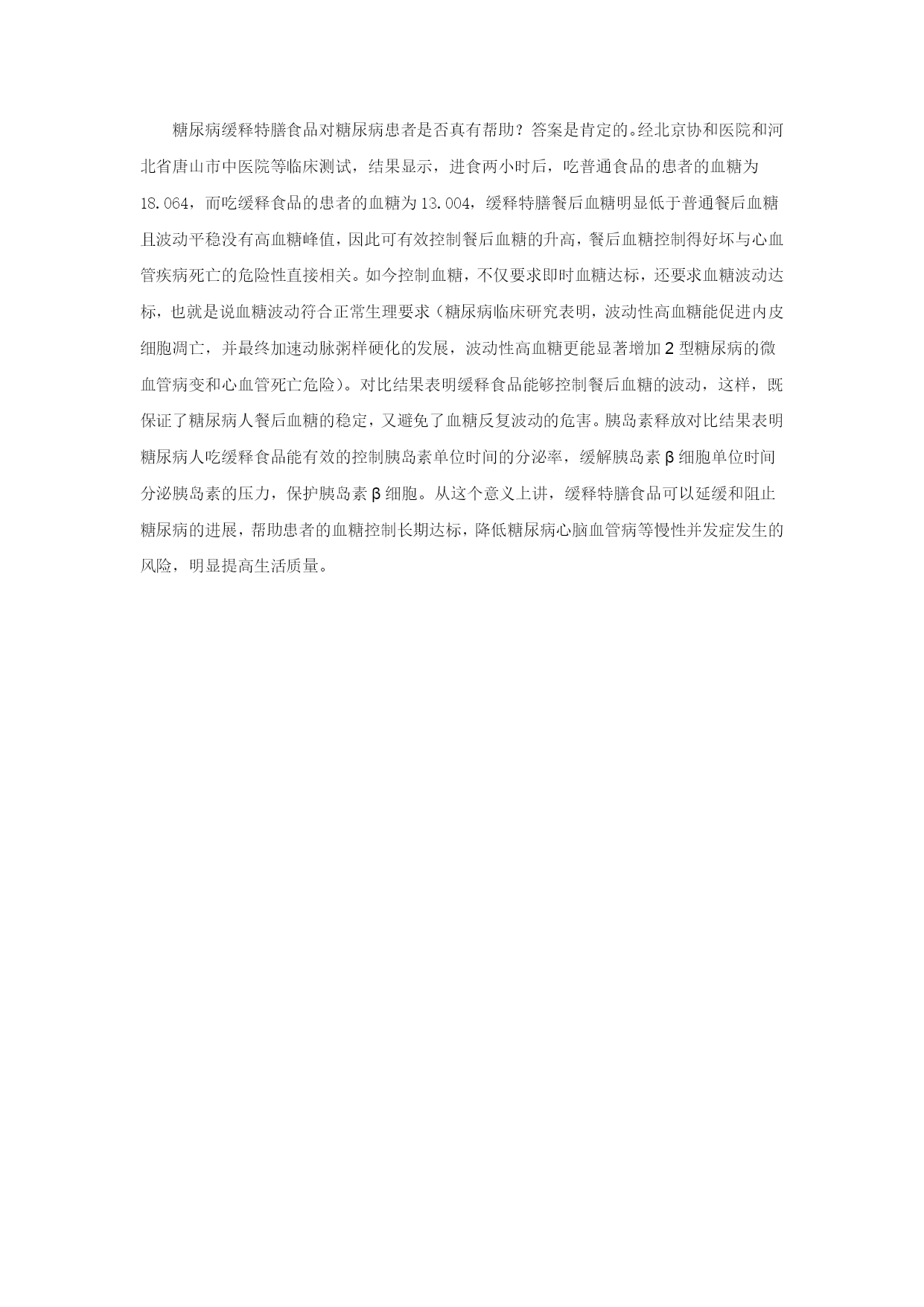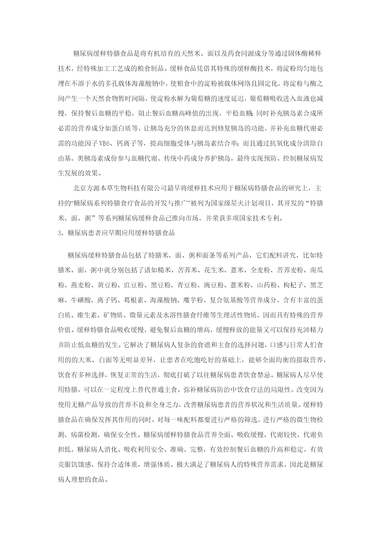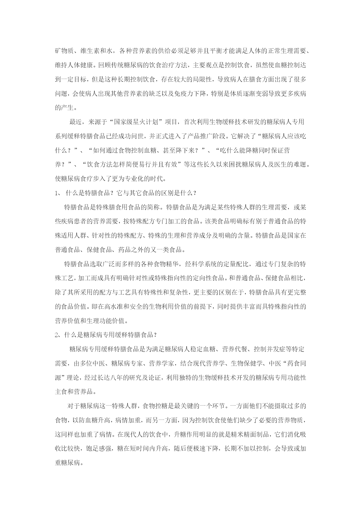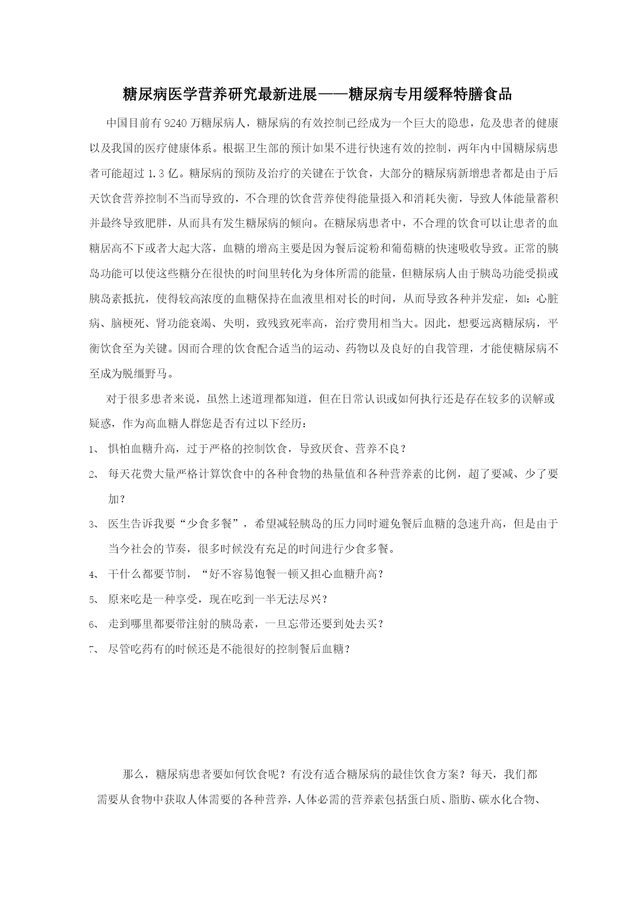 糖尿病医学营养研究最新进展——糖尿病专用缓释特膳食品中国目前有9240万糖尿病人,糖尿病的有效控制已经成为一个巨大的隐患,危及患者的健康以及我国的医疗健康体系。根据卫生部的预计如果不进行快速有效的控制,两年内中国糖尿病患者可能超过1.3亿。糖尿病的预防及HYPERLINK"http://health.people.com.cn/GB/14746/index.html"\t"_blank"治疗的关键在于饮食,大部分的糖尿病新增患者都是由于后天饮食营养控制不当而导致的,不合理的饮食营养使得能量摄入和消耗失衡,导致人体能量蓄积并最终导致肥胖,从而具有发生糖尿病的倾向。在糖尿病患者中,不合理的饮食可以让患者的血糖居高不下或者大起大落,血糖的增高主要是因为餐后淀粉和葡萄糖的快速吸收导致。正常的胰岛功能可以使这些糖分在很快的时间里转化为身体所需的能量,但糖尿病人由于胰岛功能受损或胰岛素抵抗,使得较高浓度的血糖保持在血液里相对长的时间,从而导致各种并发症,如:心脏病、脑梗死、肾功能衰竭、失明,致残致死率高,治疗费用相当大。因此,想要远离糖尿病,平衡饮食至为关键。因而合理的饮食配合适当的运动、药物以及良好的自我管理,才能使糖尿病不至成为脱缰野马。对于很多患者来说,虽然上述道理都知道,但在日常认识或如何执行还是存在较多的误解或疑惑,作为高血糖人群您是否有过以下经历:惧怕血糖升高,过于严格的控制饮食,导致厌食、营养不良?每天花费大量严格计算饮食中的各种食物的热量值和各种营养素的比例,超了要减、少了要加?医生告诉我要“少食多餐”,希望减轻胰岛的压力同时避免餐后血糖的急速升高,但是由于当今社会的节奏,很多时候没有充足的时间进行少食多餐。干什么都要节制,“好不容易饱餐一顿又担心血糖升高?原来吃是一种享受,现在吃到一半无法尽兴?走到哪里都要带注射的胰岛素,一旦忘带还要到处去买?尽管吃药有的时候还是不能很好的控制餐后血糖?那么,糖尿病患者要如何饮食呢?有没有适合糖尿病的最佳饮食方案?每天,我们都需要从HYPERLINK"http://health.people.com.cn/GB/14745/index.html"\t"_blank"食物中获取人体需要的各种营养,人体必需的营养素包括蛋白质、脂肪、碳水化合物、矿物质、维生素和水,各种营养素的供给必须足够并且平衡才能满足人体的正常生理需要、维持人体健康。回顾传统糖尿病的饮食治疗方法,主要观点是控制饮食,虽然使血糖控制达到一定目标,但是这种长期控制饮食,存在较大的局限性,导致病人在膳食方面出现了很多问题,会使病人出现其他营养素的缺乏以及免疫力下降,特别是体质逐渐变弱导致更多疾病的产生。最近,来源于“国家级星火计划”项目,首次利用生物缓释技术研发的糖尿病人专用系列缓释特膳食品已经成功问世,并正式进入了产品推广阶段。它解决了“糖尿病人应该吃什么?”、“如何通过食物控制血糖、甚至降下来?”、“吃什么能降糖同时保证营养?”、“饮食方法怎样简便易行并且有效”等这些长久以来困扰糖尿病人及医生的难题。使糖尿病食疗步入了更为专业化的时代。什么是特膳食品?它与其它食品的区别是什么?特膳食品是特殊膳食用食品的简称。特膳食品是为满足某些特殊人群的生理需要,或某些疾病患者的营养需要,按特殊配方专门加工的食品。该类食品明确标有别于普通食品的特殊适用人群、针对性的特殊配方、特殊的生理和营养成分及明确的含量。特膳食品是国家在普通食品、保健食品、药品之外的又一类食品。特膳食品选取广泛而多样的各种食物精华,经科学系统的定量配比,通过专门复杂的特殊工艺,加工而成具有明确针对性或特殊指向性的定向性食品。和普通食品、保健食品相比,除了其所采用的配方与工艺具有特殊性和复杂性,更主要的区别在于,特膳食品具有更完整的食品价值。即在高水准和安全的生物利用价值的前提下,同时提供丰富而具特殊指向性的营养价值和生理功能价值。2、什么是糖尿病专用缓释特膳食品?糖尿病专用缓释特膳食品是为满足糖尿病人稳定血糖、营养代餐、控制并发症等特定需要,由多位中医、糖尿病专家、营养学家,结合现代营养学、生物保健学、中医“药食同源”理论,经过长达八年的研究及论证,利用独特的生物缓释技术开发的糖尿病专用功能性主食和营养品。对于糖尿病这一特殊人群,食物控糖是最关键的一个环节。一方面他们不能摄取过多的食物,以防血糖升高,病情加重,而另一方面,因为控制饮食使他们缺少了必要的营养物质,这同样也加重了病情。在现代人的饮食中,升糖作用明显的就是精米精面制品,它们消化吸收比较快,饱足感强,糖在短时间内升高,随后便极速下降,长期不加以控制,会导致或加重糖尿病。糖尿病缓释特膳食品是将有机培育的天然米、面以及药食同源成分等通过固体酶稀释技术,经特殊加工工艺成的粮食制品。缓释食品凭借其特殊的缓释