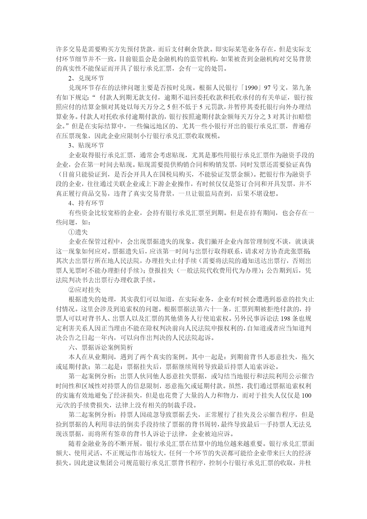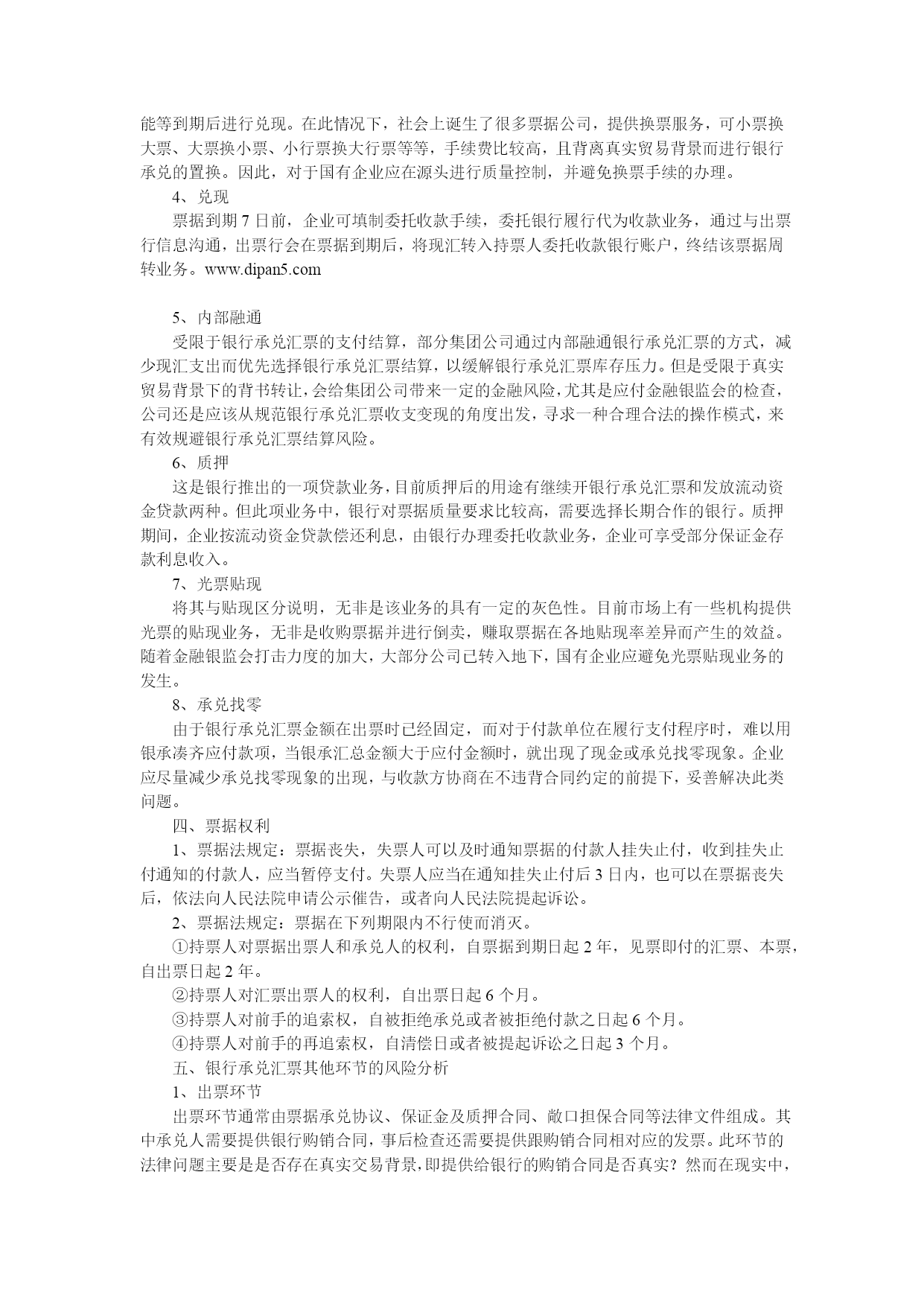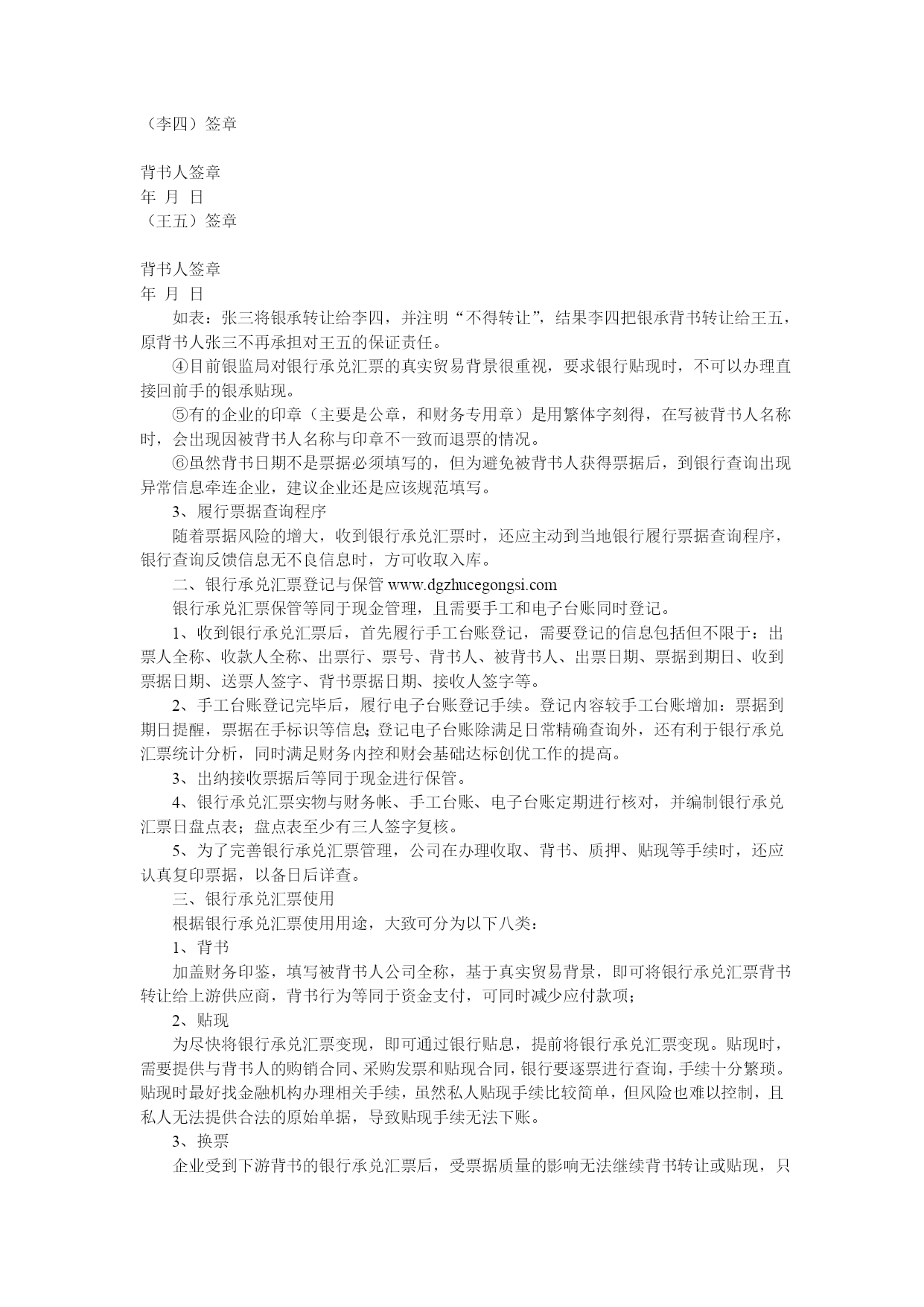 文章来源HYPERLINK"http://www.china-sunrise.cn"代办注册公司;HYPERLINK"http://www.china-sunrise.cn"www.china-sunrise.cnHYPERLINK"http://down.srcinfo.com/"http://down.srcinfo.com/银行承兑汇票业务作为商业银行调节规模和资金、提升综合经营效益的重要工具,近年来在商业银行业务经营中发挥着日益重要的作用。但是部分不法商人不断钻营国家对票据立法的漏洞,爆发了若干票据诈骗案件,扰乱了金融市场秩序,同时也导致银行承兑汇票风险日趋增强,企业在收支银行承兑汇票时往往心惊胆战,唯恐出错。银行承兑汇票是指由出票人签发和申请的,委托付款银行在指定日期承兑,并在承兑后的到期日向收款人或持票人支付确定金额的汇票。由于银行承兑汇票在经济生活中能同时发挥支付、结算、融资等多种功能,与其他结算方式和贷款方式相比,它的信誉度较高、真实性强、流动性好、周转时间长,受到了企业界的共同青睐。然而,由于监管制度设计的缺陷性、银企信息交流的不对称性、专业知识的局限性等俱多问题的存在,各种针对银行承兑汇票的违法犯罪业务也层出不穷,令企业和银行蒙受损失的同时也影响了银行承兑汇票业务的健康有序发展。下面结合银承业务流程,浅析各环节的风险控制。一、银行承兑汇票收取公司业务必须收取银行承兑汇票时,除进行“一查、二听、三摸、四比、五照”的辨别方法进行票据真伪识别外,在受理银承时还须要注意以下问题,以免造成票据贴现或托收时出现被拒绝的尴尬局面。1、票据正面填写规范①日期必须大写;②金额大写必须顶格,金额大写和小写必须一致;③出票人名称和收款人名称不得更改,且名称必须清晰准确,出票人签章处必须由出票人签章,印章内容必须与出票人全称一致,且印章必须清晰可辨;④承兑人签章处,必须有个人(出票行银行人员)签字或签章;⑤汇票的日期不得更改,且必须填写清楚,到期日与出票日不得大于6个月。2、背书转让时必须保证连续背书①被背书人名称必须填写公司全称,其保证连续背书,不得接收中途有未填写被背书人名称的银承。(由于行业内部背书习惯,为避免书写错误,产生不必要的麻烦,一般没有单位主动规范填写,但由于未规范填写极易造成诉讼风险)被背书人名称必须和紧接着的第二格中背书人签章处签章名称一致,书写被背书人名称时,必须保证字迹清晰可辨,笔划不得简写或省略,如:在填制**有限公司时,“有”字,不能把月字中的二横写成一小竖;江苏、湖南、湖北、河南等地区,在书写三点水时,不能把三点水连写或写成两点水。②在背书人签章处签章时,一定要将印章盖清,每个字都要清楚,不能移动,不能少笔划,更不得将印章盖到背书人签章栏外。这就要求经办人员在盖章时,要留有余地,防止印章有盖不清的可能。在盖骑缝章时,更要特别注意,必须保证印鉴章清楚,不能漏笔划的现象,加盖法人手章时,应尽量选择将法人章字体间歇加盖在骑缝的缝隙上。③票据法第三十四条规定:背书人在汇票上记载“不得转让”字样,其后手再背书转让的,原背书人对后手的被背书人不承担保证责任。被背书人:李四www.dgzhuce.net被背书人:王五(张三)签章不得转让背书人签章年月日(李四)签章背书人签章年月日(王五)签章背书人签章年月日如表:张三将银承转让给李四,并注明“不得转让”,结果李四把银承背书转让给王五,原背书人张三不再承担对王五的保证责任。④目前银监局对银行承兑汇票的真实贸易背景很重视,要求银行贴现时,不可以办理直接回前手的银承贴现。⑤有的企业的印章(主要是公章,和财务专用章)是用繁体字刻得,在写被背书人名称时,会出现因被背书人名称与印章不一致而退票的情况。⑥虽然背书日期不是票据必须填写的,但为避免被背书人获得票据后,到银行查询出现异常信息牵连企业,建议企业还是应该规范填写。3、履行票据查询程序随着票据风险的增大,收到银行承兑汇票时,还应主动到当地银行履行票据查询程序,银行查询反馈信息无不良信息时,方可收取入库。二、银行承兑汇票登记与保管www.dgzhucegongsi.com银行承兑汇票保管等同于现金管理,且需要手工和电子台账同时登记。1、收到银行承兑汇票后,首先履行手工台账登记,需要登记的信息包括但不限于:出票人全称、收款人全称、出票行、票号、背书人、被背书人、出票日期、票据到期日、收到票据日期、送票人签字、背书票据日期、接收人签字等。2、手工台账登记完毕后,履行电子台账登记手续。登记内容较手工台账增加:票据到期日提醒,票据在手标识等信息;登记电子台账除满足日常精确查询外,还有利于银行承兑汇票统计分析,同时满足财务内控和财会基础达标创优工作的提高。3、出纳接收票据后等同于现金进行保管。4、银行承兑汇票实物与财务