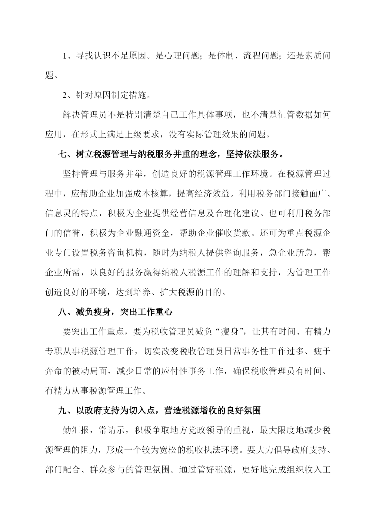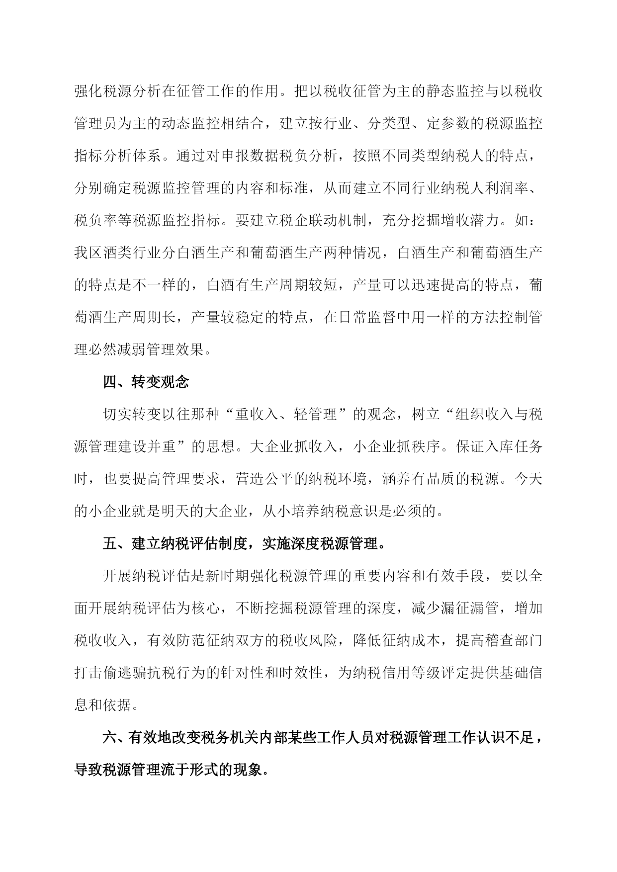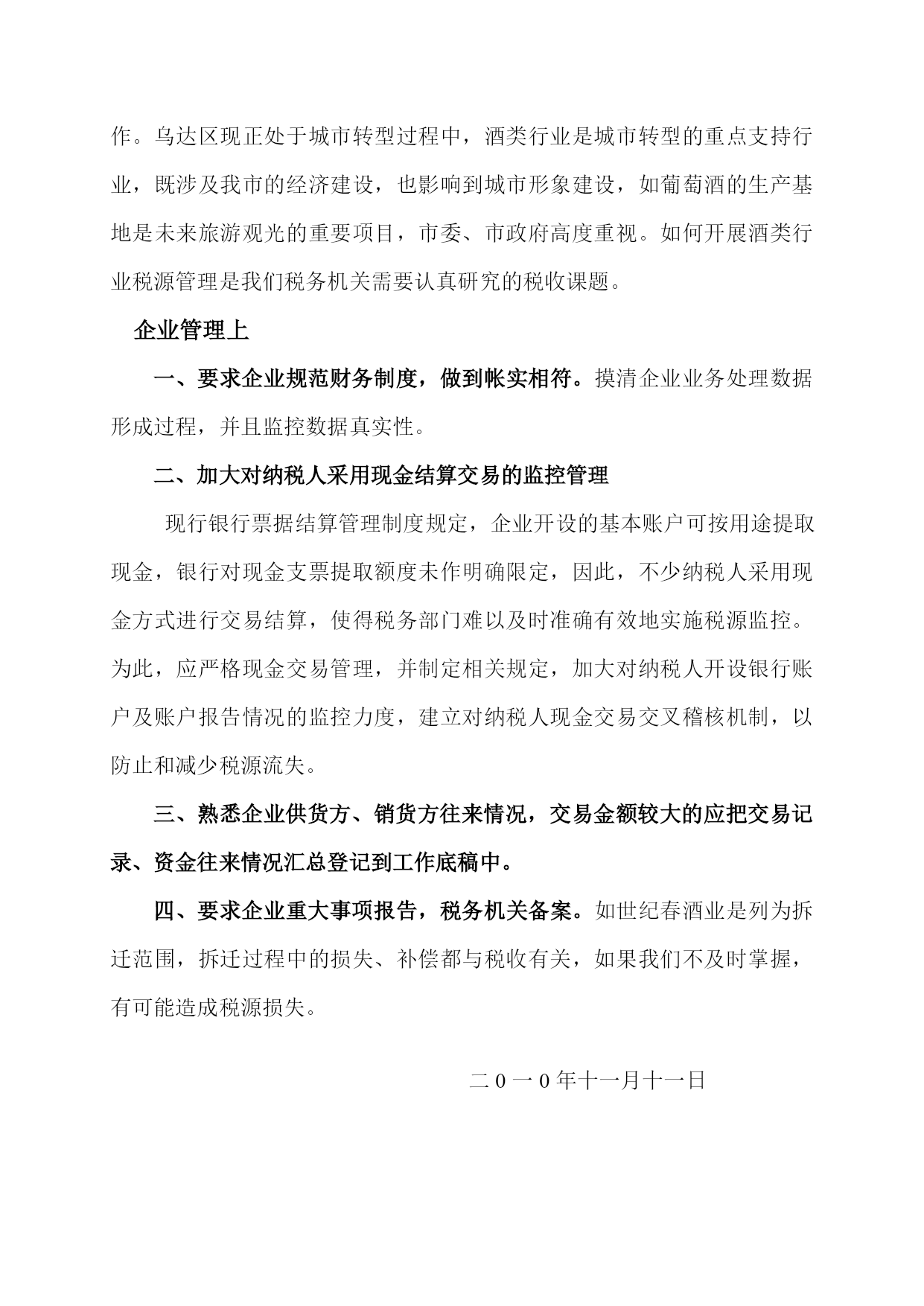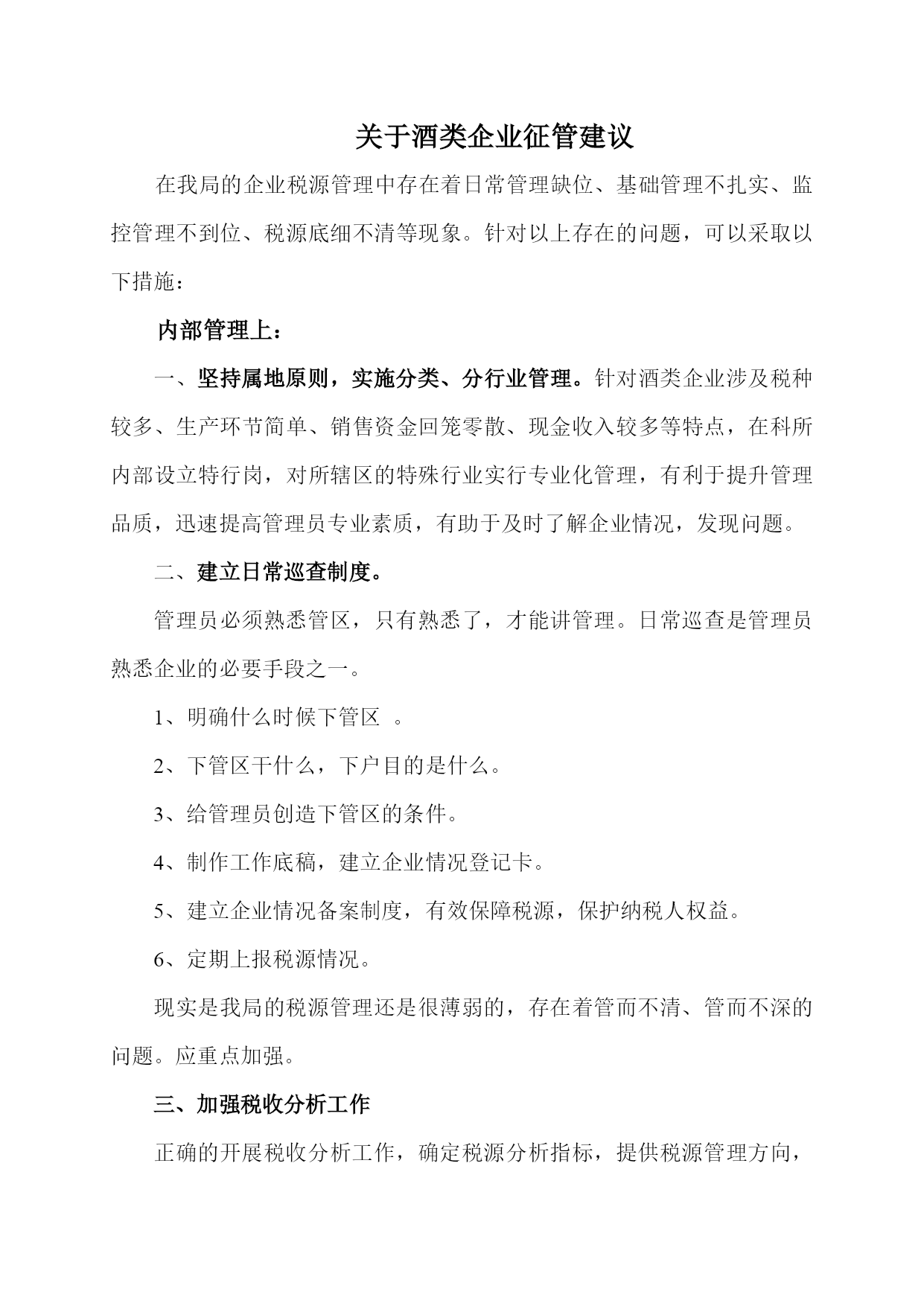 关于酒类企业征管建议在我局的企业税源管理中存在着日常管理缺位、基础管理不扎实、监控管理不到位、税源底细不清等现象。针对以上存在的问题,可以采取以下措施:内部管理上:一、坚持属地原则,实施分类、分行业管理。针对酒类企业涉及税种较多、生产环节简单、销售资金回笼零散、现金收入较多等特点,在科所内部设立特行岗,对所辖区的特殊行业实行专业化管理,有利于提升管理品质,迅速提高管理员专业素质,有助于及时了解企业情况,发现问题。二、建立日常巡查制度。管理员必须熟悉管区,只有熟悉了,才能讲管理。日常巡查是管理员熟悉企业的必要手段之一。1、明确什么时候下管区。2、下管区干什么,下户目的是什么。3、给管理员创造下管区的条件。4、制作工作底稿,建立企业情况登记卡。5、建立企业情况备案制度,有效保障税源,保护纳税人权益。6、定期上报税源情况。现实是我局的税源管理还是很薄弱的,存在着管而不清、管而不深的问题。应重点加强。三、加强税收分析工作正确的开展税收分析工作,确定税源分析指标,提供税源管理方向,强化税源分析在征管工作的作用。把以税收征管为主的静态监控与以税收管理员为主的动态监控相结合,建立按行业、分类型、定参数的税源监控指标分析体系。通过对申报数据税负分析,按照不同类型纳税人的特点,分别确定税源监控管理的内容和标准,从而建立不同行业纳税人利润率、税负率等税源监控指标。要建立税企联动机制,充分挖掘增收潜力。如:我区酒类行业分白酒生产和葡萄酒生产两种情况,白酒生产和葡萄酒生产的特点是不一样的,白酒有生产周期较短,产量可以迅速提高的特点,葡萄酒生产周期长,产量较稳定的特点,在日常监督中用一样的方法控制管理必然减弱管理效果。四、转变观念切实转变以往那种“重收入、轻管理”的观念,树立“组织收入与税源管理建设并重”的思想。大企业抓收入,小企业抓秩序。保证入库任务时,也要提高管理要求,营造公平的纳税环境,涵养有品质的税源。今天的小企业就是明天的大企业,从小培养纳税意识是必须的。五、建立纳税评估制度,实施深度税源管理。开展纳税评估是新时期强化税源管理的重要内容和有效手段,要以全面开展纳税评估为核心,不断挖掘税源管理的深度,减少漏征漏管,增加税收收入,有效防范征纳双方的税收风险,降低征纳成本,提高稽查部门打击偷逃骗抗税行为的针对性和时效性,为纳税信用等级评定提供基础信息和依据。六、有效地改变税务机关内部某些工作人员对税源管理工作认识不足,导致税源管理流于形式的现象。1、寻找认识不足原因。是心理问题;是体制、流程问题;还是素质问题。2、针对原因制定措施。解决管理员不是特别清楚自己工作具体事项,也不清楚征管数据如何应用,在形式上满足上级要求,没有实际管理效果的问题。七、树立税源管理与纳税服务并重的理念,坚持依法服务。坚持管理与服务并举,创造良好的税源管理工作环境。在税源管理过程中,应帮助企业加强成本核算,提高经济效益。利用税务部门接触面广、信息灵的特点,积极为企业提供经营信息及合理化建议。也可利用税务部门的信誉,积极为企业融通资金,帮助企业催收货款。还可为重点税源企业专门设置税务咨询机构,随时为纳税人提供咨询服务,急企业所急,帮企业所需,以良好的服务赢得纳税人税源工作的理解和支持,为管理工作创造良好的环境,达到培养、扩大税源的目的。八、减负瘦身,突出工作重心要突出工作重点,要为税收管理员减负“瘦身”,让其有时间、有精力专职从事税源管理工作,切实改变税收管理员日常事务性工作过多、疲于奔命的被动局面,减少日常的应付性事务工作,确保税收管理员有时间、有精力从事税源管理工作。九、以政府支持为切入点,营造税源增收的良好氛围勤汇报,常请示,积极争取地方党政领导的重视,最大限度地减少税源管理的阻力,形成一个较为宽松的税收执法环境。要大力倡导政府支持、部门配合、群众参与的管理氛围。通过管好税源,更好地完成组织收入工作。乌达区现正处于城市转型过程中,酒类行业是城市转型的重点支持行业,既涉及我市的经济建设,也影响到城市形象建设,如葡萄酒的生产基地是未来旅游观光的重要项目,市委、市政府高度重视。如何开展酒类行业税源管理是我们税务机关需要认真研究的税收课题。企业管理上一、要求企业规范财务制度,做到帐实相符。摸清企业业务处理数据形成过程,并且监控数据真实性。二、加大对纳税人采用现金结算交易的监控管理现行银行票据结算管理制度规定,企业开设的基本账户可按用途提取现金,银行对现金支票提取额度未作明确限定,因此,不少纳税人采用现金方式进行交易结算,使得税务部门难以及时准确有效地实施税源监控。为此,应严格现金交易管理,并制定相关规定,加大对纳税人开设银行账户及账户报告情况的监控力度,建立对纳税人现金交易交叉稽核机制,以防止和减少税源流失。三、熟悉企业供货方、销货方往来情况,交易金额较大的应把交易记录、资金往