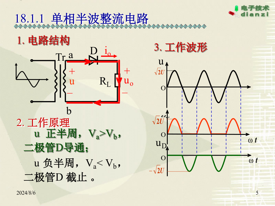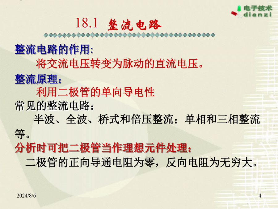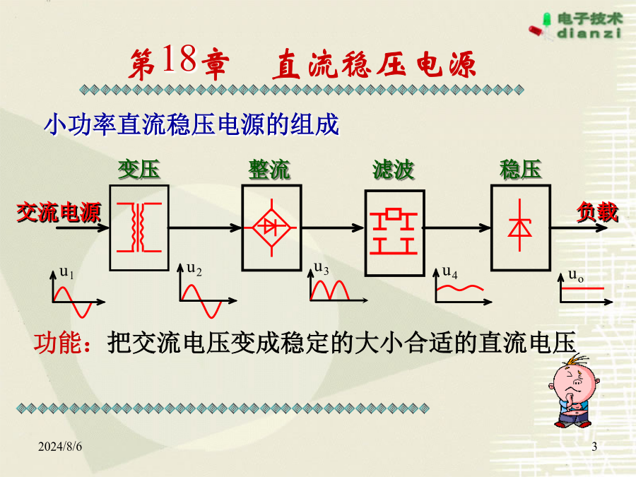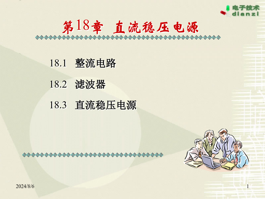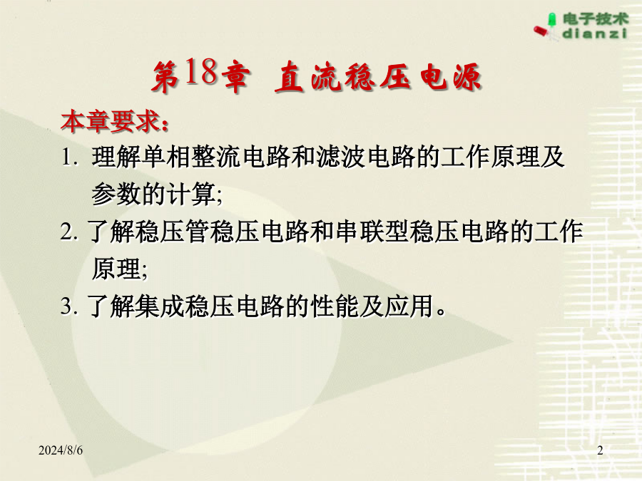 第18章直流稳压电源本章要求:1.理解单相整流电路和滤波电路的工作原理及参数的计算;2.了解稳压管稳压电路和串联型稳压电路的工作原理;3.了解集成稳压电路的性能及应用。第18章直流稳压电源18.1整流电路uD4.参数计算5.整流二极管的选择18.1.2单相桥式整流电路18.1.2单相桥式整流电路4.参数计算5.整流二极管的选择RL例1:单相桥式整流电路,已知交流电网电压为220V,负载电阻RL=50,负载电压Uo=100V,试求变压器的变比和容量,并选择二极管。试分析图示桥式整流电路中的二极管D2或D4断开时负载电压的波形。如果D2或D4接反,后果如何?如果D2或D4因击穿或烧坏而短路,后果又如何?18.2滤波器18.2.1电容滤波器1.电路结构4.电容滤波电路的特点(2)外特性曲线例:例:有一单相桥式整流滤波电路,已知交流电源频率f=50Hz,负载电阻RL=200,要求直流输出电压Uo=30V,选择整流二极管及滤波电容器。18.2.2电感电容滤波器18.2.3形滤波器18.3直流稳压电源18.3.1稳压二极管稳压电路18.3.1稳压管稳压电路3.参数的选择UI当由于电源电压或负载电阻的变化使输出电压UO升高时,有如下稳压过程:3.输出电压及调节范围18.3.3集成稳压电源2.外形及引脚功能3.性能特点(7800、7900系列)输出为固定正电压时的接法如图所示。(2)同时输出正、负电压的电路UXX:为W78XX固定输出电压UO=UXX+UZ5.三端可调输出集成稳压器的应用