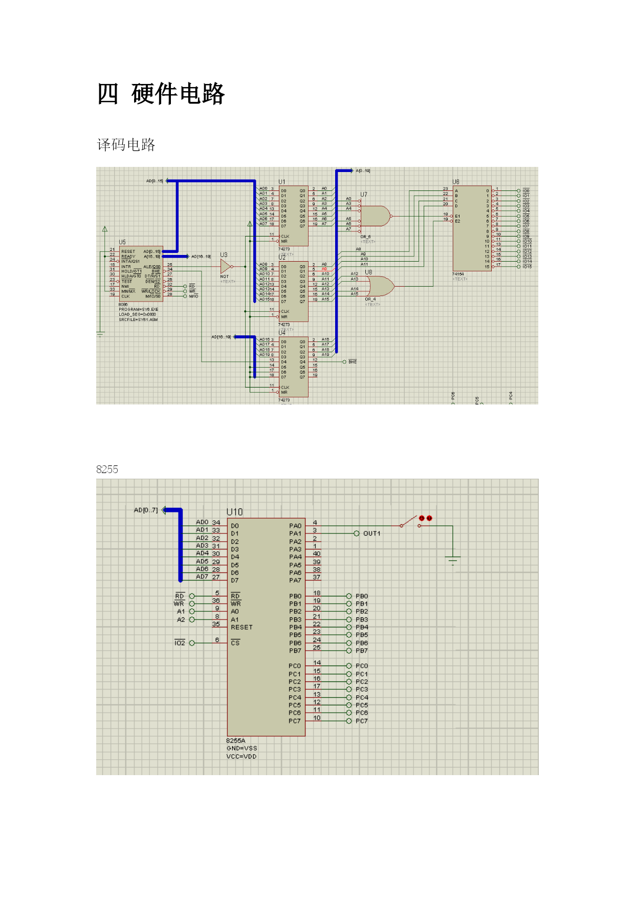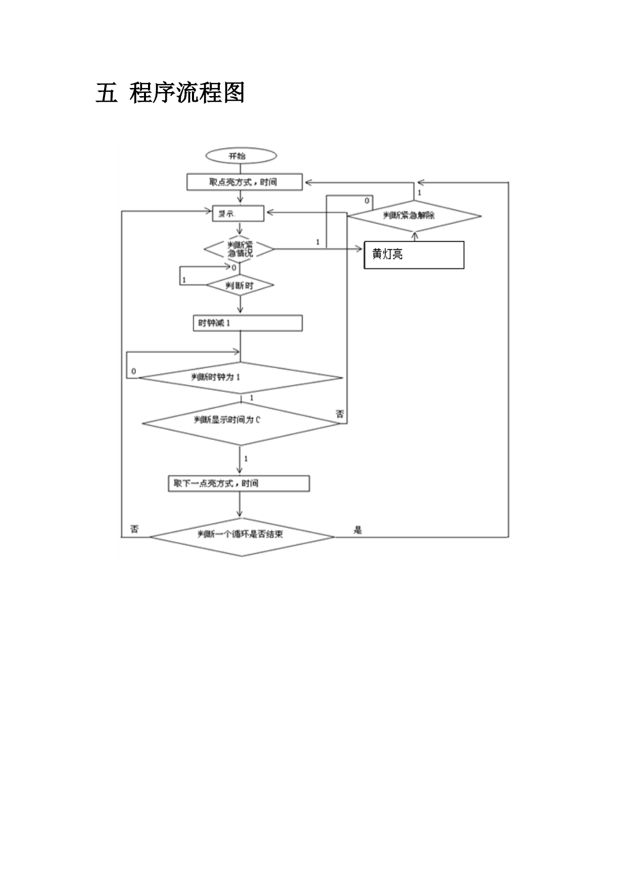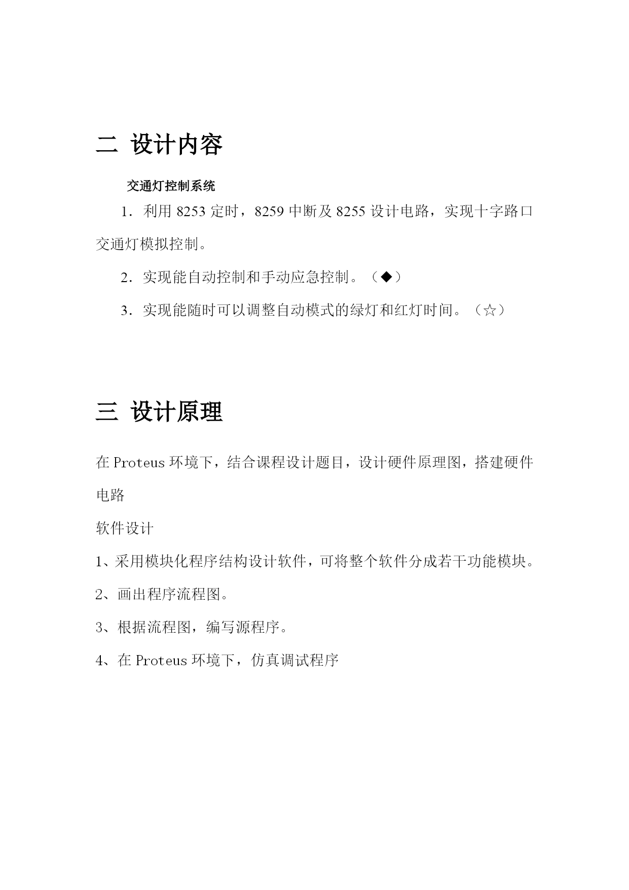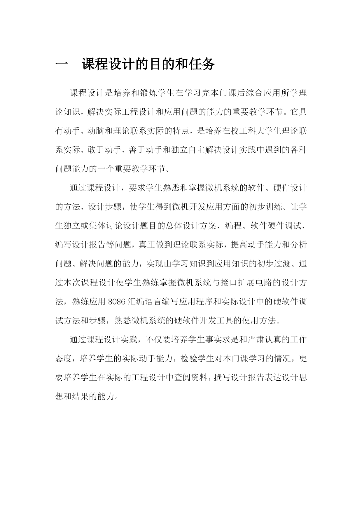 一课程设计的目的和任务课程设计是培养和锻炼学生在学习完本门课后综合应用所学理论知识,解决实际工程设计和应用问题的能力的重要教学环节。它具有动手、动脑和理论联系实际的特点,是培养在校工科大学生理论联系实际、敢于动手、善于动手和独立自主解决设计实践中遇到的各种问题能力的一个重要教学环节。通过课程设计,要求学生熟悉和掌握微机系统的软件、硬件设计的方法、设计步骤,使学生得到微机开发应用方面的初步训练。让学生独立或集体讨论设计题目的总体设计方案、编程、软件硬件调试、编写设计报告等问题,真正做到理论联系实际,提高动手能力和分析问题、解决问题的能力,实现由学习知识到应用知识的初步过渡。通过本次课程设计使学生熟练掌握微机系统与接口扩展电路的设计方法,熟练应用8086汇编语言编写应用程序和实际设计中的硬软件调试方法和步骤,熟悉微机系统的硬软件开发工具的使用方法。通过课程设计实践,不仅要培养学生事实求是和严肃认真的工作态度,培养学生的实际动手能力,检验学生对本门课学习的情况,更要培养学生在实际的工程设计中查阅资料,撰写设计报告表达设计思想和结果的能力。二设计内容交通灯控制系统1.利用8253定时,8259中断及8255设计电路,实现十字路口交通灯模拟控制。2.实现能自动控制和手动应急控制。(◆)3.实现能随时可以调整自动模式的绿灯和红灯时间。(☆)三设计原理在Proteus环境下,结合课程设计题目,设计硬件原理图,搭建硬件电路软件设计1、采用模块化程序结构设计软件,可将整个软件分成若干功能模块。2、画出程序流程图。3、根据流程图,编写源程序。4、在Proteus环境下,仿真调试程序四硬件电路译码电路82558253交通灯部分五程序流程图六程序代码A_PORTEQU200HB_PORTEQU202HC_PORTEQU204HCTRL_PORTEQU206HCLK0EQU100HCLK1EQU102HCTRLEQU106HDATASEGMENTBUF1DB09H,11H,21H,12H,0CH,4AH,89H,49HBUF2DB0C9H,0A3H,99H,93H,99H,13H,19H,23H,0HDATAENDSSTACKSEGMENTPARASTACK'STACK'DB100DUP(?)STACKENDSCODESEGMENTASSUMECS:CODE,DS:DATA,SS:STACKSTART:MOVAX,DATAMOVDS,AXMOVAX,STACKMOVSS,AXMOVAL,10010000BMOVDX,CTRL_PORTOUTDX,ALMOVAL,0MOVDX,B_PORTOUTDX,ALMOVDX,C_PORTOUTDX,ALCALLPLAYLEASI,BUF1LEABX,BUF2AAA1:MOVCH,[BX]MOVCL,CHANDCL,00001111BCALLSHOW1CALLDELAYCALLSHOW2CALLDELAYJMPAAA6AAA4:MOVDX,A_PORTINAL,DXANDAL,00000001BCMPAL,00000000BJNZAAA7MOVAL,01010010BMOVDX,B_PORTOUTDX,ALMOVAL,00100000BMOVDX,C_PORTOUTDX,ALJMPAAA4AAA7:MOVDX,A_PORTINAL,DXANDAL,00000010BCMPAL,00000000BJNZAAA4CMPCL,0JNZAAA5INCSIINCBXMOVAL,[BX]CMPAL,0JNZAAA1JMPSTARTAAA5:DECCLDECCHCALLSHOW2CALLDELAYAAA6:MOVDX,A_PORTINAL,DXANDAL,00000010BCMPAL,00000010BJNZAAA6JMPAAA4SHOW1PROCMOVAL,[SI]MOVDX,B_PORTOUTDX,ALRETSHOW1ENDPSHOW2PROCMOVAL,CHMOVDX,C_PORTOUTDX,ALRETSHOW2ENDPPLAYPROCMOVAL,00110111BMOVDX,CTRLOUTDX,ALMOVAX,10MOVDX,CLK0OUTDX,ALMOVAL,AHOUTDX,ALMOVAL,01110111BMOVDX,CTRLOUTDX,ALMOVAX,10MOVDX,CLK1OUTDX,ALMOVAL,AHOUTDX,ALRETPLAYENDPDELAYPROCPUSHCXMOVCX,0F5FHLOOP1:LOOPLOOP1POPCXRETDELAYENDPCODEENDSENDSTART七程序及硬件系统调试情况交通灯调试,自动控制8255开关关下后,均为黄灯,实现应急控制八实验总结经过本次微机原理课程设计,我了解