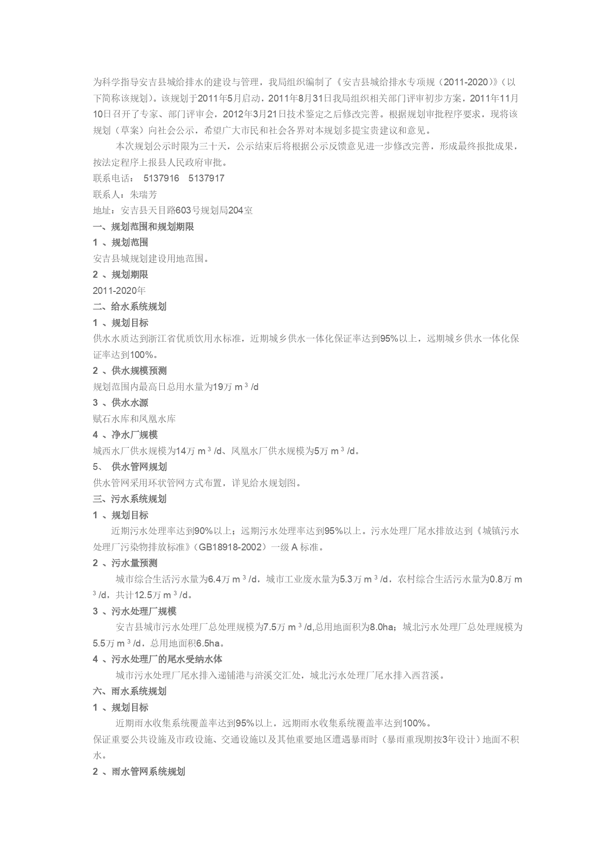 为科学指导安吉县城给排水的建设与管理,我局组织编制了《安吉县城给排水专项规(2011-2020)》(以下简称该规划)。该规划于2011年5月启动,2011年8月31日我局组织相关部门评审初步方案,2011年11月10日召开了专家、部门评审会,2012年3月21日技术鉴定之后修改完善。根据规划审批程序要求,现将该规划(草案)向社会公示,希望广大市民和社会各界对本规划多提宝贵建议和意见。本次规划公示时限为三十天,公示结束后将根据公示反馈意见进一步修改完善,形成最终报批成果,按法定程序上报县人民政府审批。联系电话:51379165137917联系人:朱瑞芳地址:安吉县天目路603号规划局204室一、规划范围和规划期限1、规划范围安吉县城规划建设用地范围。2、规划期限2011-2020年二、给水系统规划1、规划目标供水水质达到浙江省优质饮用水标准,近期城乡供水一体化保证率达到95%以上,远期城乡供水一体化保证率达到100%。2、供水规模预测规划范围内最高日总用水量为19万m3/d3、供水水源赋石水库和凤凰水库4、净水厂规模城西水厂供水规模为14万m3/d、凤凰水厂供水规模为5万m3/d。5、供水管网规划供水管网采用环状管网方式布置,详见给水规划图。三、污水系统规划1、规划目标近期污水处理率达到90%以上;远期污水处理率达到95%以上。污水处理厂尾水排放达到《城镇污水处理厂污染物排放标准》(GB18918-2002)一级A标准。2、污水量预测城市综合生活污水量为6.4万m3/d,城市工业废水量为5.3万m3/d,农村综合生活污水量为0.8万m3/d,共计12.5万m3/d。3、污水处理厂规模安吉县城市污水处理厂总处理规模为7.5万m3/d,总用地面积为8.0ha;城北污水处理厂总处理规模为5.5万m3/d,总用地面积6.5ha。4、污水处理厂的尾水受纳水体城市污水处理厂尾水排入递铺港与浒溪交汇处,城北污水处理厂尾水排入西苕溪。六、雨水系统规划1、规划目标近期雨水收集系统覆盖率达到95%以上,远期雨水收集系统覆盖率达到100%。保证重要公共设施及市政设施、交通设施以及其他重要地区遭遇暴雨时(暴雨重现期按3年设计)地面不积水。2、雨水管网系统规划规划范围内雨水排放区域分为康山及孝源区块、双河村区块、城北核心区、阳光工业园区、健康医药园及铜山桥区块、塘浦区块、灵峰旅游度假区、老城区及城东分区、范谭及龙山区块、凤凰山及禹山坞区块。雨水排放原则为就近排入雨水渠道后再排入西苕溪、浒溪和递铺港等河流。在城区东侧、南侧山体边缘设置截洪沟,以截留周边山体雨水,使其不进入城区。