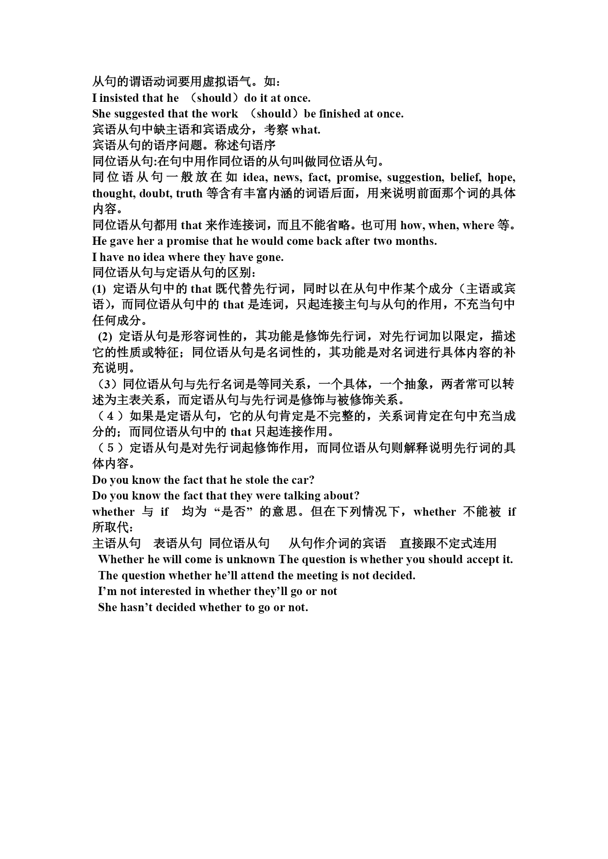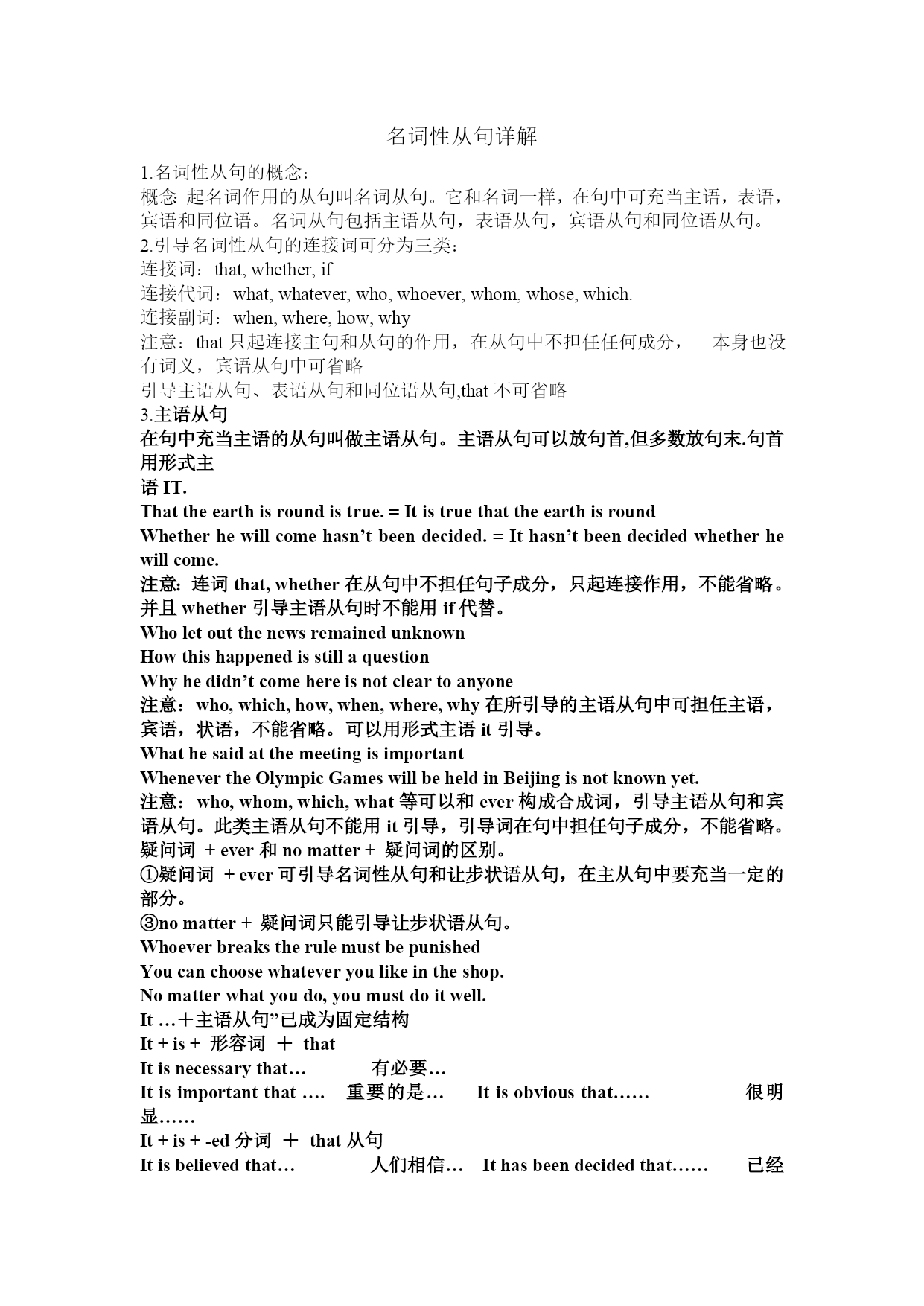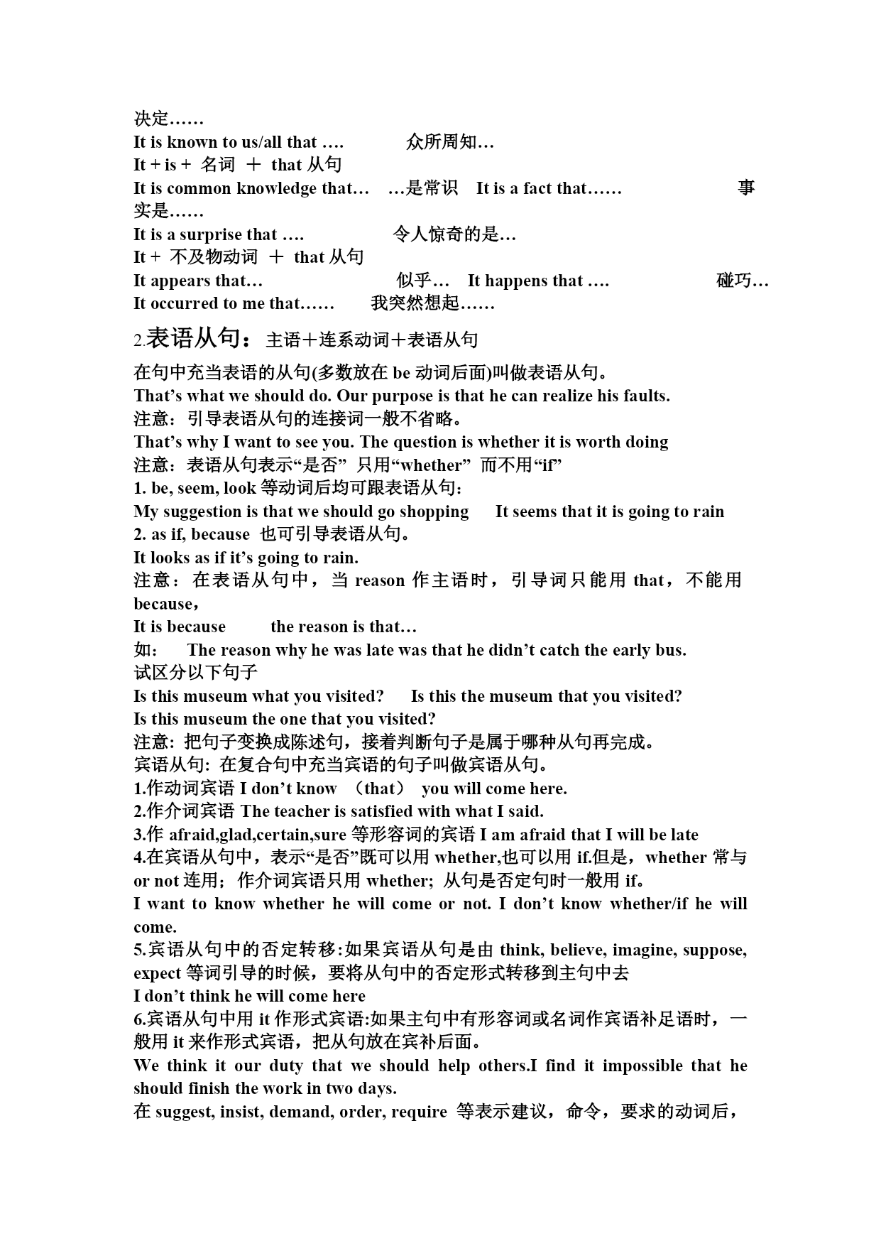 名词性从句详解1.名词性从句的概念:概念:起名词作用的从句叫名词从句。它和名词一样,在句中可充当主语,表语,宾语和同位语。名词从句包括主语从句,表语从句,宾语从句和同位语从句。2.引导名词性从句的连接词可分为三类:连接词:that,whether,if连接代词:what,whatever,who,whoever,whom,whose,which.连接副词:when,where,how,why注意:that只起连接主句和从句的作用,在从句中不担任任何成分,本身也没有词义,宾语从句中可省略引导主语从句、表语从句和同位语从句,that不可省略3.主语从句在句中充当主语的从句叫做主语从句。主语从句可以放句首,但多数放句末.句首用形式主语IT.Thattheearthisroundistrue.=ItistruethattheearthisroundWhetherhewillcomehasn’tbeendecided.=Ithasn’tbeendecidedwhetherhewillcome.注意:连词that,whether在从句中不担任句子成分,只起连接作用,不能省略。并且whether引导主语从句时不能用if代替。WholetoutthenewsremainedunknownHowthishappenedisstillaquestionWhyhedidn’tcomehereisnotcleartoanyone注意:who,which,how,when,where,why在所引导的主语从句中可担任主语,宾语,状语,不能省略。可以用形式主语it引导。WhathesaidatthemeetingisimportantWhenevertheOlympicGameswillbeheldinBeijingisnotknownyet.注意:who,whom,which,what等可以和ever构成合成词,引导主语从句和宾语从句。此类主语从句不能用it引导,引导词在句中担任句子成分,不能省略。疑问词+ever和nomatter+疑问词的区别。①疑问词+ever可引导名词性从句和让步状语从句,在主从句中要充当一定的部分。③nomatter+疑问词只能引导让步状语从句。WhoeverbreakstherulemustbepunishedYoucanchoosewhateveryoulikeintheshop.Nomatterwhatyoudo,youmustdoitwell.It…+主语从句”已成为固定结构It+is+形容词+thatItisnecessarythat…有必要…Itisimportantthat….重要的是…Itisobviousthat……很明显……It+is+-ed分词+that从句Itisbelievedthat…人们相信…Ithasbeendecidedthat……已经决定……Itisknowntous/allthat….众所周知…It+is+名词+that从句Itiscommonknowledgethat……是常识Itisafactthat……事实是……Itisasurprisethat….令人惊奇的是…It+不及物动词+that从句Itappearsthat…似乎…Ithappensthat….碰巧…Itoccurredtomethat……我突然想起……2.表语从句:主语+连系动词+表语从句在句中充当表语的从句(多数放在be动词后面)叫做表语从句。That’swhatweshoulddo.Ourpurposeisthathecanrealizehisfaults.注意:引导表语从句的连接词一般不省略。That’swhyIwanttoseeyou.Thequestioniswhetheritisworthdoing注意:表语从句表示“是否”只用“whether”而不用“if”1.be,seem,look等动词后均可跟表语从句:MysuggestionisthatweshouldgoshoppingItseemsthatitisgoingtorain2.asif,because也可引导表语从句。Itlooksasifit’sgoingtorain.注意:在表语从句中,当reason作主语时,引导词只能用that,不能用because,Itisbecausethereasonisthat…如:Thereasonwhyhewaslatewasthathedidn’tcatchtheearlybus.试区分以下句子Isthismuseumwhatyouvisited?Isthisthemuseumthatyouvisited?Isthismuseumtheonethatyouvisited?注意:把句子变换成陈述句,接着判断句子是属