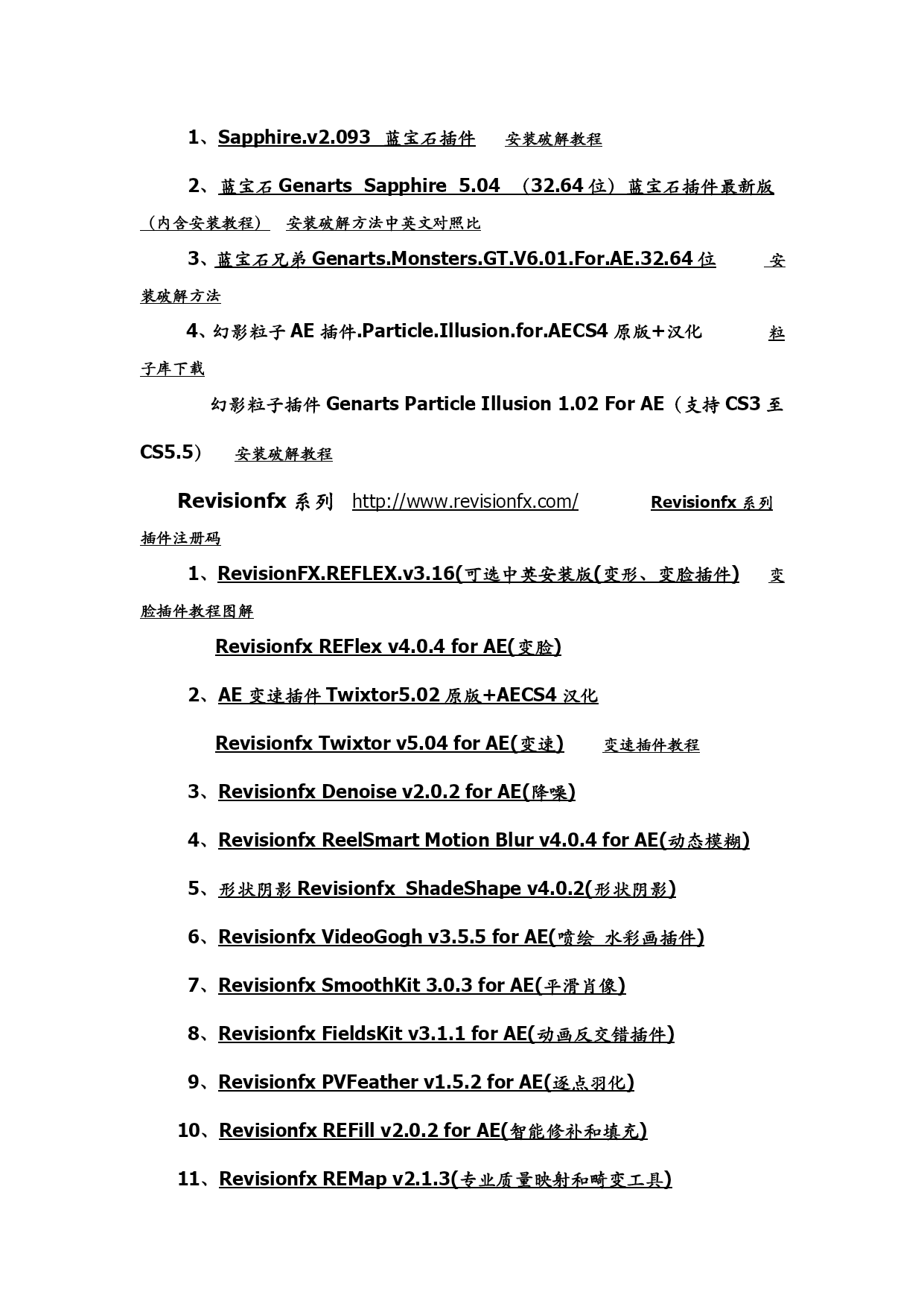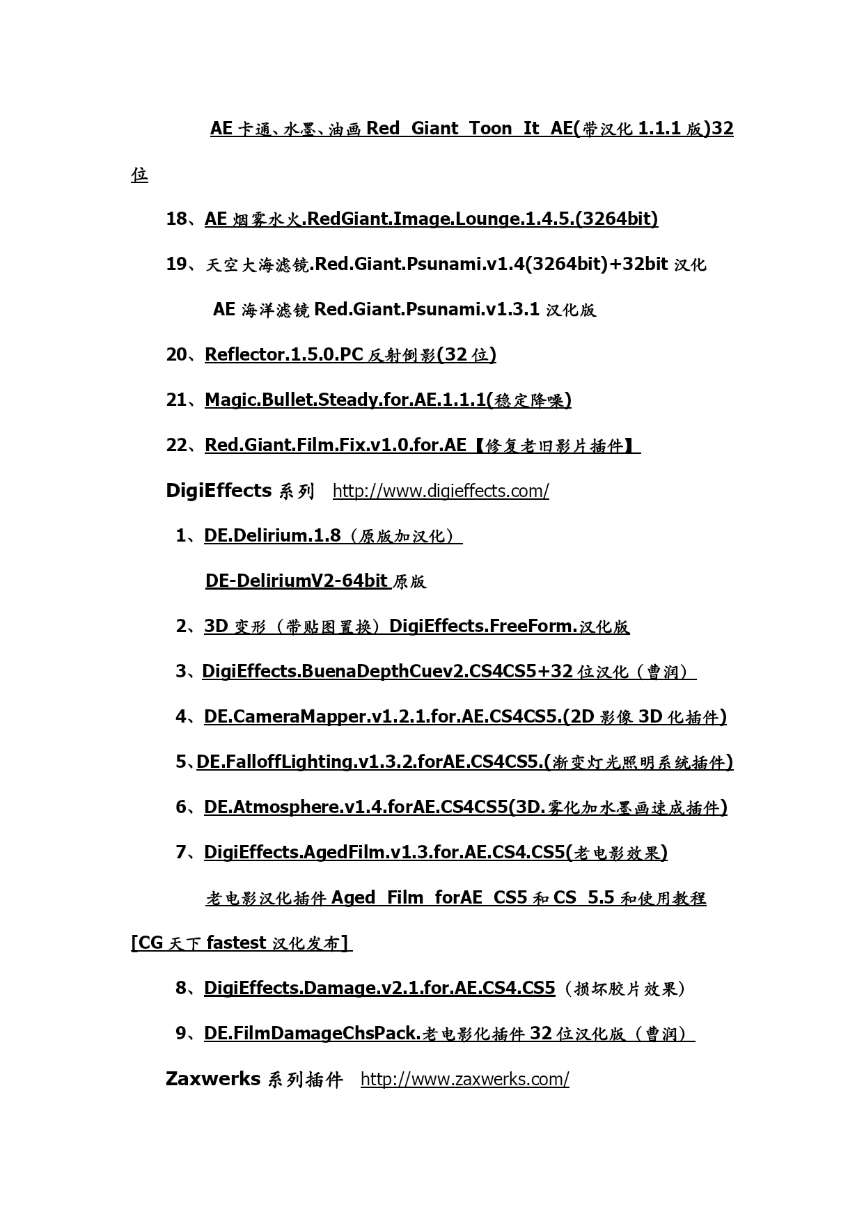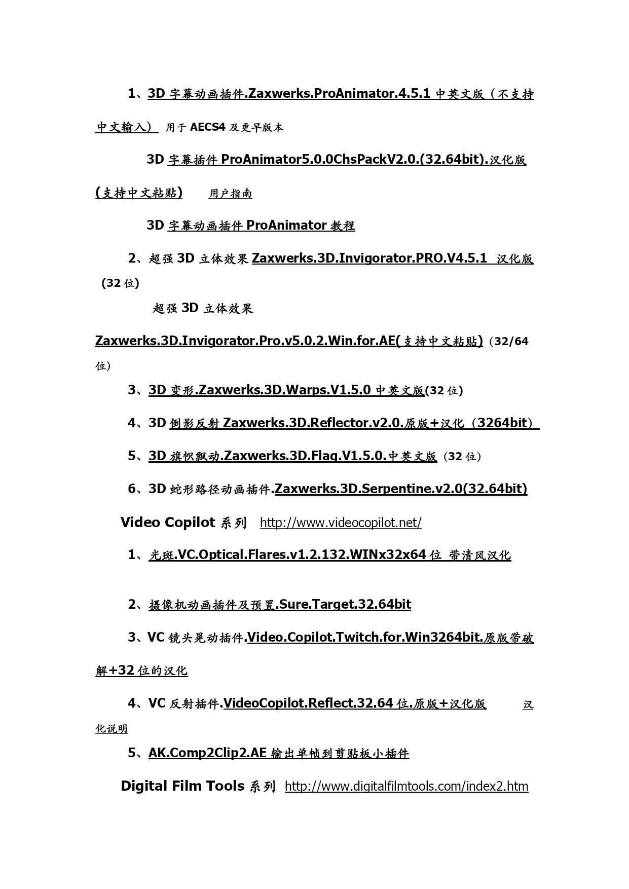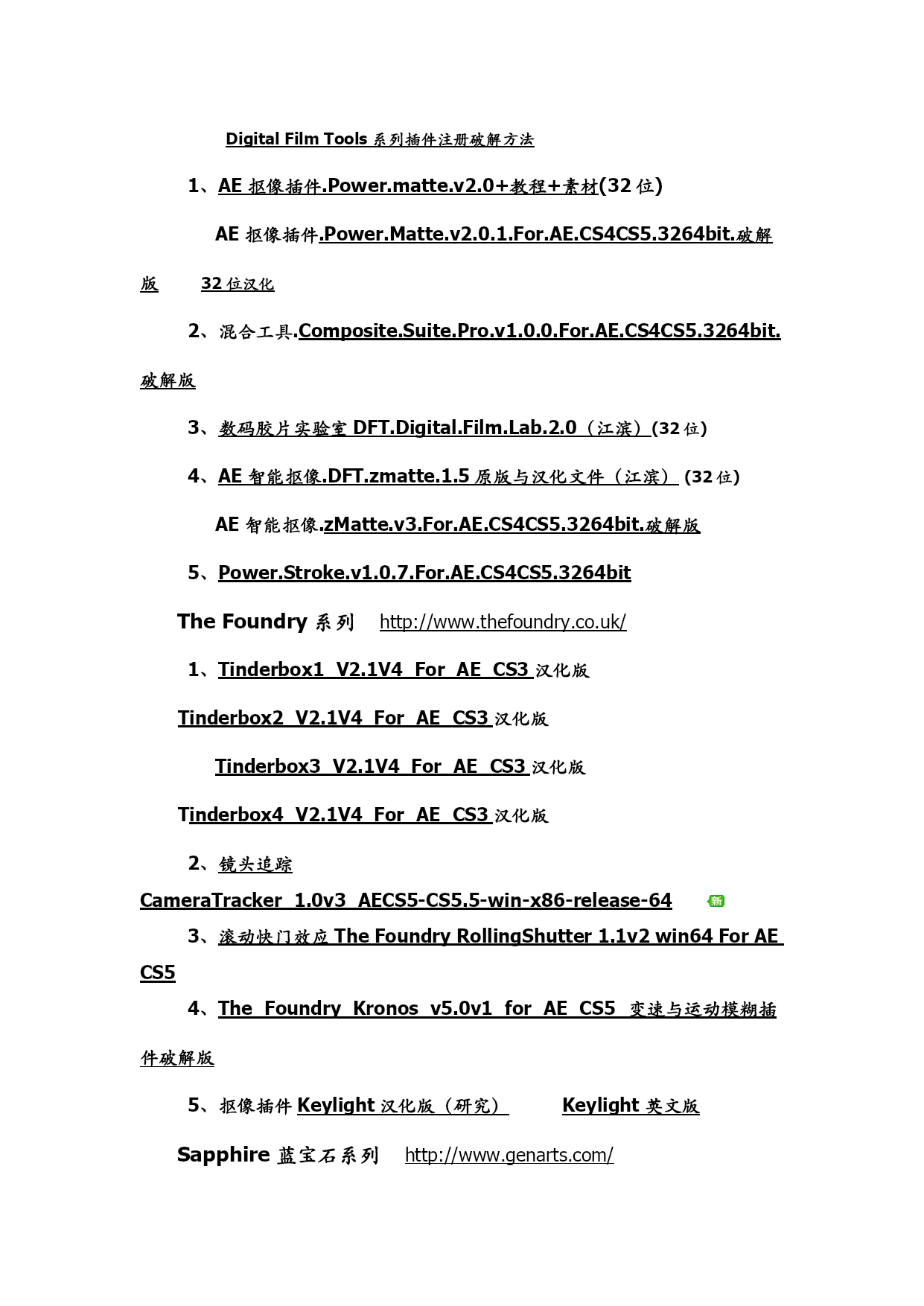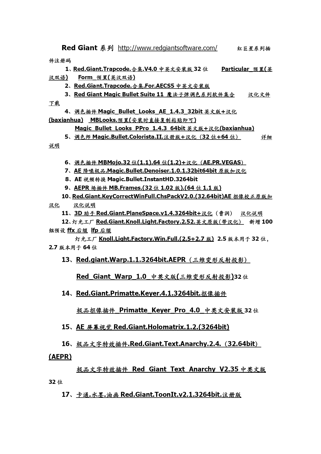 RedGiant系列HYPERLINK"http://www.redgiantsoftware.com/"http://www.redgiantsoftware.com/HYPERLINK"http://hi.baidu.com/spring6256/blog/item/2cb2d9d52e6700cba144df8c.html"\t"_blank"红巨星系列插件注册码1、HYPERLINK"http://u.115.com/file/f44b56315b"\t"_blank"Red.Giant.Trapcode.合集.V4.0中英文安装版32位HYPERLINK"http://u.115.com/file/f44d116dd6"\t"_blank"Particular_预置(英汉双语)HYPERLINK"http://u.115.com/file/f49dd8e9e"\t"_blank"Form_预置(英汉双语)2、HYPERLINK"http://u.115.com/file/f47dd2aa42"\t"_blank"Red.Giant.Trapcode.合集.For.AECS5中英文安装版3、HYPERLINK"http://www.timelinefx.com/magic-bullet-suite-11/"\t"_blank"RedGiantMagicBulletSuite11魔法子弹调色系列软件集合HYPERLINK"http://u.115.com/file/aqzjj6ss"\t"_blank"汉化文件下载4、HYPERLINK"http://u.115.com/file/f4e379a738"\t"_blank"调色插件Magic_Bullet_Looks_AE_1.4.3_32bit英文版+汉化(baxianhua)HYPERLINK"http://u.115.com/file/bhzl39m9"\t"_blank"MBLooks.预置(安装时直接复制粘贴即可)HYPERLINK"http://u.115.com/file/f44832d4f3"\t"_blank"Magic_Bullet_Looks_PPro_1.4.3_64bit英文版+汉化(baxianhua)5、HYPERLINK"http://u.115.com/file/f49c7925e8"\t"_blank"调色师Magic.Bullet.Colorista.II.注册版+汉化(32位+64位)HYPERLINK"http://hi.baidu.com/spring6256/blog/item/2b5327d109cfa4caa8ec9ae2.html"\t"_blank"详细说明6、HYPERLINK"http://u.115.com/file/f4643fd1f5"\t"_blank"调色插件MBMojoHYPERLINK"http://u.115.com/file/f4643fd1f5"\t"_blank".32位(1.1).64位(1.2)+汉化(AE.PR.VEGAS)7、HYPERLINK"http://u.115.com/file/bh103gvu"\t"_blank"AE降噪极品.Magic.Bullet.Denoiser.1.0.1.32bit64bit原版加汉化8、HYPERLINK"http://u.115.com/file/f4543d6b92"\t"_blank"AE视频转换Magic.Bullet.InstantHD.3264bit9、HYPERLINK"http://u.115.com/file/aqpat35s"\t"_blank"AEPR场插件MB.Frames.(32位1.02版).(64位1.1版)10、HYPERLINK"http://u.115.com/file/f45c81c7bc"\t"_blank"Red.Giant.KeyCorrectWinFull.ChsPackV2.0.(32.64bit)AE抠像校正原版加汉化HYPERLINK"http://caorun.net/articles/keycorrectchspackv2.html"\t"_blank"汉化说明11、HYPERLINK"http://u.115.com/file/f4375ad684"\t"_blank"3D助手Red.Giant.PlaneSpace.v1.4.3264bit+汉化(曹润)HYPERLINK"http://caorun.net/articles/red-giant-planesp