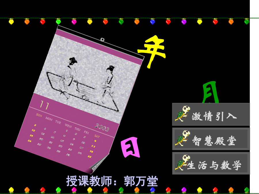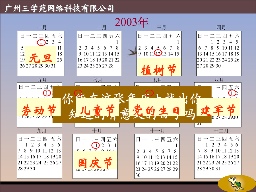 年1949年10月1日日一二三四五六12345678910111213141516171819202122232425262728293031观察你的年历卡,试着解答下面的问题。1、完成统计表观察你的年历卡,试着解答下面的问题。1、完成统计表一一、三、五、七、八、十、腊,判断对错:我的生日比教师节晚一天。填一填:一年有4个季度,每个季度3个月。第一季度包括1月、2月、3月。今年的第一季度有多少天?作业:今年5月31日是星期二,请你自制一个今年6月份的月历。1、年代:一个年代为十年,指连续的十年。可以被10整除的年份的相邻十年为一个年代。2、世纪:一个世纪是一百年,通常是指连续的一百年。世纪通常从可以被100整除的年代或此后一年开始,例如第一世纪从公元1年到公元100年,而20世纪则从公元1901年到公元2000年。谢谢指导!