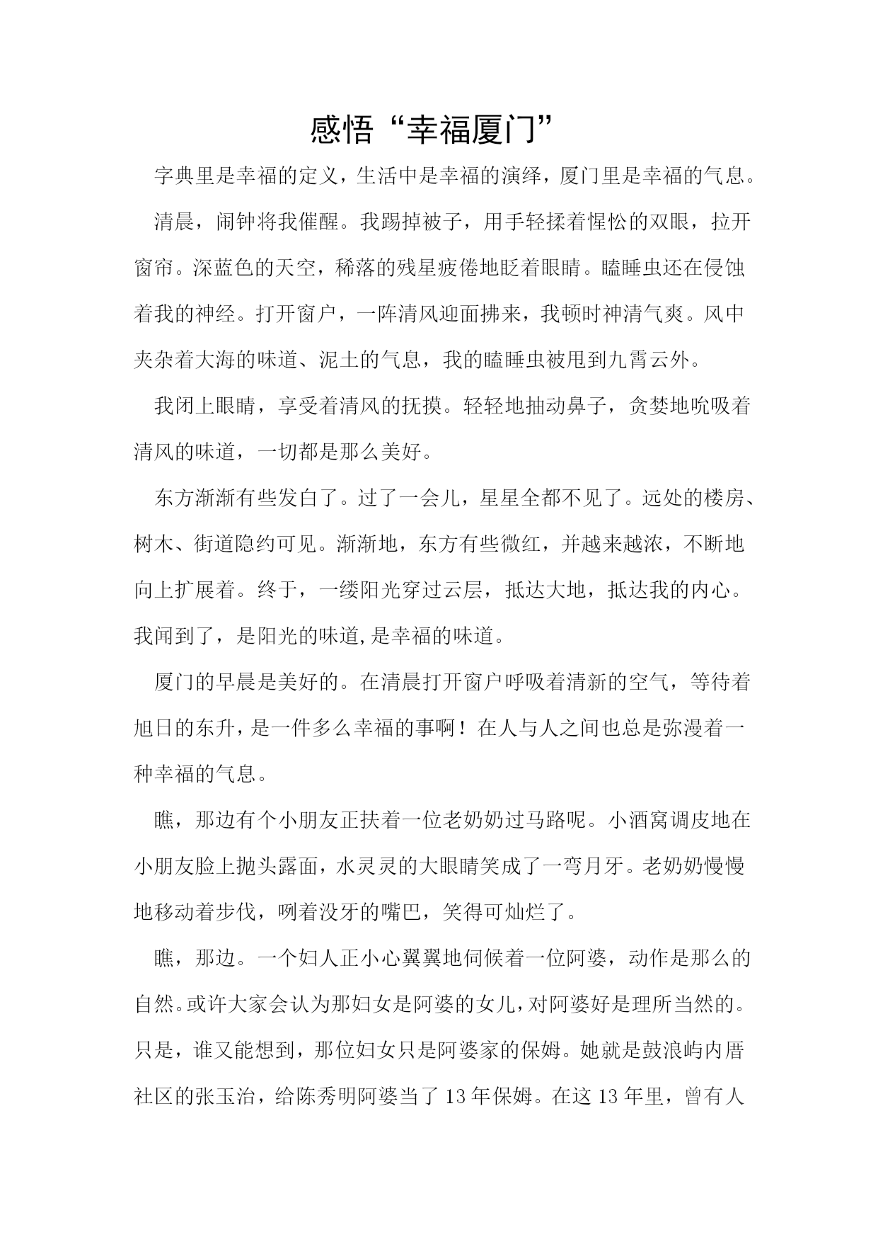 感悟“幸福厦门”字典里是幸福的定义,生活中是幸福的演绎,厦门里是幸福的气息。清晨,闹钟将我催醒。我踢掉被子,用手轻揉着惺忪的双眼,拉开窗帘。深蓝色的天空,稀落的残星疲倦地眨着眼睛。瞌睡虫还在侵蚀着我的神经。打开窗户,一阵清风迎面拂来,我顿时神清气爽。风中夹杂着大海的味道、泥土的气息,我的瞌睡虫被甩到九霄云外。我闭上眼睛,享受着清风的抚摸。轻轻地抽动鼻子,贪婪地吮吸着清风的味道,一切都是那么美好。东方渐渐有些发白了。过了一会儿,星星全都不见了。远处的楼房、树木、街道隐约可见。渐渐地,东方有些微红,并越来越浓,不断地向上扩展着。终于,一缕阳光穿过云层,抵达大地,抵达我的内心。我闻到了,是阳光的味道,是幸福的味道。厦门的早晨是美好的。在清晨打开窗户呼吸着清新的空气,等待着旭日的东升,是一件多么幸福的事啊!在人与人之间也总是弥漫着一种幸福的气息。瞧,那边有个小朋友正扶着一位老奶奶过马路呢。小酒窝调皮地在小朋友脸上抛头露面,水灵灵的大眼睛笑成了一弯月牙。老奶奶慢慢地移动着步伐,咧着没牙的嘴巴,笑得可灿烂了。瞧,那边。一个妇人正小心翼翼地伺候着一位阿婆,动作是那么的自然。或许大家会认为那妇女是阿婆的女儿,对阿婆好是理所当然的。只是,谁又能想到,那位妇女只是阿婆家的保姆。她就是鼓浪屿内厝社区的张玉治,给陈秀明阿婆当了13年保姆。在这13年里,曾有人开过3000元的薪水想挖走张玉治,但她拒绝了,依旧领着每月微薄的保姆工资,尽心地照顾陈阿婆。这是一份多么美丽的主仆情啊!有人问张玉治,为什么不向阿婆要求涨工资?张玉治摇摇头说:“老人信赖我,要是住我隔壁,没钱我都会照顾她。”在厦门,不仅有着张玉治这种可以尽心尽力照顾老人家的人,还有着王兵那样不顾危险追击歹徒的勇士,还有……厦门,可真谓是一个充满人情味、正义感的地方啊!生活在厦门的我们是幸福的。犹记得,曾经我独自出门游玩。回家时,匆匆忙忙上了一辆公交车,上车之后才发现自己口袋早已没有了零钱交车费。于是,我小心的碰了碰身边的一位大姐姐:“小姐,我能跟你兑换一下零钱吗?”大姐姐像是明白我的难处一样,不假思索地拿出车卡,帮我付了车费。我向她投去感激的目光,欲将钱还她。只见她对我微微笑,推回了我伸出去的手。那一刻,幸福在我心中蔓延。我是一个土生土长的厦门人,身在厦门,我感到幸福无比。厦门是一个美丽而迷人的海岛城市,不管是人与人之间的互助,人与人之间的和谐,亦或是厦门美好的环境都会让幸福油然心生。幸福,就像一条源远流长的河,贯穿着整个厦门。无论何时,你总是可以在厦门望见幸福的身影,触到幸福的尾巴,发现幸福的脚印,听到幸福那银铃般的笑声。终于,我明白了,幸福就在厦门的寸寸土地里。