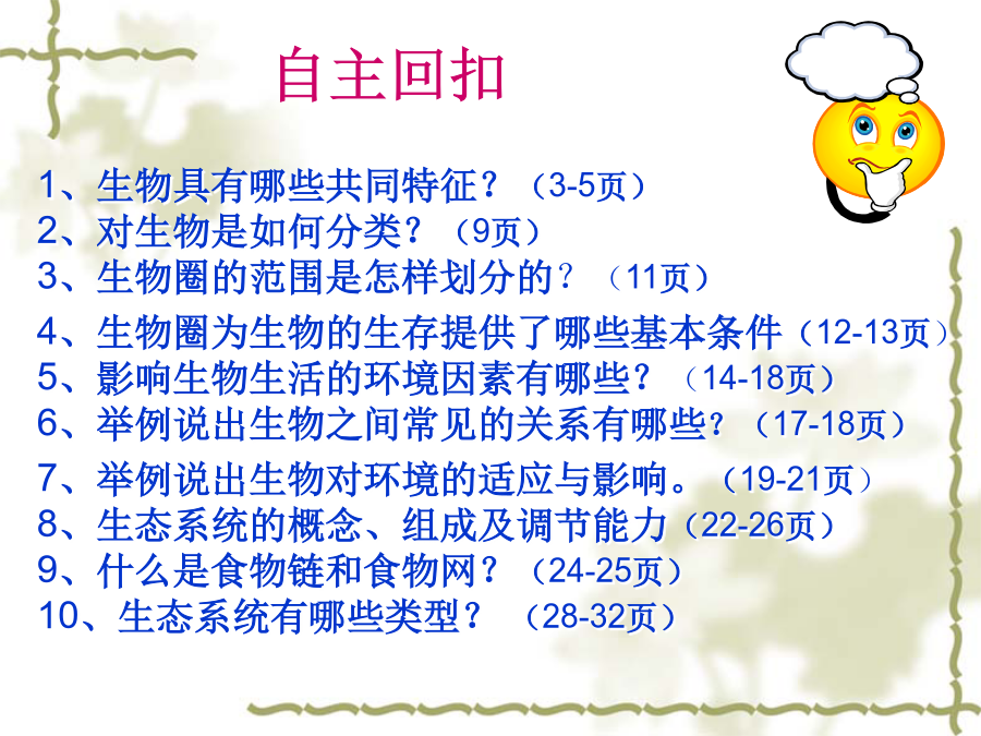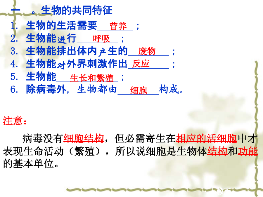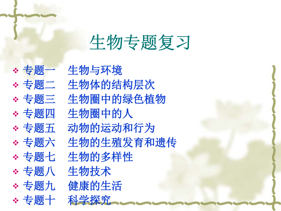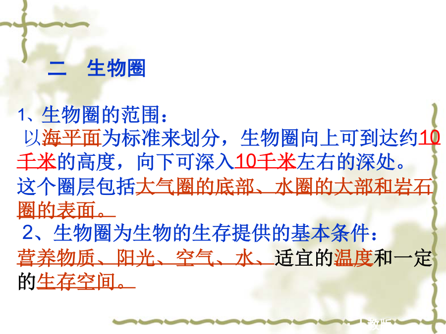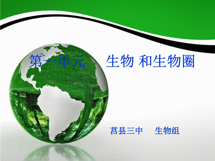 第一单元生物和生物圈生物专题复习1、生物具有哪些共同特征?(3-5页)2、对生物是如何分类?(9页)3、生物圈的范围是怎样划分的?(11页)·人教版·人教版生物·人教版·人教版·人教版1[2011·聊城]下列能构成一个生态系统的是()A.东昌湖及湖内的所有生物B.冠县万亩梨园内的全部梨树C.植物园内的所有荷花D.聊城动物园内的所有植物和动物5[2011·福州]“螳螂捕蝉,黄雀在后”对该食物链表述正确的是()A.蝉→螳螂→黄雀B.蝉←螳螂←黄雀C.树→蝉→螳螂→黄雀D.树←蝉←螳螂←黄雀生物·人教版2。(2011·广东)在天然的草原生态系统中,狼由于某种疾病而大量死亡,下列最符合较长时间内鹿群数量变化的曲线是()6.(2011·南通)右图是某生态系统中的食物网简图,图中A-F分别表示不同种类的生物。请据图回答:7.(2011·莱芜)今年4月,我市雪野旅游区发生山林大火,大量树木、杂草被毁,林间生活的松毛虫、食虫鸟、猫头鹰、鼠、蛇、野兔等死伤无数。雪野旅游区森林生态系统的恢复重建工作任重道远。(1)雪野旅游区森林生态系统由和两部分构成。(2)树木和杂草等绿色植物通过作用固定太阳能。松毛虫、食虫鸟等动物属于该森林生态系统的。请写出该生态系统中一条由四种生物构成的食物链:。(3)树木燃烧后的灰烬能为绿色植物的生长提供;生态系统中的也可将动植物遗体中的有机物转变为无机物,归还无机环境。