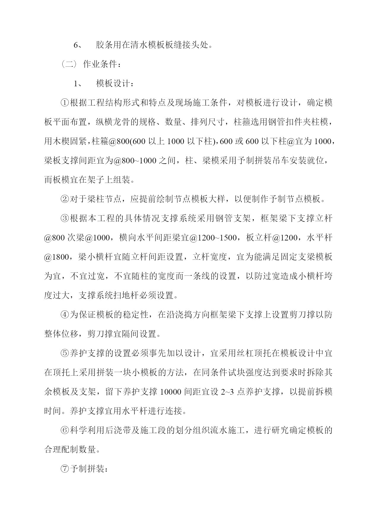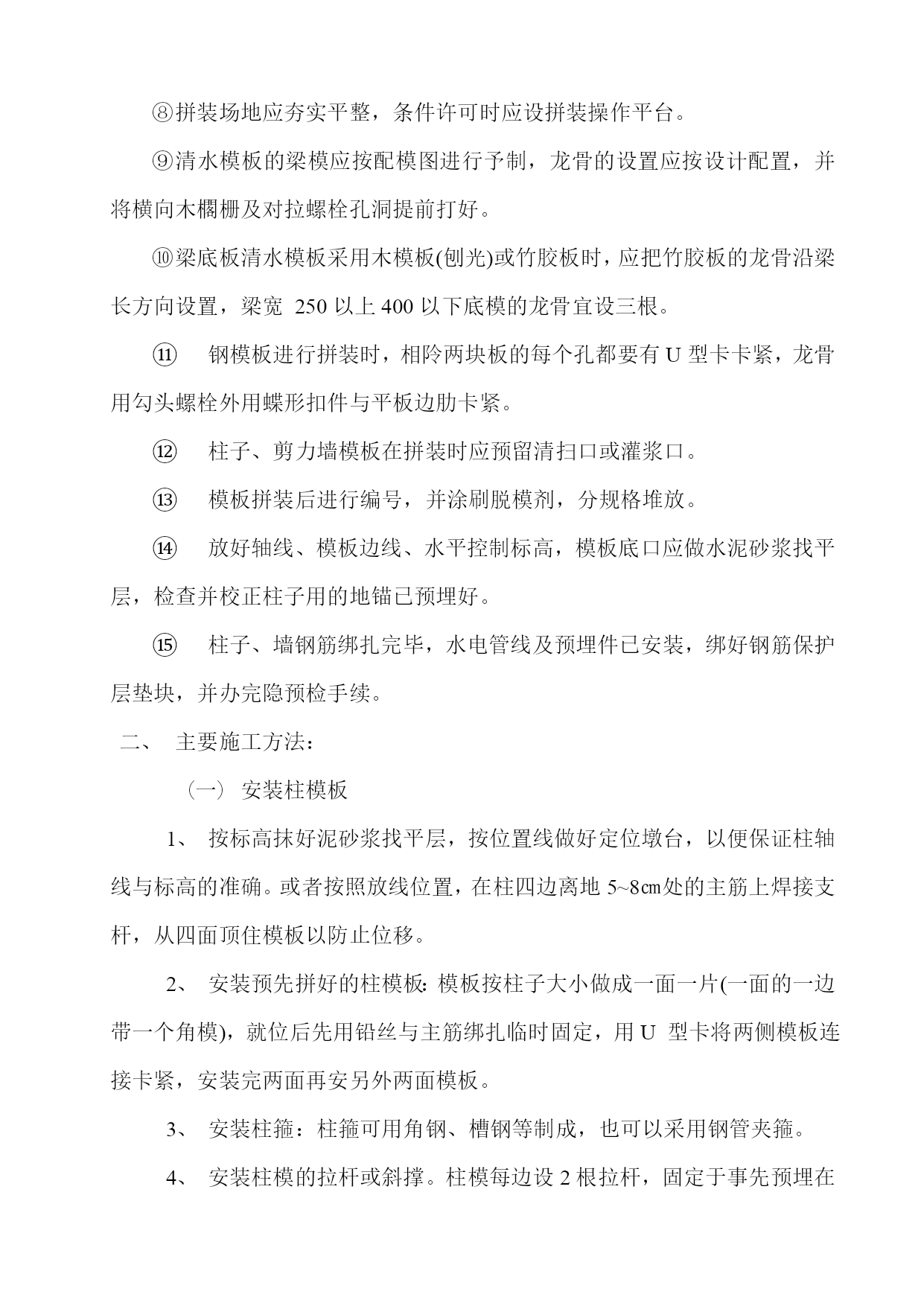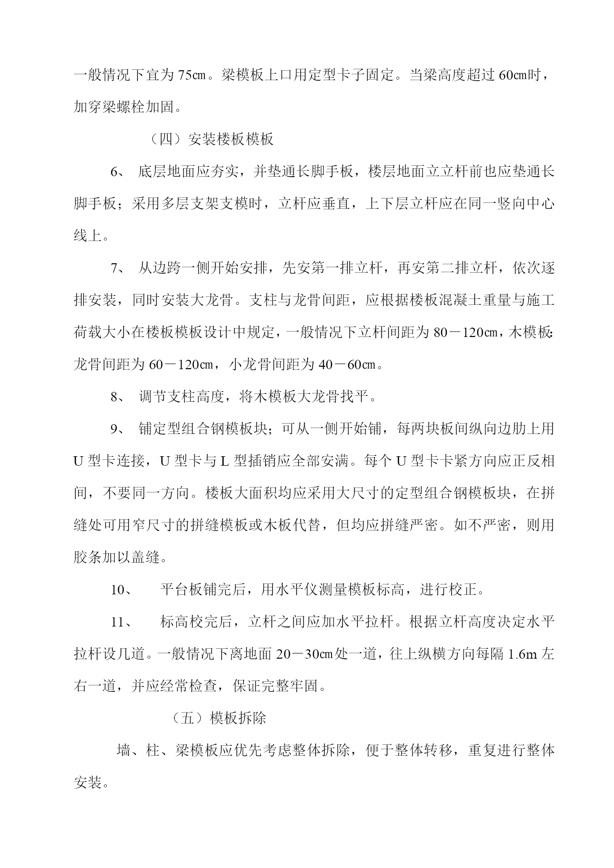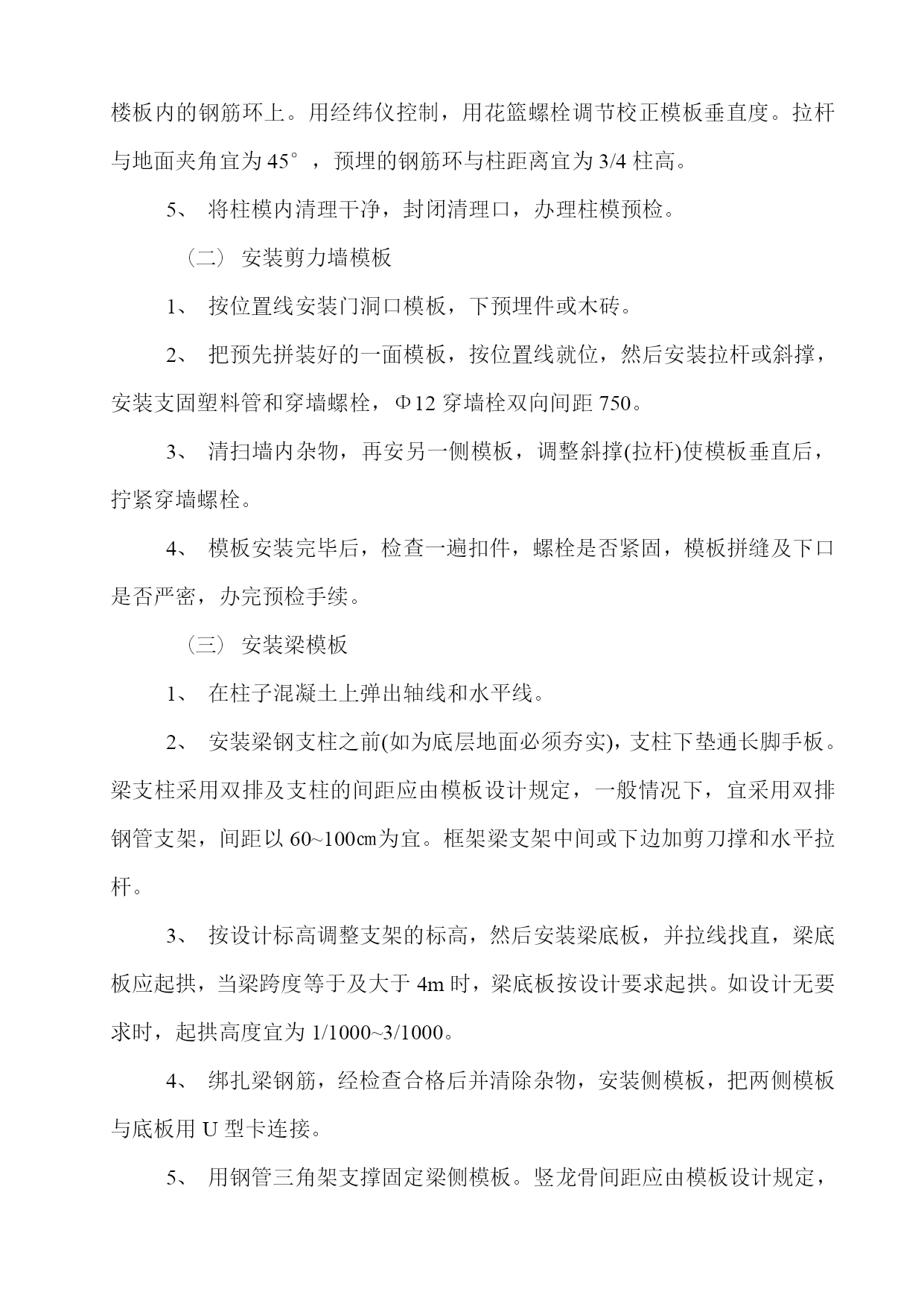 技术交底建设单位:单位工程:分项工程:施工单位:陕西省第五建筑工程公司工长:班组长:交底时间:年月日交底内容:模板工程本工程柱模采用组合钢模,梁板:凡无吊顶的梁板采用清水模板,梁板均使用镜面竹胶板,后背50×80木櫊栅,梁高≥700,梁侧模采用对拉螺栓,加固梁侧模,有吊顶的梁板采用组合钢模板,支撑系统采用钢管架子,地下室剪力墙采用60系列钢模板加对拉螺栓。施工准备:材料:定型组合钢模板块及钢模板其它配件。12厚腹膜竹胶板。50×80木櫊栅。Φ48架管。经设计所选用的Φ14对拉螺栓。胶条用在清水模板板缝接头处。作业条件:模板设计:根据工程结构形式和特点及现场施工条件,对模板进行设计,确定模板平面布置,纵横龙骨的规格、数量、排列尺寸,柱箍选用钢管扣件夹柱模,用木楔固紧,柱篐@800(600以上1000以下柱),600或600以下柱@宜为1000,梁板支撑间距宜为@800~1000之间,柱、梁模采用予制拼装吊车安装就位,而板模宜在架子上组装。对于梁柱节点,应提前绘制节点模板大样,以便制作予制节点模板。根据本工程的具体情况支撑系统采用钢管支架,框架梁下支撑立杆@800次梁@1000,横向水平间距梁宜@1200~1500,板立杆@1200,水平杆@1800,梁小横杆宜随立杆间距设置,立杆宽度,宜为能满足固定支梁模板为宜,不宜过宽,不宜随柱的宽度而一条线的设置,以防过宽造成小横杆垮度过大,支撑系统扫地杆必须设置。为保证模板的稳定性,在沿浇捣方向框架梁下支撑上设置剪刀撑以防整体位移,剪刀撑宜隔间设置。养护支撑的设置必须事先加以设计,宜采用丝杠顶托在模板设计中宜在顶托上采用拼装一块小模板的方法,在同条件试块强度达到要求时拆除其余模板及支架,留下养护支撑10000间距宜设2~3点养护支撑,以提前拆模时间。养护支撑宜用水平杆进行连接。科学利用后浇带及施工段的划分组织流水施工,进行研究确定模板的合理配制数量。予制拼装:拼装场地应夯实平整,条件许可时应设拼装操作平台。清水模板的梁模应按配模图进行予制,龙骨的设置应按设计配置,并将横向木櫊栅及对拉螺栓孔洞提前打好。梁底板清水模板采用木模板(刨光)或竹胶板时,应把竹胶板的龙骨沿梁长方向设置,梁宽250以上400以下底模的龙骨宜设三根。钢模板进行拼装时,相阾两块板的每个孔都要有U型卡卡紧,龙骨用勾头螺栓外用蝶形扣件与平板边肋卡紧。柱子、剪力墙模板在拼装时应预留清扫口或灌浆口。模板拼装后进行编号,并涂刷脱模剂,分规格堆放。放好轴线、模板边线、水平控制标高,模板底口应做水泥砂浆找平层,检查并校正柱子用的地锚已预埋好。柱子、墙钢筋绑扎完毕,水电管线及预埋件已安装,绑好钢筋保护层垫块,并办完隐预检手续。主要施工方法:安装柱模板按标高抹好泥砂浆找平层,按位置线做好定位墩台,以便保证柱轴线与标高的准确。或者按照放线位置,在柱四边离地5~8㎝处的主筋上焊接支杆,从四面顶住模板以防止位移。安装预先拼好的柱模板:模板按柱子大小做成一面一片(一面的一边带一个角模),就位后先用铅丝与主筋绑扎临时固定,用U型卡将两侧模板连接卡紧,安装完两面再安另外两面模板。安装柱箍:柱箍可用角钢、槽钢等制成,也可以采用钢管夹箍。安装柱模的拉杆或斜撑。柱模每边设2根拉杆,固定于事先预埋在楼板内的钢筋环上。用经纬仪控制,用花篮螺栓调节校正模板垂直度。拉杆与地面夹角宜为45°,预埋的钢筋环与柱距离宜为3/4柱高。将柱模内清理干净,封闭清理口,办理柱模预检。安装剪力墙模板按位置线安装门洞口模板,下预埋件或木砖。把预先拼装好的一面模板,按位置线就位,然后安装拉杆或斜撑,安装支固塑料管和穿墙螺栓,Φ12穿墙栓双向间距750。清扫墙内杂物,再安另一侧模板,调整斜撑(拉杆)使模板垂直后,拧紧穿墙螺栓。模板安装完毕后,检查一遍扣件,螺栓是否紧固,模板拼缝及下口是否严密,办完预检手续。安装梁模板在柱子混凝土上弹出轴线和水平线。安装梁钢支柱之前(如为底层地面必须夯实),支柱下垫通长脚手板。梁支柱采用双排及支柱的间距应由模板设计规定,一般情况下,宜采用双排钢管支架,间距以60~100㎝为宜。框架梁支架中间或下边加剪刀撑和水平拉杆。按设计标高调整支架的标高,然后安装梁底板,并拉线找直,梁底板应起拱,当梁跨度等于及大于4m时,梁底板按设计要求起拱。如设计无要求时,起拱高度宜为1/1000~3/1000。绑扎梁钢筋,经检查合格后并清除杂物,安装侧模板,把两侧模板与底板用U型卡连接。用钢管三角架支撑固定梁侧模板。竖龙骨间距应由模板设计规定,一般情况下宜为75㎝。梁模板上口用定型卡子固定。当梁高度超过60㎝时,加穿梁螺栓加固。(四)安装楼板模板底层地面应夯实,并垫通长脚手板,楼层地面立立杆前也应垫通长脚手板;采用多层支架支模时,立杆应垂直,上下层立杆应在同一竖向中心线上。从边跨一