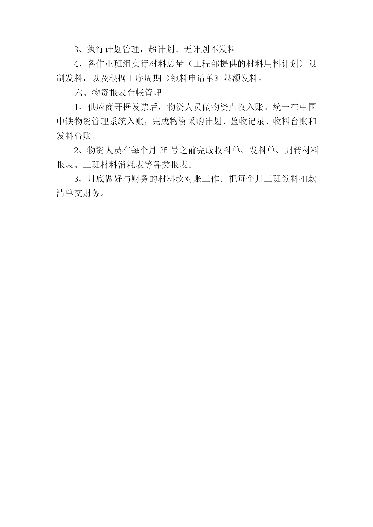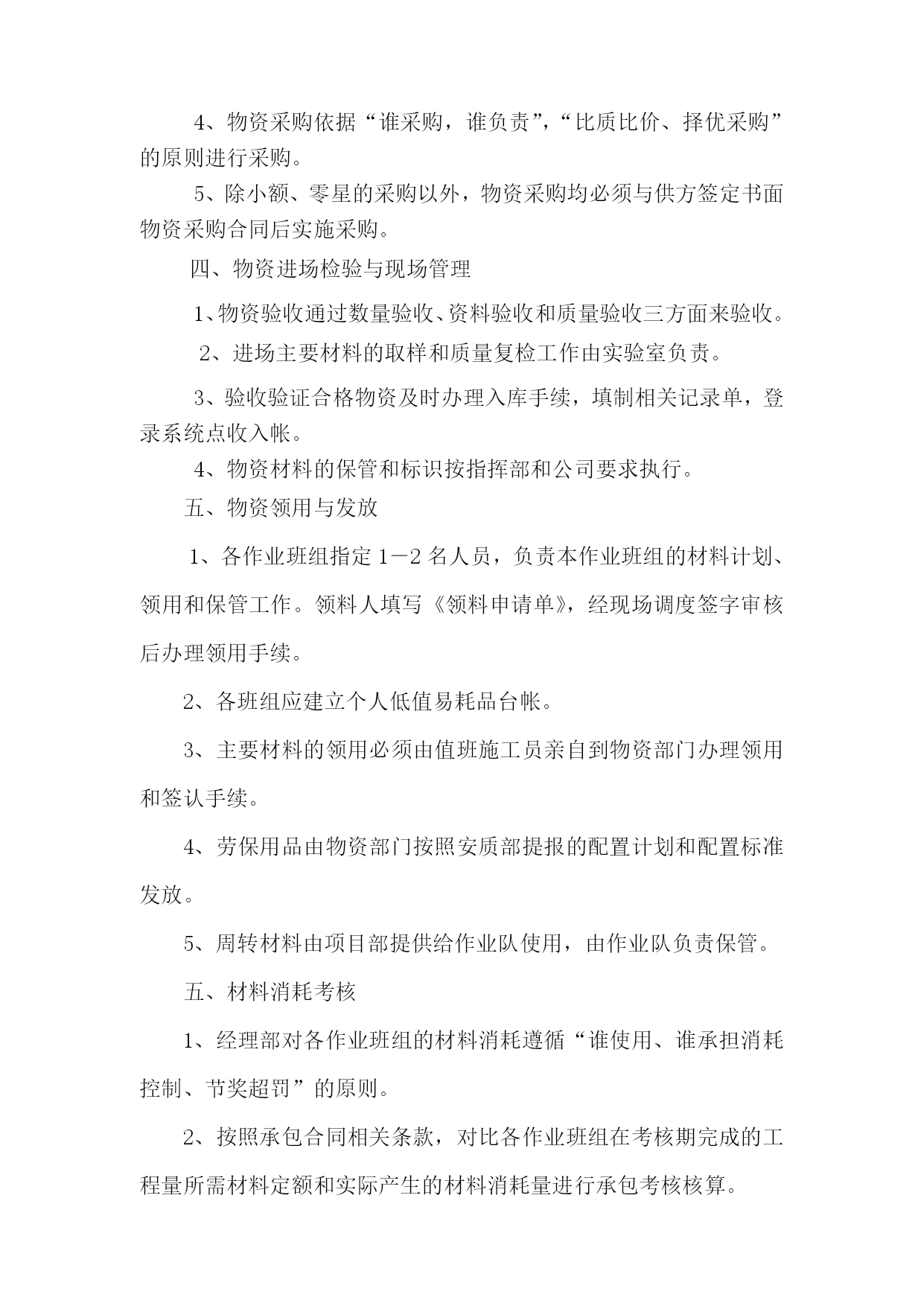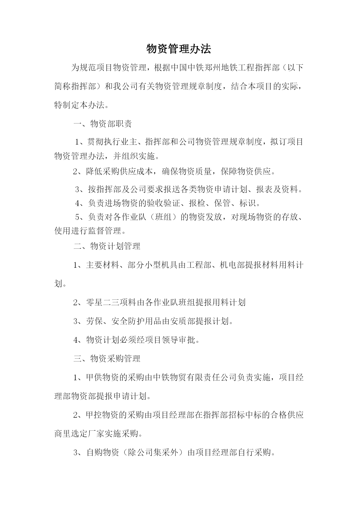 物资管理办法为规范项目物资管理,根据中国中铁郑州地铁工程指挥部(以下简称指挥部)和我公司有关物资管理规章制度,结合本项目的实际,特制定本办法。一、物资部职责1、贯彻执行业主、指挥部和公司物资管理规章制度,拟订项目物资管理办法,并组织实施。2、降低采购供应成本,确保物资质量,保障物资供应。3、按指挥部及公司要求报送各类物资申请计划、报表及资料。4、负责进场物资的验收验证、报检、保管、标识。5、负责对各作业队(班组)的物资发放,对现场物资的存放、使用进行监督管理。二、物资计划管理1、主要材料、部分小型机具由工程部、机电部提报材料用料计划。2、零星二三项料由各作业队班组提报用料计划3、劳保、安全防护用品由安质部提报计划。4、物资计划必须经项目领导审批。三、物资采购管理1、甲供物资的采购由中铁物贸有限责任公司负责实施,项目经理部物资部提报申请计划。2、甲控物资的采购由项目经理部在指挥部招标中标的合格供应商里选定厂家实施采购。3、自购物资(除公司集采外)由项目经理部自行采购。4、物资采购依据“谁采购,谁负责”,“比质比价、择优采购”的原则进行采购。5、除小额、零星的采购以外,物资采购均必须与供方签定书面物资采购合同后实施采购。四、物资进场检验与现场管理1、物资验收通过数量验收、资料验收和质量验收三方面来验收。2、进场主要材料的取样和质量复检工作由实验室负责。3、验收验证合格物资及时办理入库手续,填制相关记录单,登录系统点收入帐。4、物资材料的保管和标识按指挥部和公司要求执行。五、物资领用与发放1、各作业班组指定1-2名人员,负责本作业班组的材料计划、领用和保管工作。领料人填写《领料申请单》,经现场调度签字审核后办理领用手续。2、各班组应建立个人低值易耗品台帐。3、主要材料的领用必须由值班施工员亲自到物资部门办理领用和签认手续。4、劳保用品由物资部门按照安质部提报的配置计划和配置标准发放。5、周转材料由项目部提供给作业队使用,由作业队负责保管。五、材料消耗考核1、经理部对各作业班组的材料消耗遵循“谁使用、谁承担消耗控制、节奖超罚”的原则。2、按照承包合同相关条款,对比各作业班组在考核期完成的工程量所需材料定额和实际产生的材料消耗量进行承包考核核算。3、执行计划管理,超计划、无计划不发料4、各作业班组实行材料总量(工程部提供的材料用料计划)限制发料,以及根据工序周期《领料申请单》限额发料。六、物资报表台帐管理1、供应商开据发票后,物资人员做物资点收入账。统一在中国中铁物资管理系统入账,完成物资采购计划、验收记录、收料台账和发料台账。2、物资人员在每个月25号之前完成收料单、发料单、周转材料报表、工班材料消耗表等各类报表。3、月底做好与财务的材料款对账工作。把每个月工班领料扣款清单交财务。