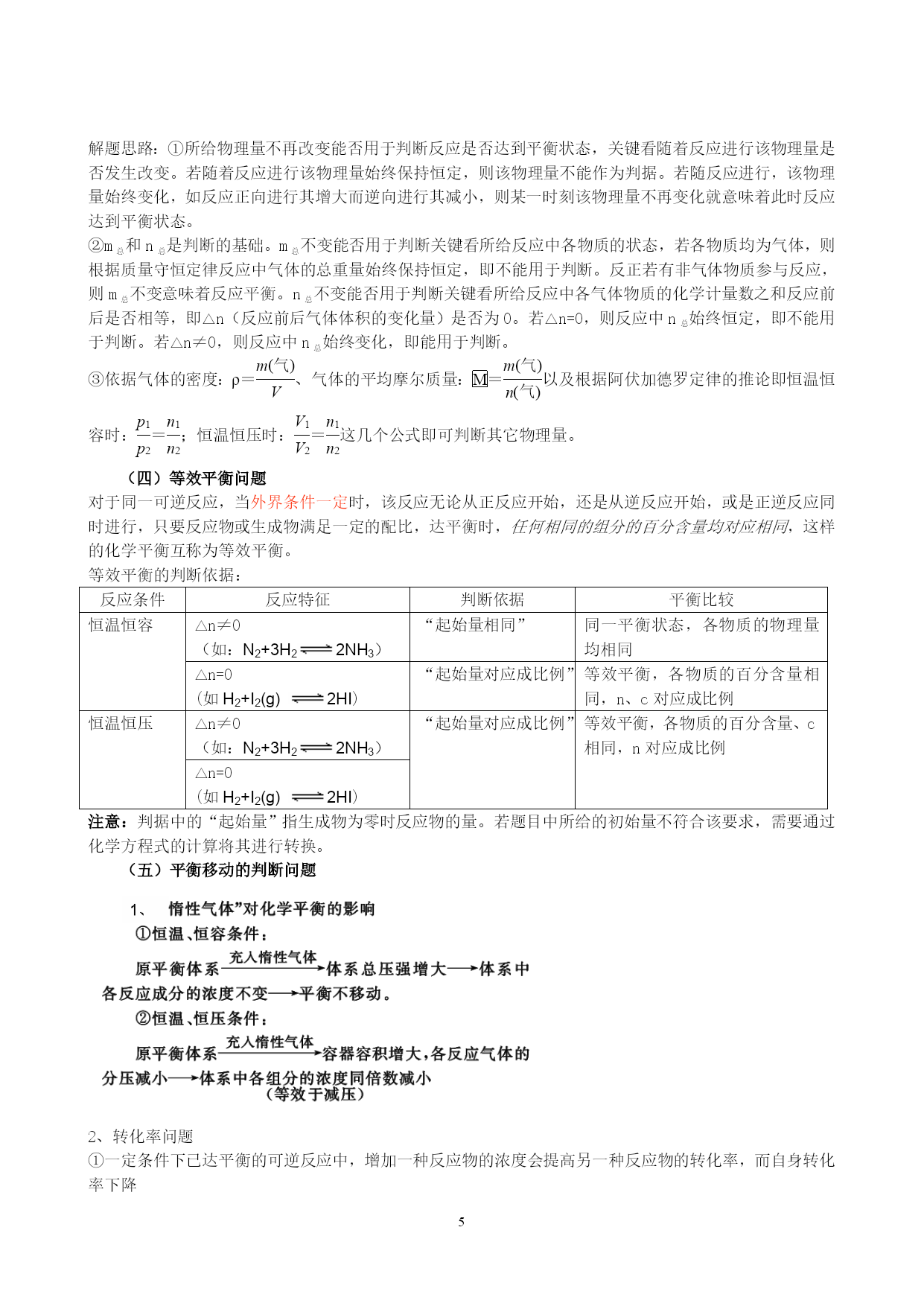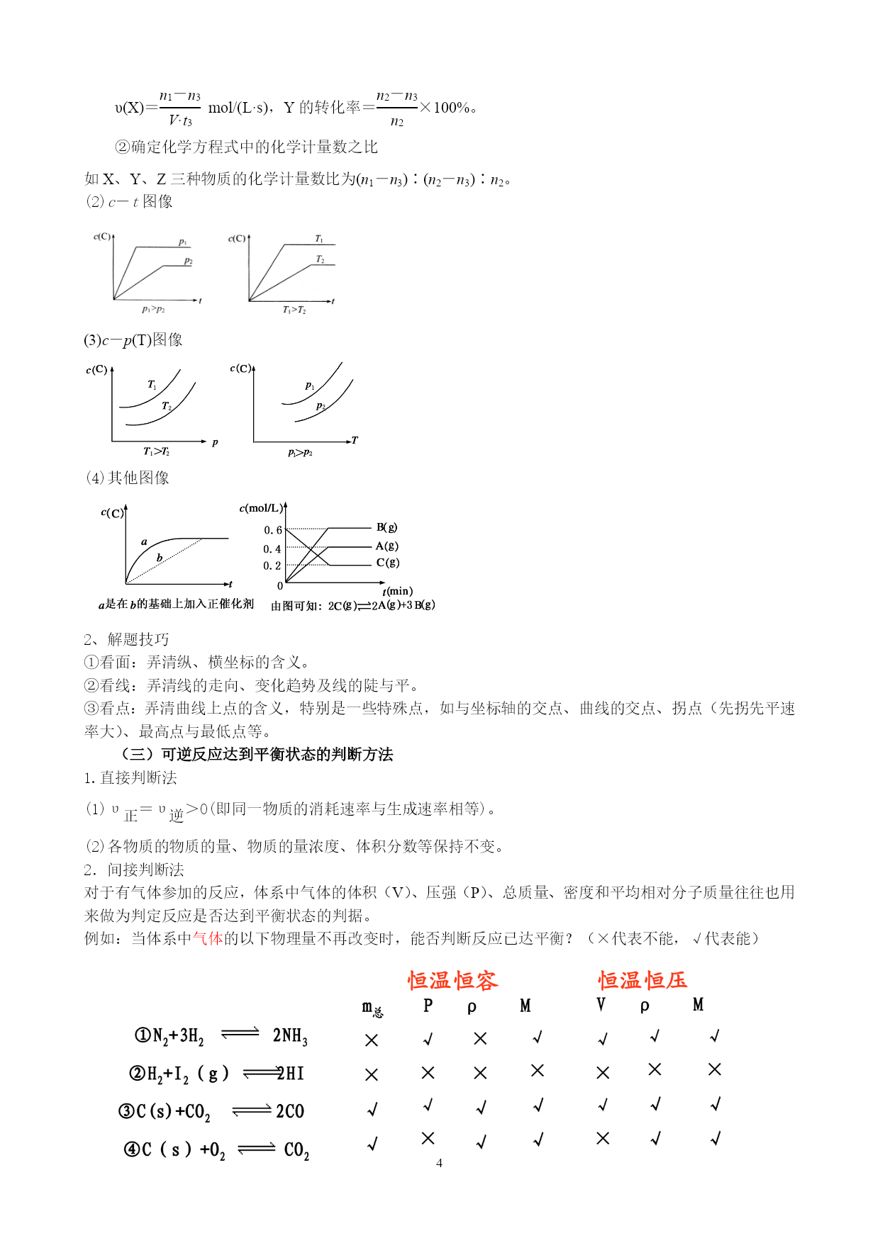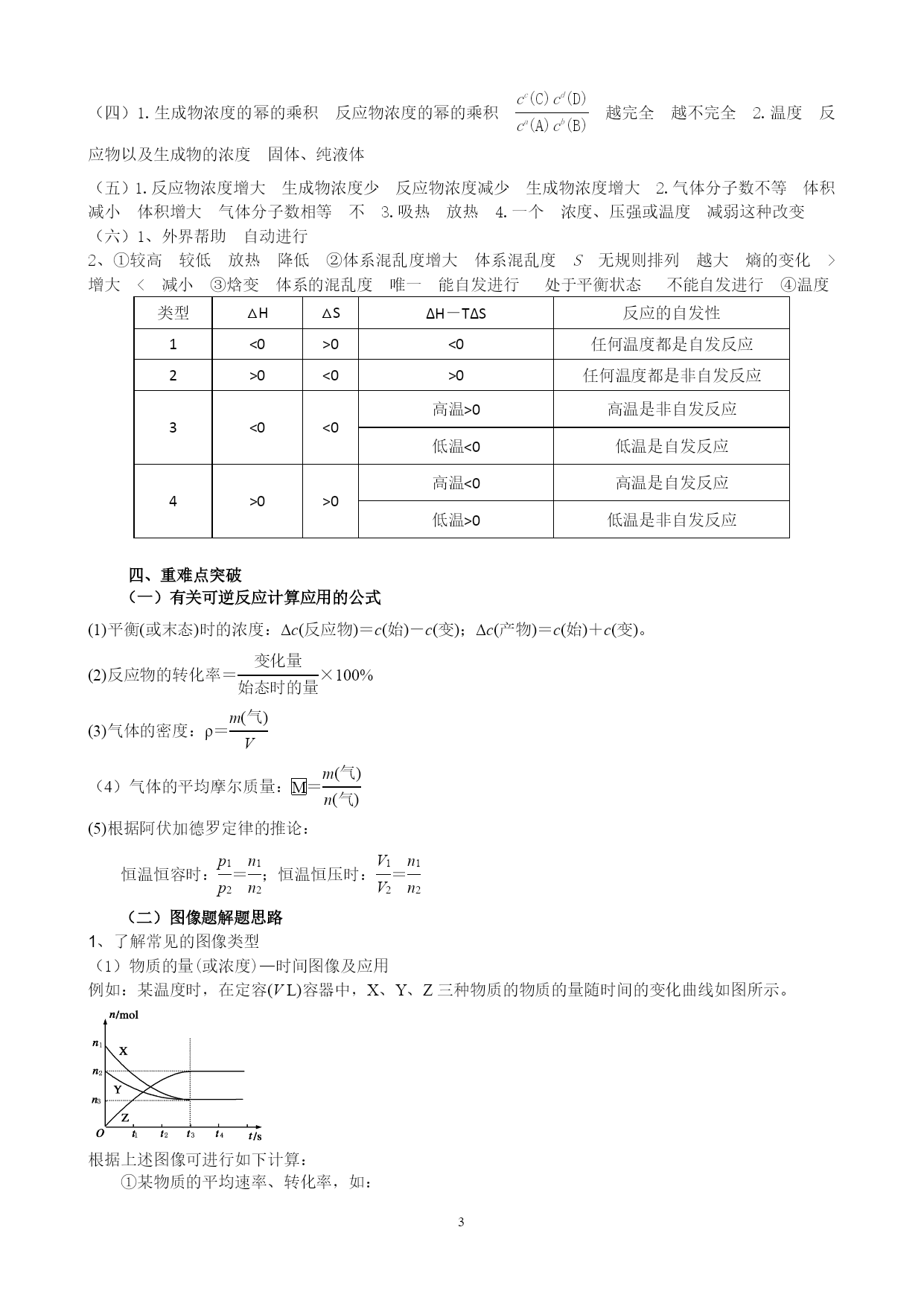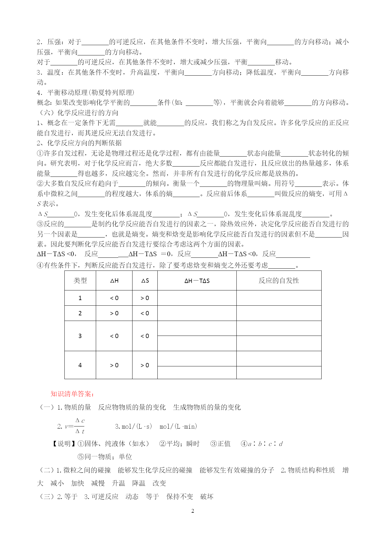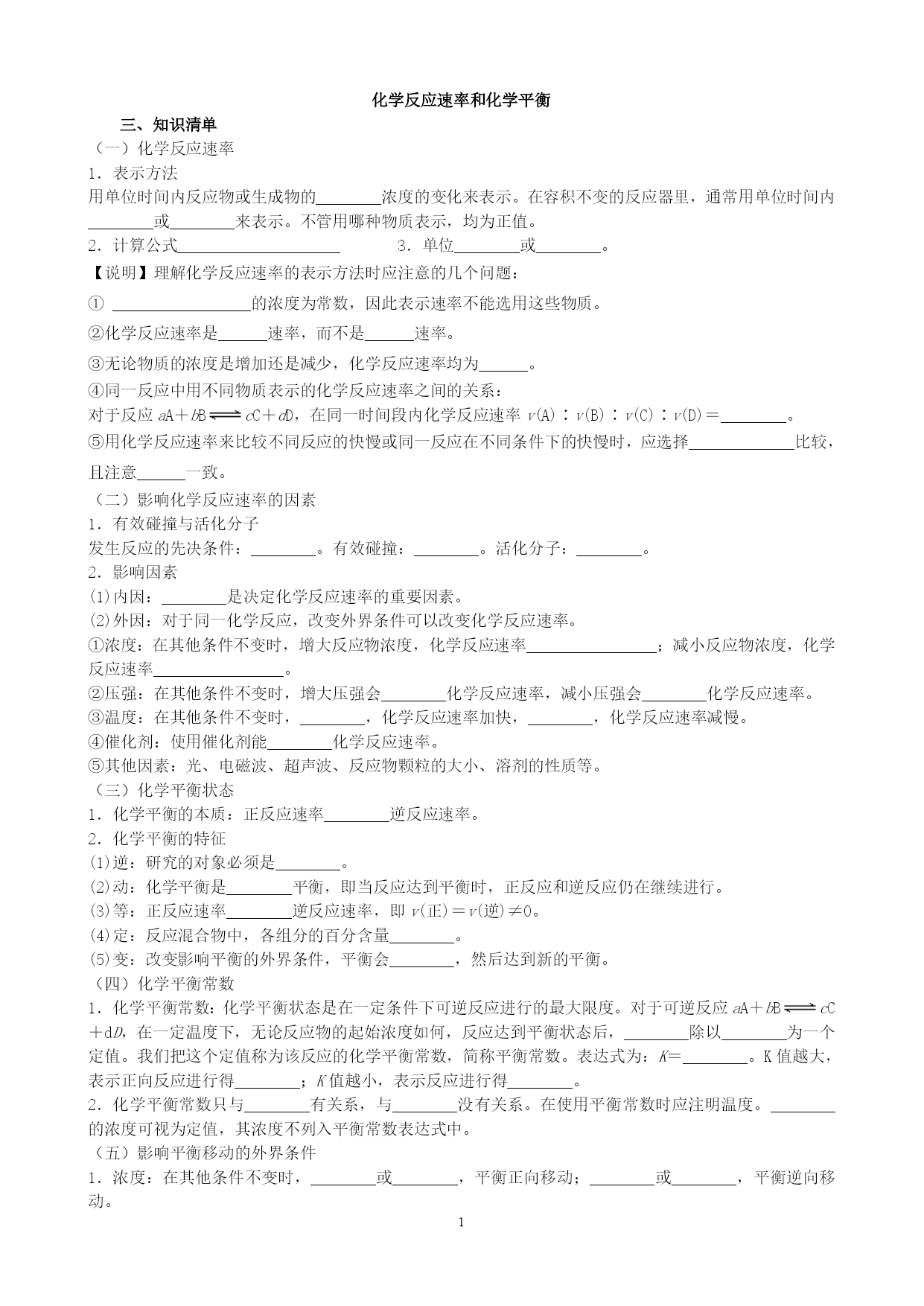 化学反应速率和化学平衡三、知识清单(一)化学反应速率1.表示方法用单位时间内反应物或生成物的________浓度的变化来表示。在容积不变的反应器里,通常用单位时间内________或________来表示。不管用哪种物质表示,均为正值。2.计算公式____________________3.单位________或________。【说明】理解化学反应速率的表示方法时应注意的几个问题:①_________________的浓度为常数,因此表示速率不能选用这些物质。②化学反应速率是______速率,而不是______速率。③无论物质的浓度是增加还是减少,化学反应速率均为______。④同一反应中用不同物质表示的化学反应速率之间的关系:对于反应aA+bBcC+dD,在同一时间段内化学反应速率v(A)∶v(B)∶v(C)∶v(D)=________。⑤用化学反应速率来比较不同反应的快慢或同一反应在不同条件下的快慢时,应选择_____________比较,且注意______一致。(二)影响化学反应速率的因素1.有效碰撞与活化分子发生反应的先决条件:________。有效碰撞:________。活化分子:________。2.影响因素(1)内因:________是决定化学反应速率的重要因素。(2)外因:对于同一化学反应,改变外界条件可以改变化学反应速率。①浓度:在其他条件不变时,增大反应物浓度,化学反应速率________________;减小反应物浓度,化学反应速率________________。②压强:在其他条件不变时,增大压强会________化学反应速率,减小压强会________化学反应速率。③温度:在其他条件不变时,________,化学反应速率加快,________,化学反应速率减慢。④催化剂:使用催化剂能________化学反应速率。⑤其他因素:光、电磁波、超声波、反应物颗粒的大小、溶剂的性质等。(三)化学平衡状态1.化学平衡的本质:正反应速率________逆反应速率。2.化学平衡的特征(1)逆:研究的对象必须是________。(2)动:化学平衡是________平衡,即当反应达到平衡时,正反应和逆反应仍在继续进行。(3)等:正反应速率________逆反应速率,即v(正)=v(逆)≠0。(4)定:反应混合物中,各组分的百分含量________。(5)变:改变影响平衡的外界条件,平衡会________,然后达到新的平衡。(四)化学平衡常数1.化学平衡常数:化学平衡状态是在一定条件下可逆反应进行的最大限度。对于可逆反应aA+bBcC+dD,在一定温度下,无论反应物的起始浓度如何,反应达到平衡状态后,________除以________为一个定值。我们把这个定值称为该反应的化学平衡常数,简称平衡常数。表达式为:K=________。K值越大,表示正向反应进行得________;K值越小,表示反应进行得________。2.化学平衡常数只与________有关系,与________没有关系。在使用平衡常数时应注明温度。________的浓度可视为定值,其浓度不列入平衡常数表达式中。(五)影响平衡移动的外界条件1.浓度:在其他条件不变时,________或________,平衡正向移动;________或________,平衡逆向移动。2.压强:对于________的可逆反应,在其他条件不变时,增大压强,平衡向________的方向移动;减小压强,平衡向________的方向移动。对于________的可逆反应,在其他条件不变时,增大或减少压强,平衡________移动。3.温度:在其他条件不变时,升高温度,平衡向________方向移动;降低温度,平衡向________方向移动。4.平衡移动原理(勒夏特列原理)概念:如果改变影响化学平衡的________条件(如:________等),平衡就会向着能够________的方向移动。(六)化学反应进行的方向1、概念在一定条件下无需________就能________的反应,我们称之为自发反应。许多化学反应的正反应能自发进行,而其逆反应无法自发进行。2、化学反应方向的判断依据①许多自发过程,无论是物理过程还是化学过程,都有由能量________状态向能量________状态转化的倾向。研究表明,对于化学反应而言,绝大多数________反应都能自发进行,且反应放出的热量越多,体系能量________得也越多,反应越完全。然而,并非所有自发进行的化学反应都是放热的。②大多数自发反应有趋向于________的倾向。衡量一个________的物理量叫熵。用符号________表示。体系中微粒之间________的程度越大,体系的熵________。反应前