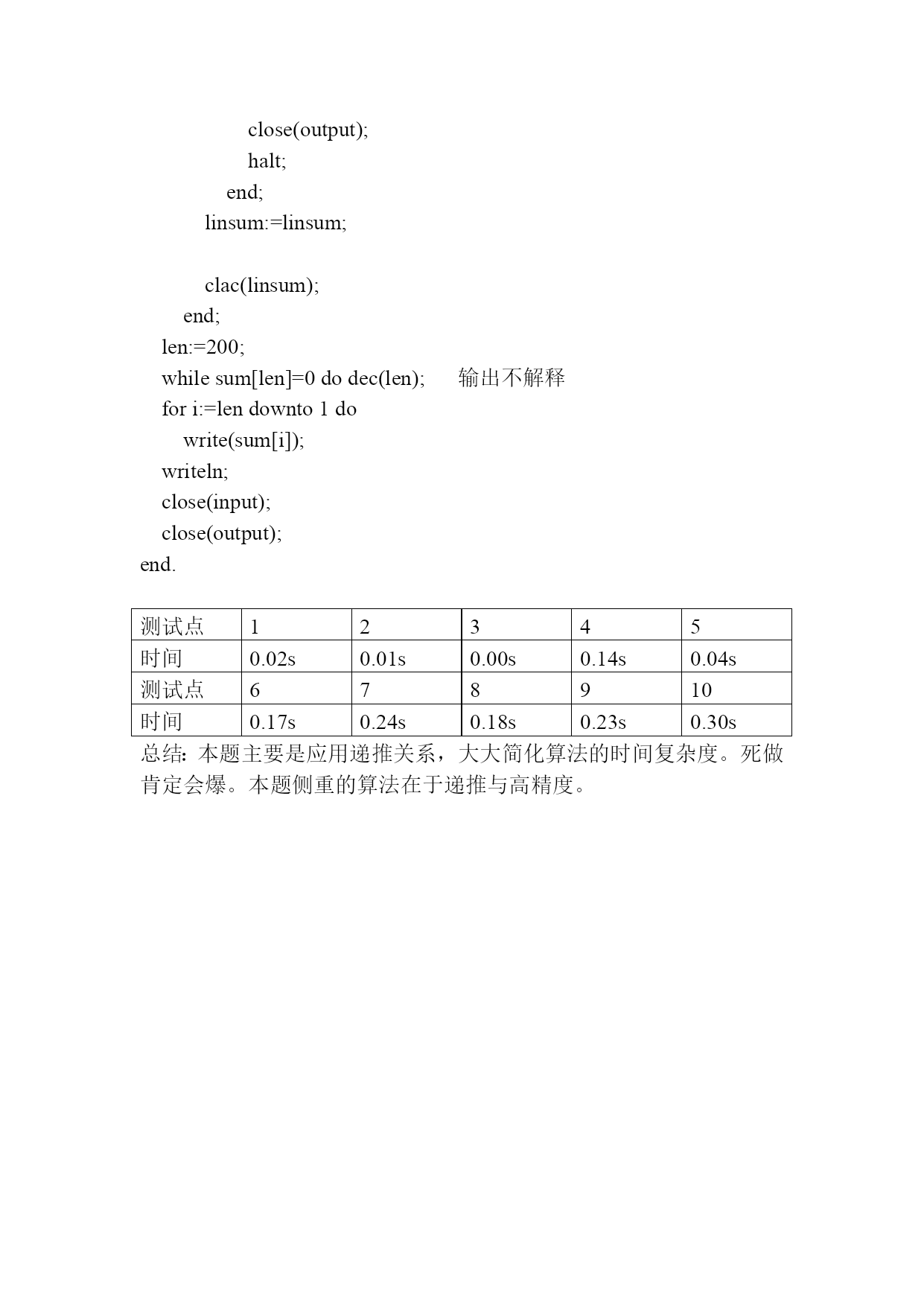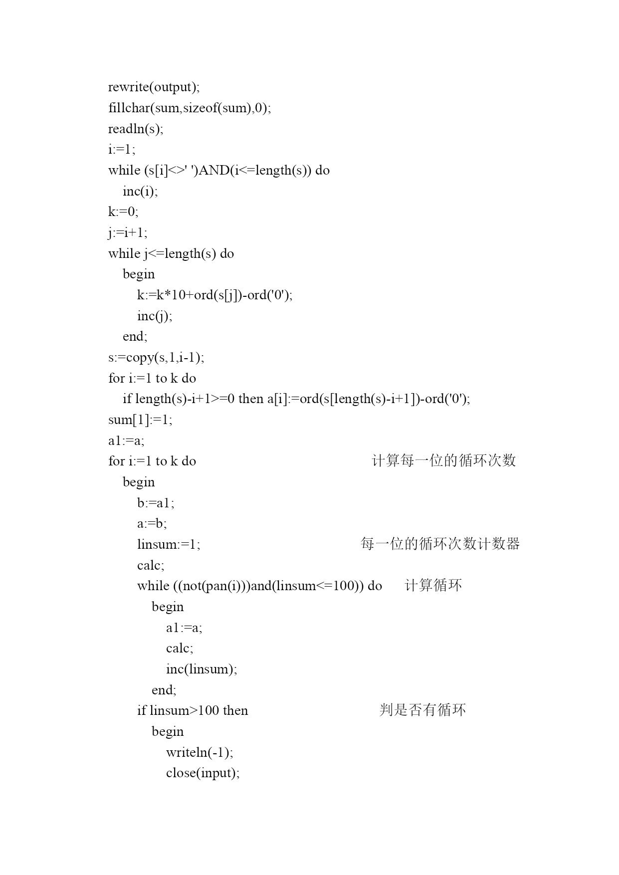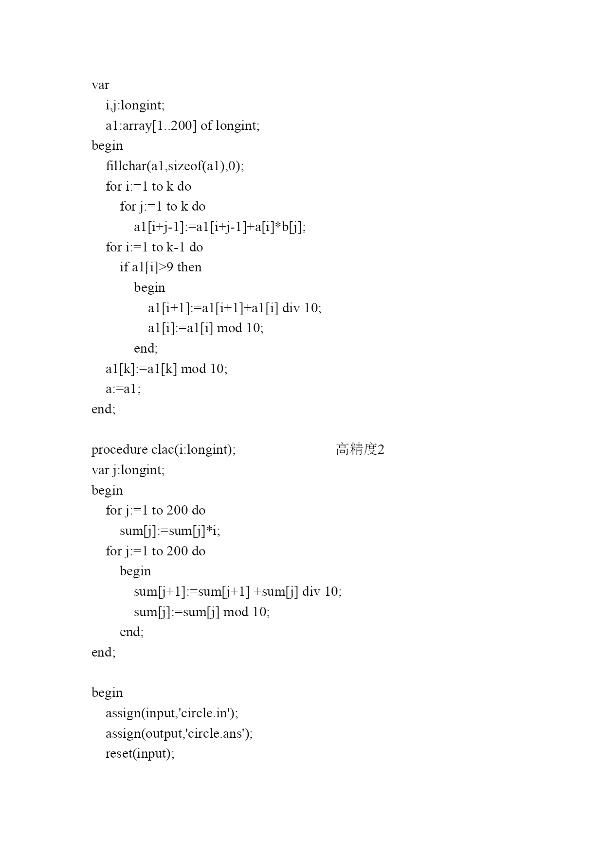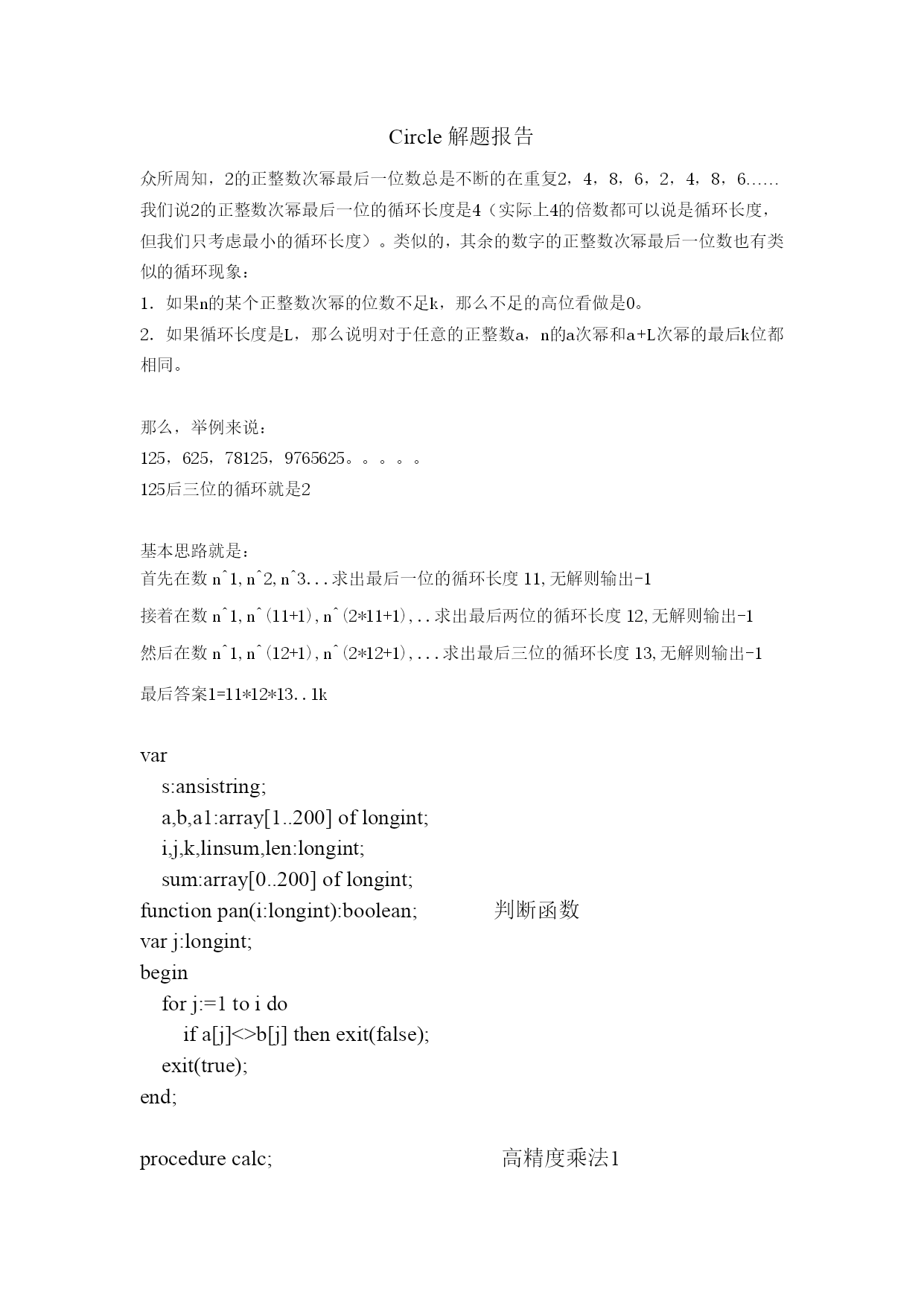 Circle解题报告 众所周知,2的正整数次幂最后一位数总是不断的在重复2,4,8,6,2,4,8,6……我们说2的正整数次幂最后一位的循环长度是4(实际上4的倍数都可以说是循环长度,但我们只考虑最小的循环长度)。类似的,其余的数字的正整数次幂最后一位数也有类似的循环现象: 1.如果n的某个正整数次幂的位数不足k,那么不足的高位看做是0。 2.如果循环长度是L,那么说明对于任意的正整数a,n的a次幂和a+L次幂的最后k位都相同。 那么,举例来说: 125,625,78125,9765625。。。。。 125后三位的循环就是2 基本思路就是: 首先在数n^1,n^2,n^3...求出最后一位的循环长度l1,无解则输出-1 接着在数n^1,n^(l1+1),n^(2*l1+1),..求出最后两位的循环长度l2,无解则输出-1 然后在数n^1,n^(l2+1),n^(2*l2+1),...求出最后三位的循环长度l3,无解则输出-1 最后答案l=l1*l2*l3..lk var s:ansistring; a,b,a1:array[1..200]oflongint; i,j,k,linsum,len:longint; sum:array[0..200]oflongint; functionpan(i:longint):boolean;判断函数 varj:longint; begin forj:=1toido ifa[j]<>b[j]thenexit(false); exit(true); end; procedurecalc;高精度乘法1 var i,j:longint; a1:array[1..200]oflongint; begin fillchar(a1,sizeof(a1),0); fori:=1tokdo forj:=1tokdo a1[i+j-1]:=a1[i+j-1]+a[i]*b[j]; fori:=1tok-1do ifa1[i]>9then begin a1[i+1]:=a1[i+1]+a1[i]div10; a1[i]:=a1[i]mod10; end; a1[k]:=a1[k]mod10; a:=a1; end; procedureclac(i:longint);高精度2 varj:longint; begin forj:=1to200do sum[j]:=sum[j]*i; forj:=1to200do begin sum[j+1]:=sum[j+1]+sum[j]div10; sum[j]:=sum[j]mod10; end; end; begin assign(input,'circle.in'); assign(output,'circle.ans'); reset(input); rewrite(output); fillchar(sum,sizeof(sum),0); readln(s); i:=1; while(s[i]<>'')AND(i<=length(s))do inc(i); k:=0; j:=i+1; whilej<=length(s)do begin k:=k*10+ord(s[j])-ord('0'); inc(j); end; s:=copy(s,1,i-1); fori:=1tokdo iflength(s)-i+1>=0thena[i]:=ord(s[length(s)-i+1])-ord('0'); sum[1]:=1; a1:=a; fori:=1tokdo计算每一位的循环次数 begin b:=a1; a:=b; linsum:=1;每一位的循环次数计数器 calc; while((not(pan(i)))and(linsum<=100))do计算循环 begin a1:=a; calc; inc(linsum); end; iflinsum>100then判是否有循环 begin writeln(-1); close(input); close(output); halt; end; linsum:=linsum; clac(linsum); end; len:=200; whilesum[len]=0dodec(len);输出不解释 fori:=lendownto1do write(sum[i]); writeln; close(input); close(output); end. 测试点12345时间0.02s0.01s0.00s0.14s0.04s测试点678910时间0.17s0.24s0.18s0.23s0.30s总结:本题主要是应用递推关系,大大简化算法的时间复杂度。死做肯定会爆。本题侧重的算法在于递推与高精度。