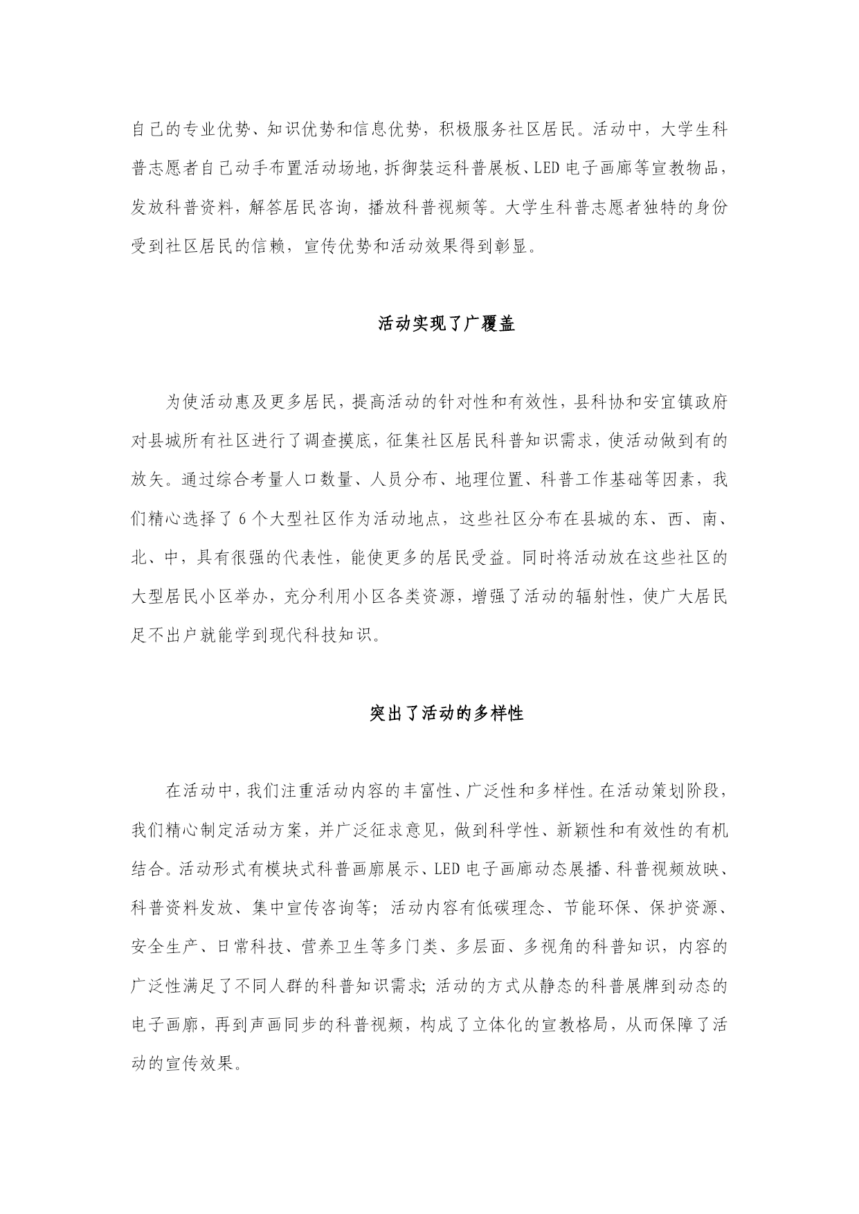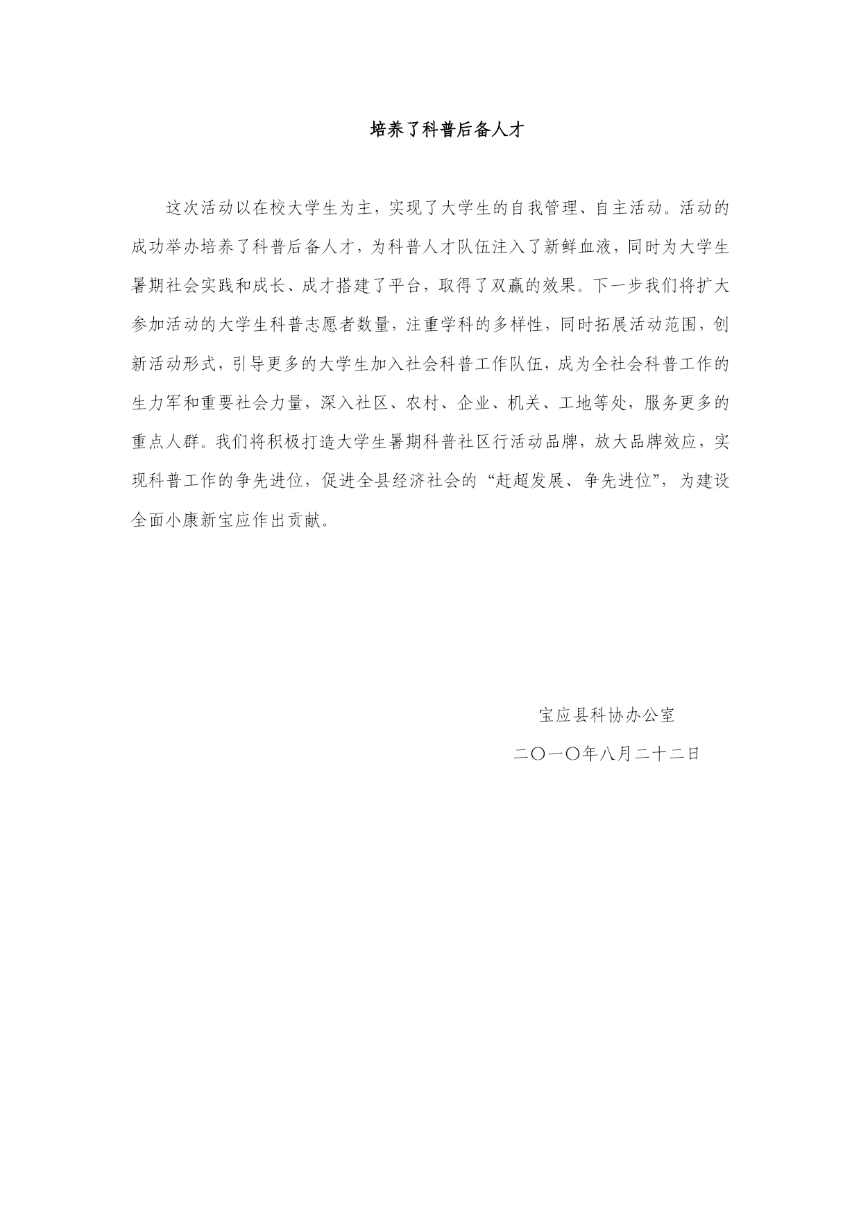 八月荷花映日红荷乡社区科普香——宝应县大学生暑期科普社区行活动纪实“原来走路也有讲究,平常的衣食住行竟有这么大的学问?低碳生活原来可以这么做。”让老百姓喜闻乐见的各类科技知识打开了藏在居民心中的诸多问号。这是发生在宝应县大学生暑期科普社区行活动中的一幕幕场景。为充分发挥暑期返乡大学生的独特作用,大力推进全国科普示范县创建,深入实施《科学素质纲要》,切实促进居民科学、安全、文明、健康生产生活方式的养成,全面提高广大城镇居民的科学素质,塑造城市的品质、品位、品牌,服务全县“城市化带动”战略,8月中旬,宝应县科协、安宜镇政府联合组织了“共建幸福家园、共创美好未来”——宝应县大学生暑期科普社区行主题实践活动。活动所到社区受到居民热烈欢迎,为社区吹来一股清新的科普之风,产生了广泛的社会影响。活动为期6天,深入6个社区,发放科普宣传资料1.5万份,接待咨询1000多人次,参与活动居民1万多人。现代“知识青年”成为活动主角大学生暑期科普社区行活动中,我们的现代“知识青年”——大学生成为当之无愧的“主角”。收集各类科普资料,下载制作科普视频,组装科普展牌,解答居民科普咨询,等等,活动从“彩排”到“表演”全部由大学生独立负责。为招募大学生科普人才,县科协、县科普志愿者协会在县电视台、“中国宝应”门户网站等媒体上,发布招募公告,广泛招募医学、信息工程、文艺等专业的暑期返乡大学生,担任科普志愿者。招募活动得到返乡大学生的积极响应,大学生们报名踊跃。经过严格筛选,20名大学生成为科普志愿者,并组成大学生科普志愿者服务队。参加活动的大学生冒着高温酷暑,深入县城的各大社区,充分发挥自己的专业优势、知识优势和信息优势,积极服务社区居民。活动中,大学生科普志愿者自己动手布置活动场地,拆御装运科普展板、LED电子画廊等宣教物品,发放科普资料,解答居民咨询,播放科普视频等。大学生科普志愿者独特的身份受到社区居民的信赖,宣传优势和活动效果得到彰显。活动实现了广覆盖为使活动惠及更多居民,提高活动的针对性和有效性,县科协和安宜镇政府对县城所有社区进行了调查摸底,征集社区居民科普知识需求,使活动做到有的放矢。通过综合考量人口数量、人员分布、地理位置、科普工作基础等因素,我们精心选择了6个大型社区作为活动地点,这些社区分布在县城的东、西、南、北、中,具有很强的代表性,能使更多的居民受益。同时将活动放在这些社区的大型居民小区举办,充分利用小区各类资源,增强了活动的辐射性,使广大居民足不出户就能学到现代科技知识。突出了活动的多样性在活动中,我们注重活动内容的丰富性、广泛性和多样性。在活动策划阶段,我们精心制定活动方案,并广泛征求意见,做到科学性、新颖性和有效性的有机结合。活动形式有模块式科普画廓展示、LED电子画廊动态展播、科普视频放映、科普资料发放、集中宣传咨询等;活动内容有低碳理念、节能环保、保护资源、安全生产、日常科技、营养卫生等多门类、多层面、多视角的科普知识,内容的广泛性满足了不同人群的科普知识需求;活动的方式从静态的科普展牌到动态的电子画廓,再到声画同步的科普视频,构成了立体化的宣教格局,从而保障了活动的宣传效果。培养了科普后备人才这次活动以在校大学生为主,实现了大学生的自我管理、自主活动。活动的成功举办培养了科普后备人才,为科普人才队伍注入了新鲜血液,同时为大学生暑期社会实践和成长、成才搭建了平台,取得了双赢的效果。下一步我们将扩大参加活动的大学生科普志愿者数量,注重学科的多样性,同时拓展活动范围,创新活动形式,引导更多的大学生加入社会科普工作队伍,成为全社会科普工作的生力军和重要社会力量,深入社区、农村、企业、机关、工地等处,服务更多的重点人群。我们将积极打造大学生暑期科普社区行活动品牌,放大品牌效应,实现科普工作的争先进位,促进全县经济社会的“赶超发展、争先进位”,为建设全面小康新宝应作出贡献。宝应县科协办公室二〇一〇年八月二十二日