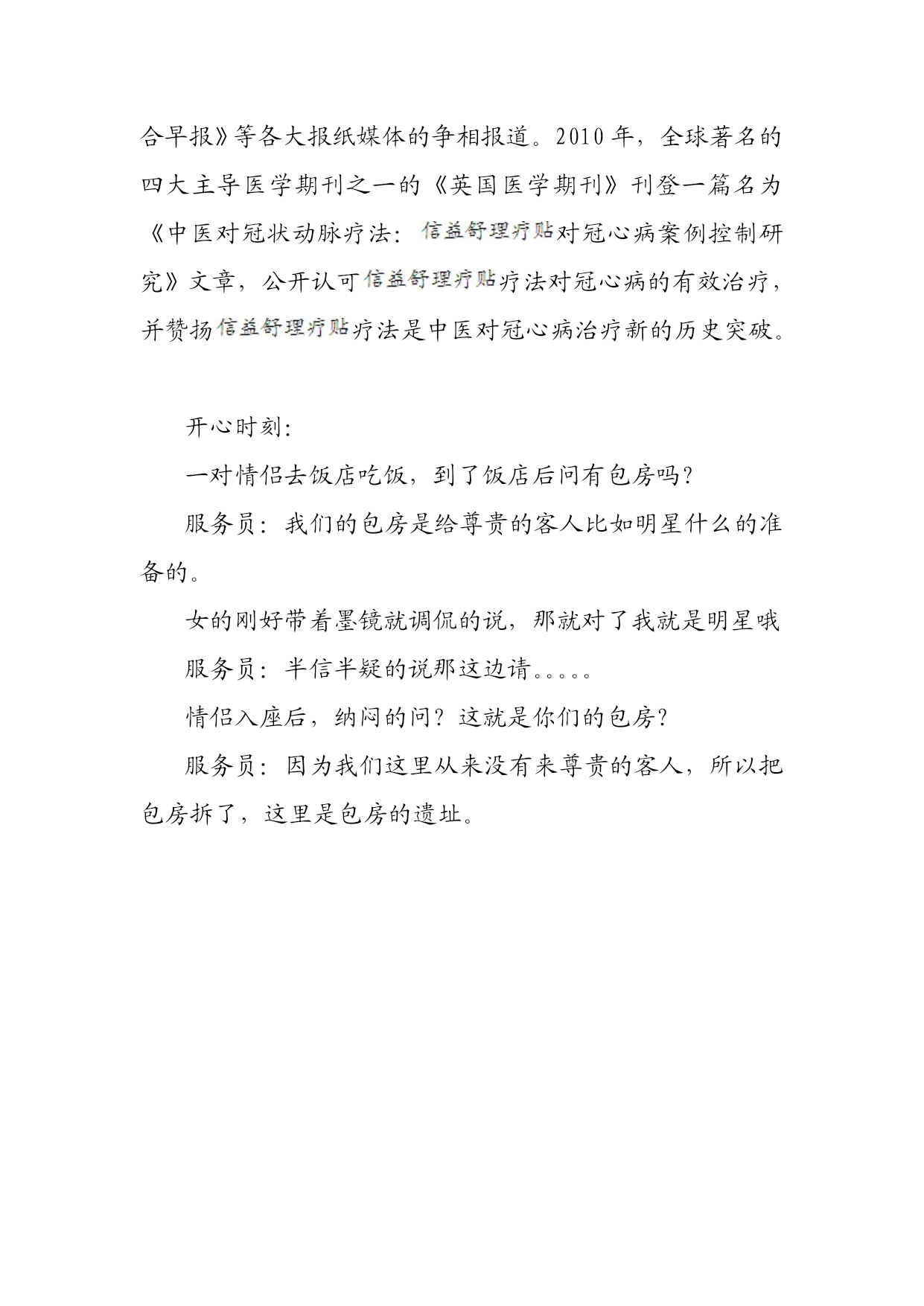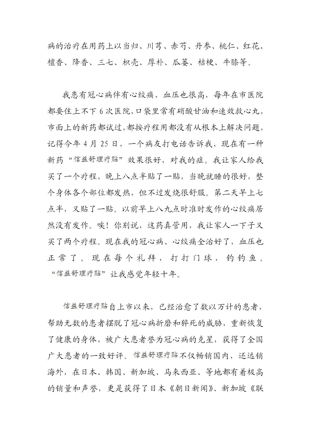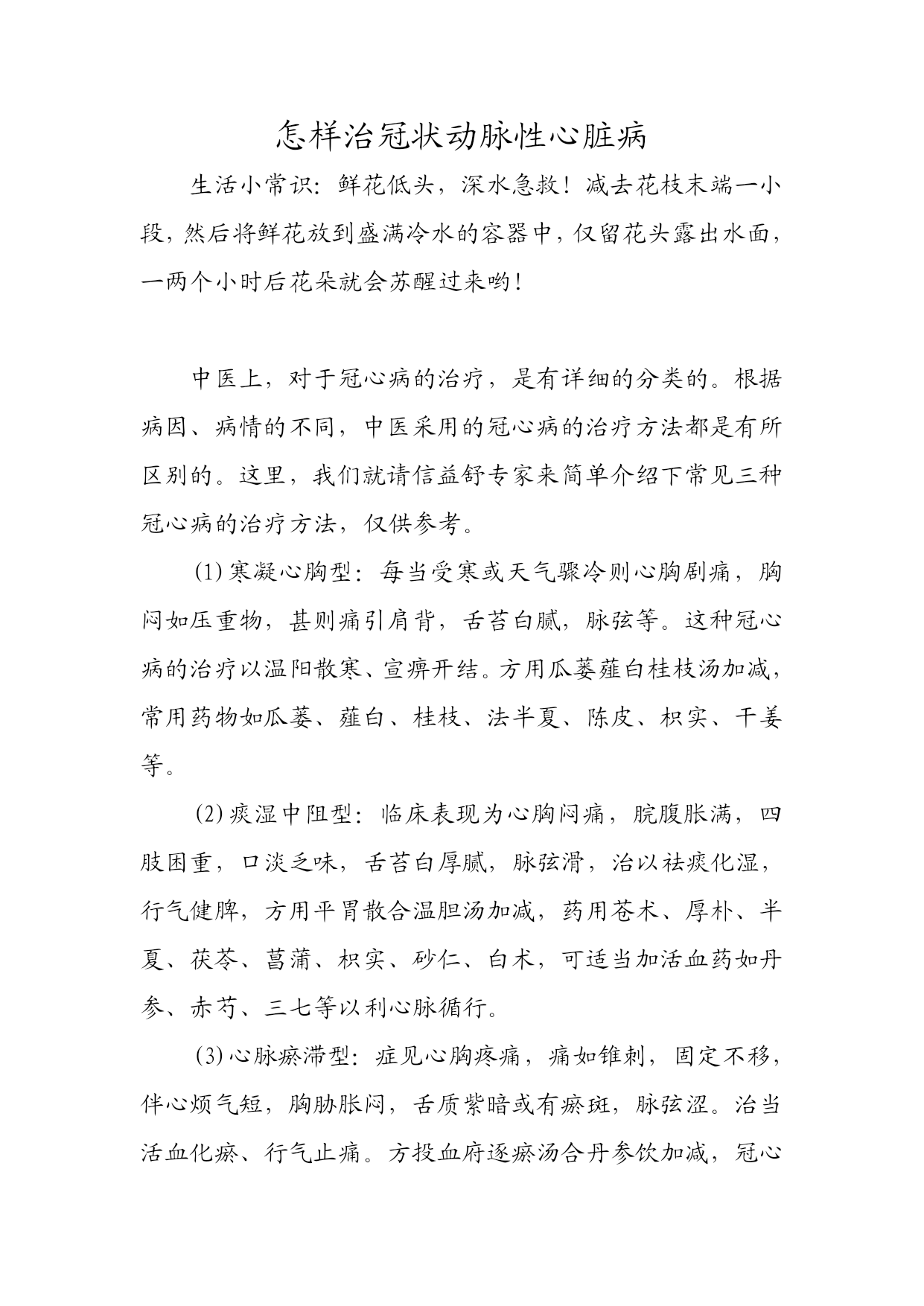 怎样治冠状动脉性心脏病生活小常识:鲜花低头,深水急救!减去花枝末端一小段,然后将鲜花放到盛满冷水的容器中,仅留花头露出水面,一两个小时后花朵就会苏醒过来哟!中医上,对于冠心病的治疗,是有详细的分类的。根据病因、病情的不同,中医采用的冠心病的治疗方法都是有所区别的。这里,我们就请信益舒专家来简单介绍下常见三种冠心病的治疗方法,仅供参考。(1)寒凝心胸型:每当受寒或天气骤冷则心胸剧痛,胸闷如压重物,甚则痛引肩背,舌苔白腻,脉弦等。这种冠心病的治疗以温阳散寒、宣痹开结。方用瓜蒌薤白桂枝汤加减,常用药物如瓜蒌、薤白、桂枝、法半夏、陈皮、枳实、干姜等。(2)痰湿中阻型:临床表现为心胸闷痛,脘腹胀满,四肢困重,口淡乏味,舌苔白厚腻,脉弦滑,治以祛痰化湿,行气健脾,方用平胃散合温胆汤加减,药用苍术、厚朴、半夏、茯苓、菖蒲、枳实、砂仁、白术,可适当加活血药如丹参、赤芍、三七等以利心脉循行。(3)心脉瘀滞型:症见心胸疼痛,痛如锥刺,固定不移,伴心烦气短,胸胁胀闷,舌质紫暗或有瘀斑,脉弦涩。治当活血化瘀、行气止痛。方投血府逐瘀汤合丹参饮加减,冠心病的治疗在用药上以当归、川芎、赤芍、丹参、桃仁、红花、檀香、降香、三七、枳壳、厚朴、瓜蒌、桔梗、牛膝等。我患有冠心病伴有心绞痛,血压也很高,每年在市医院都要住上不下6次医院,口袋里常有硝酸甘油和速效救心丸,市面上的新药都试过,都按疗程用都没有从根本上解决问题,记得今年4月25日,一个病友打电话告诉我,现在有一种新药“”效果很好,对我的症。我让家人给我买了一个疗程,晚上八点半贴了一贴,当晚就睡的很好,整个身体各个部位都发热,但不过发烧很舒服。第二天早上七点半,又贴了一贴。以前早上八九点时准时发作的心绞痛居然没有发作。唉!你别说,这药真管用,我让家人一下子又买了两个疗程。现在我的冠心病、心绞痛全治好了,血压也正常了。现在每个礼拜,打打门球,钓钓鱼。“”让我感觉年轻十年。自上市以来,已经治愈了数以万计的患者,帮助无数的患者摆脱了冠心病折磨和猝死的威胁,重新恢复了健康的身体,被广大患者誉为冠心病的克星,获得了全国广大患者的一致好评。不仅畅销国内,还远销海外,在日本、韩国、新加坡、马来西亚、等地都有着极高的销量和声誉,更是获得了日本《朝日新闻》、新加坡《联合早报》等各大报纸媒体的争相报道。2010年,全球著名的四大主导医学期刊之一的《英国医学期刊》刊登一篇名为《中医对冠状动脉疗法:对冠心病案例控制研究》文章,公开认可疗法对冠心病的有效治疗,并赞扬疗法是中医对冠心病治疗新的历史突破。开心时刻:一对情侣去饭店吃饭,到了饭店后问有包房吗?服务员:我们的包房是给尊贵的客人比如明星什么的准备的。女的刚好带着墨镜就调侃的说,那就对了我就是明星哦服务员:半信半疑的说那这边请。。。。。情侣入座后,纳闷的问?这就是你们的包房?服务员:因为我们这里从来没有来尊贵的客人,所以把包房拆了,这里是包房的遗址。