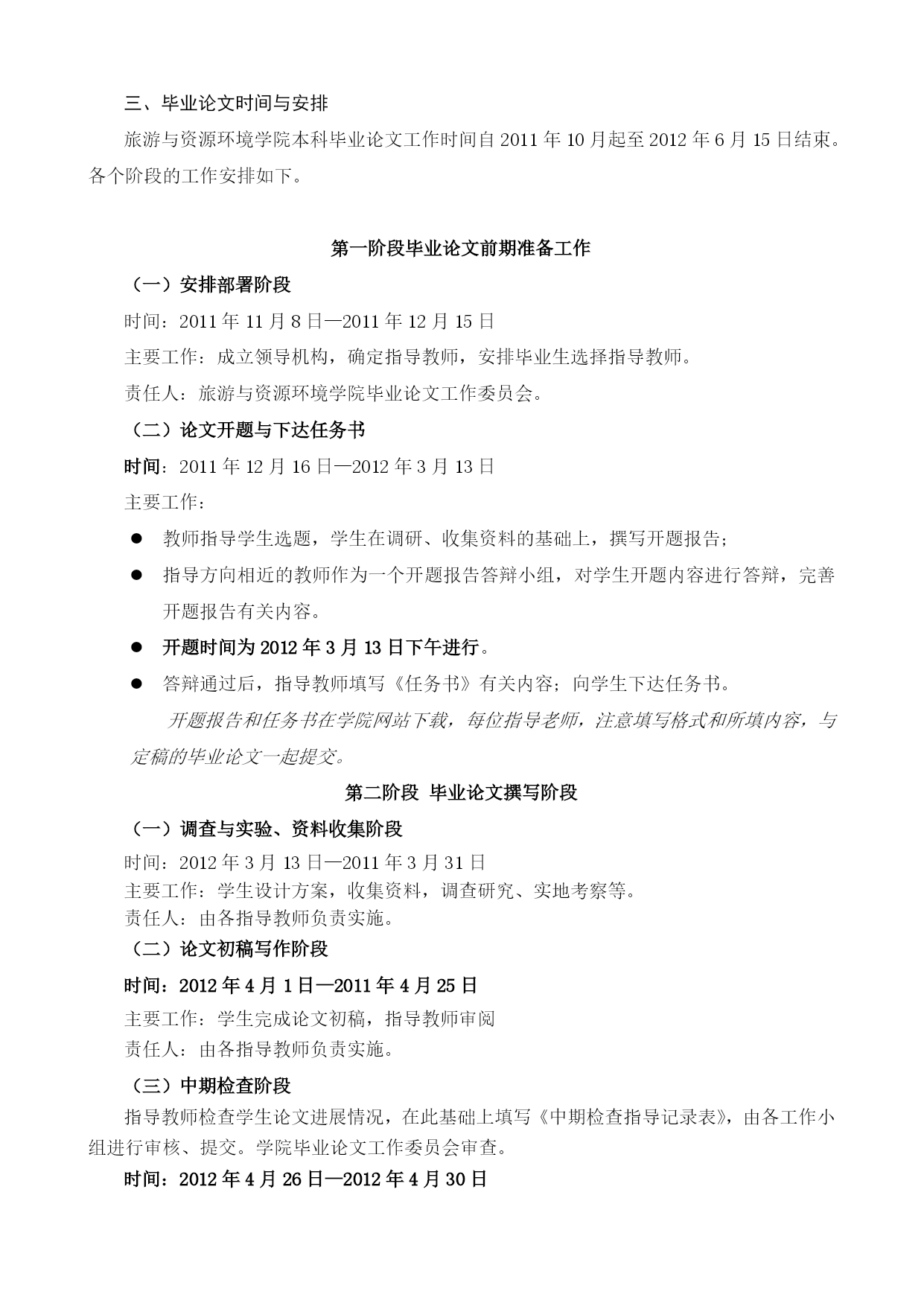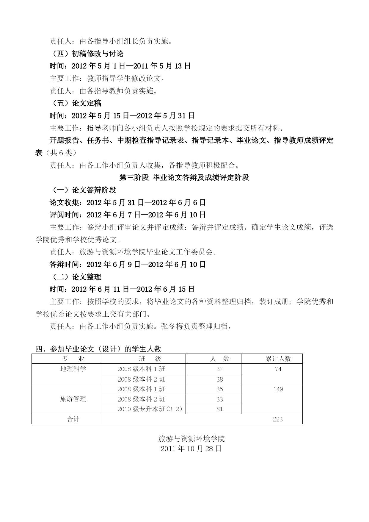 泰山学院旅游与资源环境学院2012届毕业生毕业论文工作方案本科毕业论文是实现高等教育目标的重要教学环节,是培养学生理论联系实际和锻炼学生独立工作能力的有效手段,是对学生掌握和运用所学基础理论、基本知识、基本技能以及从事科学研究能力的综合考核。为做好2012届本科毕业论文工作,特制定本方案。一、本方案依据1、《泰山学院本科毕业论文(设计)工作管理暂行规定》(泰院政发[2005]80号)2、《泰山学院毕业论文(设计)流程》(教处字[2007]36号)二、组织领导工作为顺利完成2012届毕业生的本科毕业论文工作,旅游与资源环境学院成立毕业论文工作委员会和工作小组,负责毕业论文的领导、组织和实施。(一)旅游与资源环境学院毕业论文工作委员会主任:彭淑贞副主任:史卫东委员:张建忠、赵敬民、王卫华、魏云刚、马明、马海洋、李海燕(二)旅游与资源环境学院毕业论文工作小组各小组主要职能是论文开题答辩,中期审查,论文收集汇总等。地理科学组第一组:赵敬民、彭淑贞、杨炯第二组:徐莉、张伟、杨华第三组:王卫华、赵春、丁敏第四组:宁奉菊、史卫东、刘桂菊旅游管理组第一组:魏云刚、王雷亭、邢莉第二组:张建忠、张连兵、李巧玲第三组:马明、李乐军、宋伟第四组:刘肖梅、孟华、吕臣第五组:陈方英、张莹、郑冬梅第六组:马海洋、王夏、李冉第七组:李海燕、董红霞、李升三、毕业论文时间与安排旅游与资源环境学院本科毕业论文工作时间自2011年10月起至2012年6月15日结束。各个阶段的工作安排如下。第一阶段毕业论文前期准备工作(一)安排部署阶段时间:2011年11月8日—2011年12月15日主要工作:成立领导机构,确定指导教师,安排毕业生选择指导教师。责任人:旅游与资源环境学院毕业论文工作委员会。(二)论文开题与下达任务书时间:2011年12月16日—2012年3月13日主要工作:教师指导学生选题,学生在调研、收集资料的基础上,撰写开题报告;指导方向相近的教师作为一个开题报告答辩小组,对学生开题内容进行答辩,完善开题报告有关内容。开题时间为2012年3月13日下午进行。答辩通过后,指导教师填写《任务书》有关内容;向学生下达任务书。开题报告和任务书在学院网站下载,每位指导老师,注意填写格式和所填内容,与定稿的毕业论文一起提交。第二阶段毕业论文撰写阶段(一)调查与实验、资料收集阶段时间:2012年3月13日—2011年3月31日主要工作:学生设计方案,收集资料,调查研究、实地考察等。责任人:由各指导教师负责实施。(二)论文初稿写作阶段时间:2012年4月1日—2011年4月25日主要工作:学生完成论文初稿,指导教师审阅责任人:由各指导教师负责实施。(三)中期检查阶段指导教师检查学生论文进展情况,在此基础上填写《中期检查指导记录表》,由各工作小组进行审核、提交。学院毕业论文工作委员会审查。时间:2012年4月26日—2012年4月30日责任人:由各指导小组组长负责实施。(四)初稿修改与讨论时间:2012年5月1日—2011年5月13日主要工作:教师指导学生修改论文。责任人:由各指导教师负责实施。(五)论文定稿时间:2012年5月15日—2012年5月31日主要工作:指导老师向各小组负责人按照学校规定的要求提交所有材料。开题报告、任务书、中期检查指导记录表、指导记录本、毕业论文、指导教师成绩评定表(共6类)责任人:由各工作小组负责人收集,各指导教师积极配合。第三阶段毕业论文答辩及成绩评定阶段(一)论文答辩阶段论文收集:2012年5月31日—2012年6月6日评阅时间:2012年6月7日—2012年6月10日主要工作:答辩小组评审论文并评定成绩;答辩并评定成绩。确定学生论文成绩,评选学院优秀和学校优秀论文。责任人:旅游与资源环境学院毕业论文工作委员会。答辩时间:2012年6月9日—2012年6月10日(二)论文整理时间:2012年6月11日—2012年6月15日主要工作:按照学校的要求,将毕业论文的各种资料整理归档,装订成册;学院优秀和学校优秀论文按要求上交有关部门。责任人:由各工作小组负责实施。张冬梅负责整理归档。四、参加毕业论文(设计)的学生人数专业班级人数累计人数地理科学2008级本科1班37742008级本科2班38旅游管理2008级本科1班351492008级本科2班332010级专升本班(3+2)81合计223旅游与资源环境学院2011年10月28日