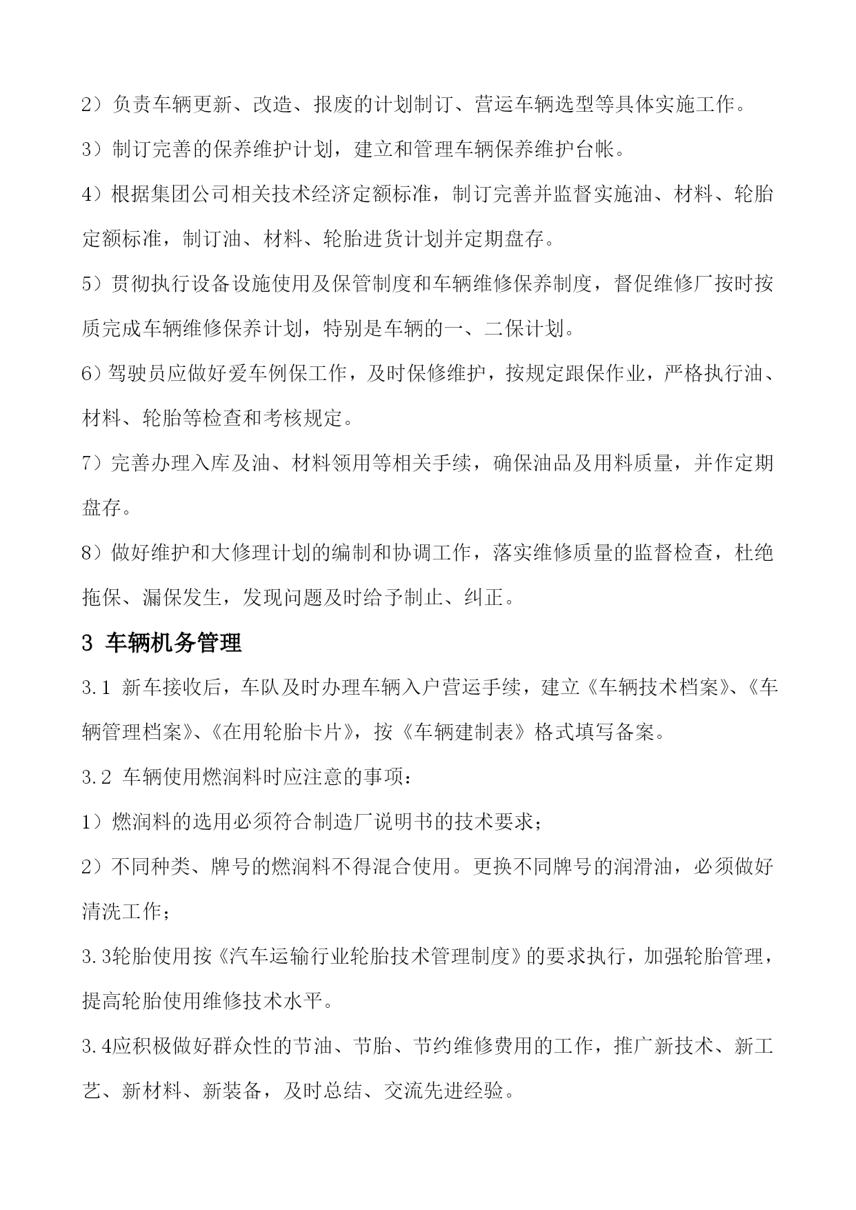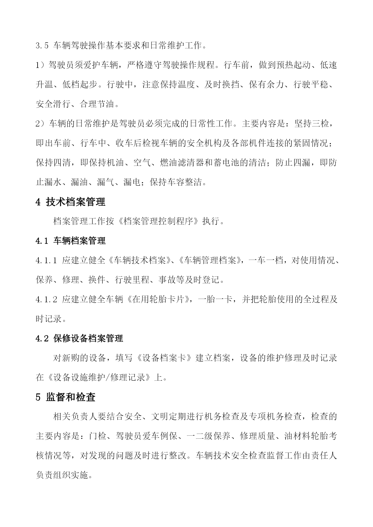 旅游租赁有限公司**分公司 机务管理规定 1机务管理的原则和基本要求 1.1管理原则:坚持预防为主和技术与经济相结合的原则,对车辆及设备实行择优选配、正确使用、定期检测、强制维护、视情修理、合理改造、适时更新和报废的全过程综合性管理。 1.2基本要求: 1)贯彻执行国家和上级有关车辆、维修/检测/计量设备管理工作方面的方针政策、规章制度、并组织实施。 2)开展多种形式的专业技术培训,不断提高技术管理人员、驾驶员的素质。 3)依靠科技进步、采取现代管理方法,完善车辆及设备质量监控体系,提高机务管理水平。 4)管好、用好、维修好车辆及设备,预防机损事故,提高车辆及设备的安全性、经济性。 5)建立、健全车辆及设备技术档案,执行《汽车保修技术经济定额》考核,不断完善机务基础管理。 6)推广现代化管理方法和先进经验,开展爱车、节油、节胎等竞赛活动。 2机务管理人员职责 公司机务管理人员负责制订和监督相应的维修、油、材料等管理细则,并根据本公司实际情况,指定相应的机务管理人员负责执行机务管理规定。 1)严格执行上级有关机务工作相关文件精神,宣传贯彻执行维修标准和保养规范,积极推广新技术、新工艺。 2)负责车辆更新、改造、报废的计划制订、营运车辆选型等具体实施工作。 3)制订完善的保养维护计划,建立和管理车辆保养维护台帐。 4)根据集团公司相关技术经济定额标准,制订完善并监督实施油、材料、轮胎定额标准,制订油、材料、轮胎进货计划并定期盘存。 5)贯彻执行设备设施使用及保管制度和车辆维修保养制度,督促维修厂按时按质完成车辆维修保养计划,特别是车辆的一、二保计划。 6)驾驶员应做好爱车例保工作,及时保修维护,按规定跟保作业,严格执行油、材料、轮胎等检查和考核规定。 7)完善办理入库及油、材料领用等相关手续,确保油品及用料质量,并作定期盘存。 8)做好维护和大修理计划的编制和协调工作,落实维修质量的监督检查,杜绝拖保、漏保发生,发现问题及时给予制止、纠正。 3车辆机务管理 3.1新车接收后,车队及时办理车辆入户营运手续,建立《车辆技术档案》、《车辆管理档案》、《在用轮胎卡片》,按《车辆建制表》格式填写备案。 3.2车辆使用燃润料时应注意的事项: 1)燃润料的选用必须符合制造厂说明书的技术要求; 2)不同种类、牌号的燃润料不得混合使用。更换不同牌号的润滑油,必须做好清洗工作; 3.3轮胎使用按《汽车运输行业轮胎技术管理制度》的要求执行,加强轮胎管理,提高轮胎使用维修技术水平。 3.4应积极做好群众性的节油、节胎、节约维修费用的工作,推广新技术、新工艺、新材料、新装备,及时总结、交流先进经验。 3.5车辆驾驶操作基本要求和日常维护工作。 1)驾驶员须爱护车辆,严格遵守驾驶操作规程。行车前,做到预热起动、低速升温、低档起步。行驶中,注意保持温度、及时换挡、保有余力、行驶平稳、安全滑行、合理节油。 2)车辆的日常维护是驾驶员必须完成的日常性工作。主要内容是:坚持三检,即出车前、行车中、收车后检视车辆的安全机构及各部机件连接的紧固情况;保持四清,即保持机油、空气、燃油滤清器和蓄电池的清洁;防止四漏,即防止漏水、漏油、漏气、漏电;保持车容整洁。 4技术档案管理 档案管理工作按《档案管理控制程序》执行。 4.1车辆档案管理 4.1.1应建立健全《车辆技术档案》、《车辆管理档案》,一车一档,对使用情况、保养、修理、换件、行驶里程、事故等及时登记。 4.1.2应建立健全车辆《在用轮胎卡片》,一胎一卡,并把轮胎使用的全过程及时记录。 4.2保修设备档案管理 对新购的设备,填写《设备档案卡》建立档案,设备的维护修理及时记录在《设备设施维护/修理记录》上。 5监督和检查 相关负责人要结合安全、文明定期进行机务检查及专项机务检查,检查的主要内容是:门检、驾驶员爱车例保、一二级保养、修理质量、油材料轮胎考核情况等,对发现的问题及时进行整改。车辆技术安全检查监督工作由责任人负责组织实施。