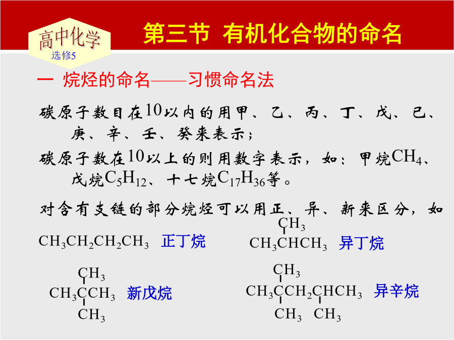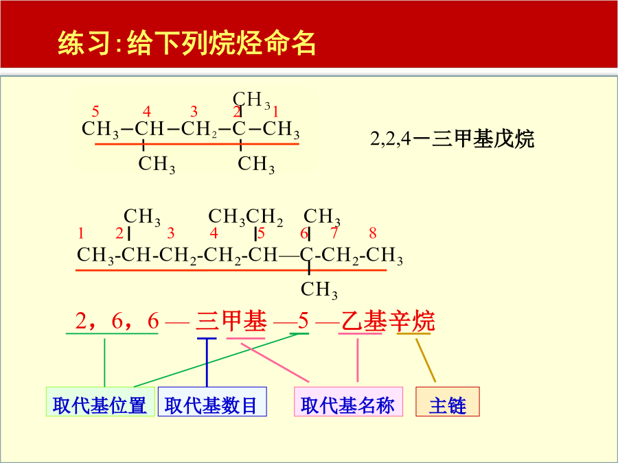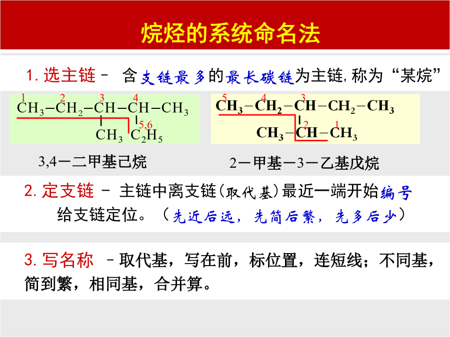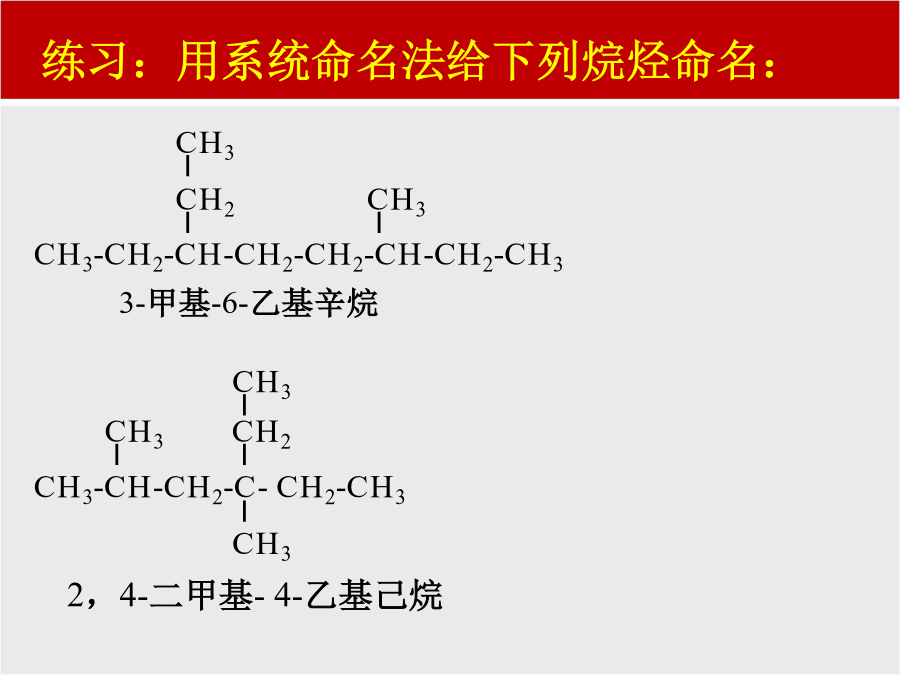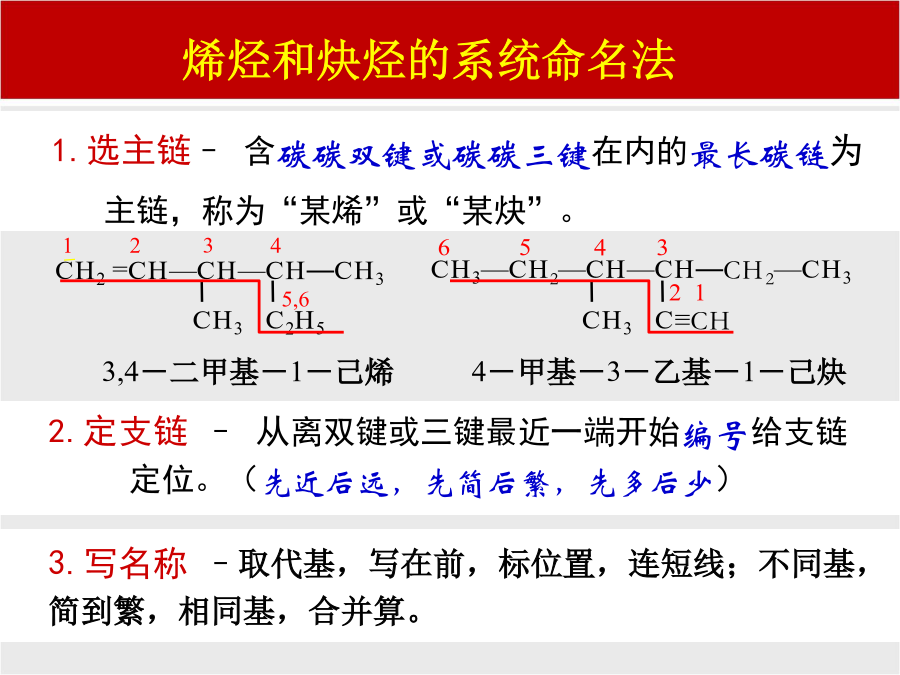 练习:用系统命名法给下列烷烃命名:练习1:命名下列烯烃或炔烃CH31.CH3-C=CH-CH3CH2=CH-CH=CH2第三节有机物的命名一.烷烃的命名法C:写名称,支名前,母名后,支名同,要合并支名异,简在前例1.CH3CH3-CH2-CH-CH2-CH2-C-CH3CH2CH3CH31234567CH3-CH2-CH-CH2-CH-CH-CH3CH3CH2CH3CH32,3,6-三甲基庚烷(1)含有尽可能多的双键或三键的最长的碳链的为主链,并命名为某烯或某炔;(2)从最靠近双键或三键的一端开始编号;(3)其它命名同烷烃。烃的衍生物的命名