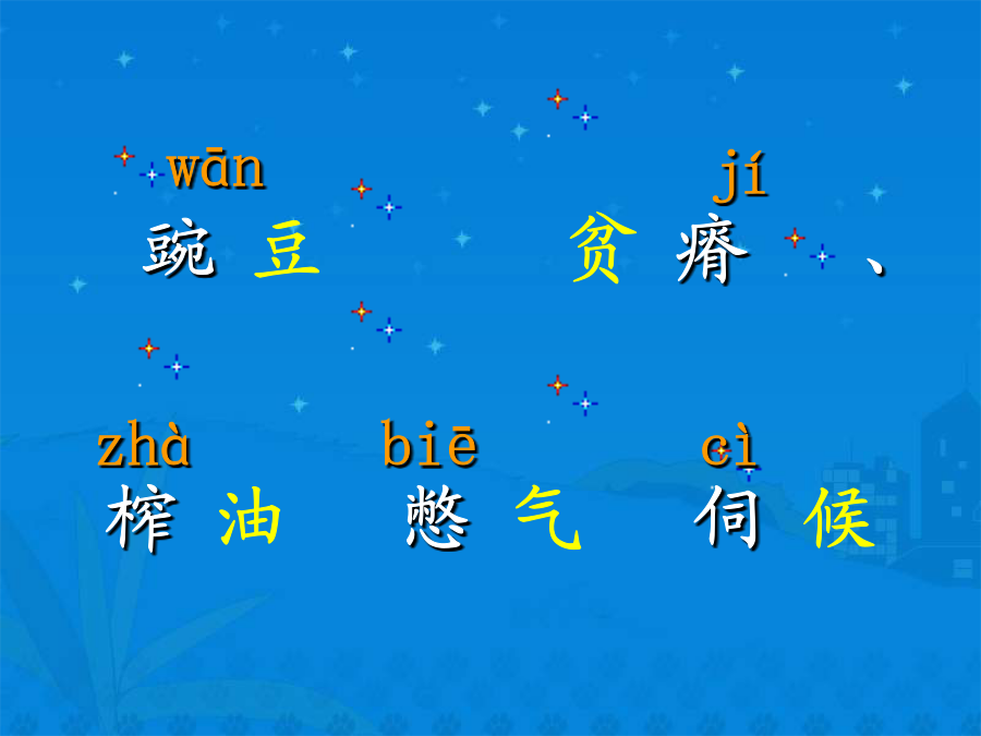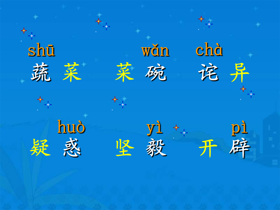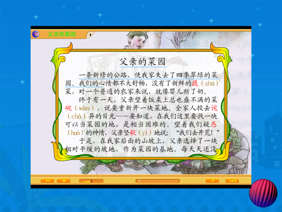 父亲的菜园蔬菜菜碗诧异疑惑坚毅开辟箢箕狰狞气馁可怖豌豆贫瘠、榨油憋气伺候蚯蚓翡翠莴笋菠菜诧异:觉得十分奇怪。1、父亲是在什么情况下决定开垦菜园的?他又是怎样开垦菜园的?2、勾画出描写父亲言行的词句,想想从这些词句里,你感受到了什么?“然而,山坡上那薄薄的一层泥土被大雨冲了个一干二净,露出大块大块狰狞的岩石来”。然而,表示转折;“一干二净”就是干干净净的意思;“大块大块”,多而大的意思;“狰狞”,指石头面目凶恶。这句话是说,父亲辛辛苦苦开垦出的三四分黄土地被无情的暴雨破坏了,非常可惜。远远望去,父亲的菜园就像一块碧绿的翡翠,嵌在荒凉的山坡上。这句话是说父亲的菜园不仅开垦了出来,而且长势很好。作者运用了比喻,把“菜园”比作“碧绿的翡翠”。生动形象,能引发人的想像,同时与荒凉的山坡形成了鲜明的对比。可见,这其中包含着父亲的多少艰辛啊。在父亲的精心伺候下,原本贫瘠的死黄土,变得黑亮,锄头挖下去,还能翻出蚯蚓来呢。这句话中的“伺候”一词指为使土地变肥沃而作出的辛勤努力;“贫瘠”指土地不肥,不适合生长植物。“黑亮”指土地的颜色由黄变黑,说明肥力增加了,因为土质由贫变肥,所以引来蚯蚓安家。总的来说,是说明在父亲辛勤的努力下,由于采用了有助于肥力的措施,使土地变肥沃了。爸爸,我想对您说