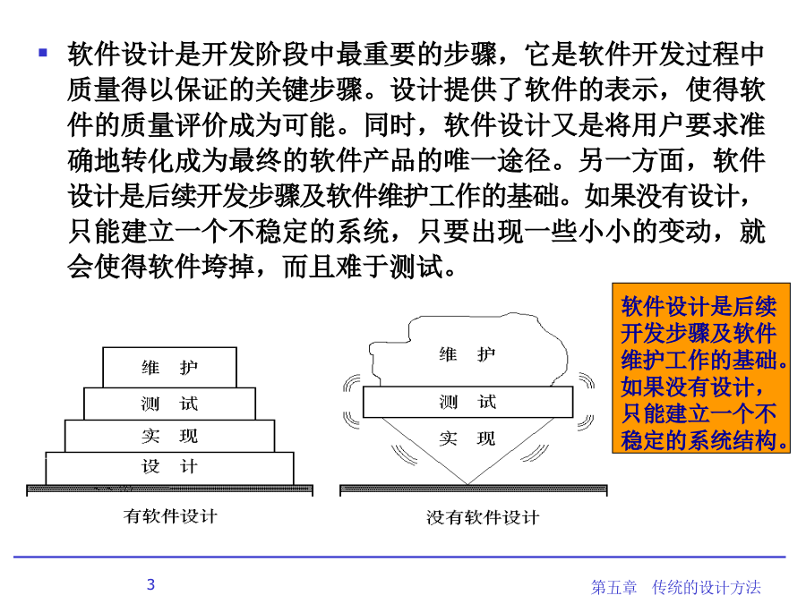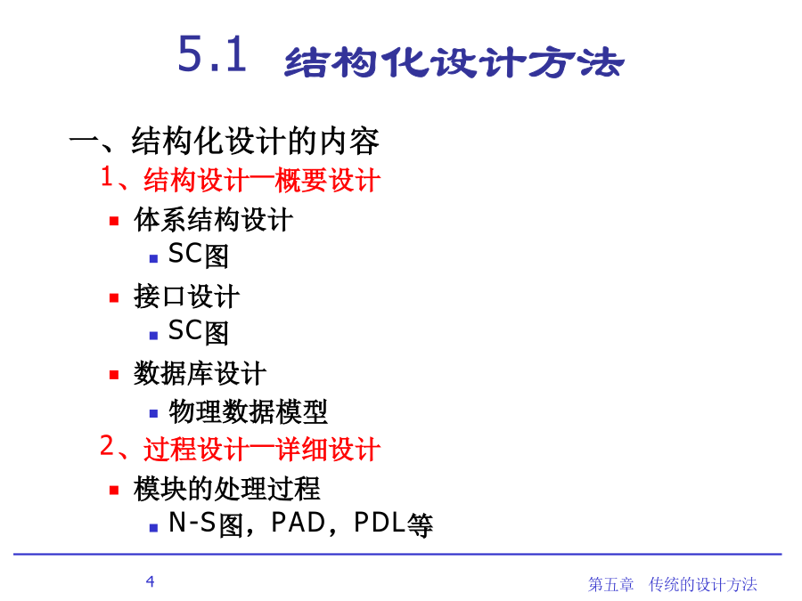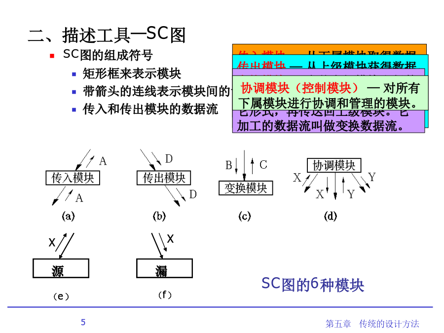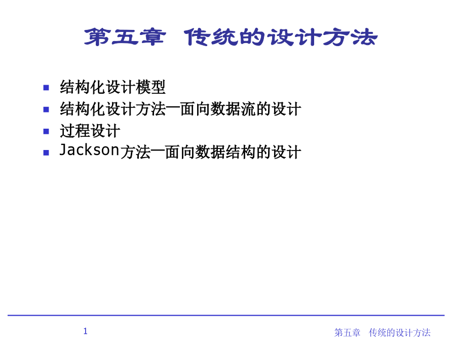 第五章传统的设计方法结构化设计的内容—从分析模型导出设计模型软件设计是开发阶段中最重要的步骤,它是软件开发过程中质量得以保证的关键步骤。设计提供了软件的表示,使得软件的质量评价成为可能。同时,软件设计又是将用户要求准确地转化成为最终的软件产品的唯一途径。另一方面,软件设计是后续开发步骤及软件维护工作的基础。如果没有设计,只能建立一个不稳定的系统,只要出现一些小小的变动,就会使得软件垮掉,而且难于测试。5.1结构化设计方法二、描述工具—SC图SC图的组成符号矩形框来表示模块带箭头的连线表示模块间的调用关系传入和传出模块的数据流SC图中的模块调用三、DFD图的类型与SD方法的步骤变换型结构这类系统有3个部分组成:传入路径、变换中心和传出路径组成。流经这3个部分的数据流分别称为传入流、变换流和传出流。事务型结构某一个加工将它的输入分离成一串平行的数据流,然后选择后面的某个加工。即某一个加工接受一项事务,根据事务处理的特点和性质,选择分派一个适当的处理单元,然后给出结果。通常大型系统的DFD图中,两类结构同时存在。SD方法的步骤复审DFD图,必要时可再次进行修改或细化;鉴别DFD图的结构特征:事务?变换?按照SD方法规定的一组规则,把DFD图为初始的SC图;变换型DFD图—————>初始SC图事务型DFD图—————>初始SC图改进初始的SC图,获得最终的SC图四、变换映射步骤:划分DFD图的边界,区分系统的有效(逻辑)输入、有效(逻辑)输出和中心加工(变换)部分;进行一级分解,设计系统的上层模块,建立初始SC图的框架;顶层都只含一个用于控制的主模块第一层包括传入、传出和中心变换三个模块对SC图的各个分支进行二级分解,设计完成系统的输入、输出和中心变换部分的系统的中、下层模块,分解实质上是“映射”。变换型结构的数据流图可分成三部分:输入、主加工和输出。主加工的输入数据流称为系统的“逻辑输入”。主加工的输出数据流称为系统的“逻辑输出”。系统输入端的数据流称为“物理输入”。系统输出端的数据流称为“物理输出”。从输入设备获得的物理输入一般要经过编辑、格式转换、合理性检查等一系列辅助性加工变成纯粹的“逻辑输入”传送给主加工,同样,主加工产生的纯粹的“逻辑输出”要经过格式转换、组成物理块、缓冲处理等辅助性加工后成为物理输出最后从系统送出。如何找出系统的逻辑输入、逻辑输出和主加工从物理输出端开始,一步步向系统的中间移动,直至达到这样一个数据流:它已不能再被看作为系统的输出,则其后一个数据流就是逻辑输出。逻辑输出是离系统物理输出端最远的、仍可被看作是系统输出的那个输入流。位于逻辑输入和逻辑输出之间的加工,就是系统的主加工。设计系统的上层模块第一层模块同主模块之间传送的数据应该同数据流相对应。这样就得到了结构图的上层,这里主模块控制并协调输入模块、变换模块和输出模块的工作,一般来说,它要根据一些逻辑条件来控制对这些模块的调用。设计中、下层模块同理,输出模块的功能是将其调用模块提供的数据输出,所以也由两部分组成:将调用模块提供的数据变换成输出的形式;数据输出。可为每一个输出模块设计两个下层模块,其中一个的功能是变换(即为变换模块),另一个的功能是输出(即为输出模块)。19例子—划分DFD第一级分解传入分支的分解传出分支的分解变换中心的分解初始SC图五、事务映射步骤:在DFD图上确定边界事务中心接受部分(包括接受路径)发送部分(包括全部动作路径)画出SC图框架DFD图的三个部分分别映射为事务控制模块,接受模块和动作发送模块分解和细化接受分支和发送分支动作部分发送动作分支的典型结构混合结构六、结构设计的优化规则对模块分割、合并和变动调用关系的指导规则提高内聚,降低耦合简化模块接口少用全局性数据和控制型信息保持高扇入/低扇出的原则例:扇出的煎饼形结构例:扇出的塔型结构扇出的瓮型结构作用域/控制域规则作用域不要超出控制域的范围软件系统的判定,其位置离受它控制的模块越近越好TOPTOP5.3过程设计3、过程设计的原则和方法清晰第一的设计风格结构化的控制结构逐步细化的实现方法控制结构的“结构化”五种基本控制结构4、过程设计工具流程图N-S图伪代码PDL语言流程图和N-S图伪代码和PDL语言5.4Jackson方法1、Jackson表示法Jackson方法和SD方法