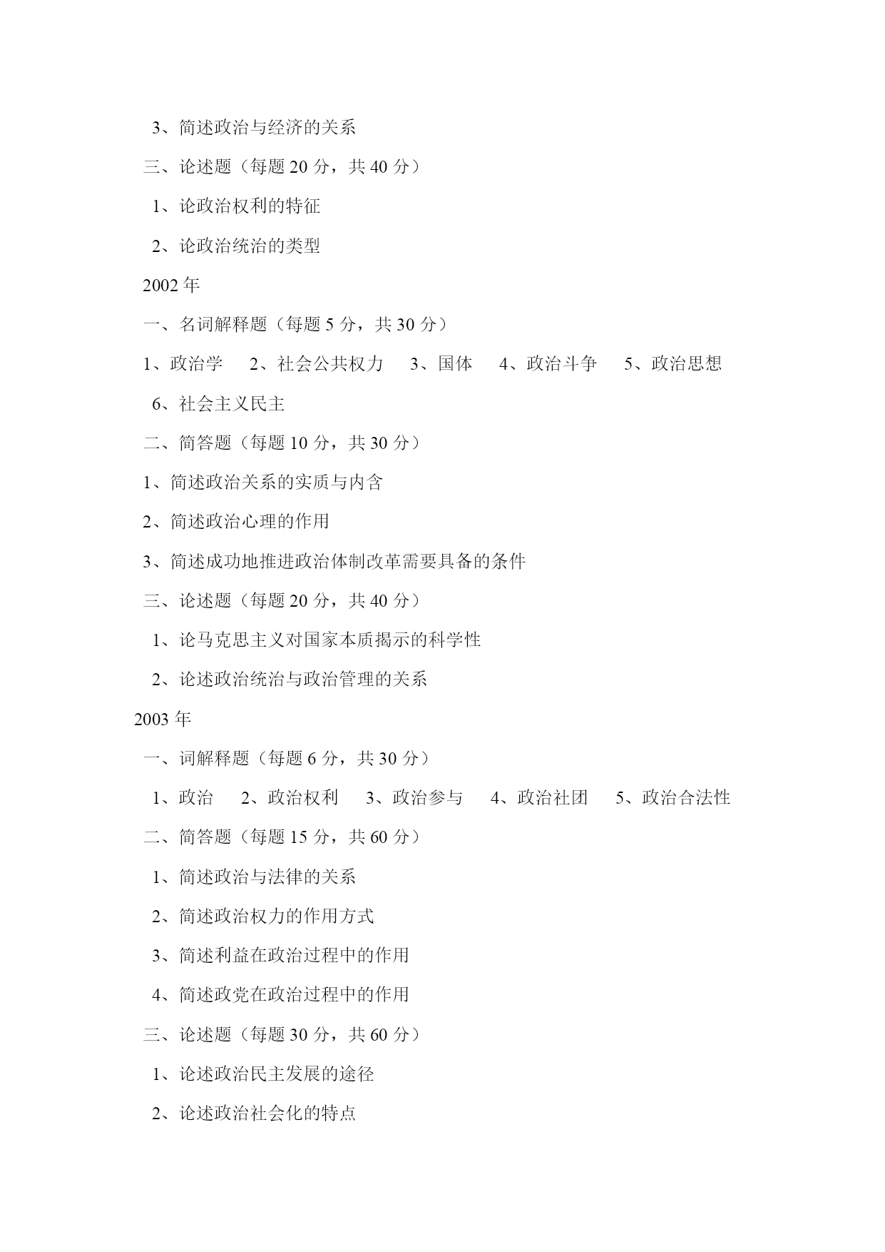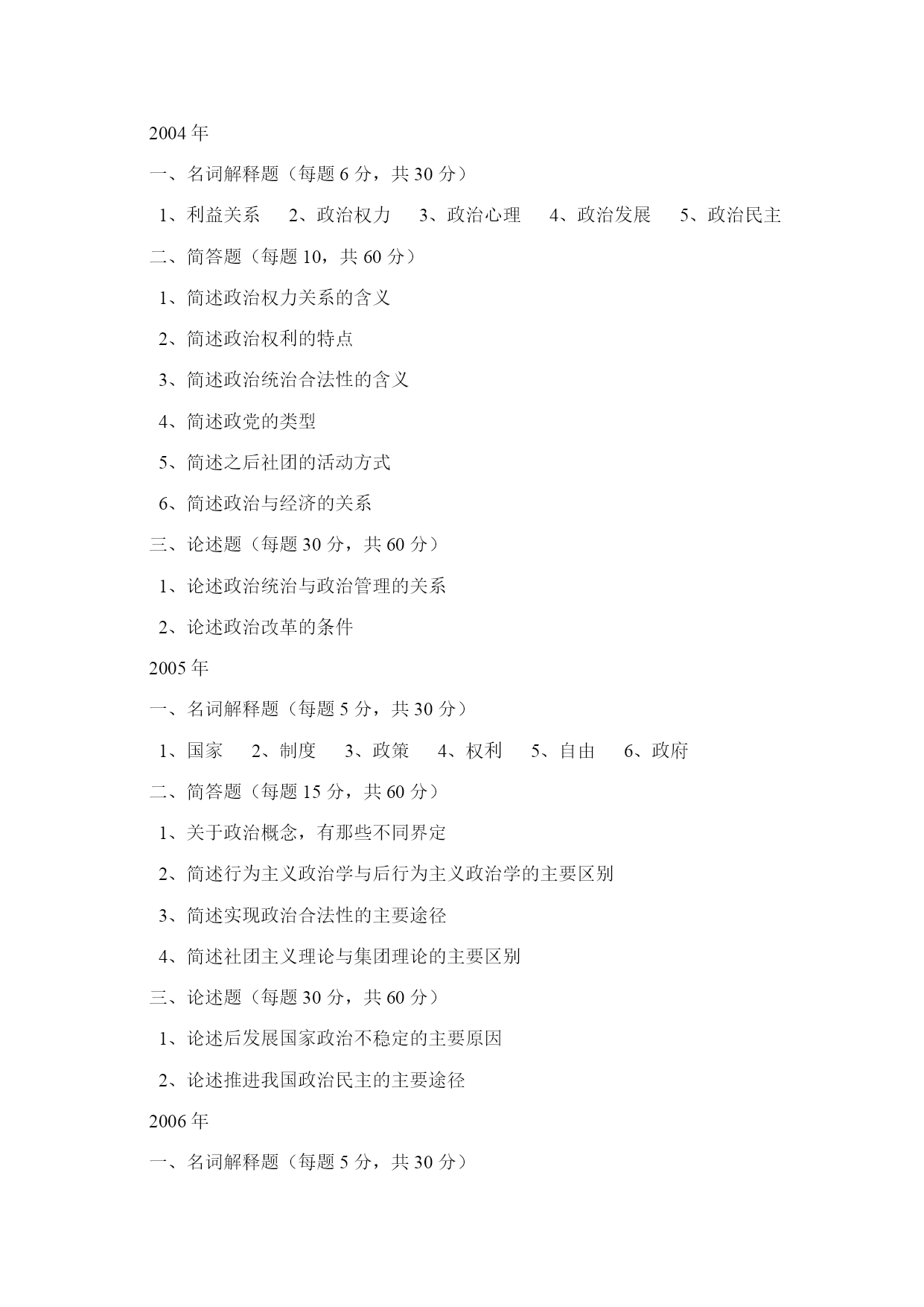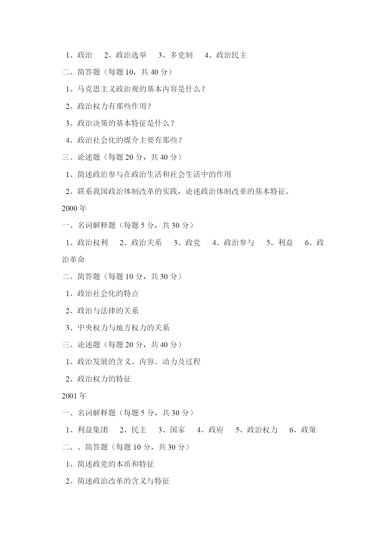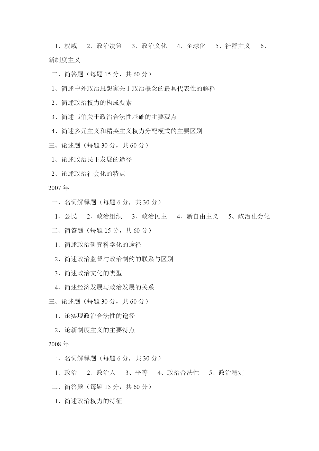 研究生入学考试试题政治学原理(1997——2009)1997年一、名词解释题(每题5分,共30分)1、政治2、政治权力3、政治行为4、政治文化5、国家结构6、国家结构形式二、简答题(每题10分,共30分)1、马克思主义政治学的基本特点2、政治权利的特征3、政党的基本特征三、论述题(每题20分,共40分)1、论马克思主义政治研究的基本方法2、论政治参与的作用1998年一、名词解释题(每题5分,共30分)1、政治领导2、政治表达3、政治投票4、国家结构形式5、政治心理6、政治社团二、简答题(每题5分,共30分)1、政治权利对与社会生活的作用2、政治社会化的主要特征3、政治民主的基本特征三。、论述题(每题20分,共40分)1、论政治统治的合法性2、联系实际论述社会主义民主的社会政治作用1999年一、名词解释题(每题5分,共20分)1、政治2、政治选举3、多党制4、政治民主二、简答题(每题10,共40分)1、马克思主义政治观的基本内容是什么?2、政治权力有那些作用?3、政治决策的基本特征是什么?4、政治社会化的媒介主要有那些?三、论述题(每题20分,共40分)1、简述政治参与在政治生活和社会生活中的作用2、联系我国政治体制改革的实践,论述政治体制改革的基本特征。2000年一、名词解释题(每题5分,共30分)1、政治权利2、政治关系3、政党4、政治参与5、利益6、政治革命二、简答题(每题10分,共30分)1、政治社会化的特点2、政治与法律的关系3、中央权力与地方权力的关系三、论述题(每题20分,共40分)1、政治发展的含义、内容、动力及过程2、政治权力的特征2001年一、名词解释题(每题5分,共30分)1、利益集团2、民主3、国家4、政府5、政治权力6、政策二。、简答题(每题10分,共30分)1、简述政党的本质和特征2、简述政治改革的含义与特征3、简述政治与经济的关系三、论述题(每题20分,共40分)1、论政治权利的特征2、论政治统治的类型2002年一、名词解释题(每题5分,共30分)1、政治学2、社会公共权力3、国体4、政治斗争5、政治思想6、社会主义民主二、简答题(每题10分,共30分)1、简述政治关系的实质与内含2、简述政治心理的作用3、简述成功地推进政治体制改革需要具备的条件三、论述题(每题20分,共40分)1、论马克思主义对国家本质揭示的科学性2、论述政治统治与政治管理的关系2003年一、词解释题(每题6分,共30分)1、政治2、政治权利3、政治参与4、政治社团5、政治合法性二、简答题(每题15分,共60分)1、简述政治与法律的关系2、简述政治权力的作用方式3、简述利益在政治过程中的作用4、简述政党在政治过程中的作用三、论述题(每题30分,共60分)1、论述政治民主发展的途径2、论述政治社会化的特点2004年一、名词解释题(每题6分,共30分)1、利益关系2、政治权力3、政治心理4、政治发展5、政治民主二、简答题(每题10,共60分)1、简述政治权力关系的含义2、简述政治权利的特点3、简述政治统治合法性的含义4、简述政党的类型5、简述之后社团的活动方式6、简述政治与经济的关系三、论述题(每题30分,共60分)1、论述政治统治与政治管理的关系2、论述政治改革的条件2005年一、名词解释题(每题5分,共30分)1、国家2、制度3、政策4、权利5、自由6、政府二、简答题(每题15分,共60分)1、关于政治概念,有那些不同界定2、简述行为主义政治学与后行为主义政治学的主要区别3、简述实现政治合法性的主要途径4、简述社团主义理论与集团理论的主要区别三、论述题(每题30分,共60分)1、论述后发展国家政治不稳定的主要原因2、论述推进我国政治民主的主要途径2006年一、名词解释题(每题5分,共30分)1、权威2、政治决策3、政治文化4、全球化5、社群主义6、新制度主义二、简答题(每题15分,共60分)1、简述中外政治思想家关于政治概念的最具代表性的解释2、简述政治权力的构成要素3、简述韦伯关于政治合法性基础的主要观点4、简述多元主义和精英主义权力分配模式的主要区别三、论述题(每题30分,共60分)1、论述政治民主发展的途径2、论述政治社会化的特点2007年一、名词解释题(每题6分,共30分)1、公民2、政治组织3、政治民主4、新自由主义5、政治社会化二、简答题(每题15分,共60分)1、简述政治研究科学化的途径2、简述政治监督与政治制约的联系与区别3、简述政治文化的类型4、简述经济发展与政治发展的关系三、论述题(每题30分,共60分)1、论实现政治合法性的途径2、论新制度主义的主要特点2008年一、名词解释题(每题6分,共30分)1、政治2、政治人3、平等4、政治合法性5、政治稳定二、简答题(每题15分,共60分)1、简述政治权力的特征2、