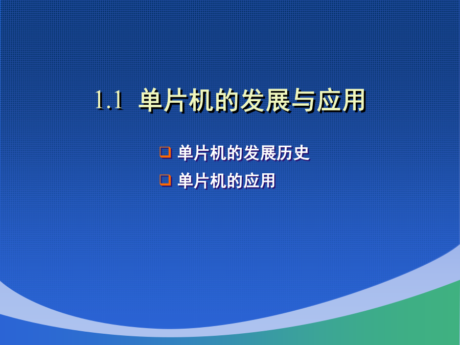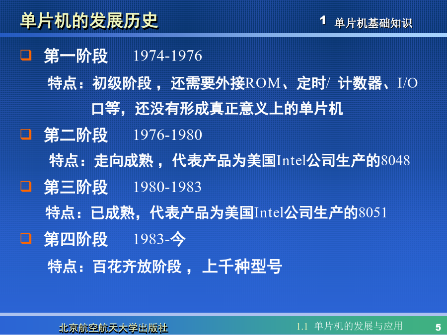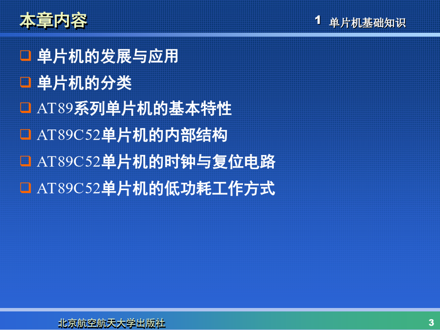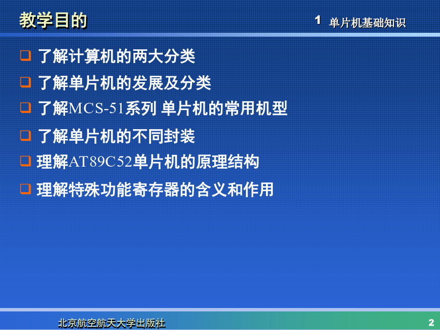 1单片机基础知识教学目的本章内容1.1单片机的发展与应用单片机的发展历史单片机的应用1.2单片机的分类通用/专用、运行位使用域1.3AT89系列单片机的基本特性标准型AT89系列单片机的基本特征高档型AT89系列单片机的基本特性低档型AT89系列单片机的基本特性AT89系列单片机型号的编码说明及封装形式AT89系列单片机型号的编码说明及封装形式部分ATMEL单片机的升级替代及推荐产品1.4AT89C52单片机的内部结构AT89C52单片机的CPUAT89C52单片机的存储器AT89C52单片机的存储器AT89C52单片机的I/O接口部分和特殊功能部分AT89C52单片机的I/O接口部分和特殊功能部分1.5AT89C52单片机的时钟与复位电路复位操作和复位电路振荡电路和时钟1.6AT89C52单片机的低功耗工作方式本章小结