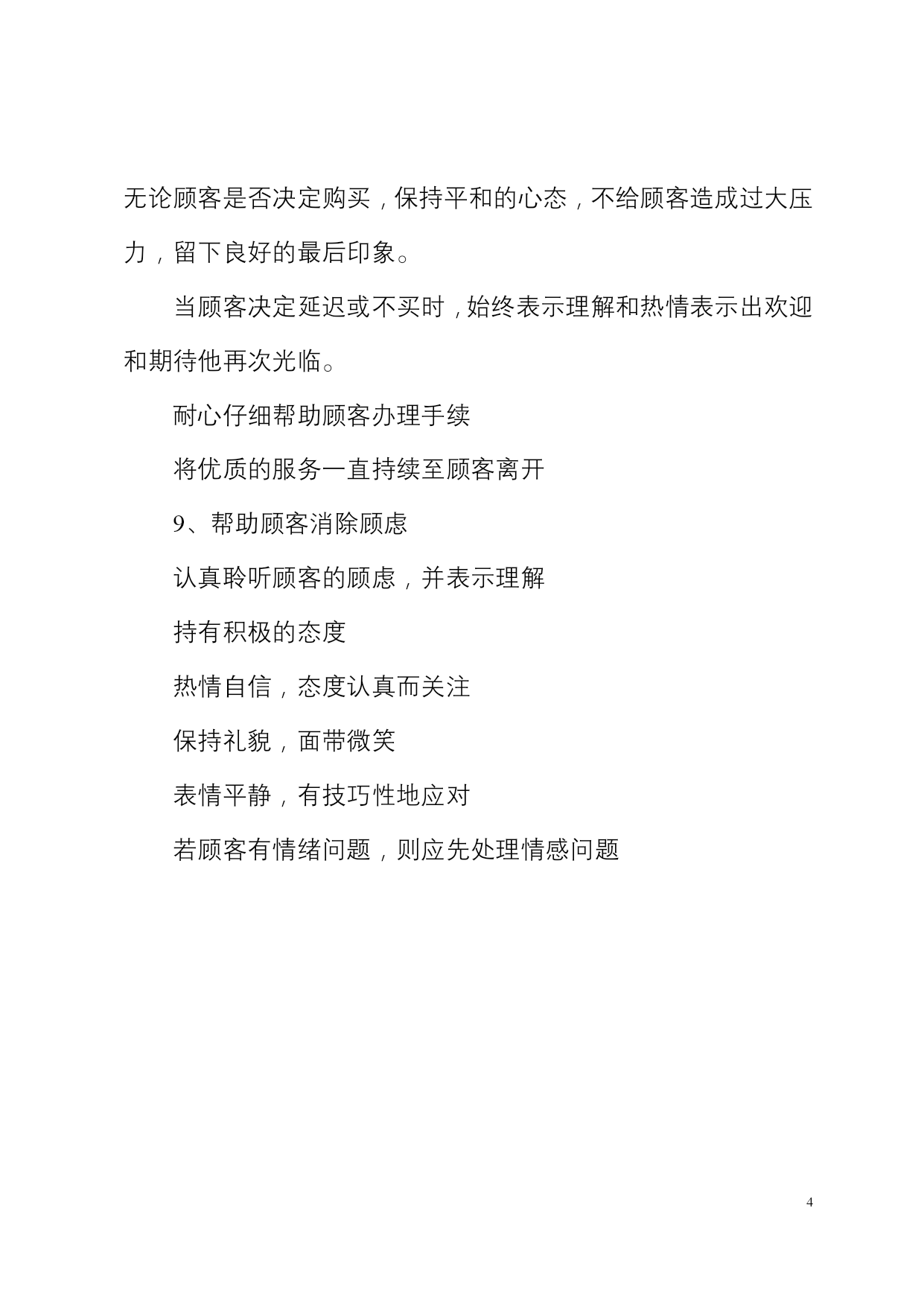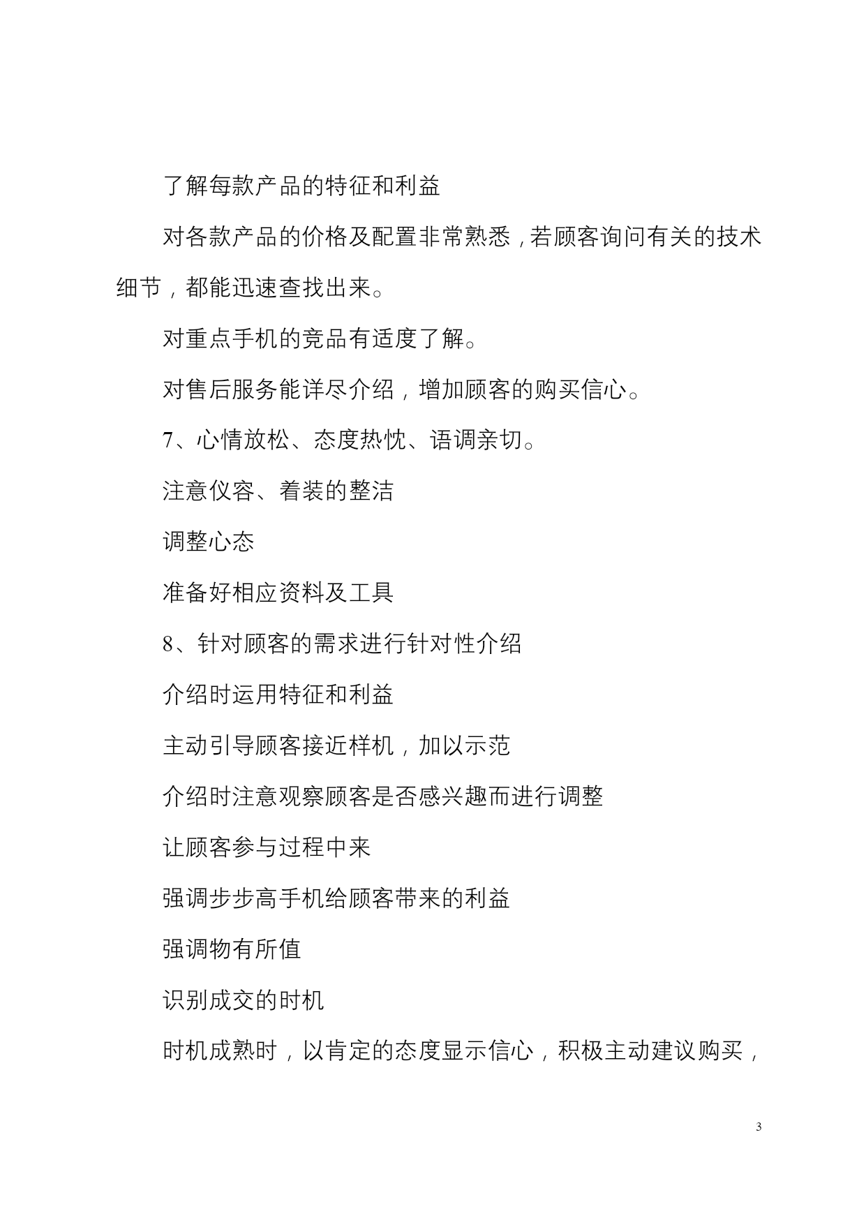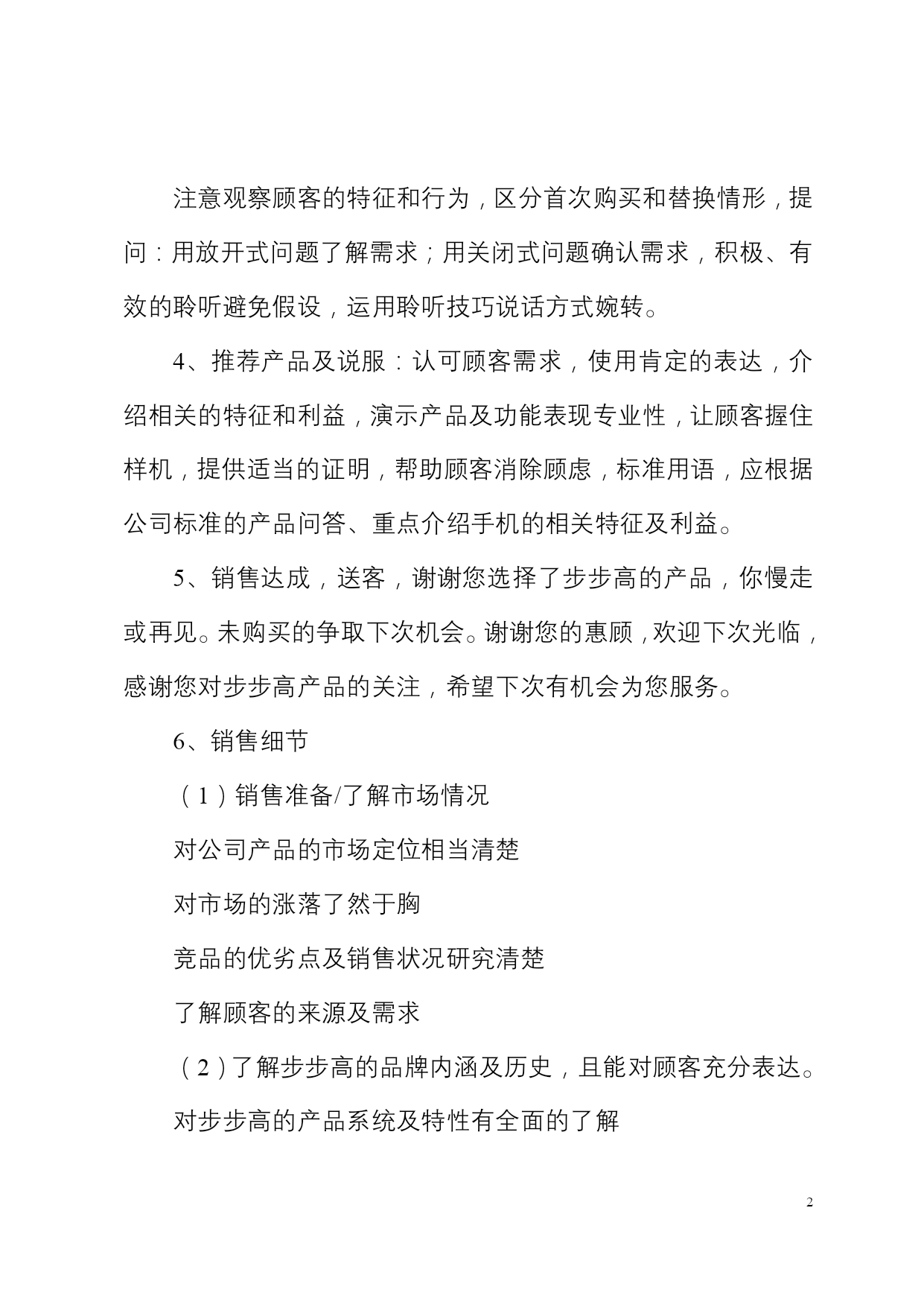 销售技巧及促销员工作流程1、销售准备(1)熟悉市场,公司的市场定位,市场趋势,竞争对手优劣之处及销售状况,我们的机遇和挑战顾客的要求。(2)产品与服务情况,步步高产品特性,产品的特征与利益,公司品牌内涵与历史、服务系统。2、迎接顾客(1)使用标准迎宾语您好!欢迎光临步步高专柜,您好!您需要我现在帮忙还是看看?(2)展示专业精神和服务态度及时关注、仪表,目光接触、语气、措辞、微笑(3)把握接近顾客的时机顾客先前曾来过你的柜台、顾客主动找促销员帮忙、顾客好像在找某种商品时、顾客在某个手机柜台前停留、一直注视某款手机时、顾客抬头寻找促销员时。3、了解顾客需求注意观察顾客的特征和行为,区分首次购买和替换情形,提问:用放开式问题了解需求;用关闭式问题确认需求,积极、有效的聆听避免假设,运用聆听技巧说话方式婉转。4、推荐产品及说服:认可顾客需求,使用肯定的表达,介绍相关的特征和利益,演示产品及功能表现专业性,让顾客握住样机,提供适当的证明,帮助顾客消除顾虑,标准用语,应根据公司标准的产品问答、重点介绍手机的相关特征及利益。5、销售达成,送客,谢谢您选择了步步高的产品,你慢走或再见。未购买的争取下次机会。谢谢您的惠顾,欢迎下次光临,感谢您对步步高产品的关注,希望下次有机会为您服务。6、销售细节(1)销售准备/了解市场情况对公司产品的市场定位相当清楚对市场的涨落了然于胸竞品的优劣点及销售状况研究清楚了解顾客的来源及需求(2)了解步步高的品牌内涵及历史,且能对顾客充分表达。对步步高的产品系统及特性有全面的了解了解每款产品的特征和利益对各款产品的价格及配置非常熟悉,若顾客询问有关的技术细节,都能迅速查找出来。对重点手机的竞品有适度了解。对售后服务能详尽介绍,增加顾客的购买信心。7、心情放松、态度热忱、语调亲切。注意仪容、着装的整洁调整心态准备好相应资料及工具8、针对顾客的需求进行针对性介绍介绍时运用特征和利益主动引导顾客接近样机,加以示范介绍时注意观察顾客是否感兴趣而进行调整让顾客参与过程中来强调步步高手机给顾客带来的利益强调物有所值识别成交的时机时机成熟时,以肯定的态度显示信心,积极主动建议购买,无论顾客是否决定购买,保持平和的心态,不给顾客造成过大压力,留下良好的最后印象。当顾客决定延迟或不买时,始终表示理解和热情表示出欢迎和期待他再次光临。耐心仔细帮助顾客办理手续将优质的服务一直持续至顾客离开9、帮助顾客消除顾虑认真聆听顾客的顾虑,并表示理解持有积极的态度热情自信,态度认真而关注保持礼貌,面带微笑表情平静,有技巧性地应对若顾客有情绪问题,则应先处理情感问题