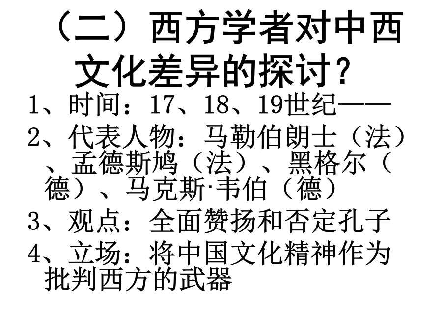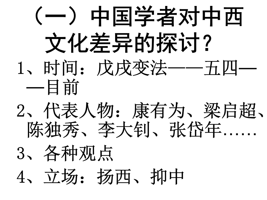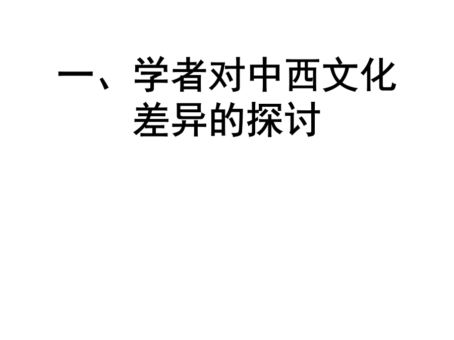 第三章中西文化的基本精神“基本精神”的概念一、学者对中西文化差异的探讨(一)中国学者对中西文化差异的探讨?(二)西方学者对中西文化差异的探讨?二、中西文化精神核心中国的人文传统与西方文艺复兴提倡的人文主义的区别?中国文化人文传统的体现?西方文化中科学精神的来源?西方文化的科学精神体现在哪三个方面?理性精神?西方文化的支柱有几个?具体指甚么?如何理解宗教作为西方文化三大支柱之一的理性?在西方文化的科学精神中,具有甚么样的客观态度?在西方文化的科学精神中,具有甚么样的执著态度?爱因斯坦的相对论三、群体认同与个人本位——中西文化对人自身的认识中国——群体—义务西方——个人主义—自由四、中西方价值取向的差异何谓儒家的“中庸”?道家推崇哪些观念和行为?儒道铸造了中国人甚么样的性格?西方文化精神和民族性格——崇力好斗尚争五、中西文化品格的差异——内向与开放中国文化的“内向”表现?西方文化的开拓求新的表现?中西方精神的局限及其启发?