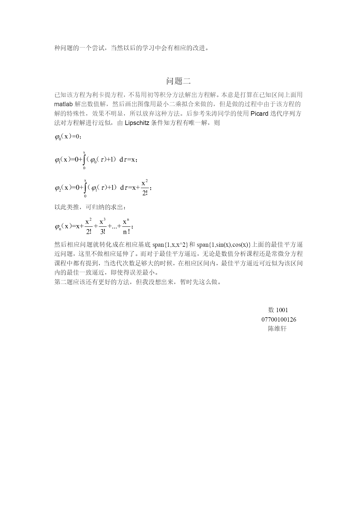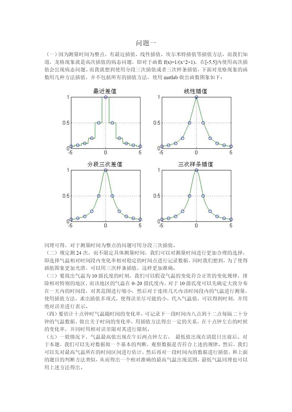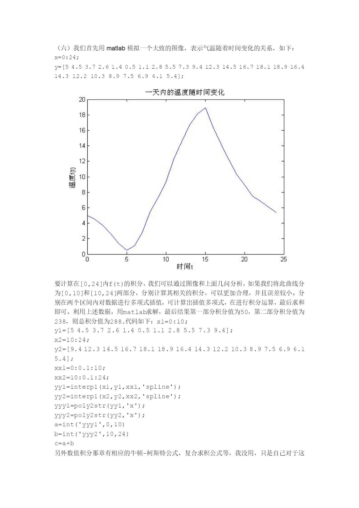 问题一(一)因为测量时间为整点,有最近插值、线性插值、埃尔米特插值等插值方法,而我们知道,龙格现象就是高次插值的病态问题,即对于函数f(x)=1/(x^2+1),在[-5,5]内使用高次插值会出现病态问题。而我就想到使用分段三次插值或者三次样条插值,下面对龙格现象的函数用几种方法插值,并不包括所有的插值方法,使用matlab做出函数图象如下:同理可得,对于测量时间为整点的问题可用分段三次插值。(二)规定测24次,而不限定具体测量时间,我们可以对测量时间进行更加合理的选择,即选择气温相对时间段内变化率相对稳定的时间点进行记录数据,同时我们想到,为了使得插值图象更加光滑,可以用三次样条插值,这样更加准确。(三)要找出气温为10摄氏度的时刻,我们可以假设气温的变化符合正常的变化规律,排除相对特别的地区,而该地区的气温在0~20摄氏度内,对于10摄氏度可以先确定大致分布在一天内的时间段,对其范围进行缩小,然后对于连续几天内该时间段内的气温进行测量,使用插值方法,求出插值多项式,使得误差尽可能的小,代入气温值,可以得到时刻,并用绝对误差进行表示。(四)要估计十点钟时气温随时间的变化率,可记录下一段时间内八点到十二点每隔二十分钟的气温数据,做出关于时间的变化率,用插值方法得出一定的关系,在十点钟左右的时候的变化率,并同时用相对误差限对其进行限制。(五)一般情况下,气温最高值出现在午后两点钟左右,最低值出现在清晨日出前后。对于本题,我们可以先对数据做一个基本的判断,观察数据是否符合上述的规律。然后,我们可以先对最高气温所在的时间区间进行估计,然后再对一段时间内的数据进行插值,和上面的题目的判断方法类似,从而得出一个相对准确的最高气温出现范围,最低气温同理也可以用上述方法得出。(六)我们首先用matlab模拟一个大致的图像,表示气温随着时间变化的关系,如下:x=0:24;y=[54.53.72.61.40.51.12.85.57.39.412.314.516.718.118.916.414.312.210.38.97.56.96.15.4];要计算在[0,24]内f(t)的积分,我们可以通过图像和上面几问分析,如果我们将此曲线分为[0,10]和[10,24]两部分,分别计算其相关的积分,可以更加合理,并且误差较小。分别在两个区间内对数据进行多项式插值,可计算出插值多项式,在进行积分运算,最后求和即可。利用上述数据,用matlab求解,最后结果第一部分积分值为50,第二部分积分值为238,则总积分值为288.代码如下:x1=0:10;y1=[54.53.72.61.40.51.12.85.57.39.4];x2=10:24;y2=[9.412.314.516.718.118.916.414.312.210.38.97.56.96.15.4];xx1=0:0.1:10;xx2=10:0.1:24;yy1=interp1(x1,y1,xx1,'spline');yy2=interp1(x2,y2,xx2,'spline');yyy1=poly2str(yy1,'x');yyy2=poly2str(yy2,'x');a=int('yyy1',0,10)b=int('yyy2',10,24)c=a+b另外数值积分那章有相应的牛顿-柯斯特公式、复合求积公式等,我没用,只是自己对于这种问题的一个尝试,当然以后的学习中会有相应的改进。问题二已知该方程为利卡提方程,不易用初等积分方法解出方程解。本意是打算在已知区间上面用matlab解出数值解,然后画出图像用最小二乘拟合来做的,但是做的过程中由于该方程的解的特殊性,效果不明显,所以放弃这种方法。后参考朱涛同学的使用Picard迭代序列方法对方程解进行近似,由Lipschitz条件知方程有唯一解,则=0;以此类推,可归纳的求出:然后相应问题就转化成在相应基底span{1,x,x^2}和span{1,sin(x),cos(x)}上面的最佳平方逼近问题,这里不做相应延伸了。而对于最佳平方逼近,无论是数值分析课程还是常微分方程课程中都有提到,当迭代次数足够大的时候,在相应区间内,最佳平方逼近可近似为该区间内的最佳一致逼近,即使得误差最小。第二题应该还有更好的方法,但我没想出来,暂时先这么做。数100107700100126陈维轩