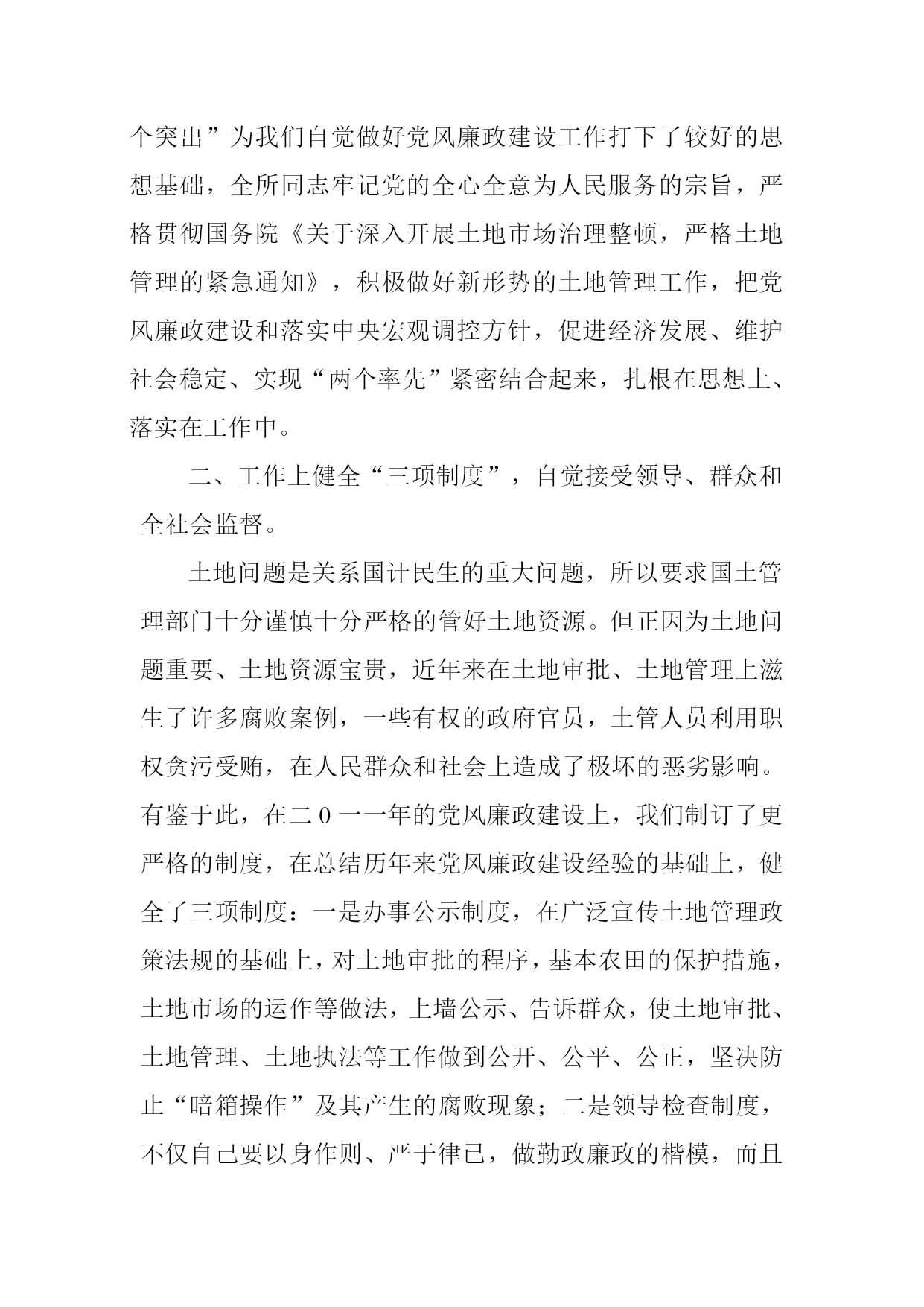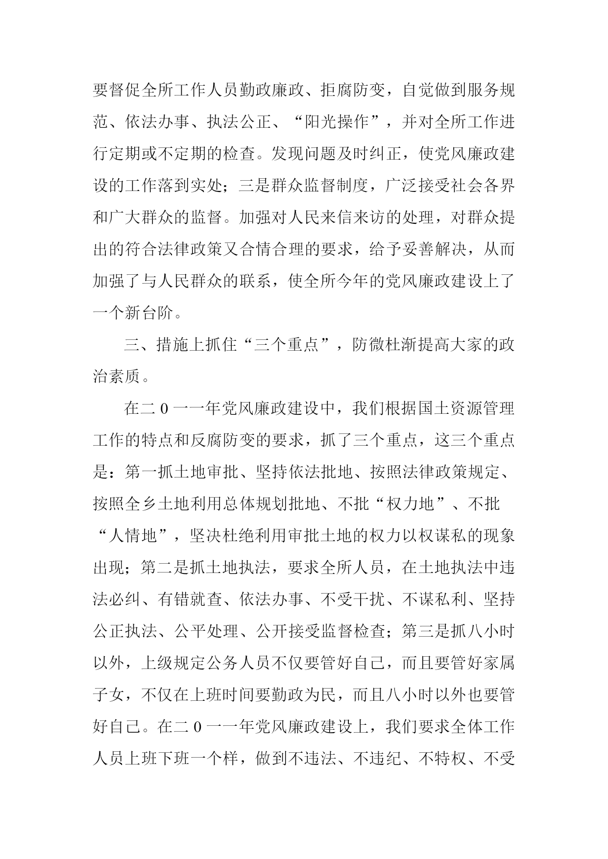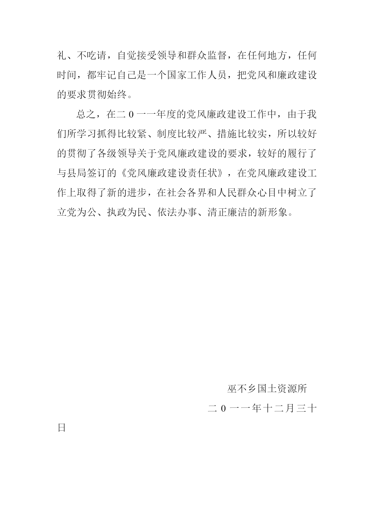 巫不乡国土资源所党风廉政建设工作总结根据党中央和各级领导关于党风建设的要求,对照本所在年初与国土资源管理局签订的《党风廉政建设责任状》的规定,我们巫不国土资源所在二0一一年,认真学习上级关于搞好党风建设的指示,学习关于国土管理系统腐败案件的警示教材,自觉执行国土资源管理系统党风建设措施,并联系本所实际,提高认识、落实措施、健全法制、强化监督,使党风建设上了一个新台阶。回顾二0一一年度的党风建设工作主要环绕三个方面做好工作的:一、学习上注意“三个突出”,牢记全心全意为人民服务的宗旨。在二0一一年的政治学习中,我们根据上级的布置和党风廉政建设的实际情况,有系统、有针对的突出了三个方面的内容:一是学习“三个代表”重要思想和科学发展观,树立立党为公,执政为民,为促本地经济社会全面、协调、可持续发展做好土地管理工作的思想;二是学习《两个条例》,联系思想、对照工作、树立自觉遵纪守法、依法办事的思想;三是学习在土地问题上违法腐败的案例,进行警示教育,树立奉公守法、严格自律、兢兢业业做好工作的思想。这“三个突出”为我们自觉做好党风廉政建设工作打下了较好的思想基础,全所同志牢记党的全心全意为人民服务的宗旨,严格贯彻国务院《关于深入开展土地市场治理整顿,严格土地管理的紧急通知》,积极做好新形势的土地管理工作,把党风廉政建设和落实中央宏观调控方针,促进经济发展、维护社会稳定、实现“两个率先”紧密结合起来,扎根在思想上、落实在工作中。二、工作上健全“三项制度”,自觉接受领导、群众和全社会监督。土地问题是关系国计民生的重大问题,所以要求国土管理部门十分谨慎十分严格的管好土地资源。但正因为土地问题重要、土地资源宝贵,近年来在土地审批、土地管理上滋生了许多腐败案例,一些有权的政府官员,土管人员利用职权贪污受贿,在人民群众和社会上造成了极坏的恶劣影响。有鉴于此,在二0一一年的党风廉政建设上,我们制订了更严格的制度,在总结历年来党风廉政建设经验的基础上,健全了三项制度:一是办事公示制度,在广泛宣传土地管理政策法规的基础上,对土地审批的程序,基本农田的保护措施,土地市场的运作等做法,上墙公示、告诉群众,使土地审批、土地管理、土地执法等工作做到公开、公平、公正,坚决防止“暗箱操作”及其产生的腐败现象;二是领导检查制度,不仅自己要以身作则、严于律已,做勤政廉政的楷模,而且要督促全所工作人员勤政廉政、拒腐防变,自觉做到服务规范、依法办事、执法公正、“阳光操作”,并对全所工作进行定期或不定期的检查。发现问题及时纠正,使党风廉政建设的工作落到实处;三是群众监督制度,广泛接受社会各界和广大群众的监督。加强对人民来信来访的处理,对群众提出的符合法律政策又合情合理的要求,给予妥善解决,从而加强了与人民群众的联系,使全所今年的党风廉政建设上了一个新台阶。三、措施上抓住“三个重点”,防微杜渐提高大家的政治素质。在二0一一年党风廉政建设中,我们根据国土资源管理工作的特点和反腐防变的要求,抓了三个重点,这三个重点是:第一抓土地审批、坚持依法批地、按照法律政策规定、按照全乡土地利用总体规划批地、不批“权力地”、不批“人情地”,坚决杜绝利用审批土地的权力以权谋私的现象出现;第二是抓土地执法,要求全所人员,在土地执法中违法必纠、有错就查、依法办事、不受干扰、不谋私利、坚持公正执法、公平处理、公开接受监督检查;第三是抓八小时以外,上级规定公务人员不仅要管好自己,而且要管好家属子女,不仅在上班时间要勤政为民,而且八小时以外也要管好自己。在二0一一年党风廉政建设上,我们要求全体工作人员上班下班一个样,做到不违法、不违纪、不特权、不受礼、不吃请,自觉接受领导和群众监督,在任何地方,任何时间,都牢记自己是一个国家工作人员,把党风和廉政建设的要求贯彻始终。总之,在二0一一年度的党风廉政建设工作中,由于我们所学习抓得比较紧、制度比较严、措施比较实,所以较好的贯彻了各级领导关于党风廉政建设的要求,较好的履行了与县局签订的《党风廉政建设责任状》,在党风廉政建设工作上取得了新的进步,在社会各界和人民群众心目中树立了立党为公、执政为民、依法办事、清正廉洁的新形象。巫不乡国土资源所二0一一年十二月三十日