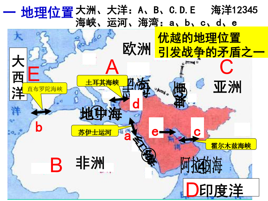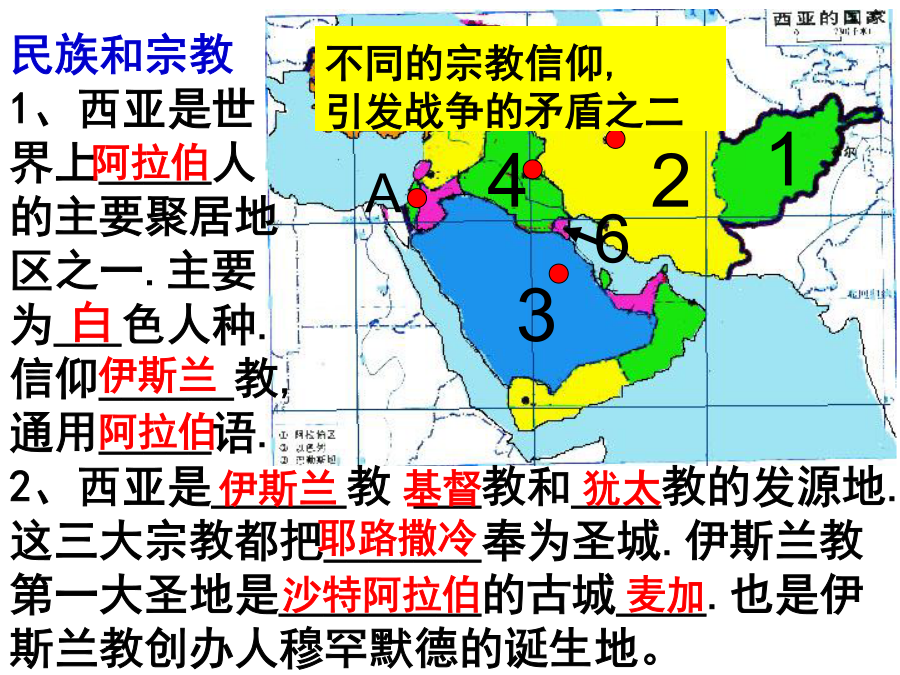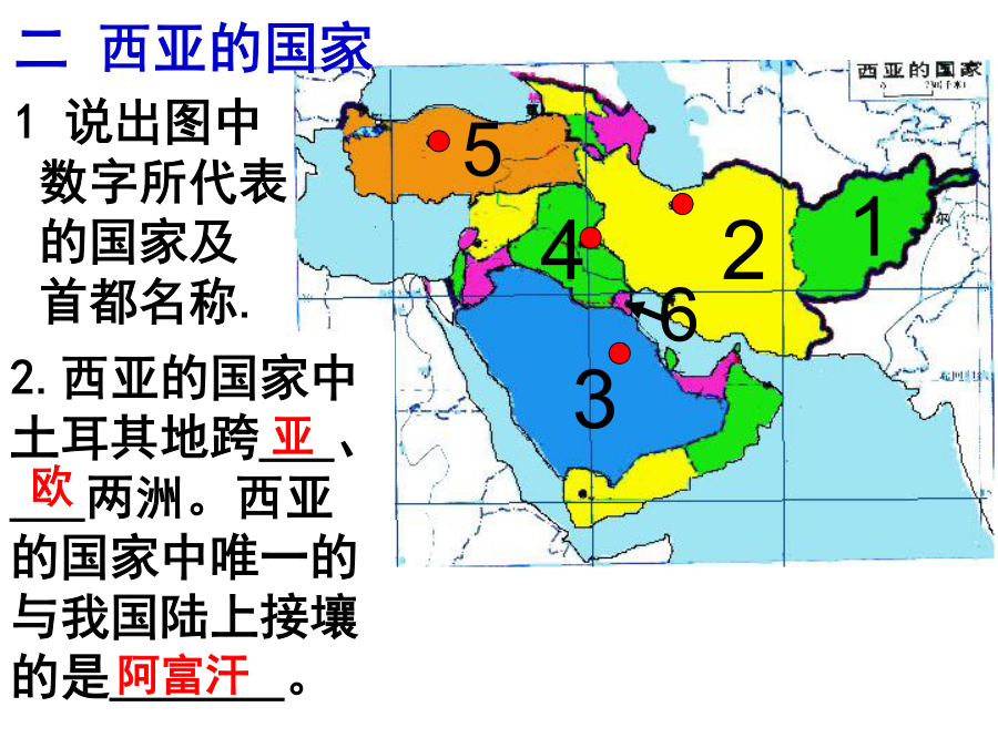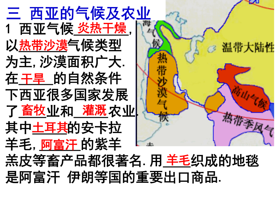 西亚一地理位置二西亚的国家民族和宗教1、西亚是世界上_____人的主要聚居地区之一.主要为___色人种.信仰______教,通用_____语.2、西亚是______教___教和____教的发源地.这三大宗教都把_______奉为圣城.伊斯兰教第一大圣地是_________的古城____.也是伊斯兰教创办人穆罕默德的诞生地。三西亚的气候及农业2由于降水稀少,农作物需要引水灌溉,农业多分布在_______和沙漠中的_____上,美索不达米亚也叫_____平原,是西亚重要的灌溉农业区.其中以色列的______农业令世人瞩目.3枣椰树是热带和亚热带绿洲农业的代表植物,_______是椰枣的主要出口国,其产量居世界首位.四、世界最大的石油宝库2西亚的石油资源主要分布在______及其沿岸地区._________________________和_________是世界重要的产油国.西亚的石油输出路线:南亚①1南亚大部分属于_____气候类型,其特征为___________.2南亚雨季降水主要集中在____部和____部,主要原因是______________.印度东北部的_____因降水多被称为世界雨极.3由于西南季风不稳定,南亚容易发生_____灾害.给农业造成不同程度的损害.4南亚的农业以___的种植为主,主要分布在____东北部和____地区及孟加拉国___,小麦主要分布在____部干旱少雨地区,黄麻以__河下游地区种植面积最广,棉花主要分布在____高原西部地区.1南亚是佛教印度教等宗教的发源地,目前佛教主要流传于____和_____,印度教主要盛行与_____和______,伊斯兰教主要为________________等国.世界古代七大建筑奇迹之一的泰姬陵位于_____北方.3南亚是世界人口四大____区之一,人口超过1亿的国家有____________.南亚都是发展中国家,大多以_______等传统工业为主,_____是南亚经济发展最快的一个,本国主要矿产有_____等.近年来,印度的____产业在世界上占有重要的地位.东南亚一.东南亚的范围二、国家1、东南亚处在___洲与____洲、____洋与__洋的“十字路口”的位置。其中______半岛和_________岛之间的_________海峡是“十字路口”的咽喉,被日本称为“____________”。13.东南亚大部分属___人种,信奉___和_______教。14.东南亚是世界上人口稠密的地区之一人口集中分布在________和______15.东南亚人口稠密,是世界_______人的最大聚集地。华人比重最大的国家是______美洲巩固练习1、北美洲地形特征温带海洋性气候2、在北美洲的中部,为什么冬季寒冷的气流能够长驱直入,并到达墨西哥湾沿岸?1。白令海峡沟通了___洋和___洋,水道中央有__洲和__洲的分界线,___和__的国界线,_____“三线”穿过。2。中美地峡是指____以南,____以北的的狭长陆地,又称_____。3。北美洲面积最大的国家是___,其次是____,它们都曾是__、__等国的殖民地,两国都通行__语4。拉丁美洲是指__国以南的美洲的国家和地区,其面积最大的国家是___,通用___语,拉丁美洲除巴西以外的其他国家通用___语。这两种语言都源于___语。5。世界第一大岛是_____。6.世界上最长的山脉是_____山脉。北美洲地形可分为__大南北纵列地带:西部是_____,中部是_____,东部是_____。7.南美洲的地形西部是_____,中东部为______的相间排列,世界上最湿润的大洲是_____,最干旱的大洲是____。8.美洲的印第安人、因纽特人都是__色人种,__和___都是典型的移民国家;南美洲种族复杂,号称“___________”,以___人种为主。9.___是当代实力最为雄厚的资本主义国家,经济高度发达。10.墨西哥的主要矿产是____,且是___(农作物)的原产地。___是南美洲工农业最发达的国家,阿根廷的主要出口商品是____、____和____。1、北美洲面积最大的国家是____,其次是___.由于历史上的原因,两国通行____.2、美国以南的美洲地区,因为历史上长期受_____和_____的殖民统治,目前主要通行_______和_______,而这两种语言都源于_____,所以人们通常将其称为______.非洲读图完成练习:1_______2_______3_______4_______5_______6_______7_______3、在课本20页,非洲气候图上填写气候类型。1.世界上国家数最多的大洲是____.2.非洲大陆高原面积广大,被称为_____.非洲物产丰富,被誉为______,非洲的地势特点是____