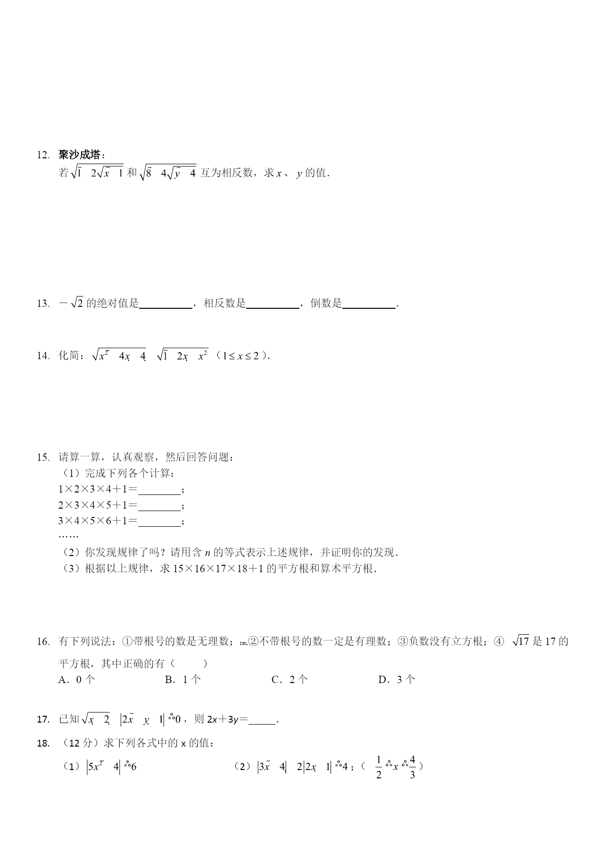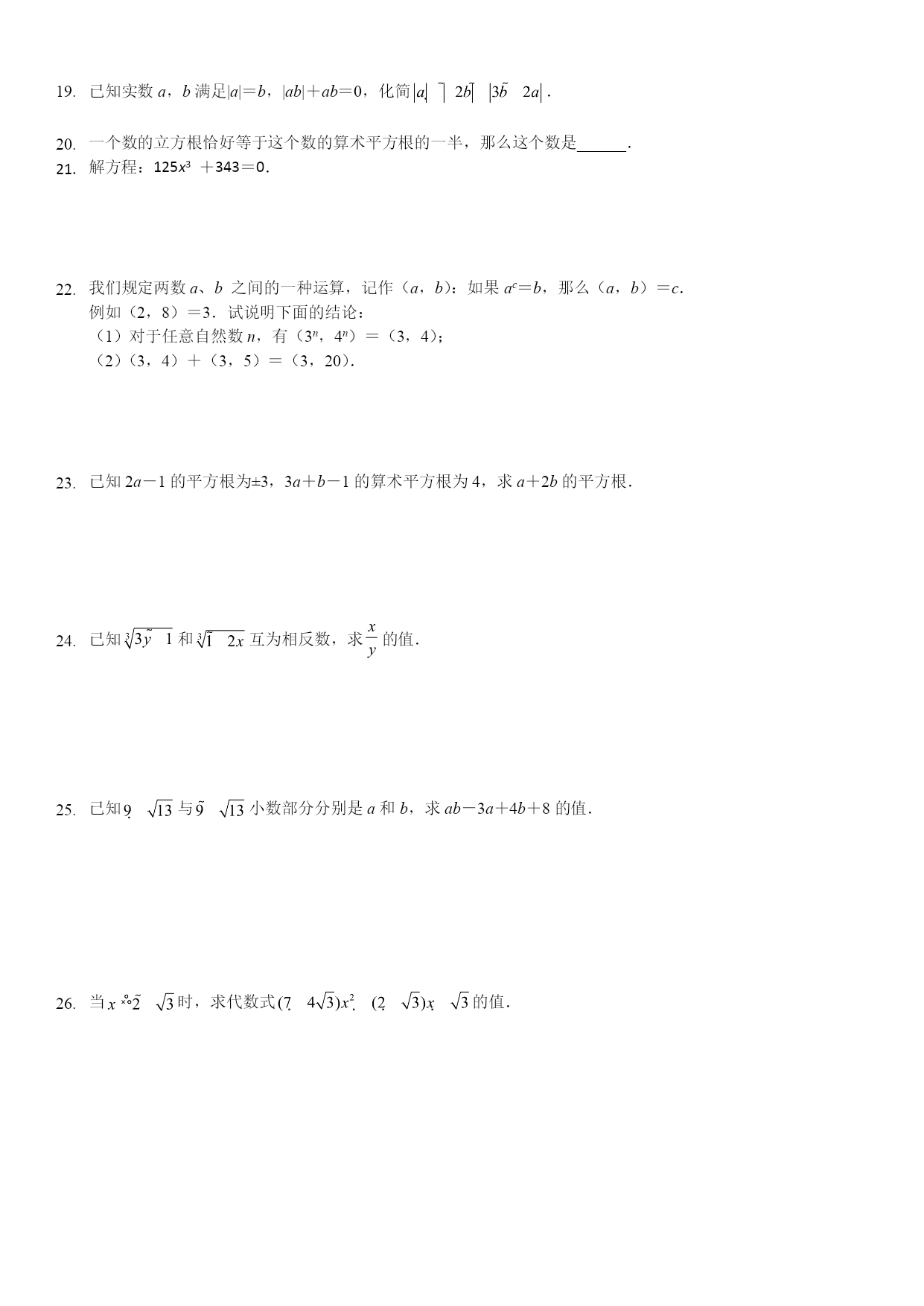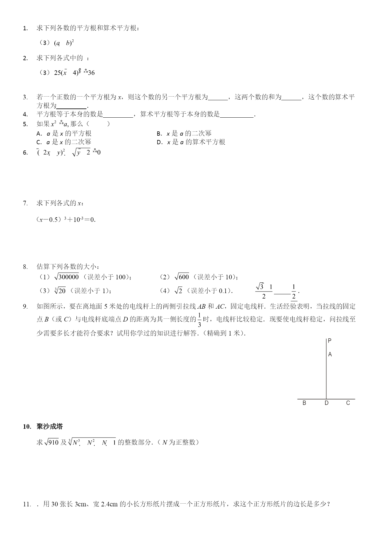 求下列各数的平方根和算术平方根:(3)求下列各式中的:(3)若一个正数的一个平方根为x,则这个数的另一个平方根为,这两个数的和为,这个数的算术平方根为.平方根等于本身的数是,算术平方根等于本身的数是.如果那么()A.a是x的平方根B.x是a的二次幂C.a是x的二次幂D.x是a的算术平方根求下列各式的x:(x-0.5)3+10-3=0.估算下列各数的大小:(1)(误差小于100);(2)(误差小于10);(3)(误差小于1);(4)(误差小于0.1)..如图所示,要在离地面5米处的电线杆上的两侧引拉线AB和AC,固定电线杆.生活经验表明,当拉线的固定点B(或C)与电线杆底端点D的距离为其一侧长度的时,电线杆比较稳定.现要使电线杆稳定,问拉线至少需要多长才能符合要求?试用你学过的知识进行解答.(精确到1米).聚沙成塔求及的整数部分.(为正整数).用30张长3cm、宽2.4cm的小长方形纸片摆成一个正方形纸片,求这个正方形纸片的边长是多少?聚沙成塔:若和互为相反数,求、的值.-的绝对值是,相反数是,倒数是.化简:().请算一算,认真观察,然后回答问题:(1)完成下列各个计算:1×2×3×4+1=________;2×3×4×5+1=________;3×4×5×6+1=________;……(2)你发现规律了吗?请用含n的等式表示上述规律,并证明你的发现.(3)根据以上规律,求15×16×17×18+1的平方根和算术平方根.有下列说法:①带根号的数是无理数;②不带根号的数一定是有理数;③负数没有立方根;④是17的平方根,其中正确的有()A.0个B.1个C.2个D.3个已知,则2x+3y=.(12分)求下列各式中的x的值:(1)(2);()已知实数a,b满足|a|=b,|ab|+ab=0,化简.一个数的立方根恰好等于这个数的算术平方根的一半,那么这个数是______.解方程:125x3+343=0.我们规定两数a、b之间的一种运算,记作(a,b):如果ac=b,那么(a,b)=c.例如(2,8)=3.试说明下面的结论:(1)对于任意自然数n,有(3n,4n)=(3,4);(2)(3,4)+(3,5)=(3,20).已知2a-1的平方根为±3,3a+b-1的算术平方根为4,求a+2b的平方根.已知和互为相反数,求的值.已知与小数部分分别是a和b,求ab-3a+4b+8的值.当时,求代数式的值.