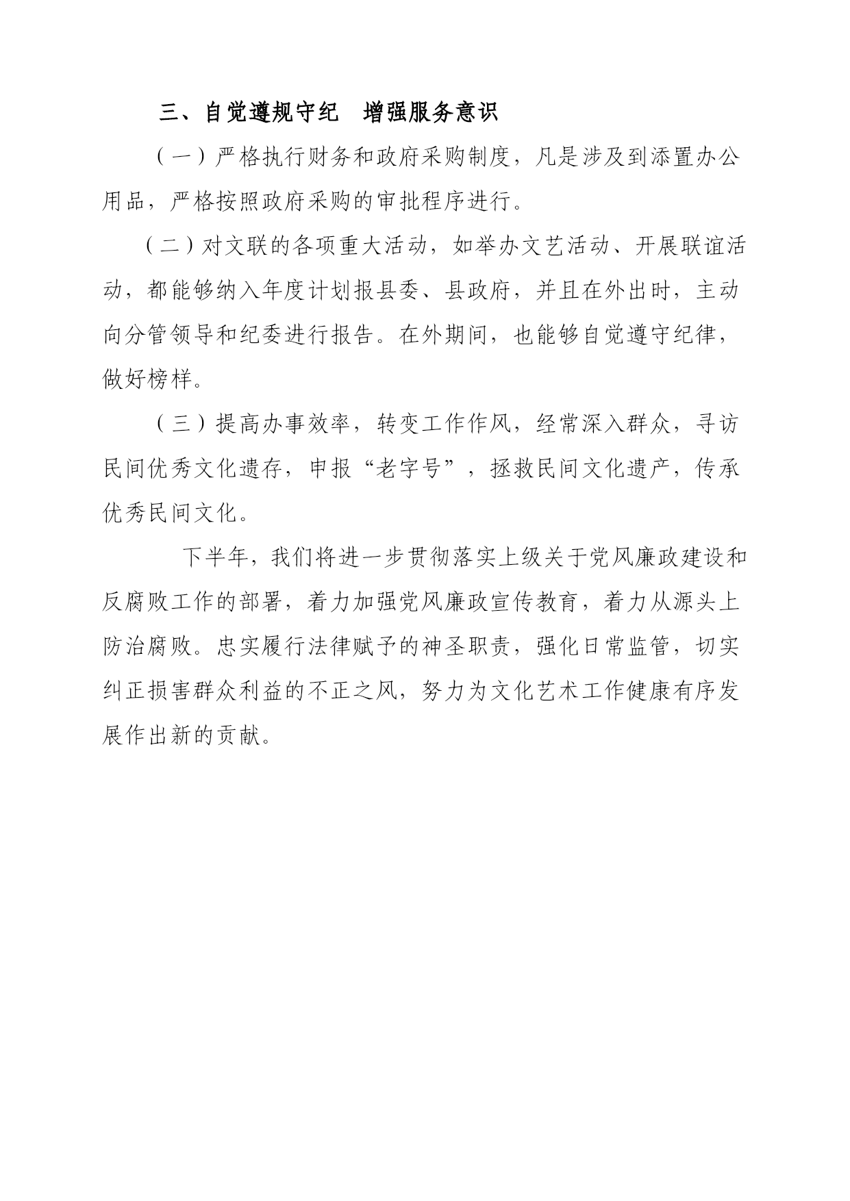 南乐县文联党风廉政建设自查报告2010年元月份以来,我们在县委、县纪委的正确领导下,认真贯彻党的十七大精神,按照县委和县纪委的工作要求,坚持标本兼治、综合治理、惩防并举、注重预防的方针,实行层层分解的办法,全面落实党风廉政建设和反腐败工作。党风廉政建设工作在过去的基础上又取得了新的成效,呈现出良好的发展态势,为促进我县文学艺术事业的繁荣发展,建设和谐南乐,作出了新的贡献。现将2010上半年党风廉政建设自查情况汇报如下。一、不断加强学习提高廉政意识我单位召开了党组会议,组织全体党员干部深入学习了温家宝同志及省市领导在国务院第三次廉政工作电视电话会议上的讲话、市、县各级领导关于党风廉政建设的讲话精神,增强了学习贯彻廉政工作的自觉性,从政治和全局的高度把廉政工作学习好、贯彻好、落实好。二、规范干部行为切实抓好落实贯彻落实“五条规定”,规范党员领导干部的从政行为,要切实抓好廉政工作的贯彻实施。查找本单位党员领导干部廉洁从政方面存在的薄弱环节,采取有效措施加以解决;要加强对党员领导干部的管理和监督,切实做到预防为先、关口前移;党员领导干部要深入学习理解和认真贯彻执行廉政工作的各项要求。厉行节约,把各项费用开支压缩到最低限度。三、自觉遵规守纪增强服务意识(一)严格执行财务和政府采购制度,凡是涉及到添置办公用品,严格按照政府采购的审批程序进行。(二)对文联的各项重大活动,如举办文艺活动、开展联谊活动,都能够纳入年度计划报县委、县政府,并且在外出时,主动向分管领导和纪委进行报告。在外期间,也能够自觉遵守纪律,做好榜样。(三)提高办事效率,转变工作作风,经常深入群众,寻访民间优秀文化遗存,申报“老字号”,拯救民间文化遗产,传承优秀民间文化。下半年,我们将进一步贯彻落实上级关于党风廉政建设和反腐败工作的部署,着力加强党风廉政宣传教育,着力从源头上防治腐败。忠实履行法律赋予的神圣职责,强化日常监管,切实纠正损害群众利益的不正之风,努力为文化艺术工作健康有序发展作出新的贡献。