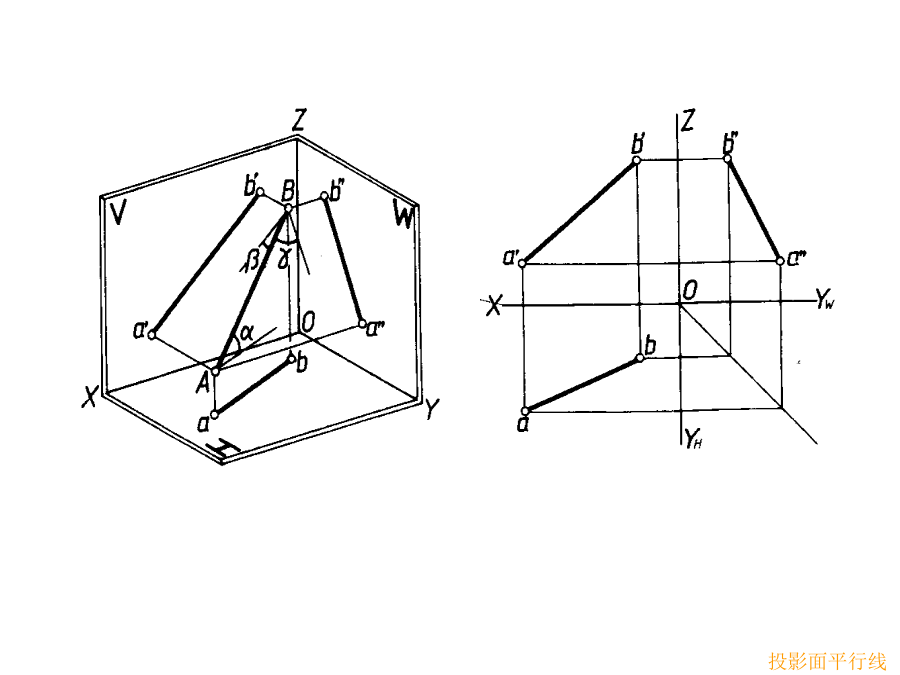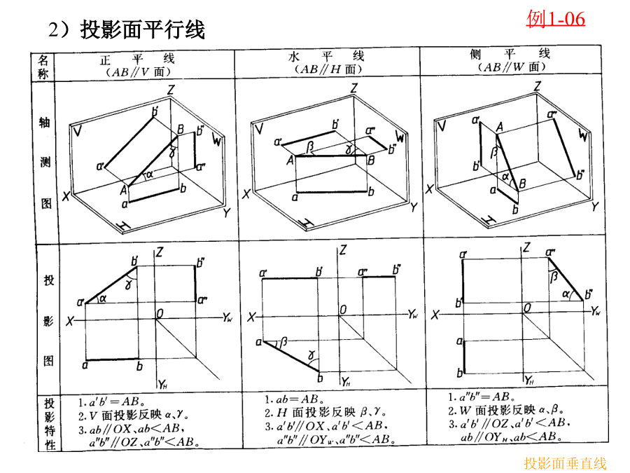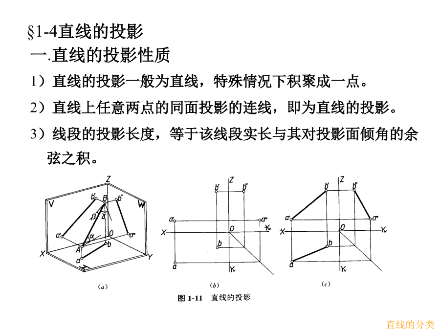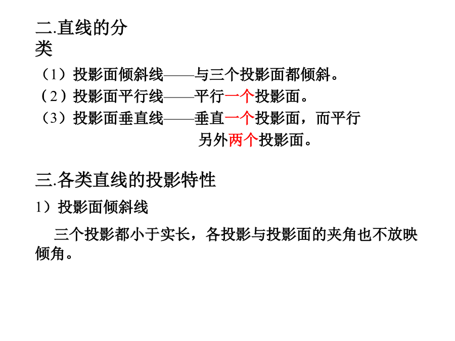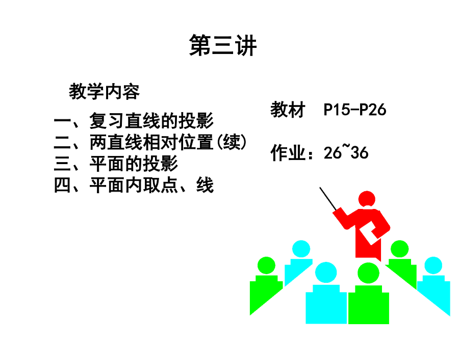 教材P15-P26§1-4直线的投影二.直线的分类投影面平行线2)投影面平行线3)投影面垂直线§1-7两直线的相对位置相交两直线二)相交两直线1.相交两直线的同面投影必定相交且交点符合点的投影规律。2.反之,如果两直线的同面投影相交且交点符合点的投影规律,则两直线空间必定相交。三)交叉两直线既不平行又不相交的两直线称为交叉两直线。§1-8垂直两直线的投影第二章平面§2-1平面的投影二.平面的迹线表示法§2-2各类平面的投影特性二.各类平面的投影特性1)投影面倾斜面三投影都为类似形,也不反映平面与投影面的倾角1,1,1。2)投影面垂直面一个投影具有积聚性,另两个投影都为类似形,并反映平面与投影面的倾角1,1,1中的两个。3)投影面平行面一个投影反映实形另外两个投影具有积聚性。水平面的迹线表示法§2-3平面上的点和直线(2)平面上取点一点在平面内的任一直线上,则此点一定在该平面内。b(3)属于特殊位置平面的点和直线a.取属于特殊位置平面的点和直线属于特殊位置平面的点和直线,其一个投影必重合于具有积聚性的投影或迹线。b.过一般位置直线作投影面垂直面二.平面上的特殊直线(1)平面上的投影面平行线属于投影面倾斜面和投影面垂直面的投影面平行线的方向是一定的。数量有无数条。(2)平面上的最大斜度线a.定义:属于定平面并垂直于该平面的投影面平行线的直线,称为该平面的最大斜度线。b.应用:平面对投影面的倾角即为平面上对该投影面的最大斜度线对同一投影面的倾角