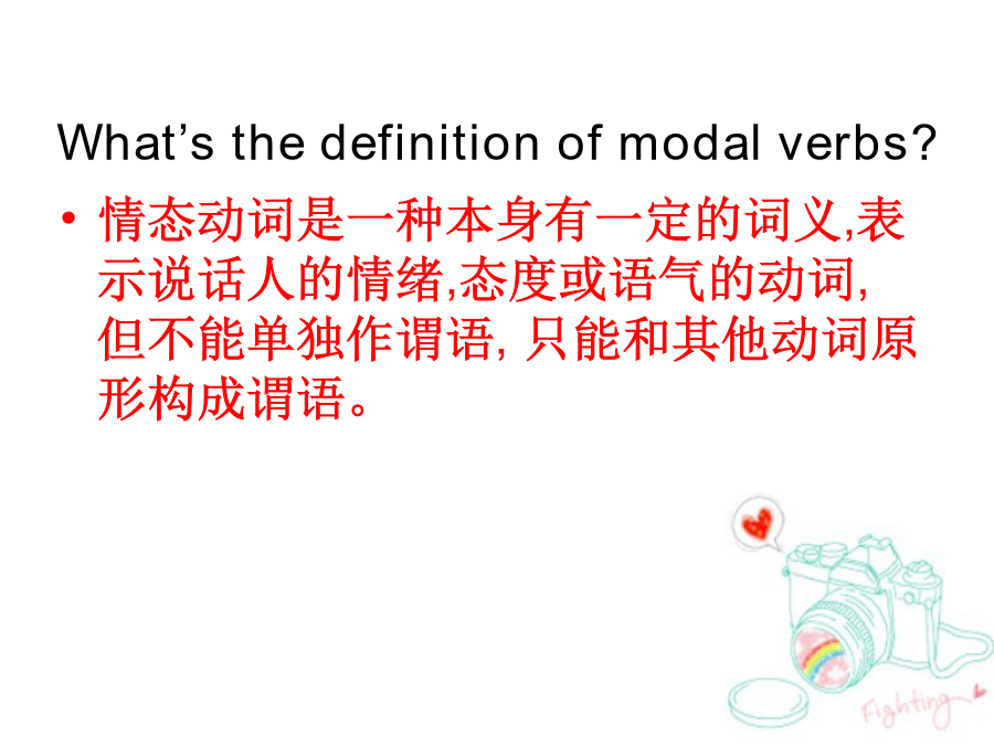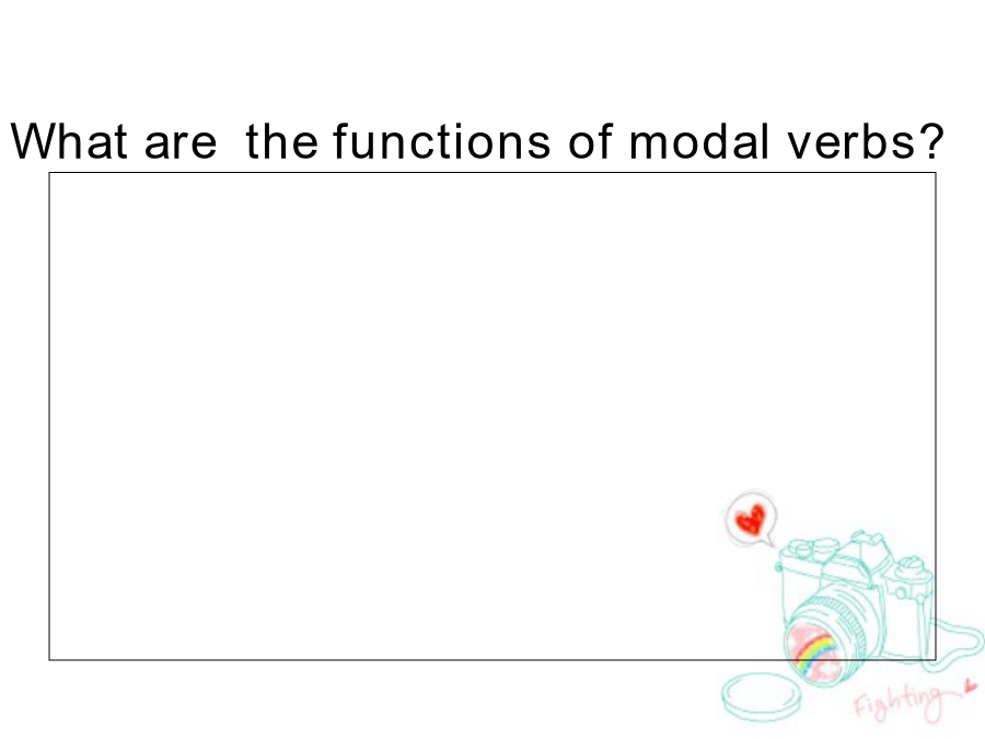 Unit2GrammarandUsagestudyingaimsWhat’sthedefinitionofmodalverbs?Whatarethefunctionsofmodalverbs?一.Weusemodalverbstotalkabout:二.Wealsousemodalverbsto:Howcanwedealwithexercisesconcerningmodalverbs?表能力的情态动词:can/couldbeableto情态动词表示能力情态动词表示能力时,一般用can/could或beableto。1.can常指现在,较常用;如果只表示能力时,两者都可用。e.g.Ican/amabletoswim.2.beableto①可用于各种时态e.g.Weshallbeabletofinishtheworknextweek.②侧重于“克服一定困难”“经过一定努力”“有能力”干某事can①只有一般现在时和一般过去时两种时态②客观上能够即讲即练Thefirespreadthroughthehotelveryquicklybuteveryone____getout.A.hadtoB.wouldC.couldD.wasableto答案:D情态动词表示推测的用法(语气从强到弱)1._____所表示的可能性最大,最有把握,意为“一定”。2.can和could主要用于____句和___句中,can’t或couldn’t表示“不可能”。3.may和might表示现在或将来可能发生的动作或情况,主要用于____句中,might相对于may来说,表示的可能性更小一些。注意:1表示猜测,can/could一般不用于肯定句中,除非是“经验之谈”。e.g.Anybodycanmakemistakes.2表示猜测,may和might都不用于疑问句中。e.g.(正)Can/Coulditbecloudytomorrow?(误)May/Mightitbecloudytomorrow?4.should也可以用来表示“推测”,意为“可能;该”,相当于beexpectedto。往往指具有一定的客观根据或根据推理对现在某事发生的“可能性”进行描述,语气上不如must强。It’snearlyseveno’clock.Jack_____behereatanymoment.A.mustB.needC.shouldD.can答案:C情态动词表示“许可”、“允许”的用法can/could/may/might过去式could常用于疑问句中,比can更加委婉,表示礼貌。回答时,常用原形can或者may,不可再用过去式could/might。e.g.—Can/May/CouldIuseyourpen?肯定简略回答:—Yes,youcan/may.—Yes,please.否定简略回答:—No,youmustn’t.—Pleasedon’t._No,youmaynot.即讲即练—CouldIborrowyourdictionary?—Yes,ofcourseyou____.A.mightB.willC.canD.should答案:CSomeofuscanusethecomputernow,butwecouldn’tlastyear.Itwillbesunnyinthedaytime,butitcouldrainlateronthisevening.-----CanIgonow?-----Yes,youcan.Couldyouwaitafewdaysforthemoney?Thiscan’t/couldn’tbedonebyhim.Attention:表示特定的某一过去能力或表示成功地做了某事时,只能用was/wereableto,不能用could。AbigfirebrokeoutinABChotelyesterday.Luckily,everyone__________runoutofthebuilding.Ican’tthankyoutoomuch.cannever/can’t……too表示“无论怎样…也不过分”,“越…越好”。MayIwatchTVaftersupper?Yes,__________________./No,_______________________.MightIuseyourtelephone?MayIgohomenow?Itmaybetrue.Shemaycometomorrow.Hemighthavesomefever.Mayyousucceed!Mayyouhavemanymoredaysashappyasthisone!Acomputer_______thinkforitself;itmustbetoldwhattodo.A.can’tB.co