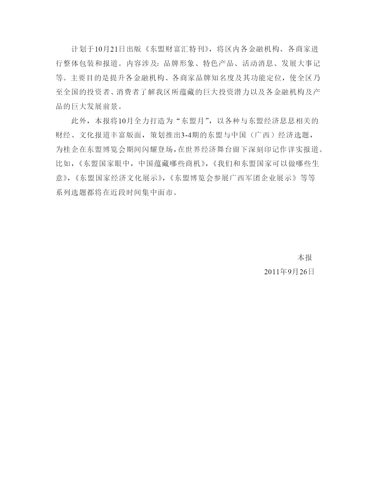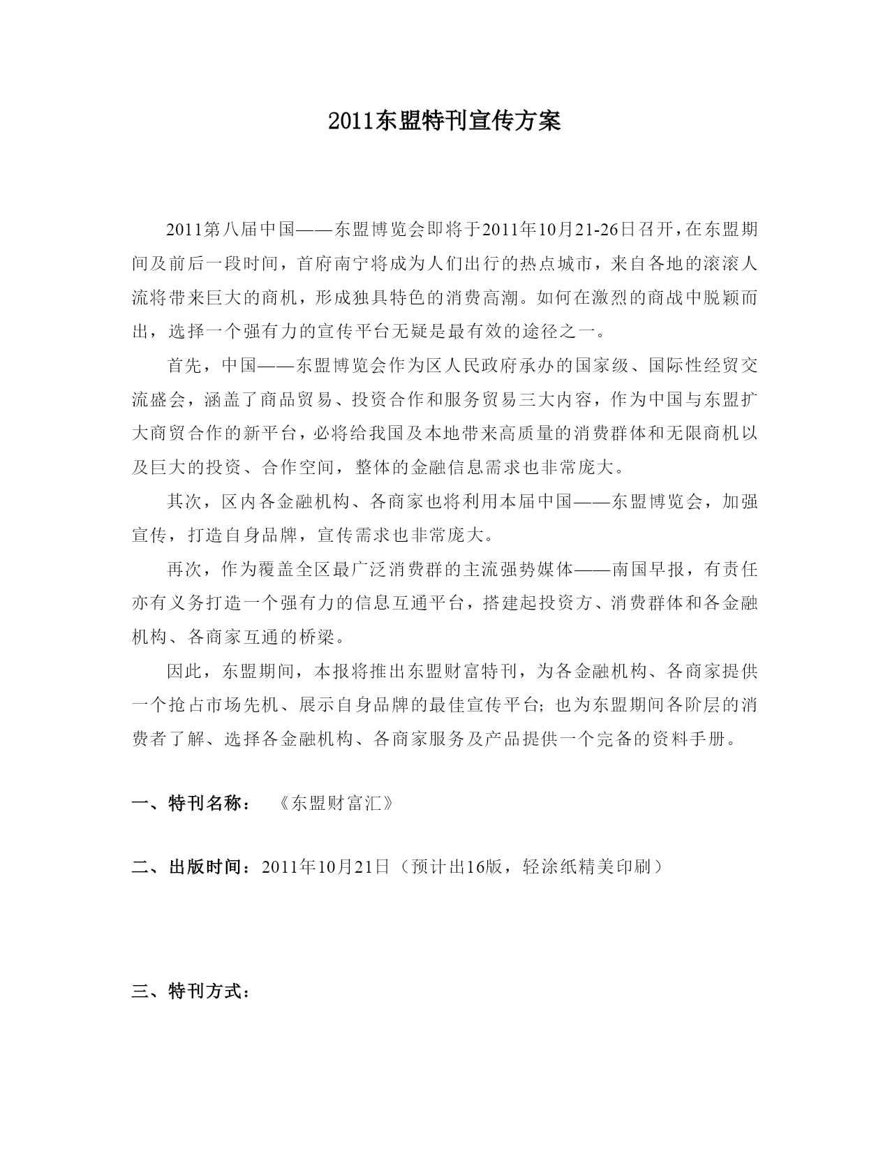 2011东盟特刊宣传方案2011第八届中国——东盟博览会即将于2011年10月21-26日召开,在东盟期间及前后一段时间,首府南宁将成为人们出行的热点城市,来自各地的滚滚人流将带来巨大的商机,形成独具特色的消费高潮。如何在激烈的商战中脱颖而出,选择一个强有力的宣传平台无疑是最有效的途径之一。首先,中国——东盟博览会作为区人民政府承办的国家级、国际性经贸交流盛会,涵盖了商品贸易、投资合作和服务贸易三大内容,作为中国与东盟扩大商贸合作的新平台,必将给我国及本地带来高质量的消费群体和无限商机以及巨大的投资、合作空间,整体的金融信息需求也非常庞大。其次,区内各金融机构、各商家也将利用本届中国——东盟博览会,加强宣传,打造自身品牌,宣传需求也非常庞大。再次,作为覆盖全区最广泛消费群的主流强势媒体——南国早报,有责任亦有义务打造一个强有力的信息互通平台,搭建起投资方、消费群体和各金融机构、各商家互通的桥梁。因此,东盟期间,本报将推出东盟财富特刊,为各金融机构、各商家提供一个抢占市场先机、展示自身品牌的最佳宣传平台;也为东盟期间各阶层的消费者了解、选择各金融机构、各商家服务及产品提供一个完备的资料手册。一、特刊名称:《东盟财富汇》二、出版时间:2011年10月21日(预计出16版,轻涂纸精美印刷)三、特刊方式:计划于10月21日出版《东盟财富汇特刊》,将区内各金融机构、各商家进行整体包装和报道。内容涉及:品牌形象、特色产品、活动消息、发展大事记等。主要目的是提升各金融机构、各商家品牌知名度及其功能定位,使全区乃至全国的投资者、消费者了解我区所蕴藏的巨大投资潜力以及各金融机构及产品的巨大发展前景。此外,本报将10月全力打造为“东盟月”,以各种与东盟经济息息相关的财经、文化报道丰富版面,策划推出3-4期的东盟与中国(广西)经济选题,为桂企在东盟博览会期间闪耀登场,在世界经济舞台留下深刻印记作详实报道。比如,《东盟国家眼中,中国蕴藏哪些商机》,《我们和东盟国家可以做哪些生意》,《东盟国家经济文化展示》,《东盟博览会参展广西军团企业展示》等等系列选题都将在近段时间集中面市。本报2011年9月26日