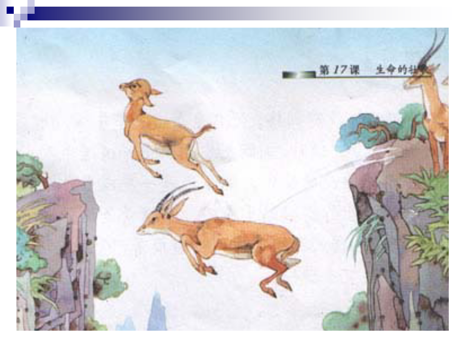 “生命桥”狩猎羚羊悬崖活捉试跳下坠猛蹬上升凌空腾起秩序井然快速飞跃眼花缭乱目瞪口呆不由自主请同学们读读课文,读完之后,看看课文中出现了哪些让你意想不到的事情?用横线把它画出来。几分钟以后,羚羊群分成了两群:老羚羊为一群,年轻羚羊为一群。一只老羚羊走出羊群,朝年轻羚羊群叫了一声,一只年轻羚羊应声跟老羚羊走到了悬崖边。年轻羚羊后退了几步,突然奔跑着向悬崖对面跳过去,随即老羚羊紧跟后面也飞跃过去,只是老羚羊跃起的高度要低一些。当年轻羚羊在空中下坠时,奇迹出现了:老羚羊的身子刚好出现在年轻羚羊的蹄下,而年轻羚羊在老羚羊的背上猛蹬一下,下坠的身体又突然升高并轻巧地落在了对面的悬崖边,而老羚羊就象一只断翅的鸟,笔直地坠入了山涧。试跳成功!紧接着,一对对羚羊凌空腾起,没有拥挤,没有争夺,秩序井然,快速飞跃。顿时,山涧上空划出了一道道令人眼花缭乱的弧线,那弧线是一座以老羚羊的死亡作桥墩的生命桥。那情景是何等的神圣!猎人们个个惊得目瞪口呆,不由自主地放下了猎枪。试跳成功!紧接着,一对对羚羊凌空腾起,没有拥挤,没有争夺,秩序井然,快速飞跃。顿时,山涧上空划出了一道道令人眼花缭乱的弧线,那弧线是一座以老羚羊的死亡作桥墩的生命桥。那情景是何等的神圣!生命的壮歌作业: