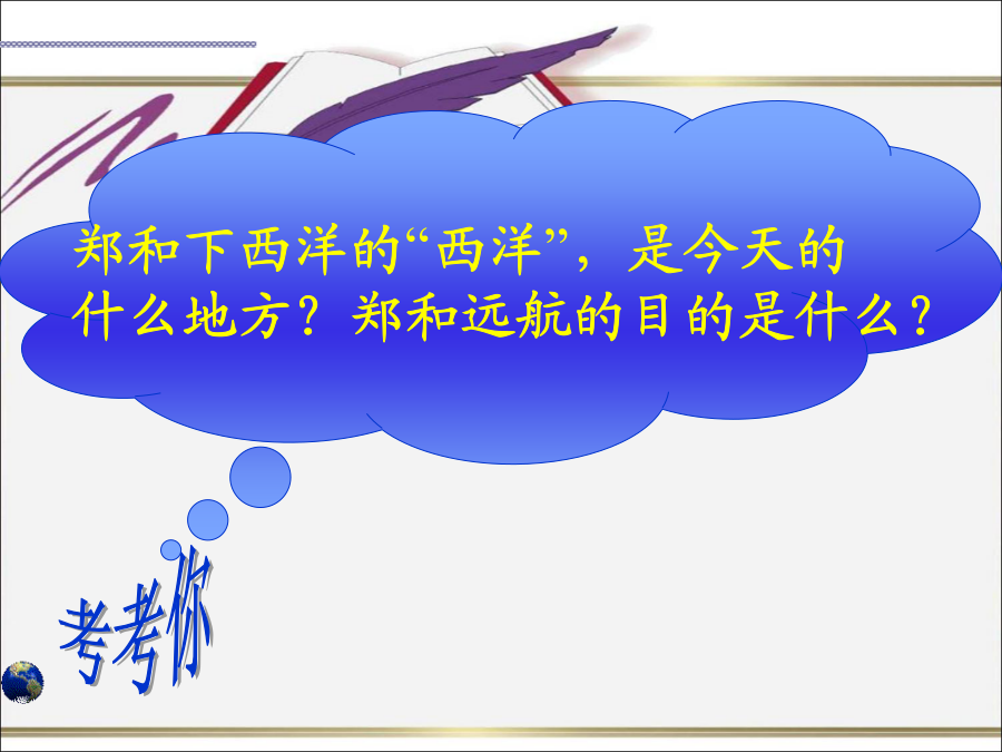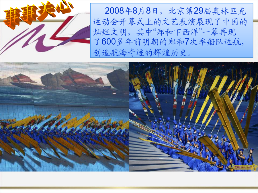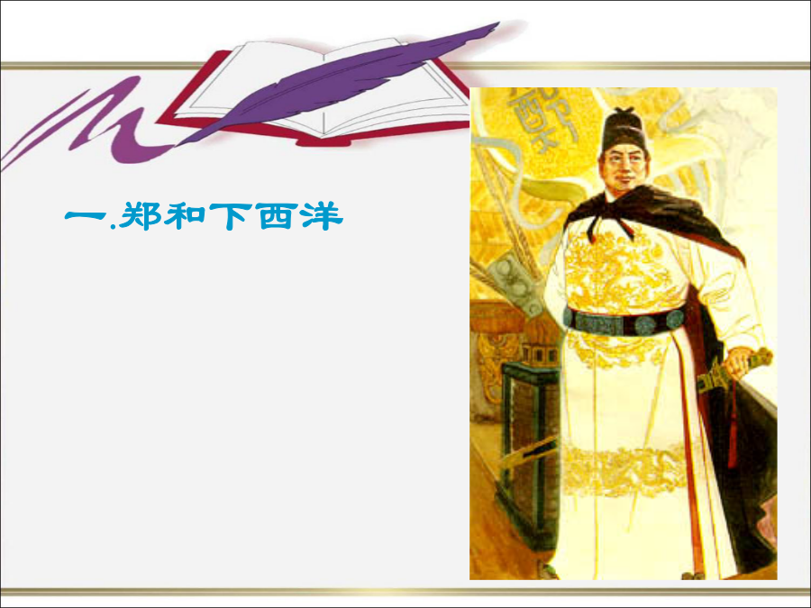事事关心第16课中外的交往与冲突一.郑和下西洋文莱阅读教材和下面材料,思考:郑和为何要下西洋?加强同海外各国的联系宣扬明朝的国威寻找失踪的建文帝时间刘家港郑和下西洋的影响和贡献郑和下西洋取得了巨大成功,上述材料说明成功的因素有哪些?1、倭寇指什么?2、明朝中期为什么倭患严重?3、倭患对我国东南沿海的骚扰造成了什么严重的后果?4)戚家军与其他爱国军民配合;2.对戚继光和岳飞两者的评价有何区别?你可知“"MACAU”不是我的真名姓?我离开你的太久了,母亲!但是他们掳去的是我的肉体,你依然保管我内心的灵魂。三百年来梦寐不忘的生母啊!请叫儿的乳名,叫我一声“澳门”!母亲!我要回来,母亲!澳门被葡萄牙强占的过程1999年12月20日,中国政府恢复了对澳门行使主权。1、印尼有个港口叫“三宝垄”,马来西亚有个地方叫“三宝山”,这些名称的由来与下列哪一事件有关?A、靖难之役B、戚继光抗倭C、郑和下西洋D、土木之变2、下列人物是我国古代民族英雄的是:A、岳飞B、戚继光C、文天祥D、郑和