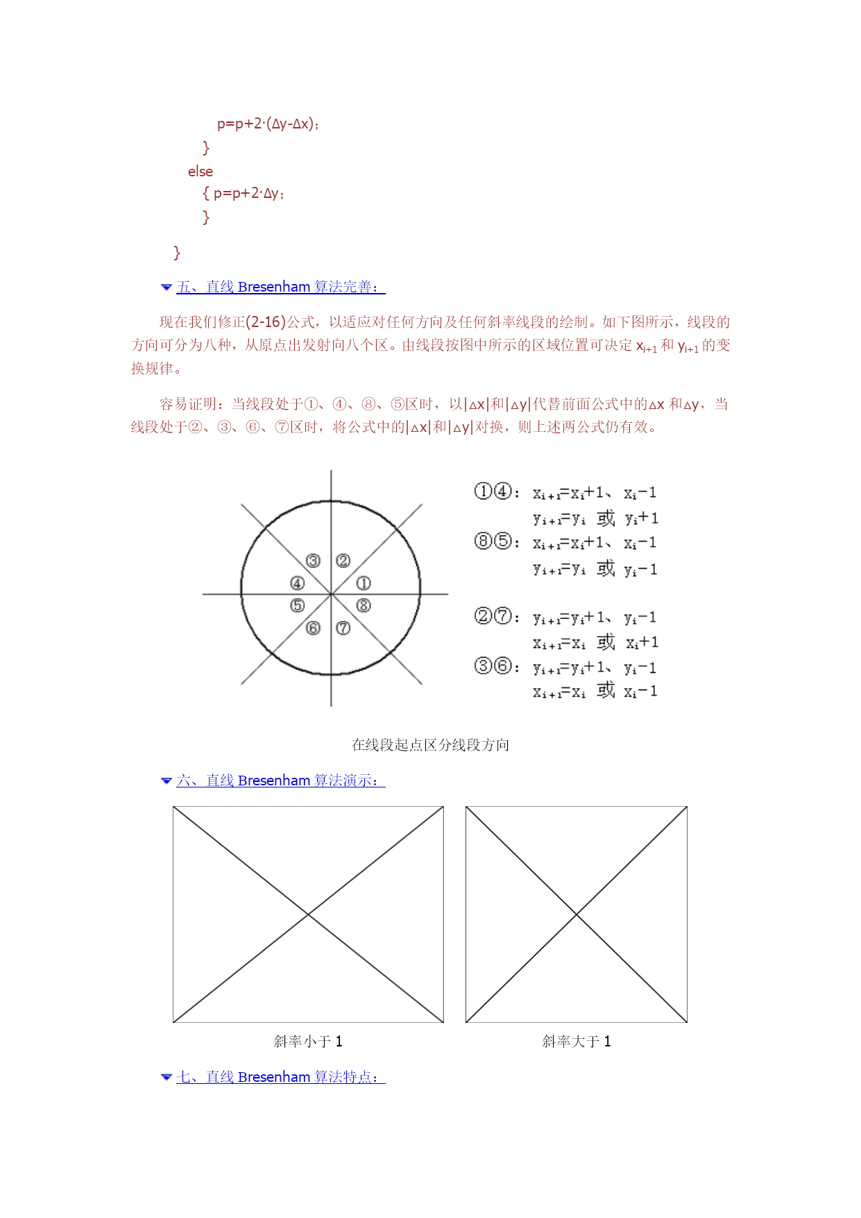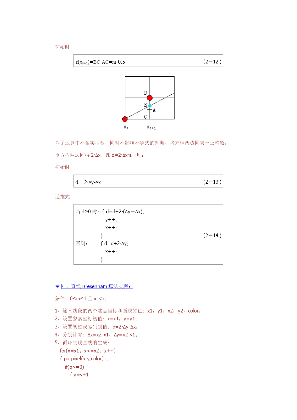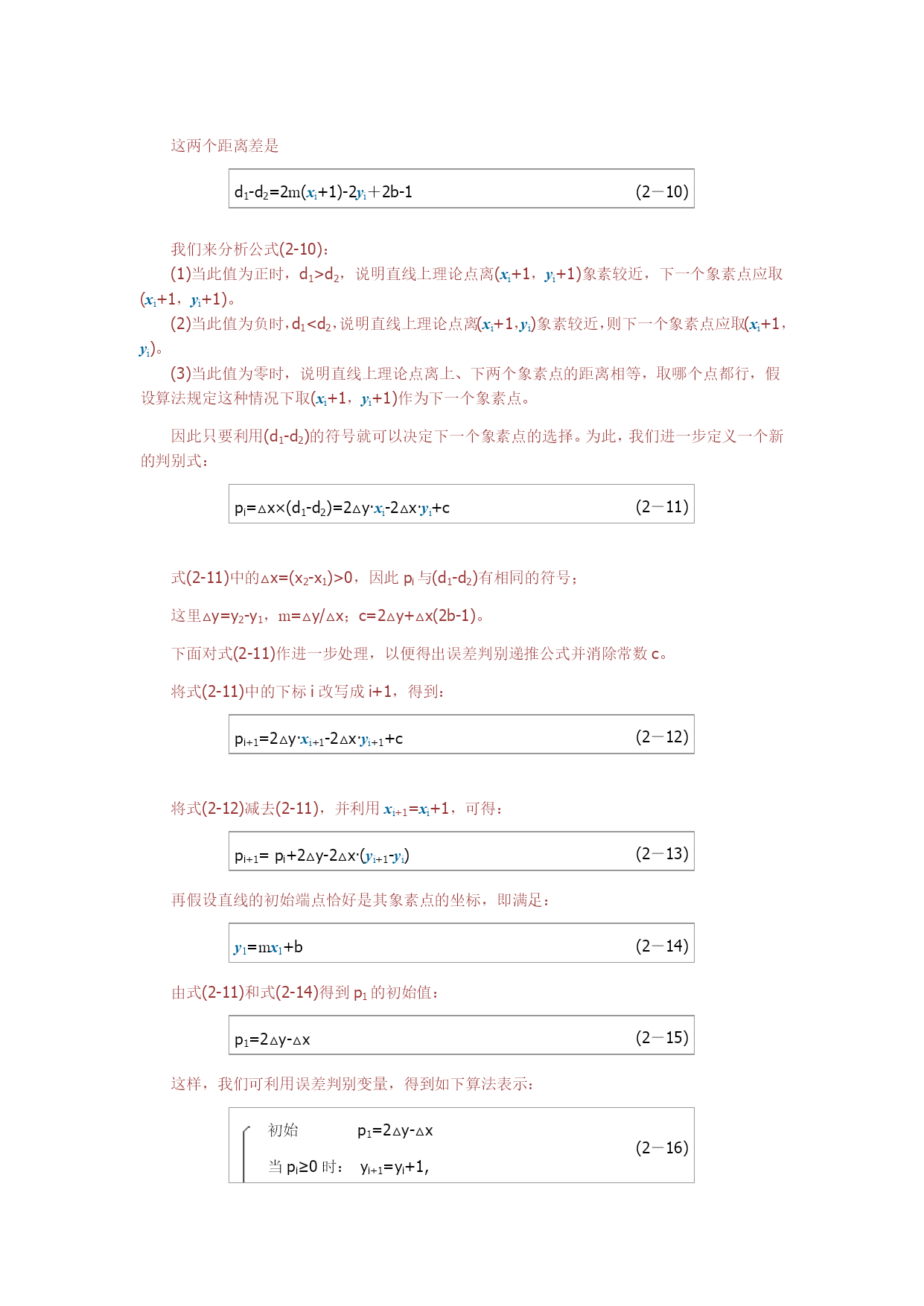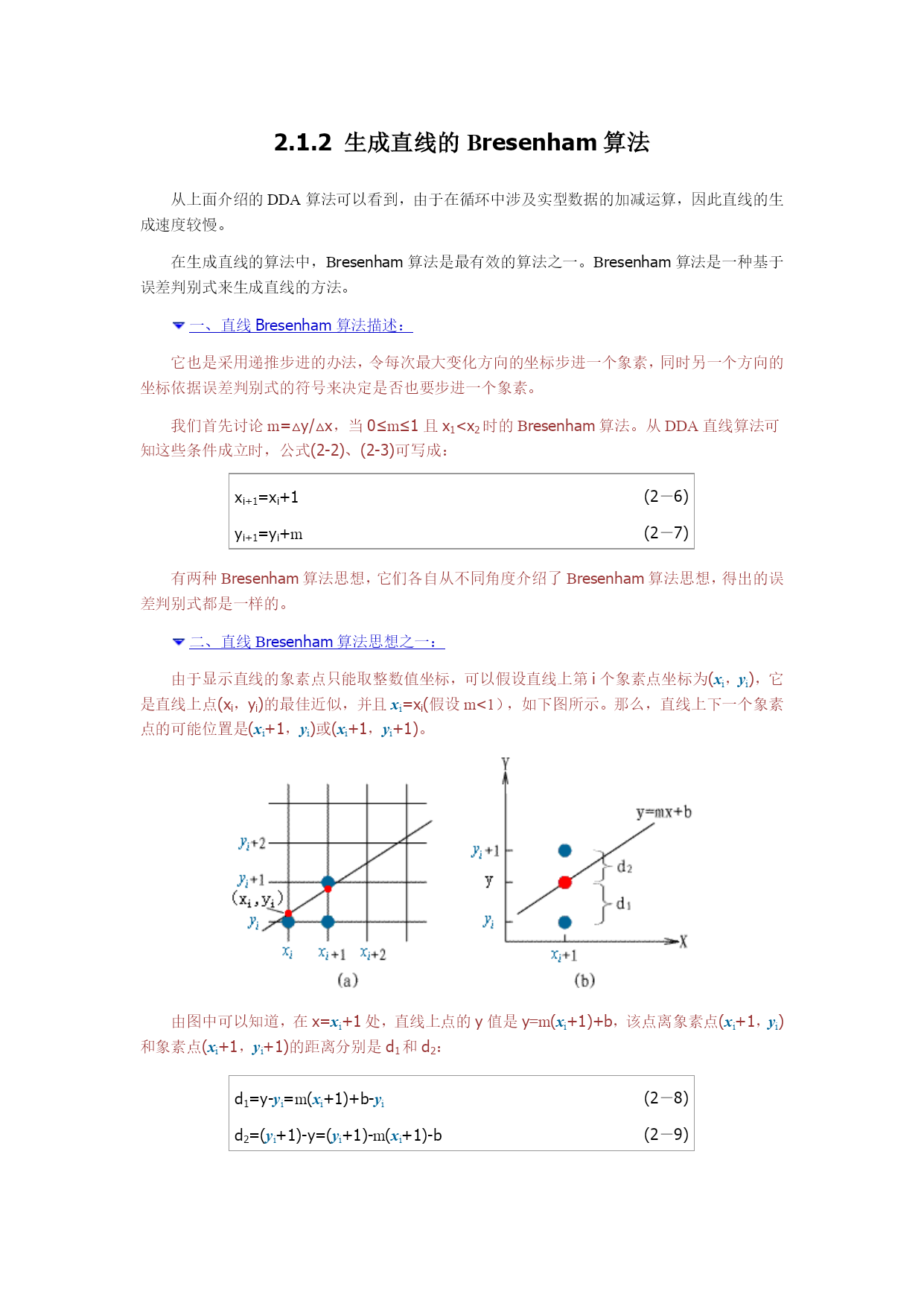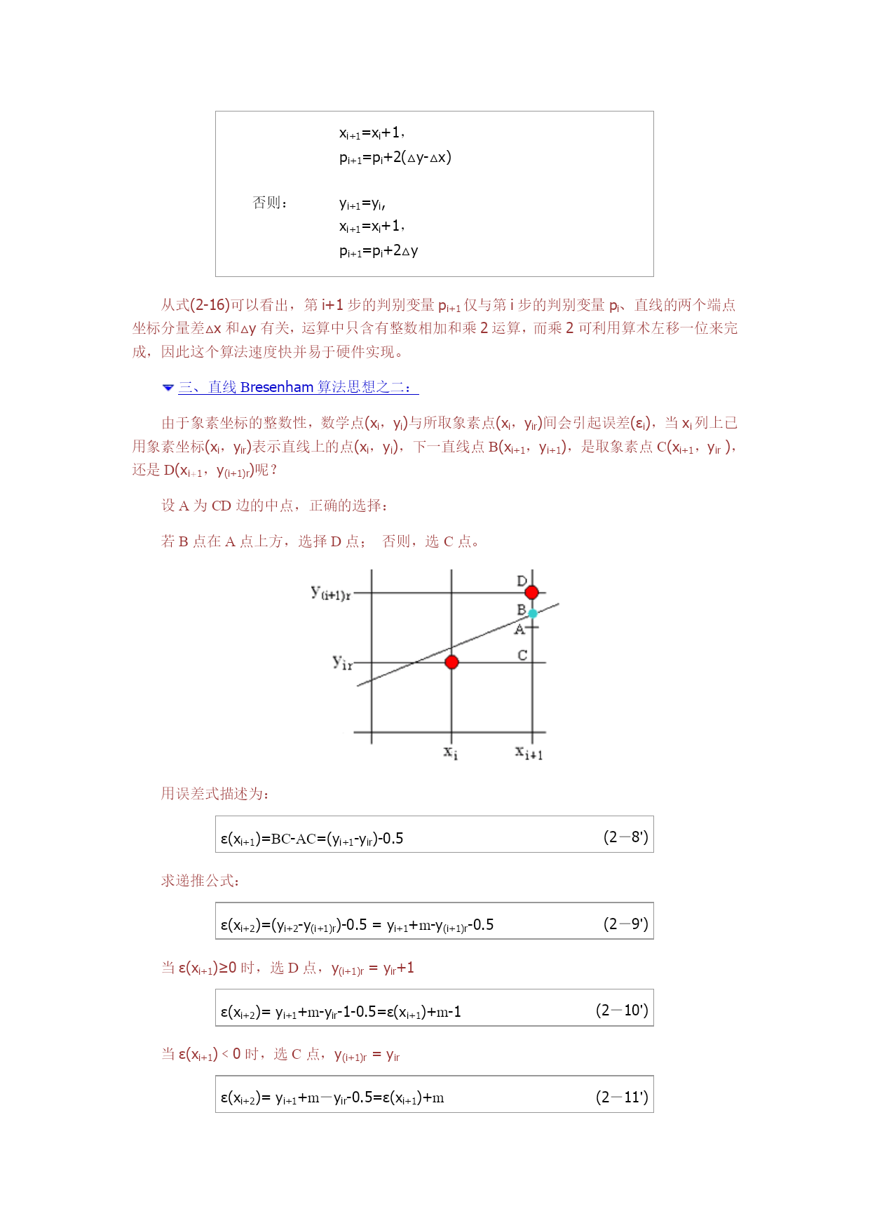 2.1.2生成直线的Bresenham算法从上面介绍的DDA算法可以看到,由于在循环中涉及实型数据的加减运算,因此直线的生成速度较慢。在生成直线的算法中,Bresenham算法是最有效的算法之一。Bresenham算法是一种基于误差判别式来生成直线的方法。HYPERLINK"http://course.cug.edu.cn/cugThird/CGOL_NET/CLASS/course/2-1-2-a.htm"一、直线Bresenham算法描述:它也是采用递推步进的办法,令每次最大变化方向的坐标步进一个象素,同时另一个方向的坐标依据误差判别式的符号来决定是否也要步进一个象素。我们首先讨论m=△y/△x,当0≤m≤1且x1<x2时的Bresenham算法。从DDA直线算法可知这些条件成立时,公式(2-2)、(2-3)可写成:xi+1=xi+1(2-6)yi+1=yi+m(2-7)有两种Bresenham算法思想,它们各自从不同角度介绍了Bresenham算法思想,得出的误差判别式都是一样的。HYPERLINK"http://course.cug.edu.cn/cugThird/CGOL_NET/CLASS/course/2-1-2-a.htm"二、直线Bresenham算法思想之一:由于显示直线的象素点只能取整数值坐标,可以假设直线上第i个象素点坐标为(xi,yi),它是直线上点(xi,yi)的最佳近似,并且xi=xi(假设m<1),如下图所示。那么,直线上下一个象素点的可能位置是(xi+1,yi)或(xi+1,yi+1)。由图中可以知道,在x=xi+1处,直线上点的y值是y=m(xi+1)+b,该点离象素点(xi+1,yi)和象素点(xi+1,yi+1)的距离分别是d1和d2:d1=y-yi=m(xi+1)+b-yi(2-8)d2=(yi+1)-y=(yi+1)-m(xi+1)-b(2-9)这两个距离差是d1-d2=2m(xi+1)-2yi+2b-1(2-10)我们来分析公式(2-10):(1)当此值为正时,d1>d2,说明直线上理论点离(xi+1,yi+1)象素较近,下一个象素点应取(xi+1,yi+1)。(2)当此值为负时,d1<d2,说明直线上理论点离(xi+1,yi)象素较近,则下一个象素点应取(xi+1,yi)。(3)当此值为零时,说明直线上理论点离上、下两个象素点的距离相等,取哪个点都行,假设算法规定这种情况下取(xi+1,yi+1)作为下一个象素点。因此只要利用(d1-d2)的符号就可以决定下一个象素点的选择。为此,我们进一步定义一个新的判别式:pi=△x×(d1-d2)=2△y·xi-2△x·yi+c(2-11)式(2-11)中的△x=(x2-x1)>0,因此pi与(d1-d2)有相同的符号;这里△y=y2-y1,m=△y/△x;c=2△y+△x(2b-1)。下面对式(2-11)作进一步处理,以便得出误差判别递推公式并消除常数c。将式(2-11)中的下标i改写成i+1,得到:pi+1=2△y·xi+1-2△x·yi+1+c(2-12)将式(2-12)减去(2-11),并利用xi+1=xi+1,可得:pi+1=pi+2△y-2△x·(yi+1-yi)(2-13)再假设直线的初始端点恰好是其象素点的坐标,即满足:y1=mx1+b(2-14)由式(2-11)和式(2-14)得到p1的初始值:p1=2△y-△x(2-15)这样,我们可利用误差判别变量,得到如下算法表示:初始p1=2△y-△x(2-16)当pi≥0时:yi+1=yi+1,xi+1=xi+1,pi+1=pi+2(△y-△x)否则:yi+1=yi,xi+1=xi+1,pi+1=pi+2△y从式(2-16)可以看出,第i+1步的判别变量pi+1仅与第i步的判别变量pi、直线的两个端点坐标分量差△x和△y有关,运算中只含有整数相加和乘2运算,而乘2可利用算术左移一位来完成,因此这个算法速度快并易于硬件实现。HYPERLINK"http://course.cug.edu.cn/cugThird/CGOL_NET/CLASS/course/2-1-2-a.htm"三、直线Bresenham算法思想之二:由于象素坐标的整数性,数学点(xi,yi)与所取象素点(xi,yir)间会引起误差(εi),当xi列上已用象素坐标(xi,yir)表示直线上的点(xi,yi),下一直线点B(xi+1,yi+1),是取象素点C(xi+1,yir),还是D(xi+1,y(i+1)r)呢?设A为CD边的中点,正确的选择:若B点在A点上方,选择D点;否则,选C点。用误差式描述为:ε(xi+1)=BC-AC=(yi+1-yir)-0.5(2-8')求递推公式:ε(xi+2)=(