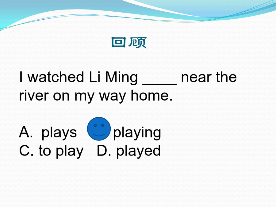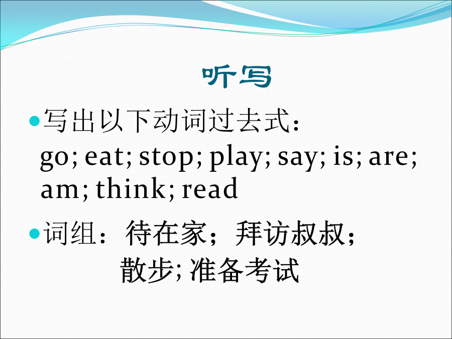 听写IwatchedLiMing____neartheriveronmywayhome.playsB.playingC.toplayD.playedwatch该…It’stimetodosth…..例:该做作业了。Unit101.Howwasyourweekend?2.Whatdidyoudolastweekend?1.Wheredidyougo?2.Howwastheweather/beach/food/people?relaxing/boring/awful/fantastic考点1考点2考点2考点2考点3help回顾练习2.(厦门)--Excuseme,sir.Thisisanon-smokingroom.--Oh,sorry.I___thesign.A.don’tseeB.didn’tseeC.won’tsee一般过去时重点规则动词过去式不规则动词过去式一般过去时重点一般过去时的“三变”练习课堂测验4.Heoftenhelpsme_____English.A.learningB.learnC.learnsD.learned5.Thecoatis_____.Ipaidmuchmoneyforit.A.smallB.expensiveC.cheapD.high6.Heturnedoffthelightsandthen_____.A.leavesB.leftC.willleaveD.leaving根据汉语提示完成句子总结Homework1.默写10单元单词(一中两英)2.背诵课文p63-3a3.做9、10单元讲义课堂测试答案